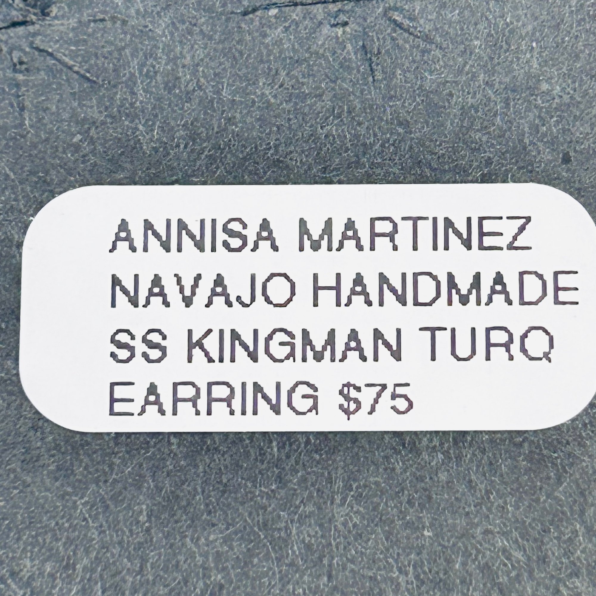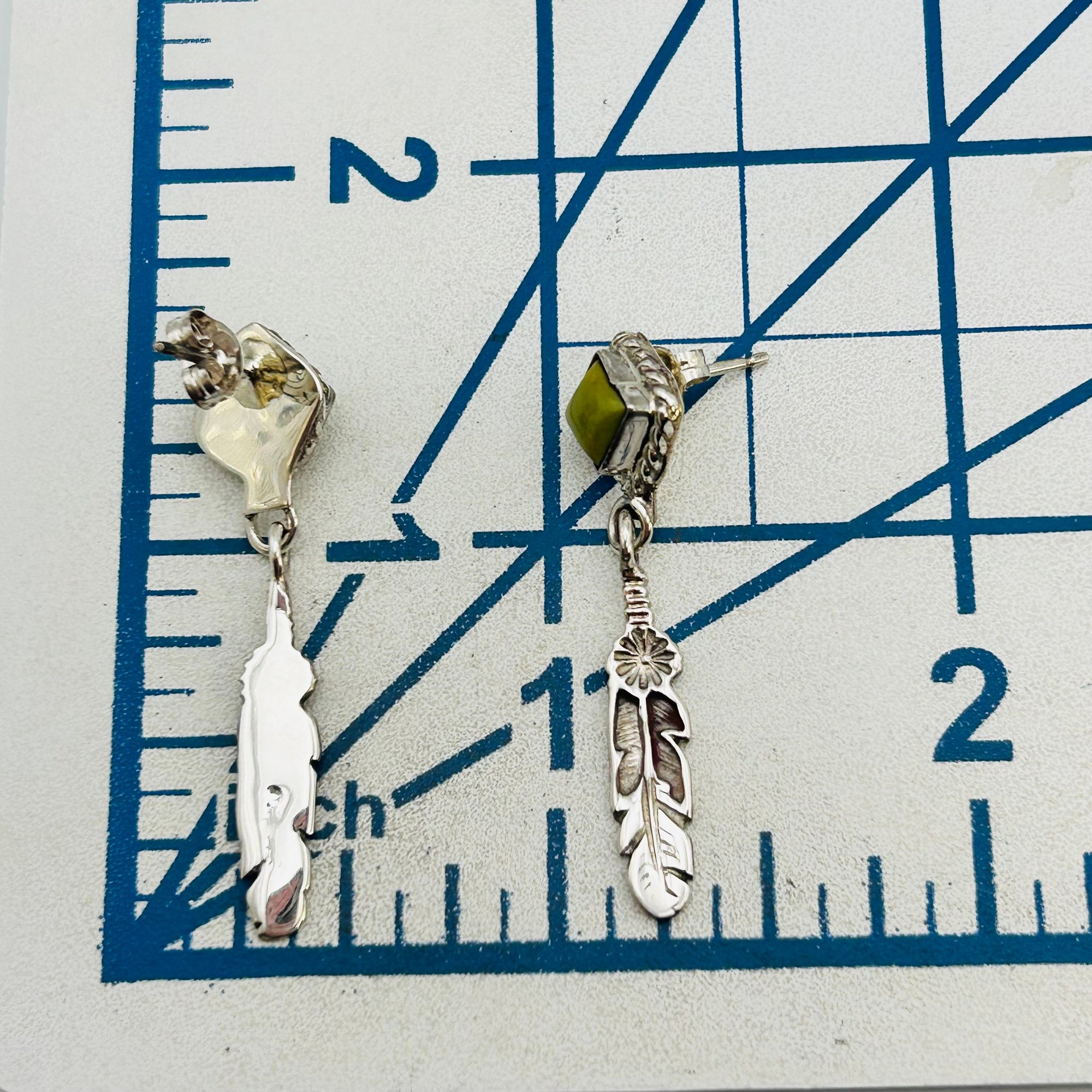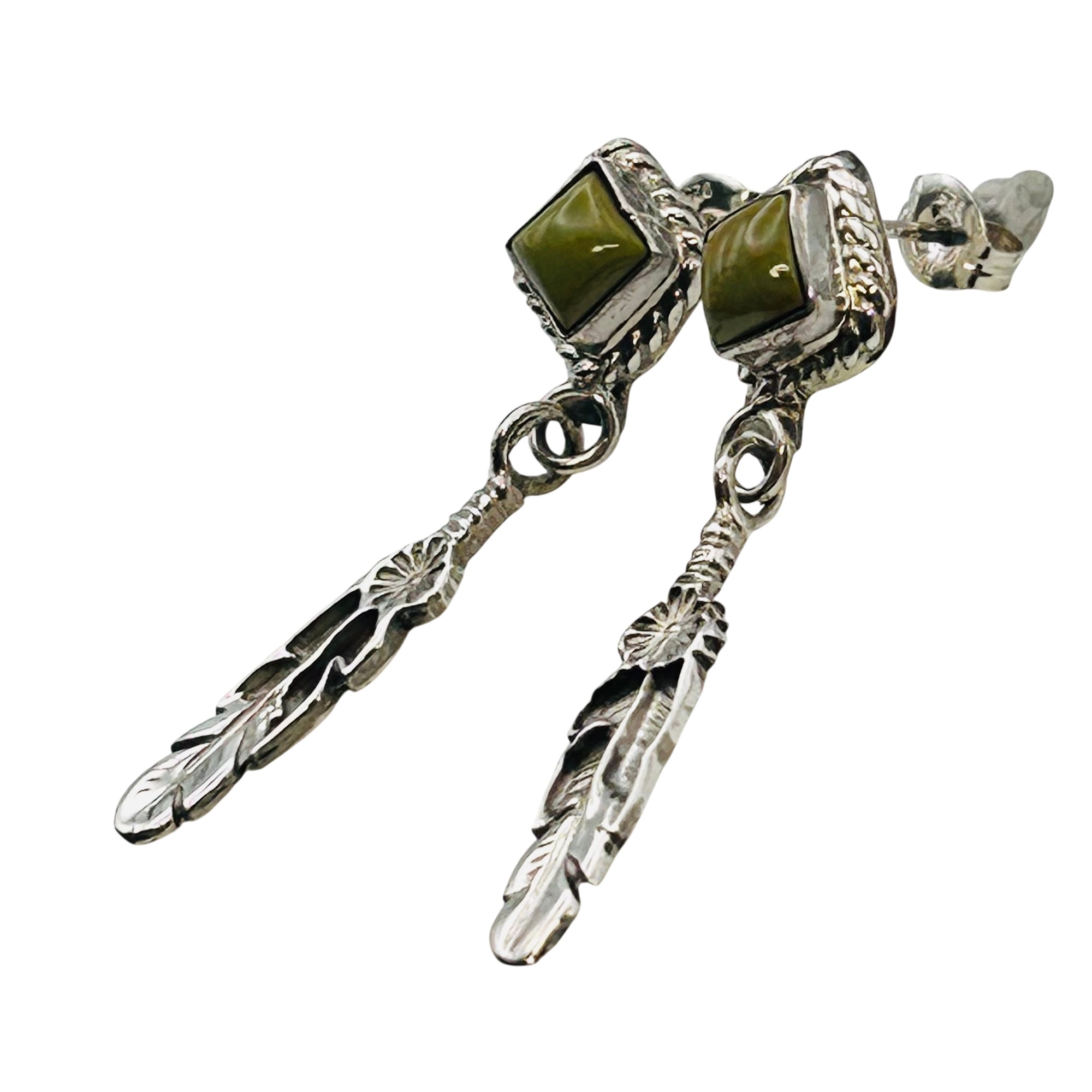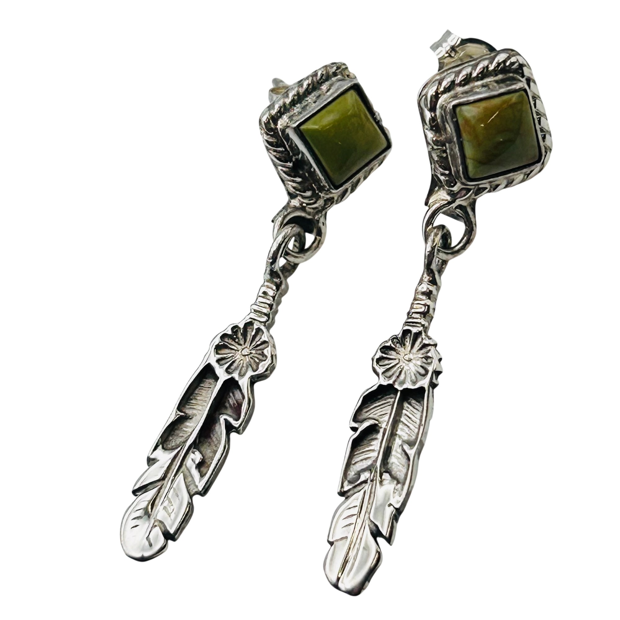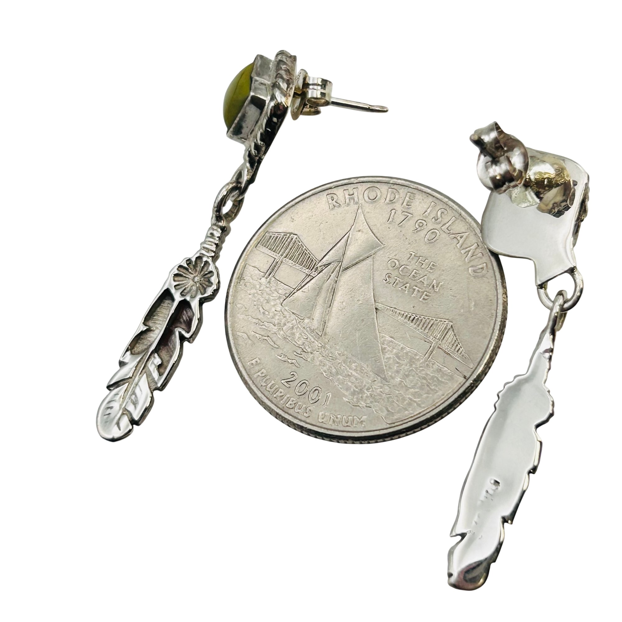 Annisa Martinez Navajo Sterling Kingman Turquoise Hookback Dangle Feather Earrings 3.75 grams