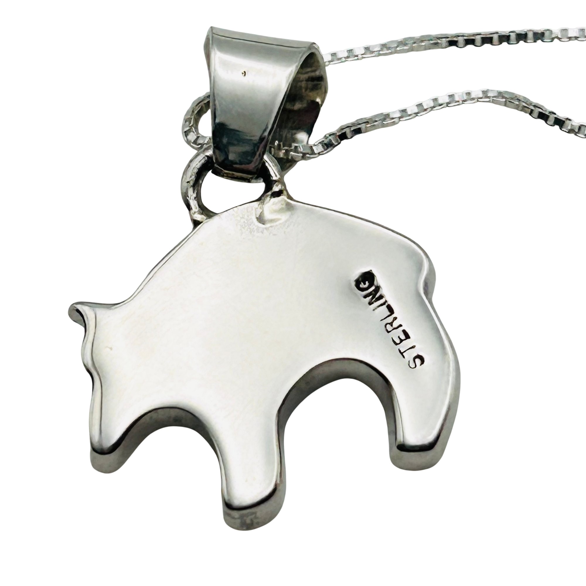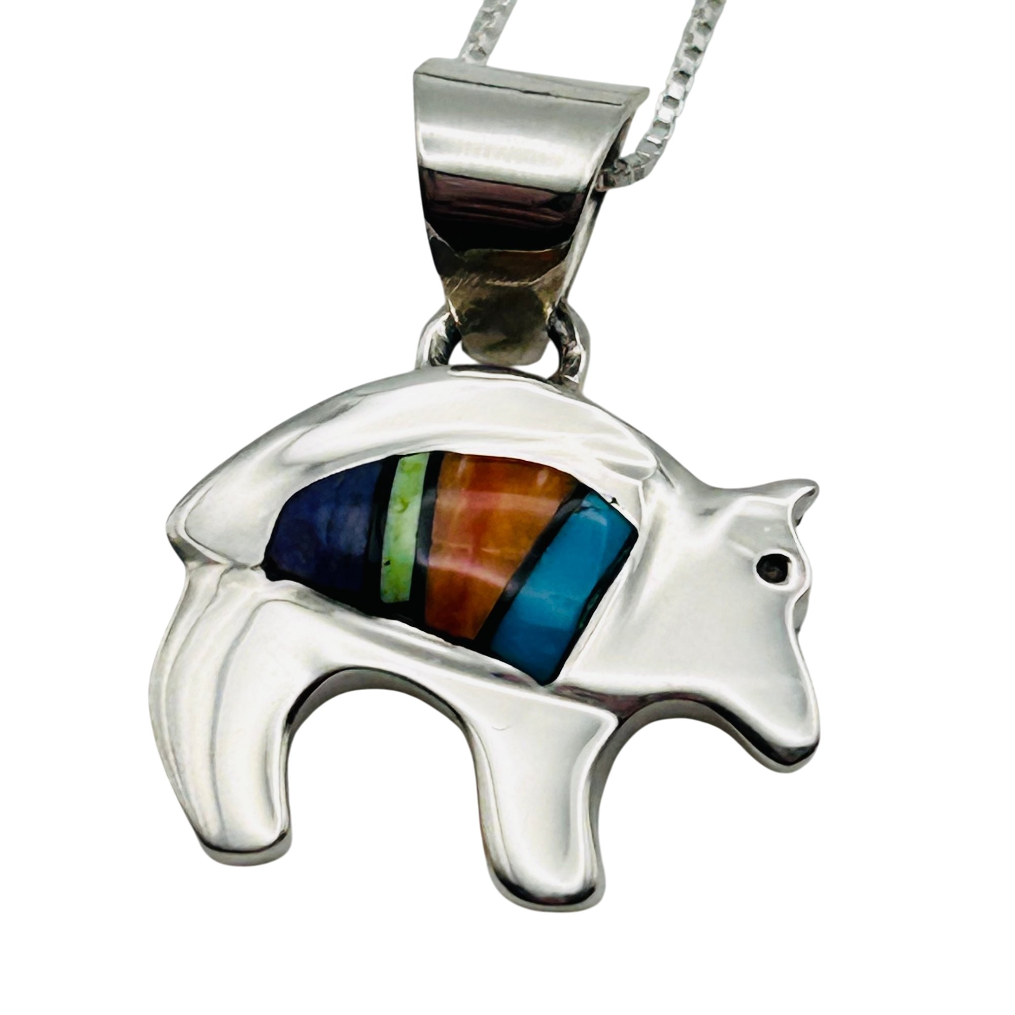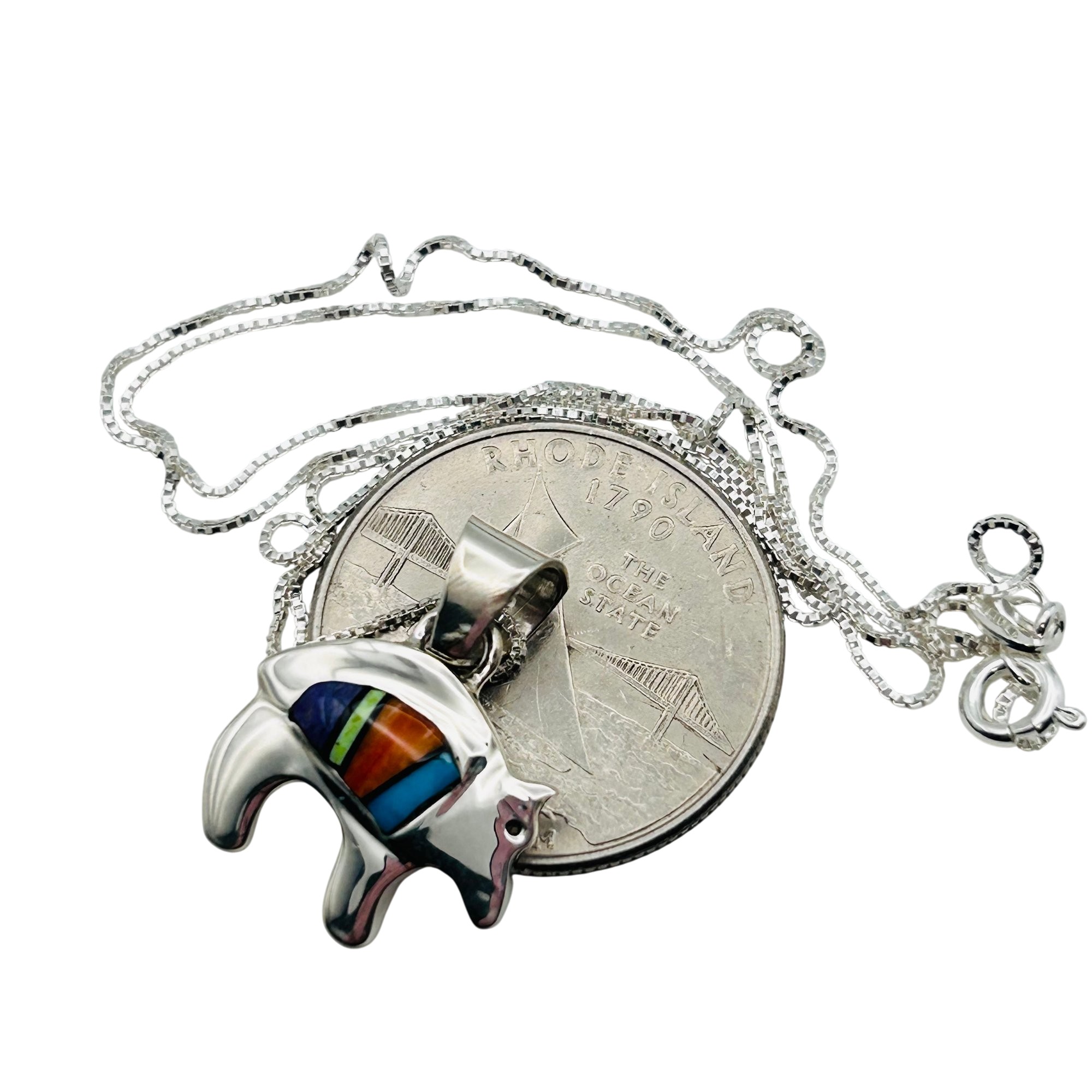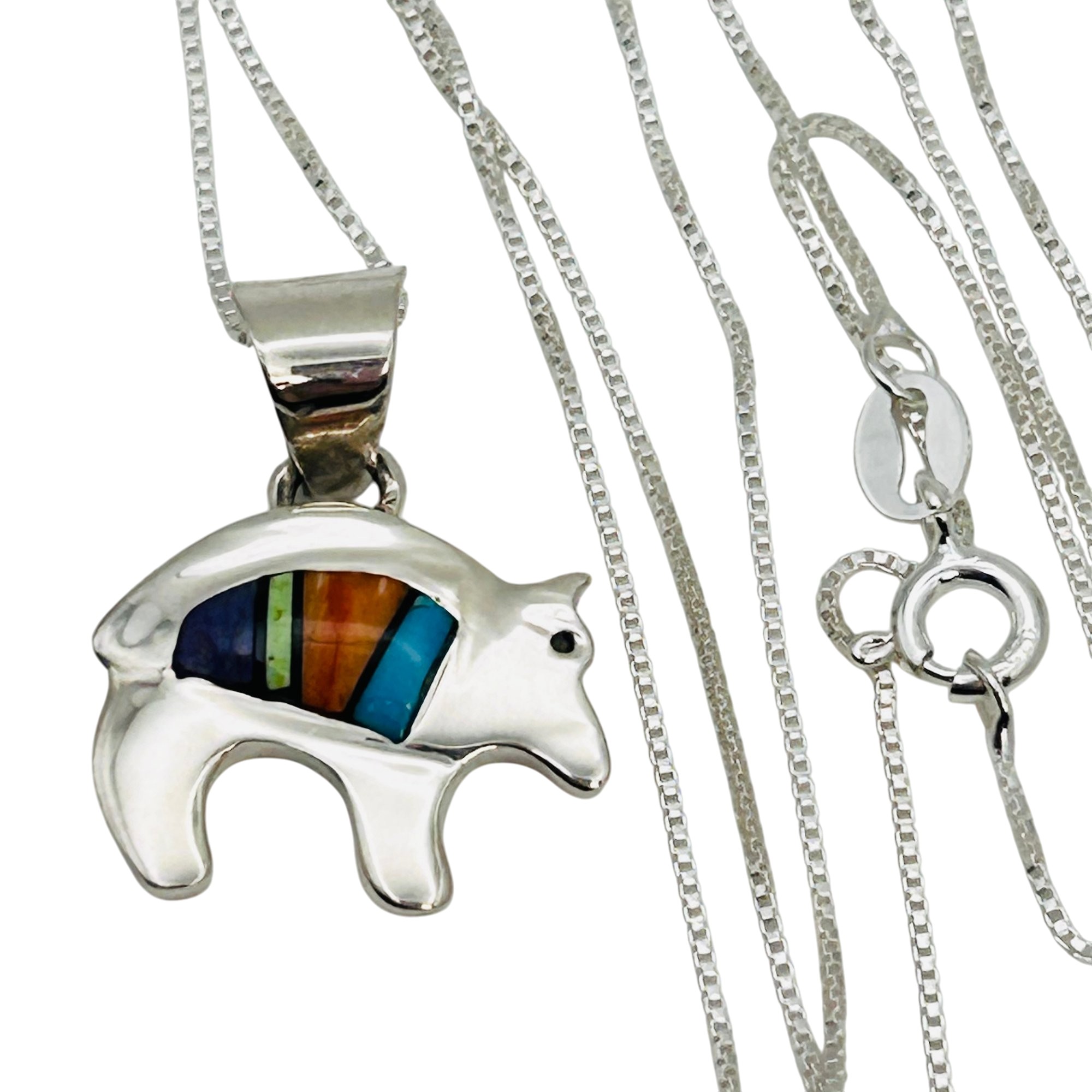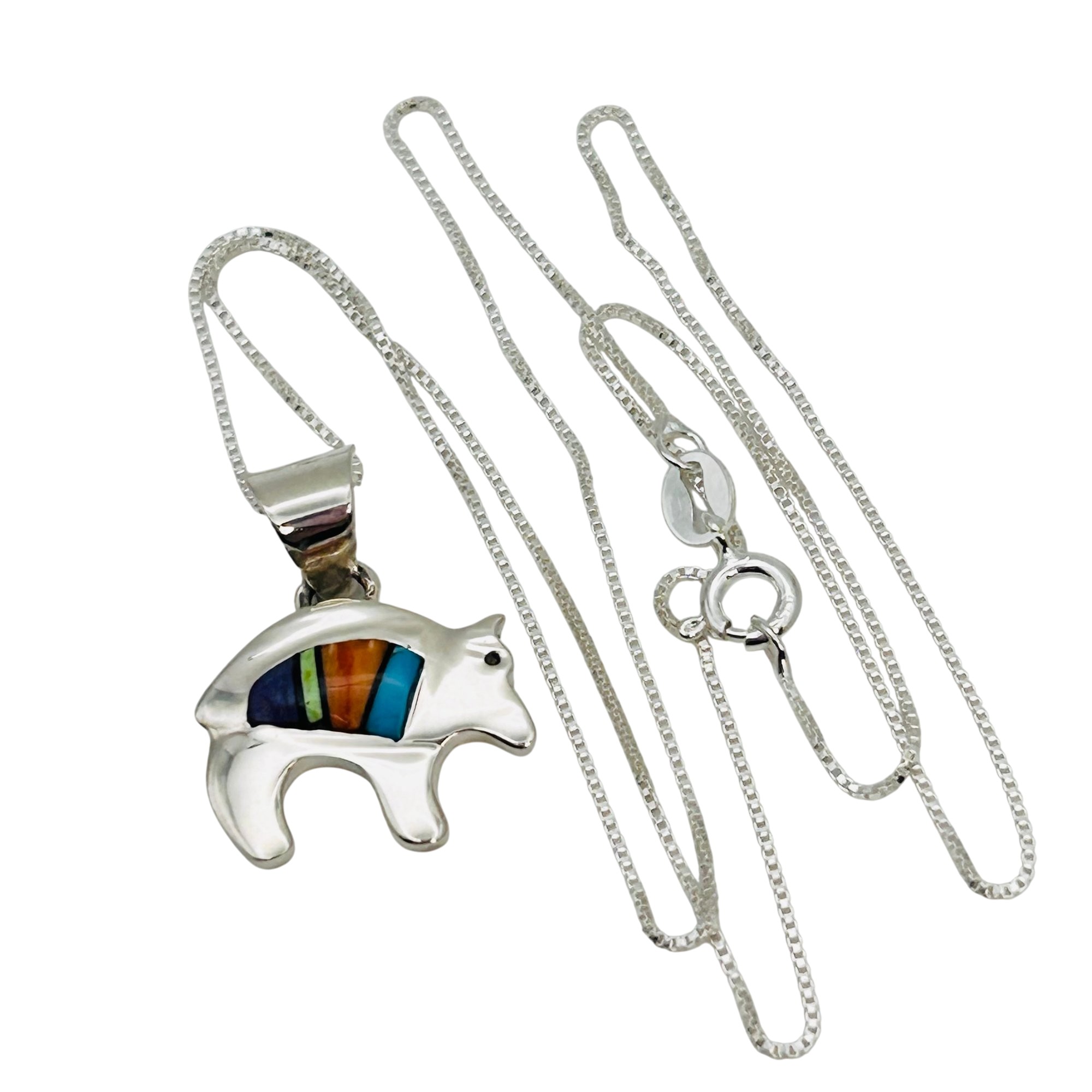 Allen Lee Navajo Sterling inlay Multi stone Spiny Oyster Turquoise bear pendant sterling 20inch boxchain Necklace 4.75 grams