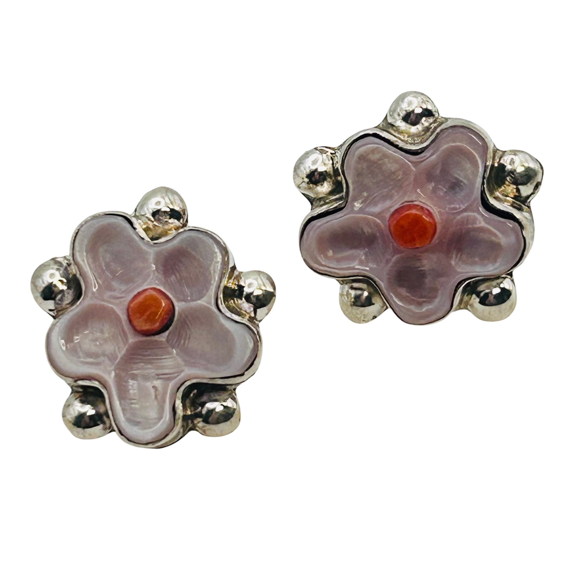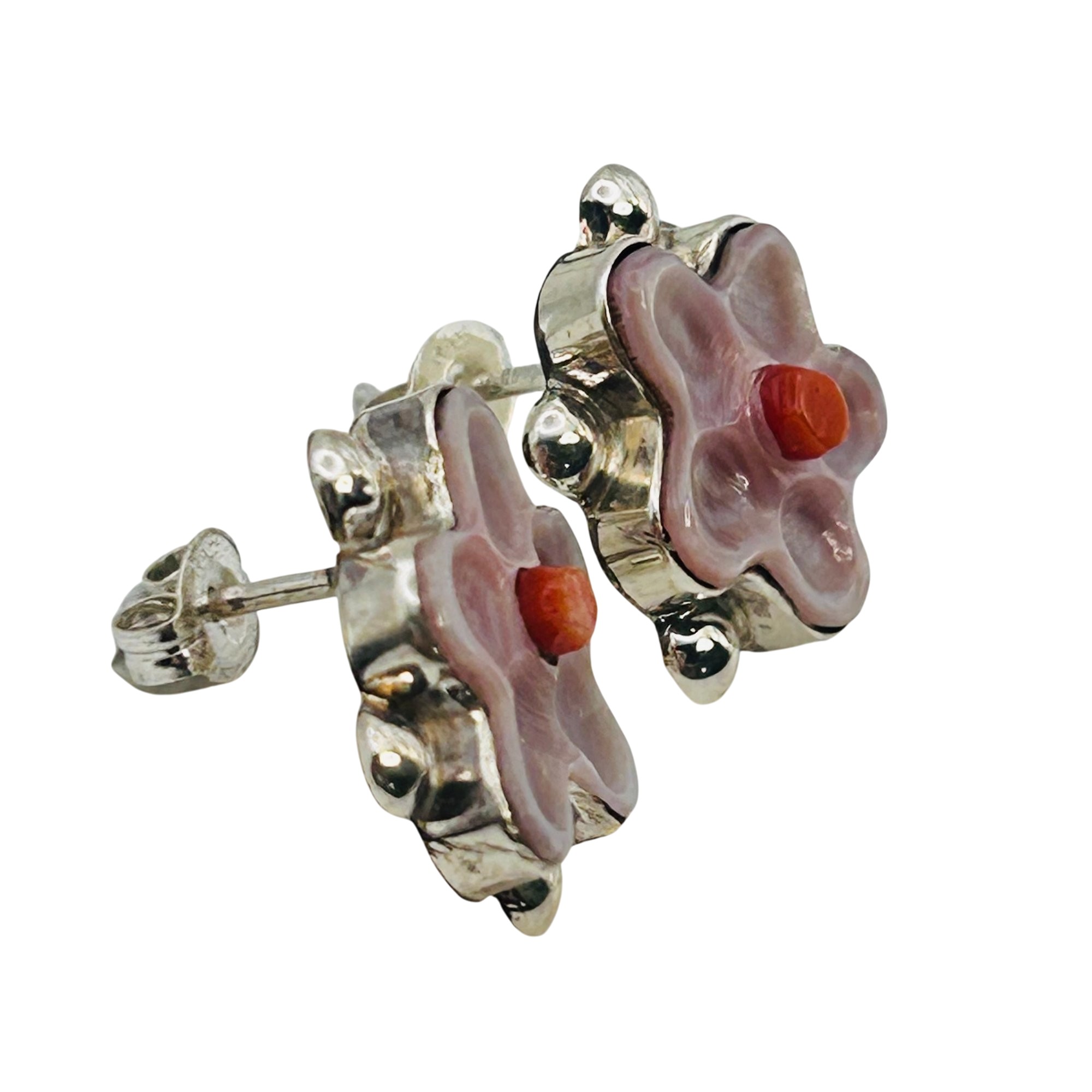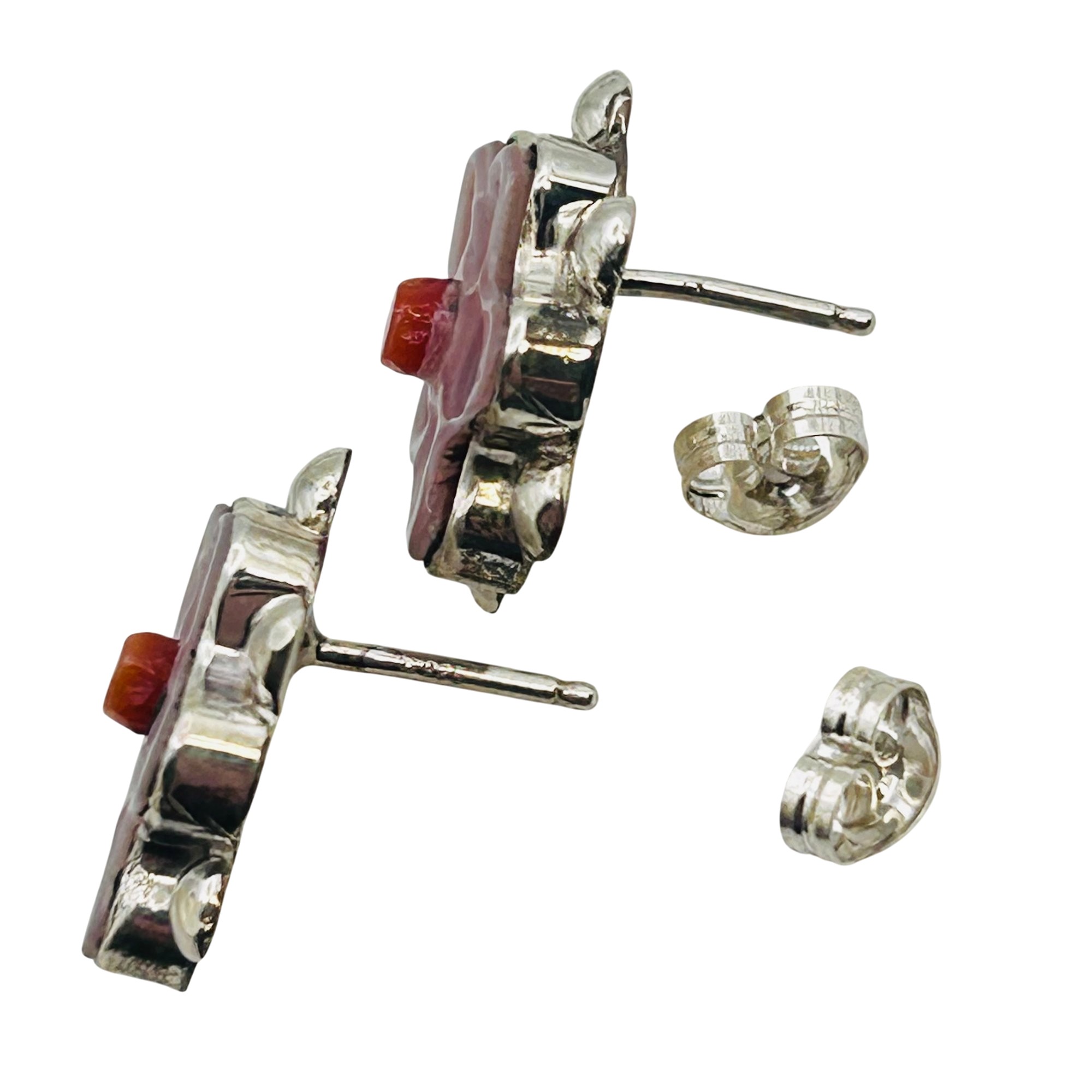Floria Shebala Zuni Sterling Multi Color mother of pearl and coral flower stud back Earrings 3.73 grams