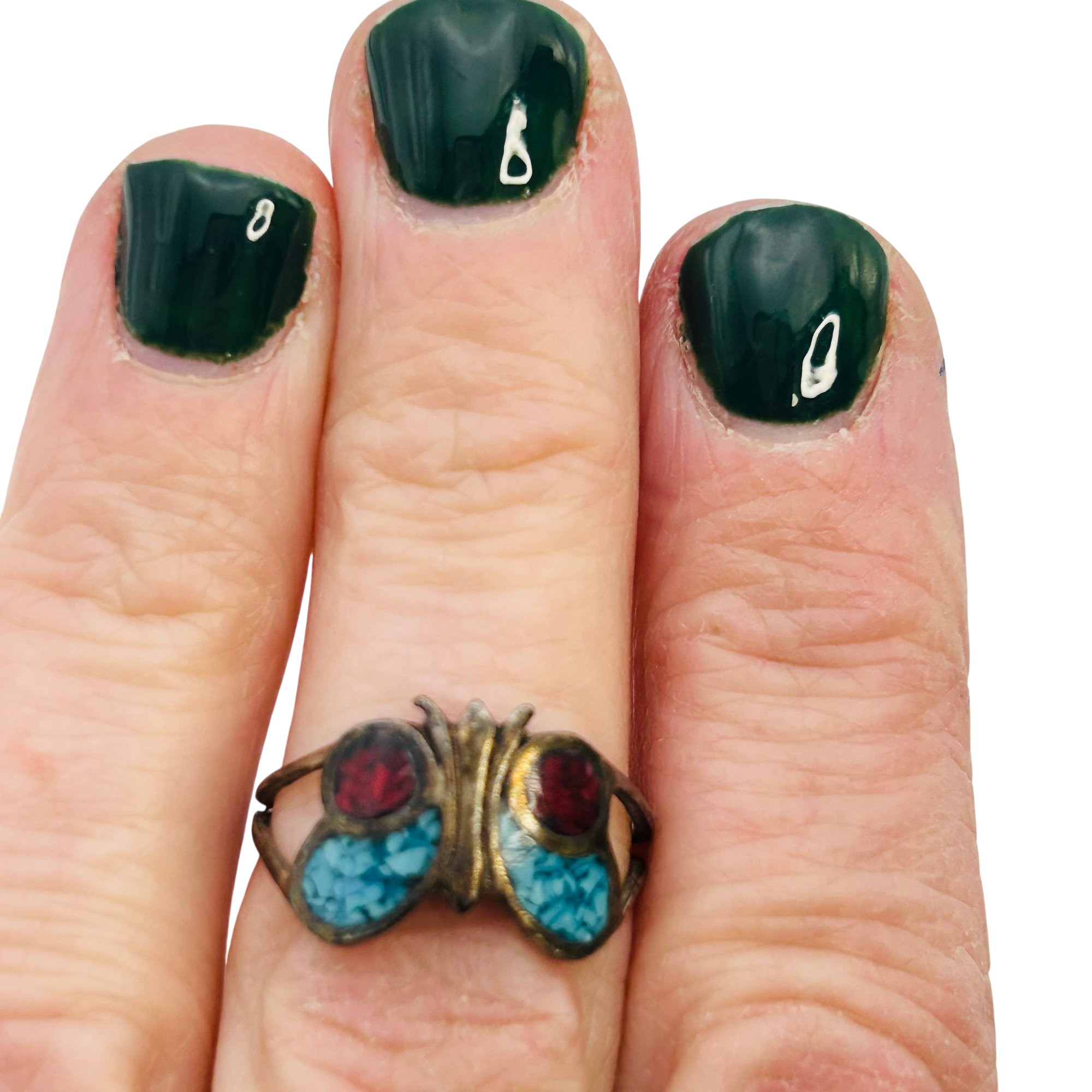 Native Crushed Turquoise And Coral Inlay Butterfly Ring Size 7