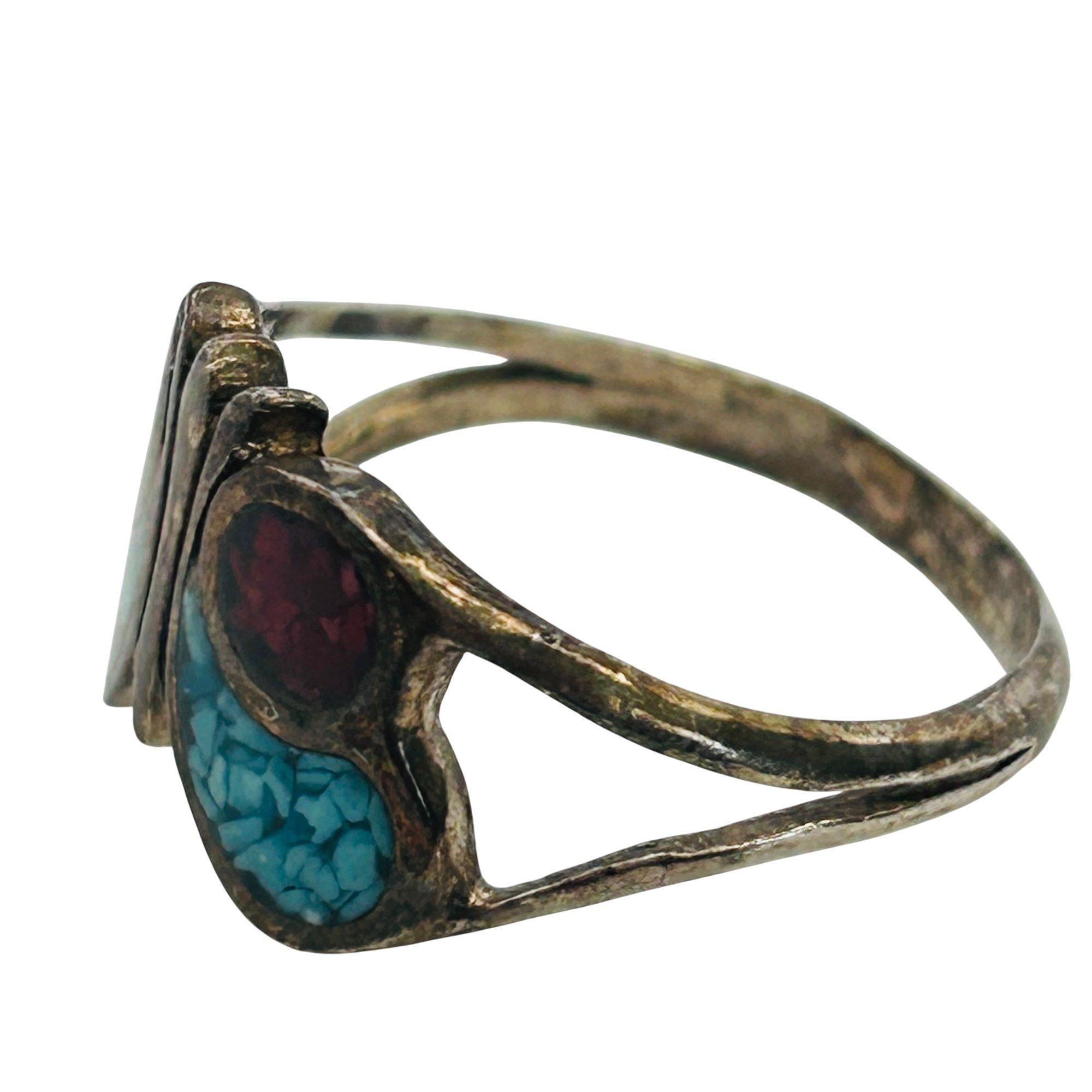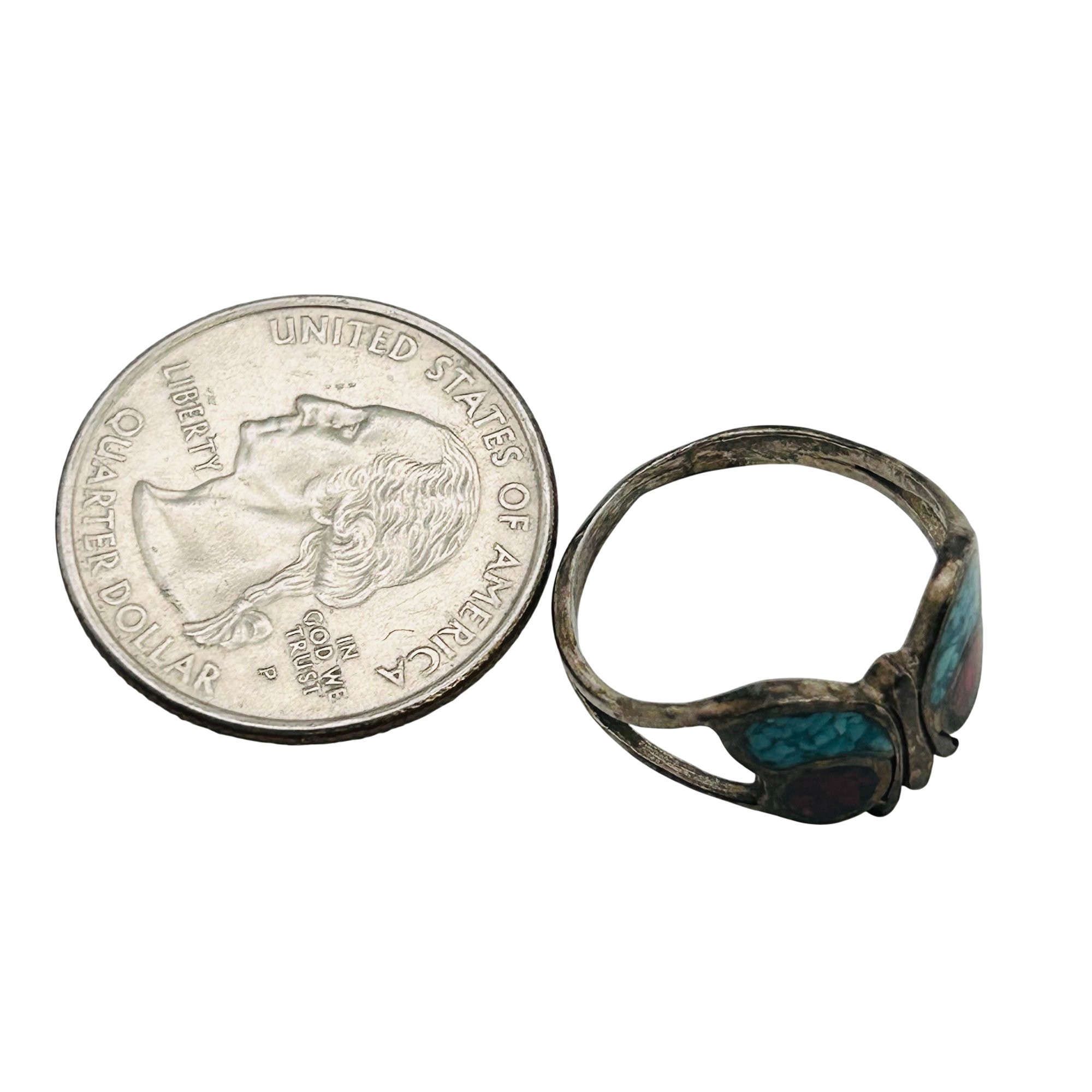 Native Crushed Turquoise And Coral Inlay Butterfly Ring Size 7 2.39 grams