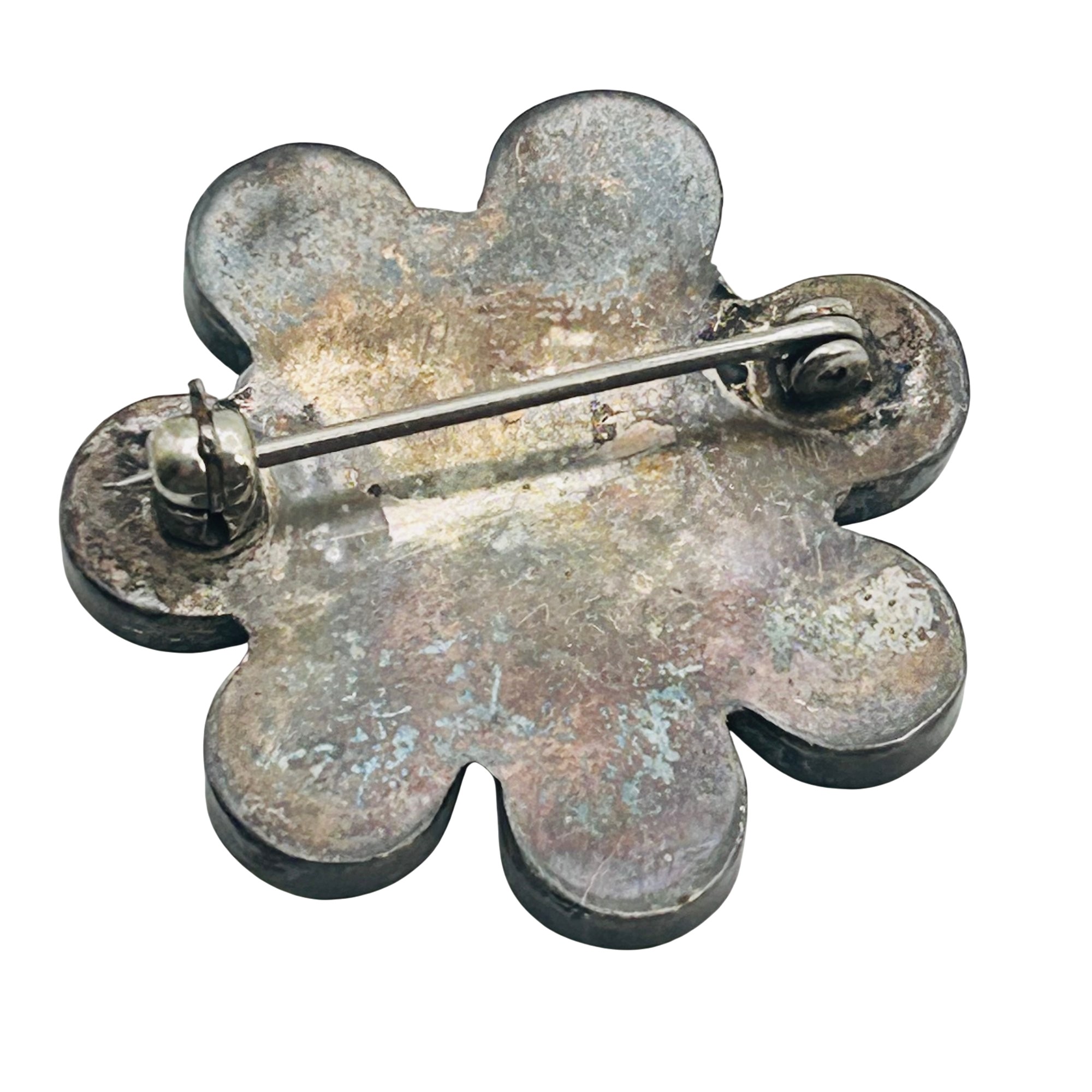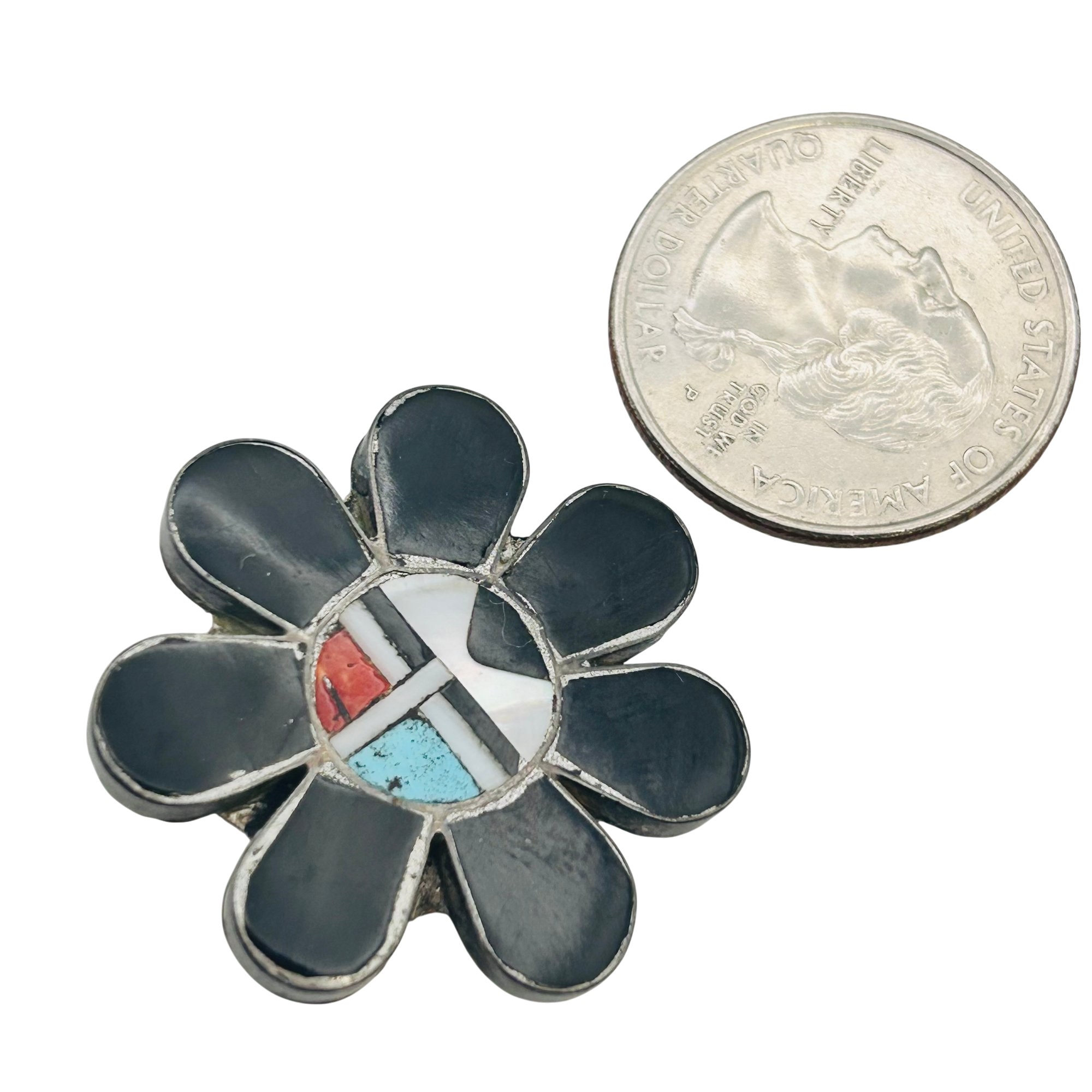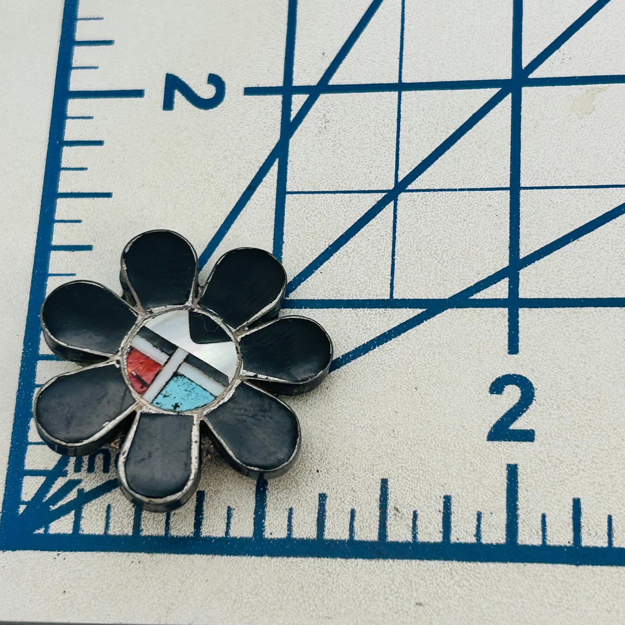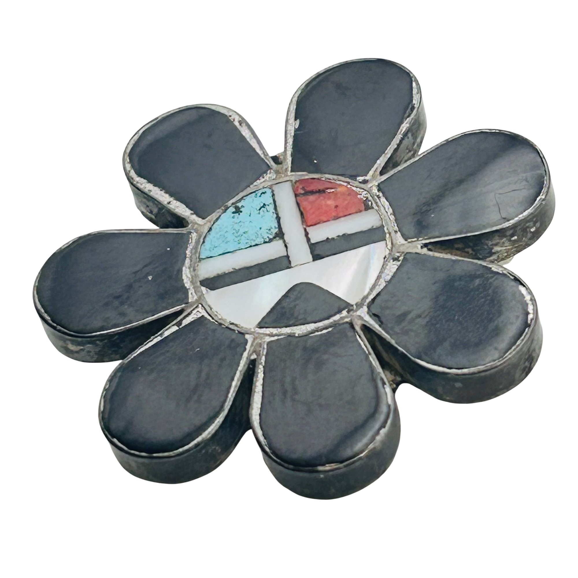 Vintage Zuni Sun Face Inlay Stone onyx turquoise coral mother of pearl flower Sterling Pin 5.2 grams
