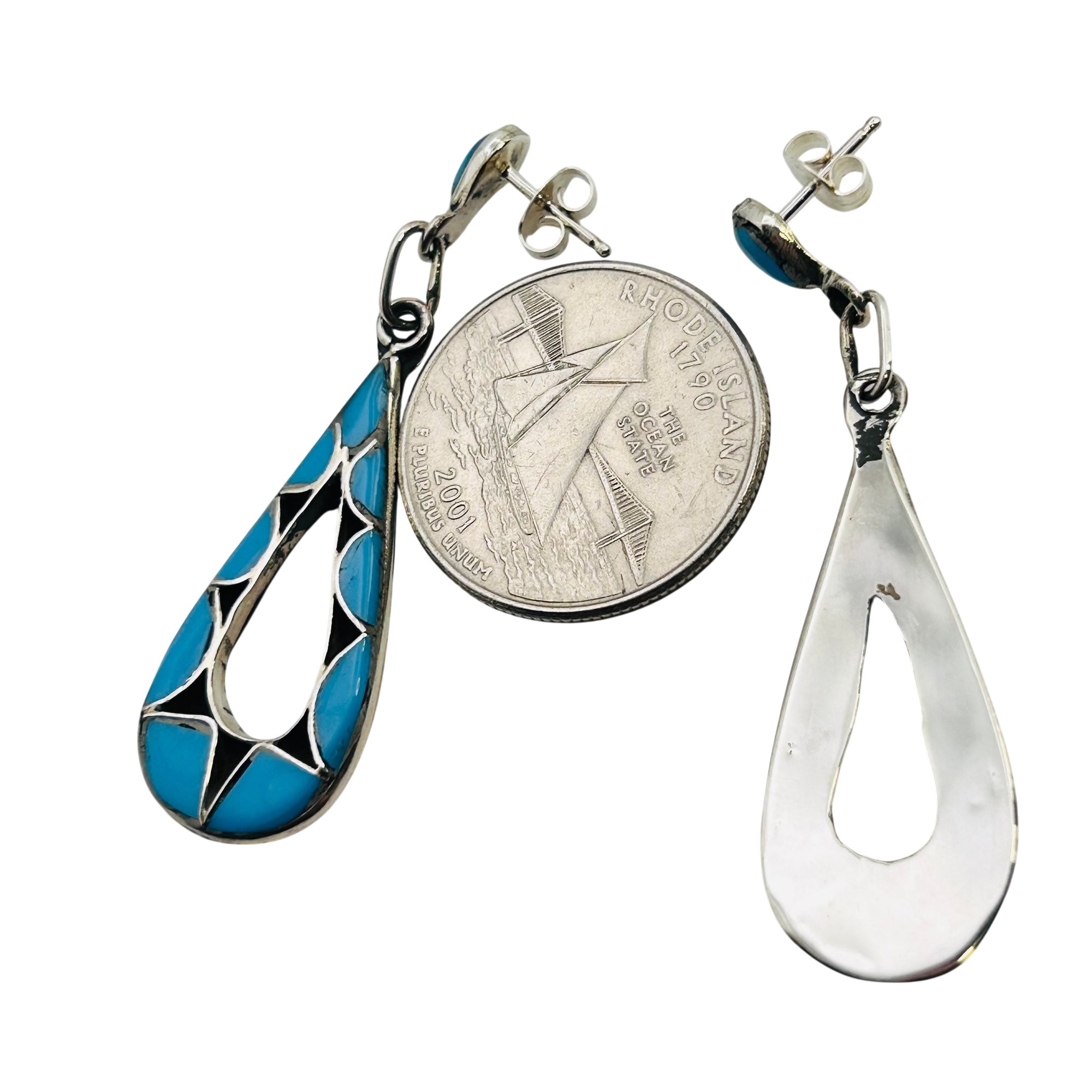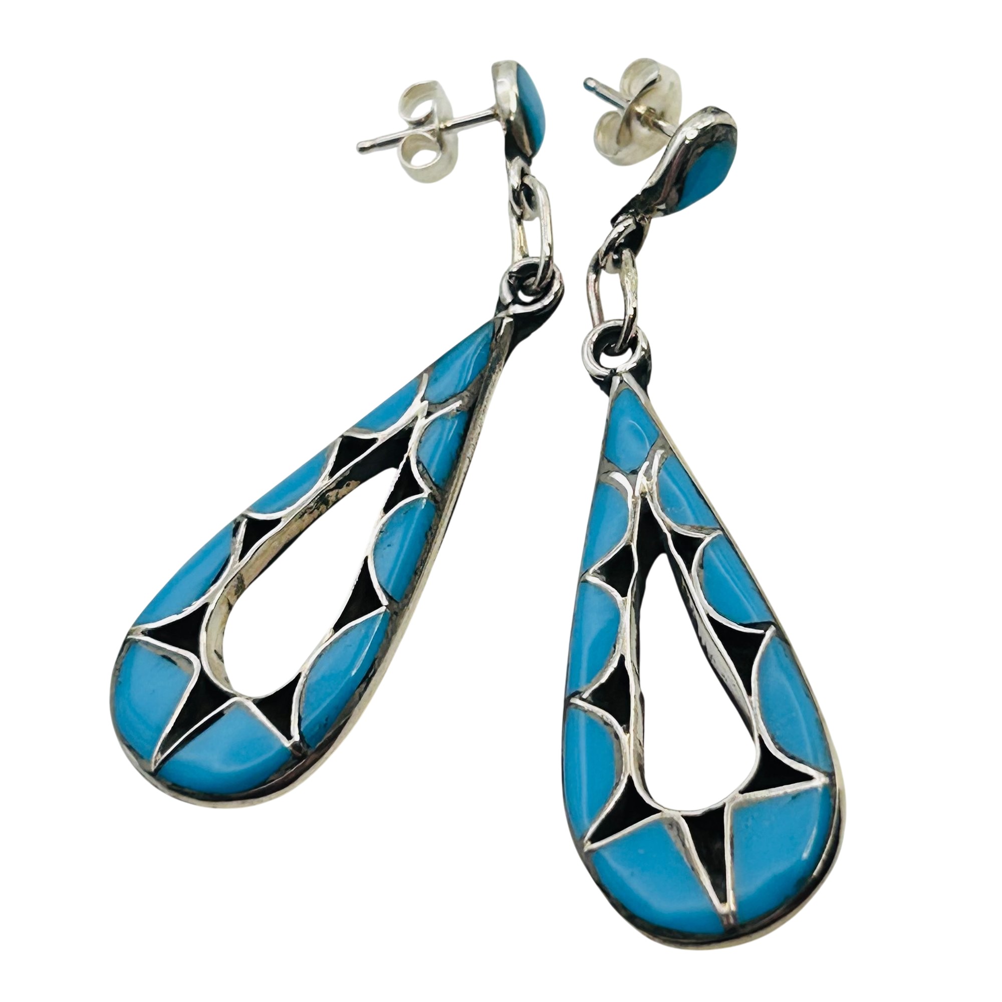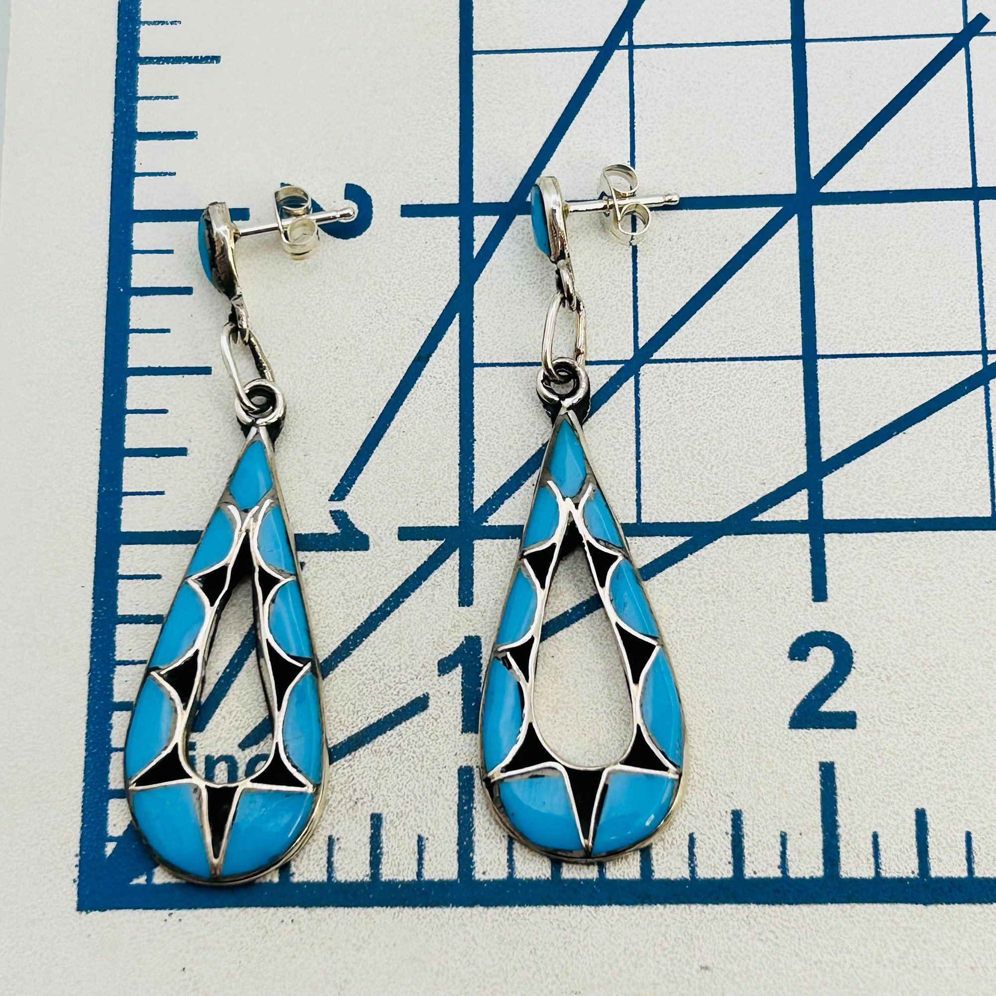 Emma Bowakaty Zuni Sterling Turquoise onyx oval cutout dangle Earrings 5.53grams