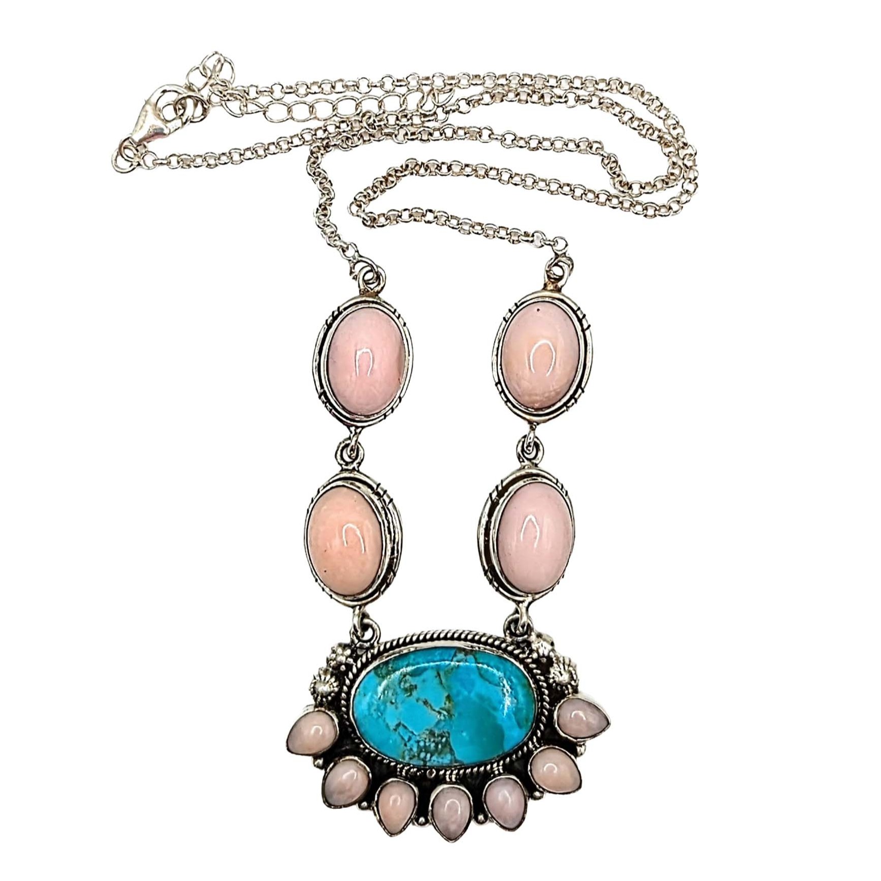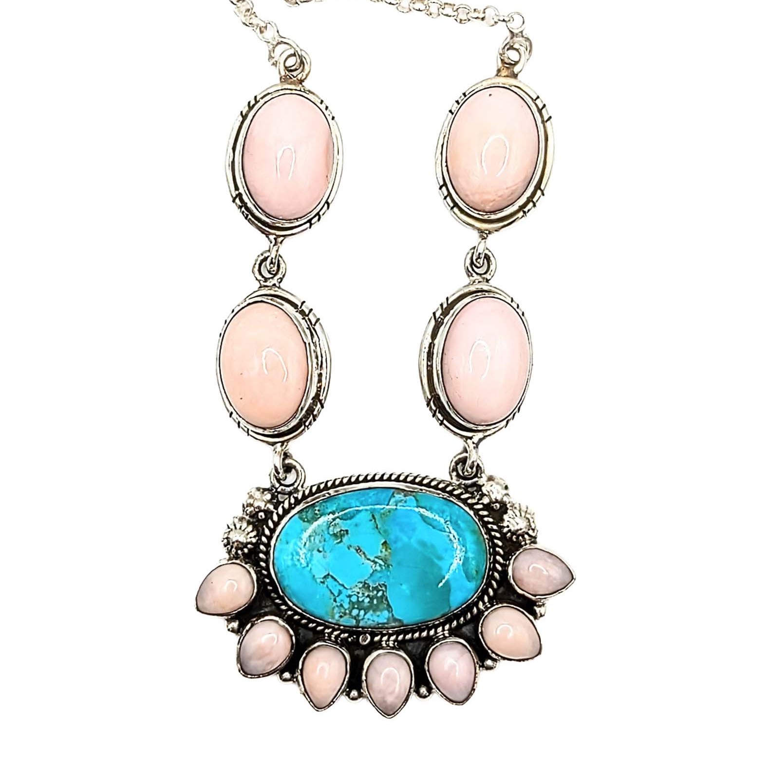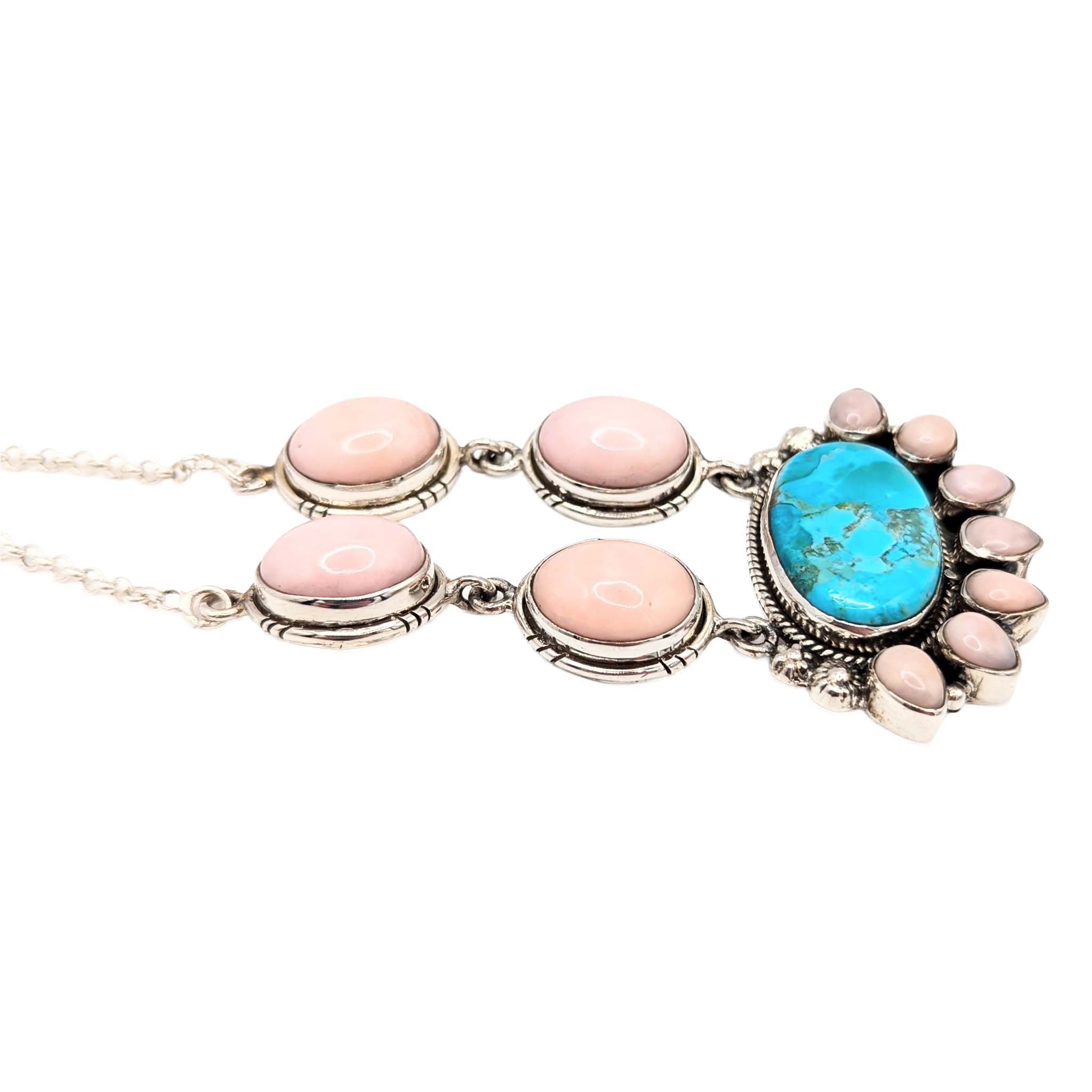 Southwest Sterling Silver Turquoise Pink Opal Necklace Signed Hada Sterling 18-20in Length 31.1g