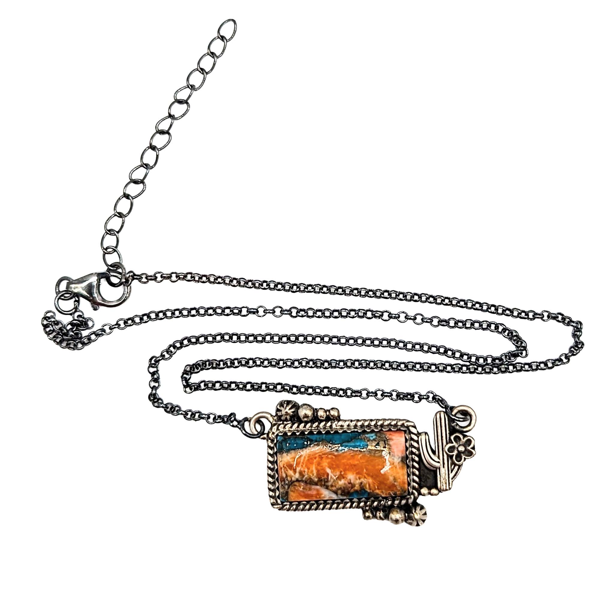 Southwest Sterling Silver Spiny Mojave Turquoise Cactus Flower Necklace