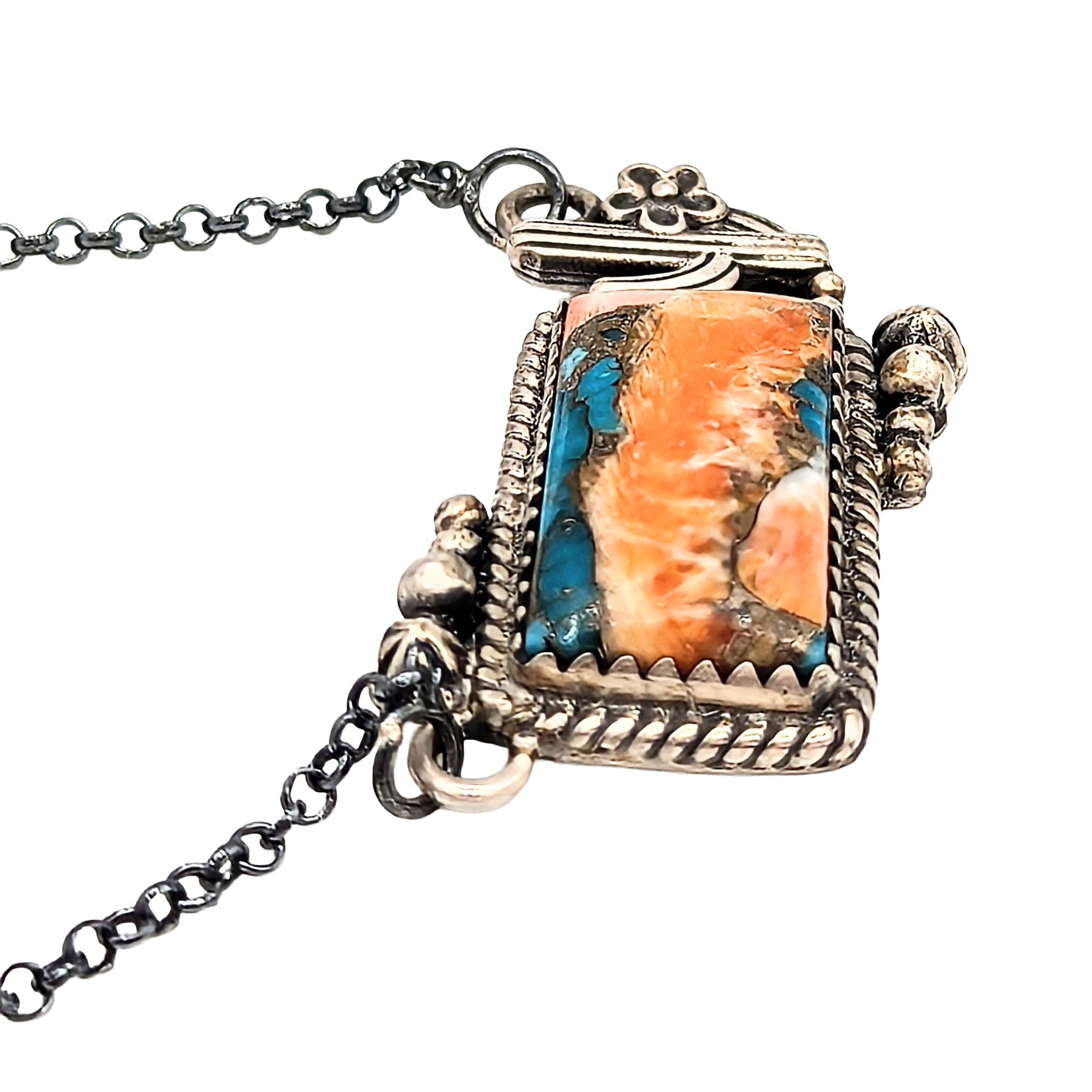 Southwest Sterling Silver Spiny Mojave Turquoise Cactus Flower Necklace Signed Hada Sterling 16-18in Length 10.6g