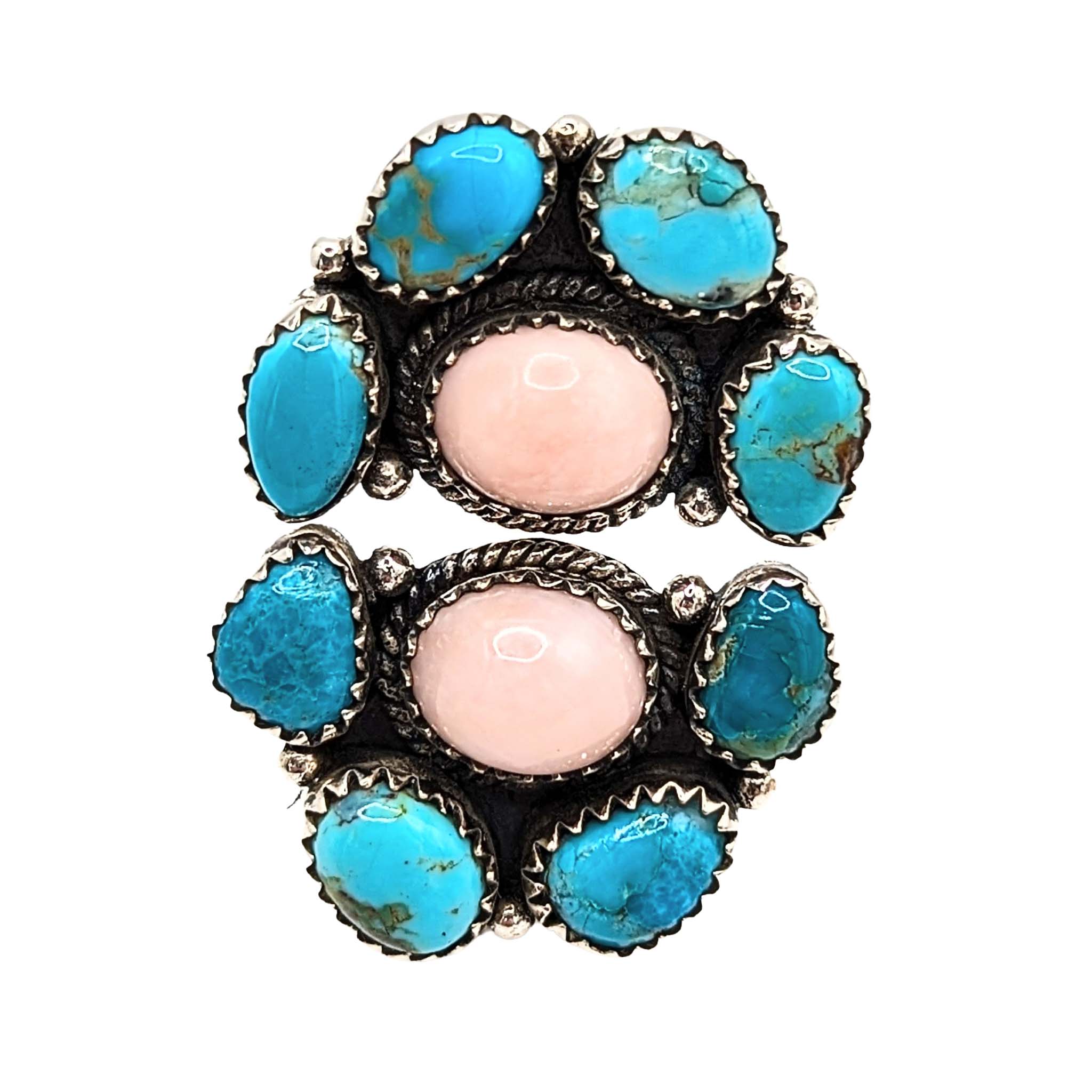 Southwest Sterling Silver Turquoise Pink Opal Double Cluster Ring Signed Hada Sterling Approx Size 6 Adjustable 16g