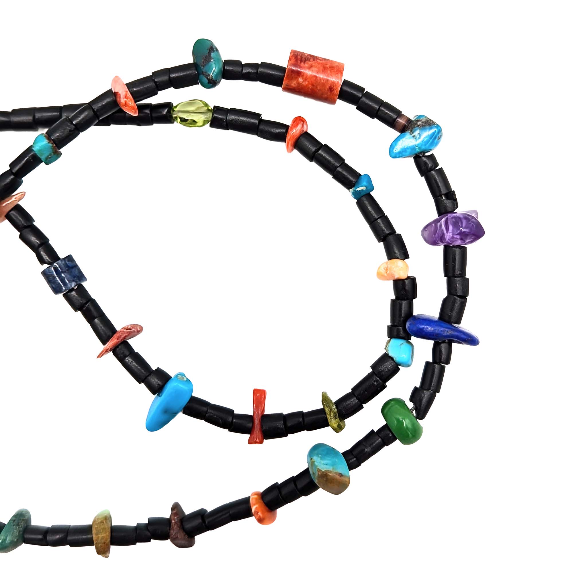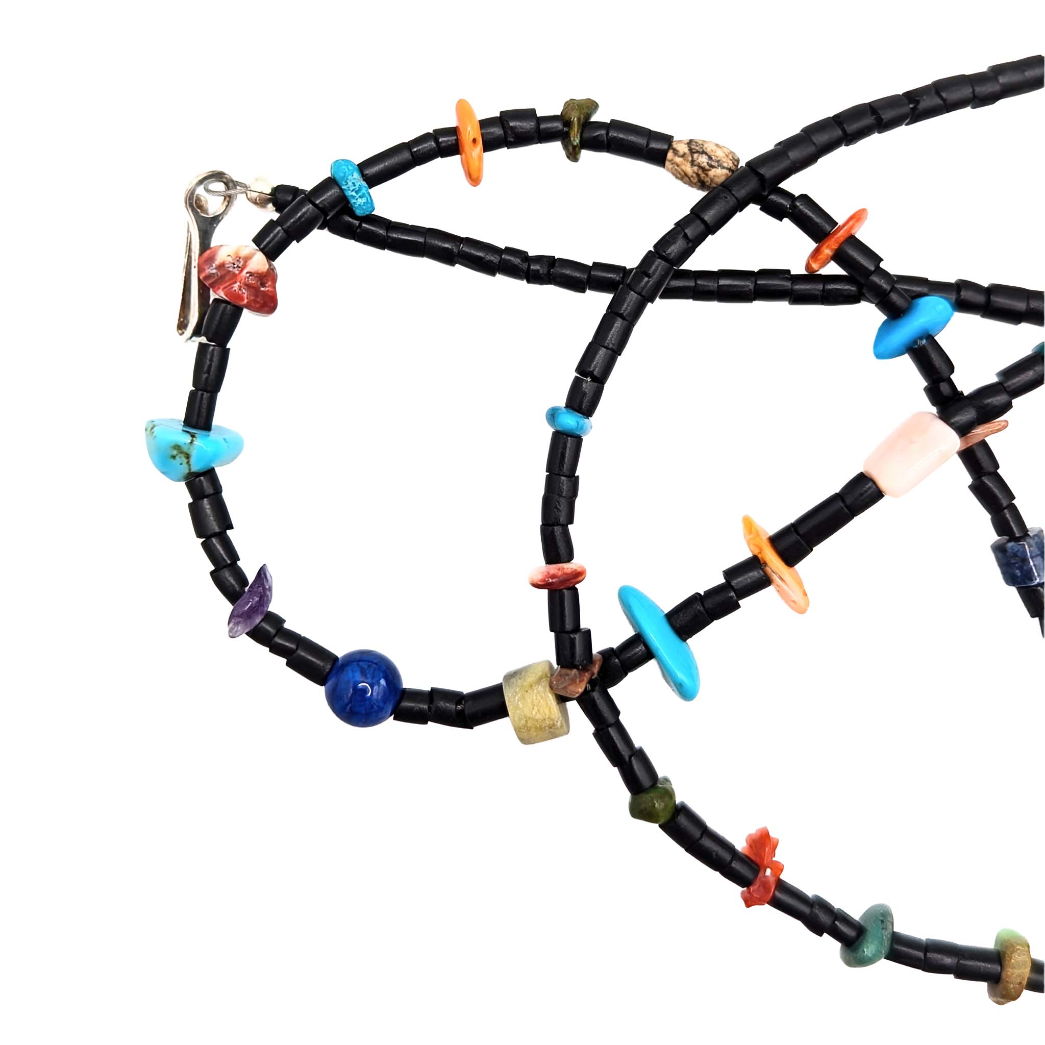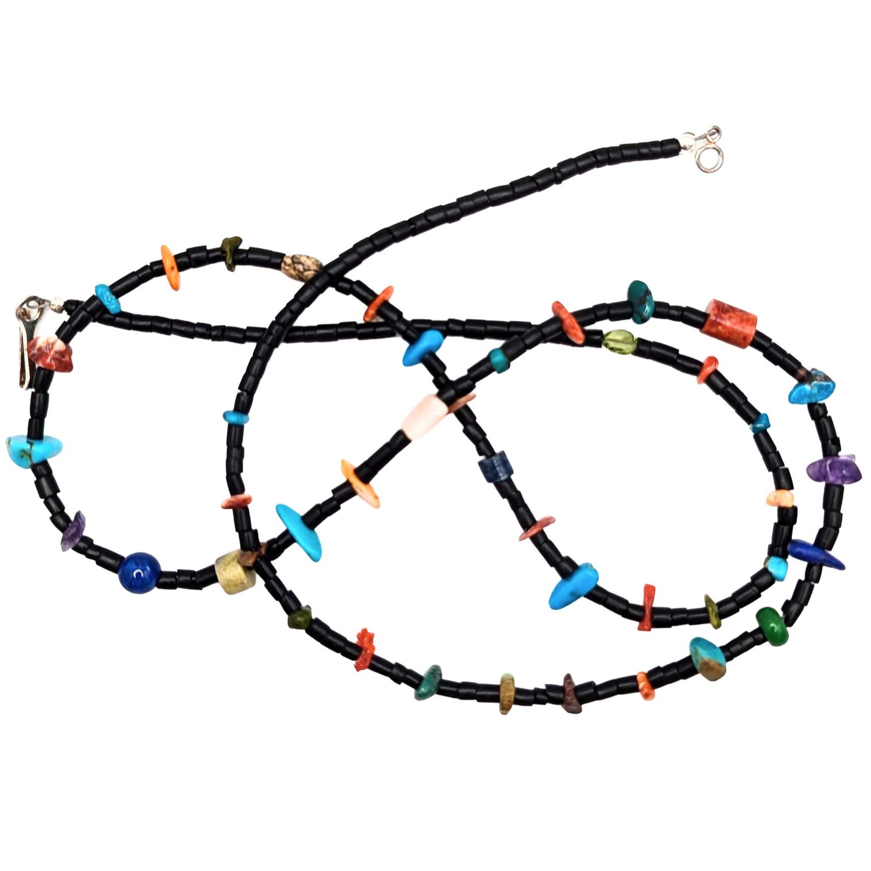 Native Made Multi Gemstone & Sterling Silver Clasp Fetish Necklace with Onyx, Coral, Lapis, Turquoise, Jasper, Peridot, Amethyst, Spiny Oyster & Shell Measures 3mm-10mm beads 28in Length 9.7g
