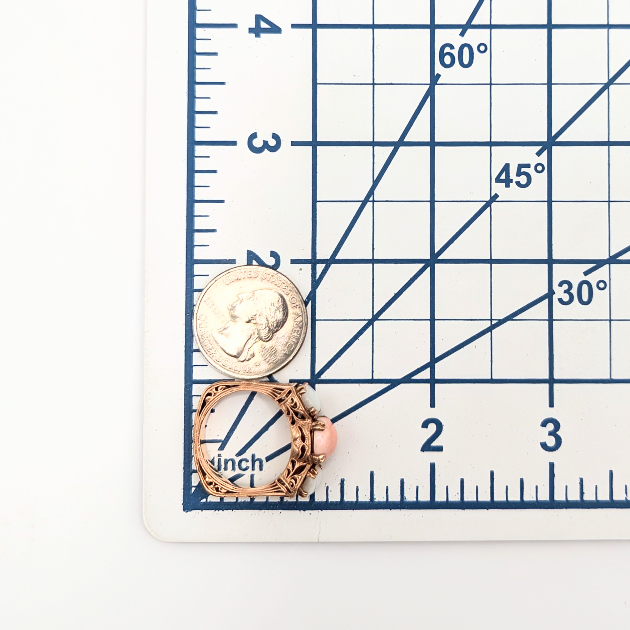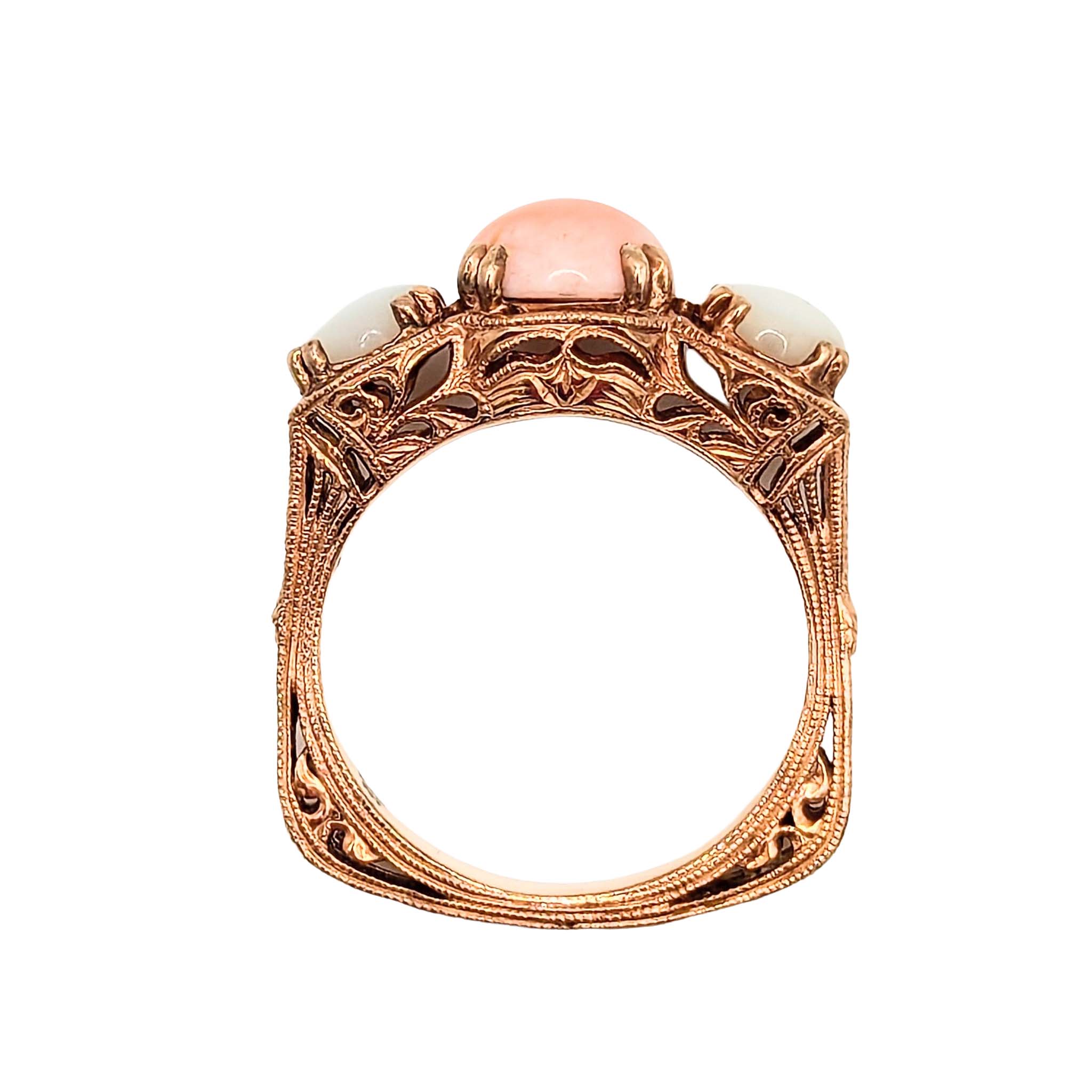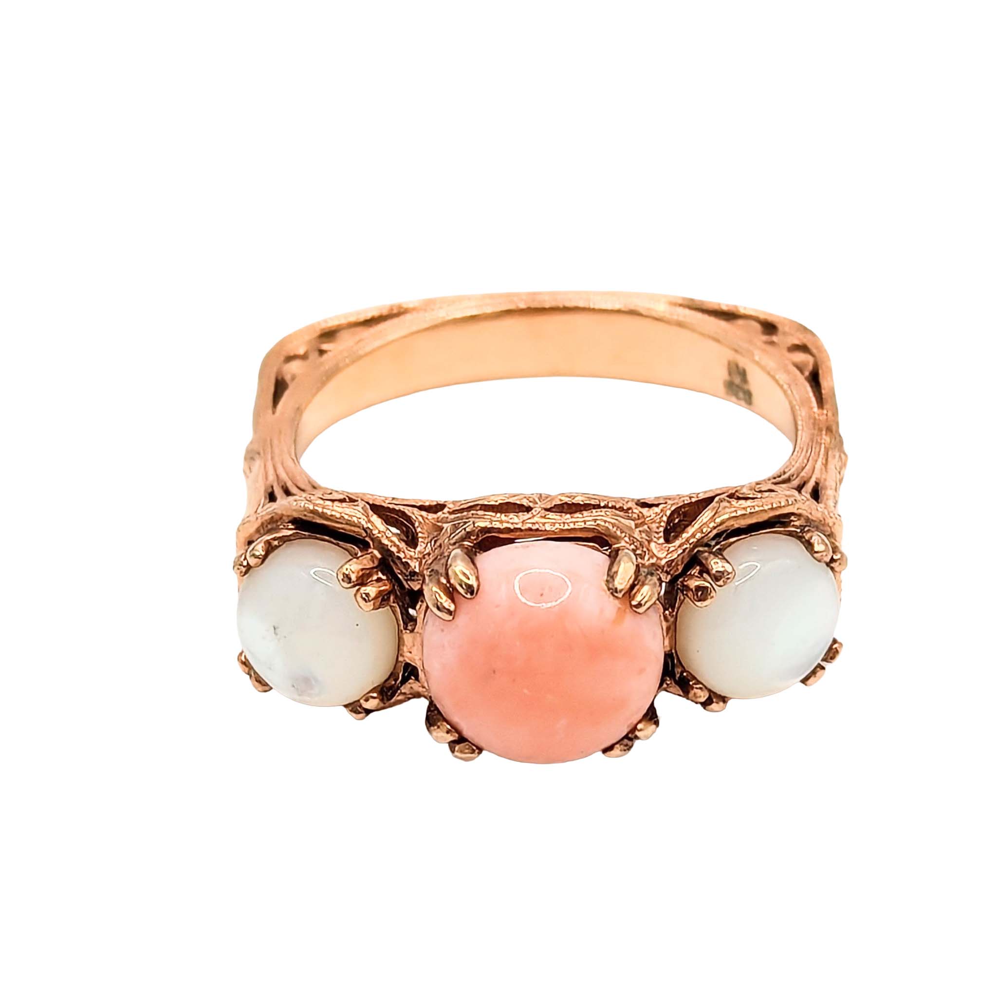 Sterling Silver Gold Over Angel Skin Coral Mother of Pearl Filigree Ring Signed NH Size 9.5 6.3g