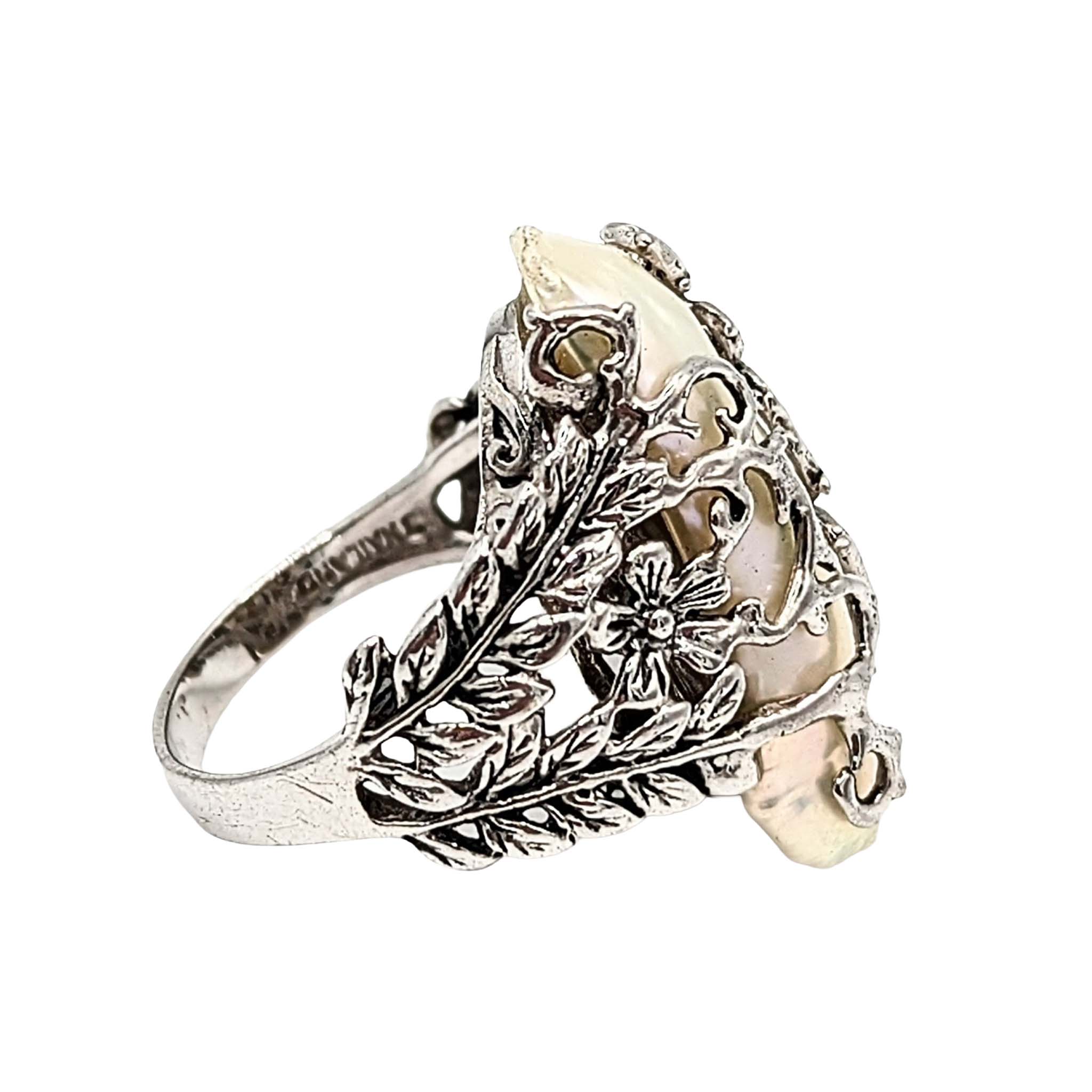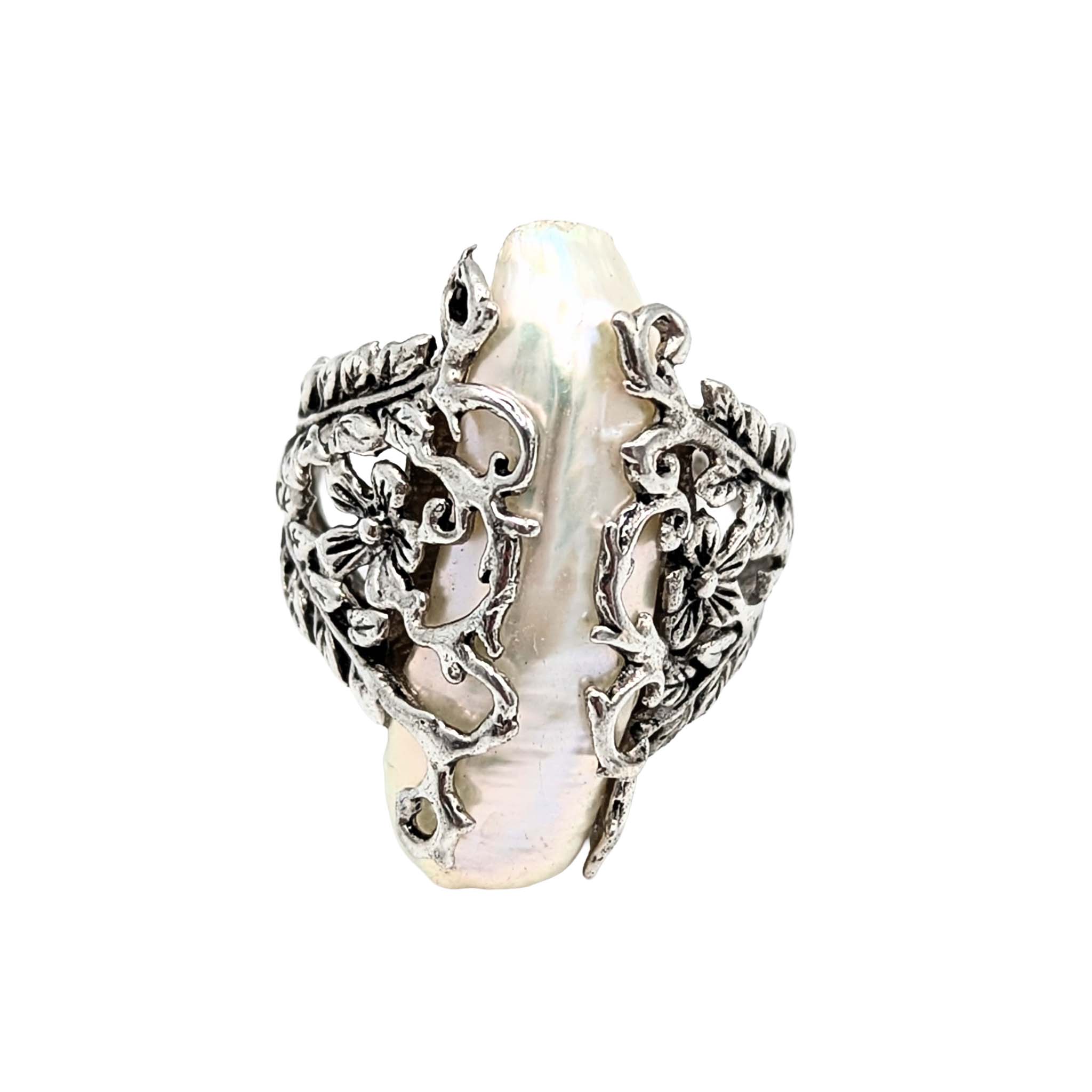 Sterling Silver Natural Pearl Floral Detail Ring Signed CFJ .925 Size 7.75 8.6g