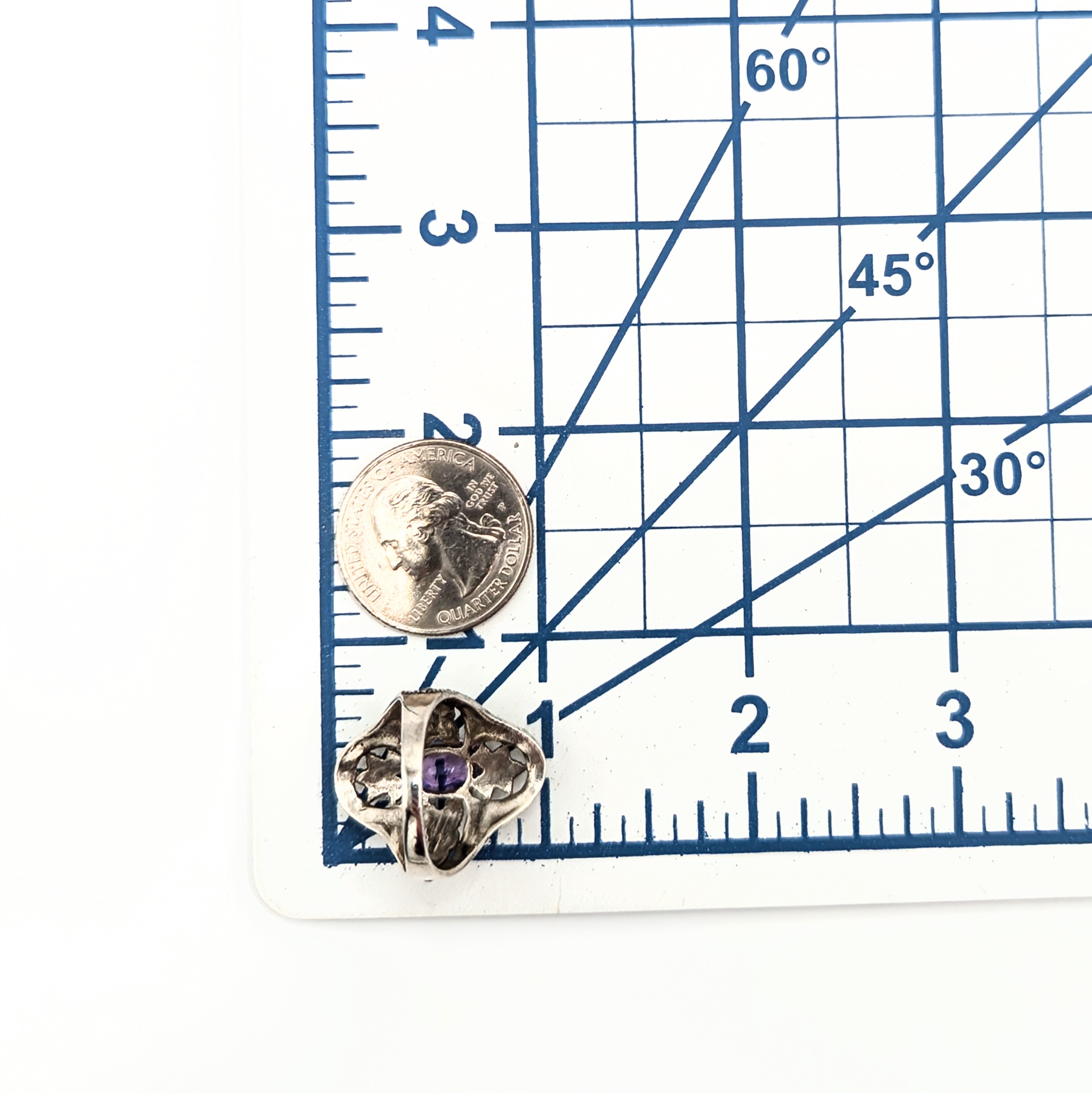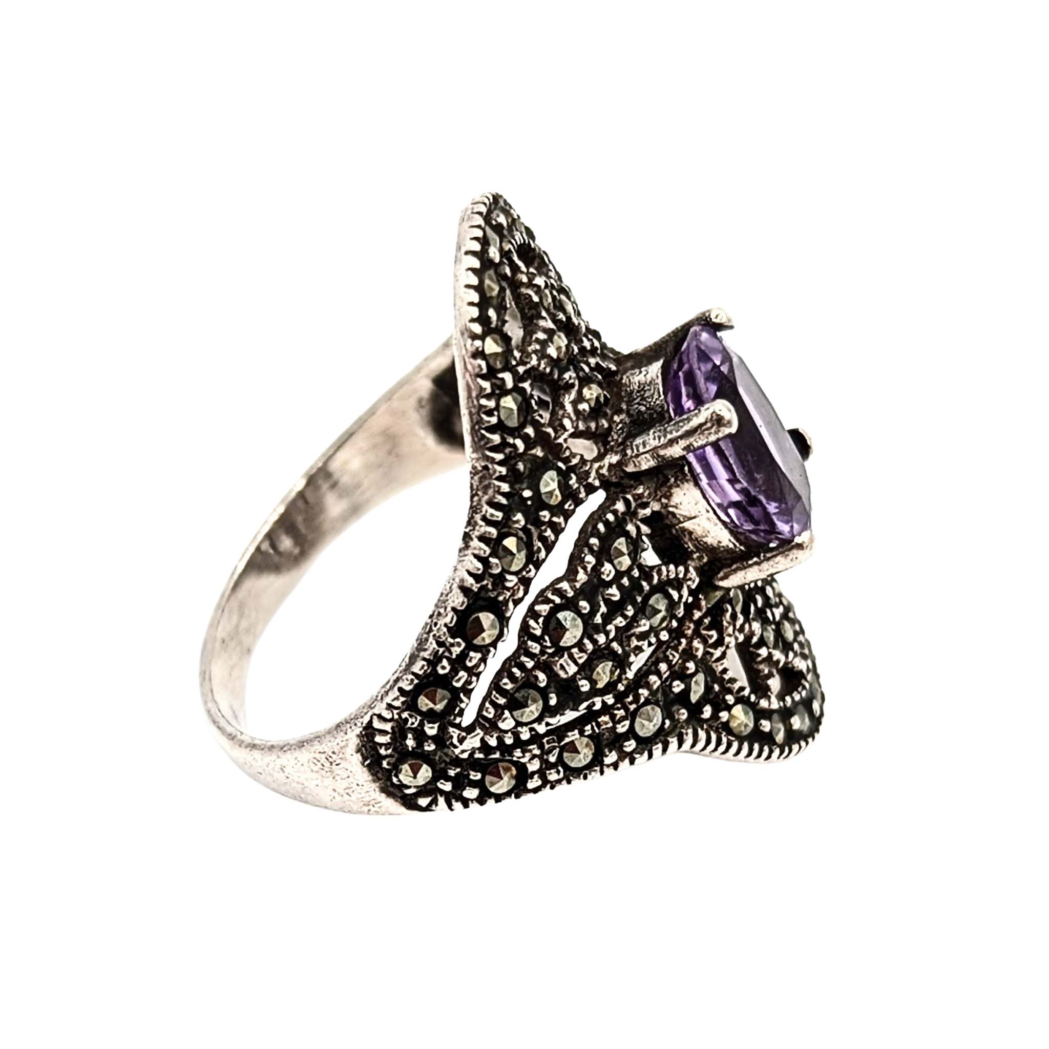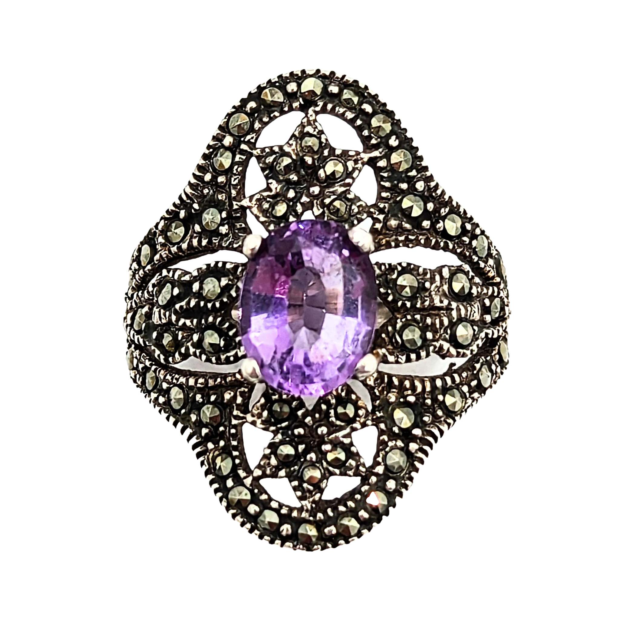 Sterling Silver Amethyst Marcasite Pierced Shield Ring Size 8 4.9g