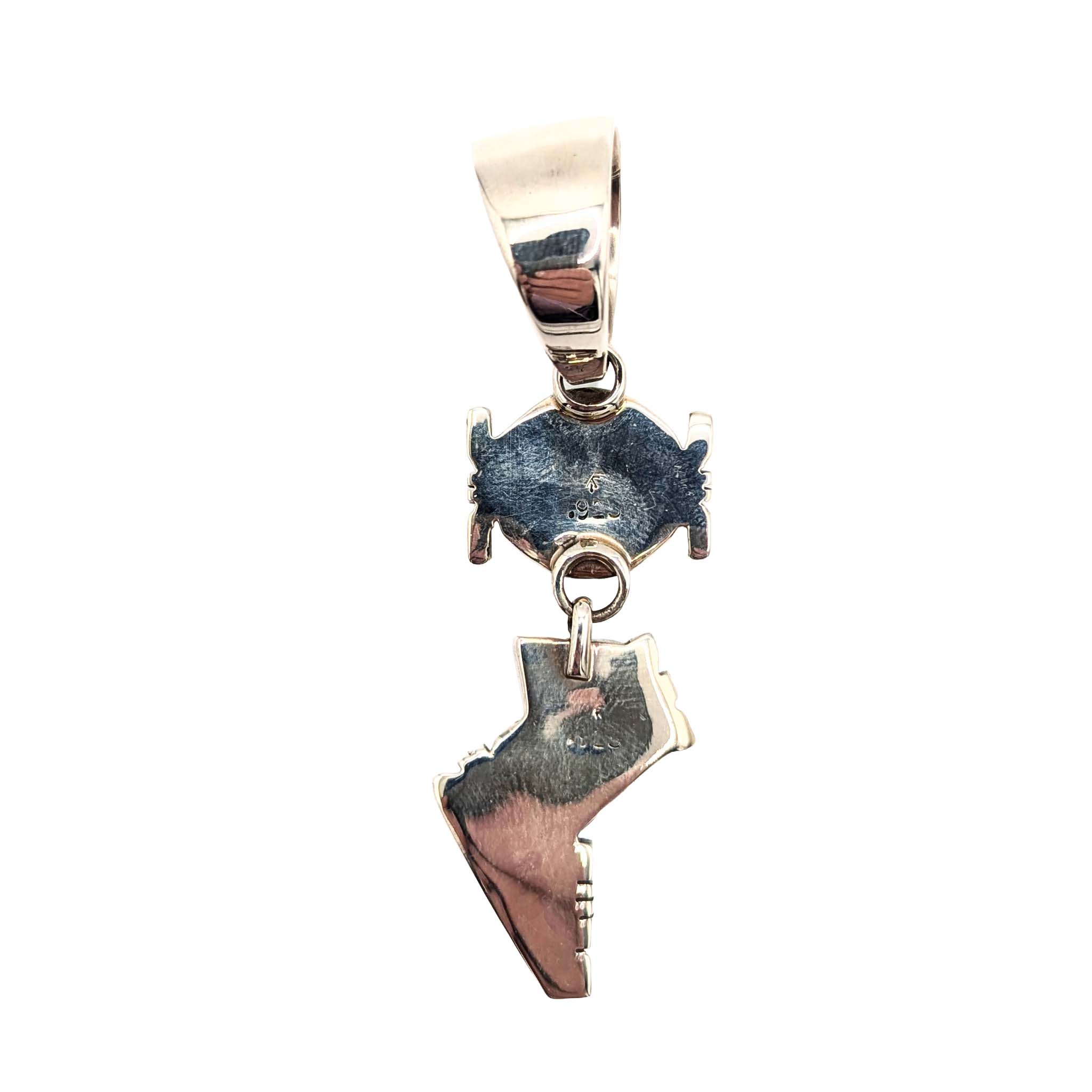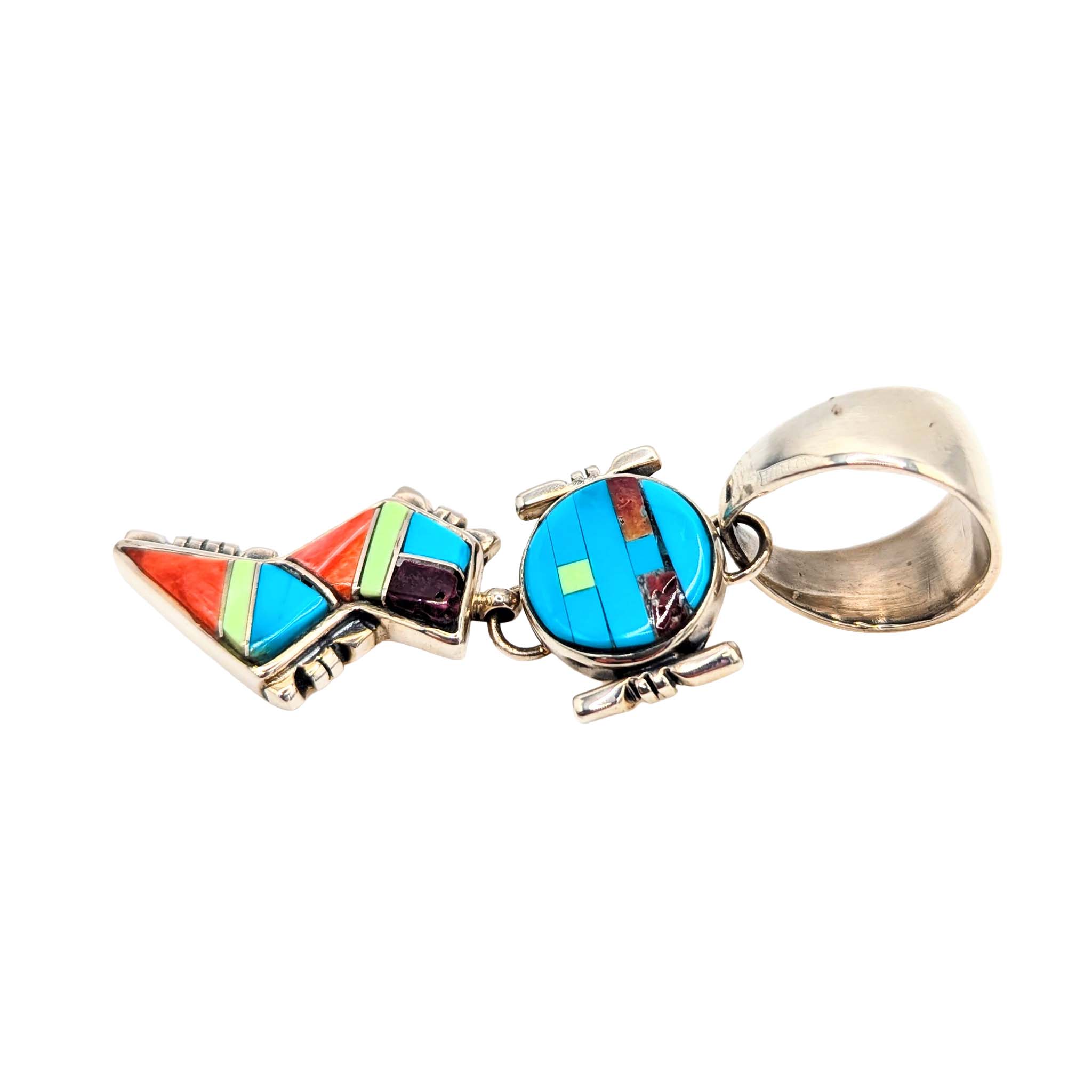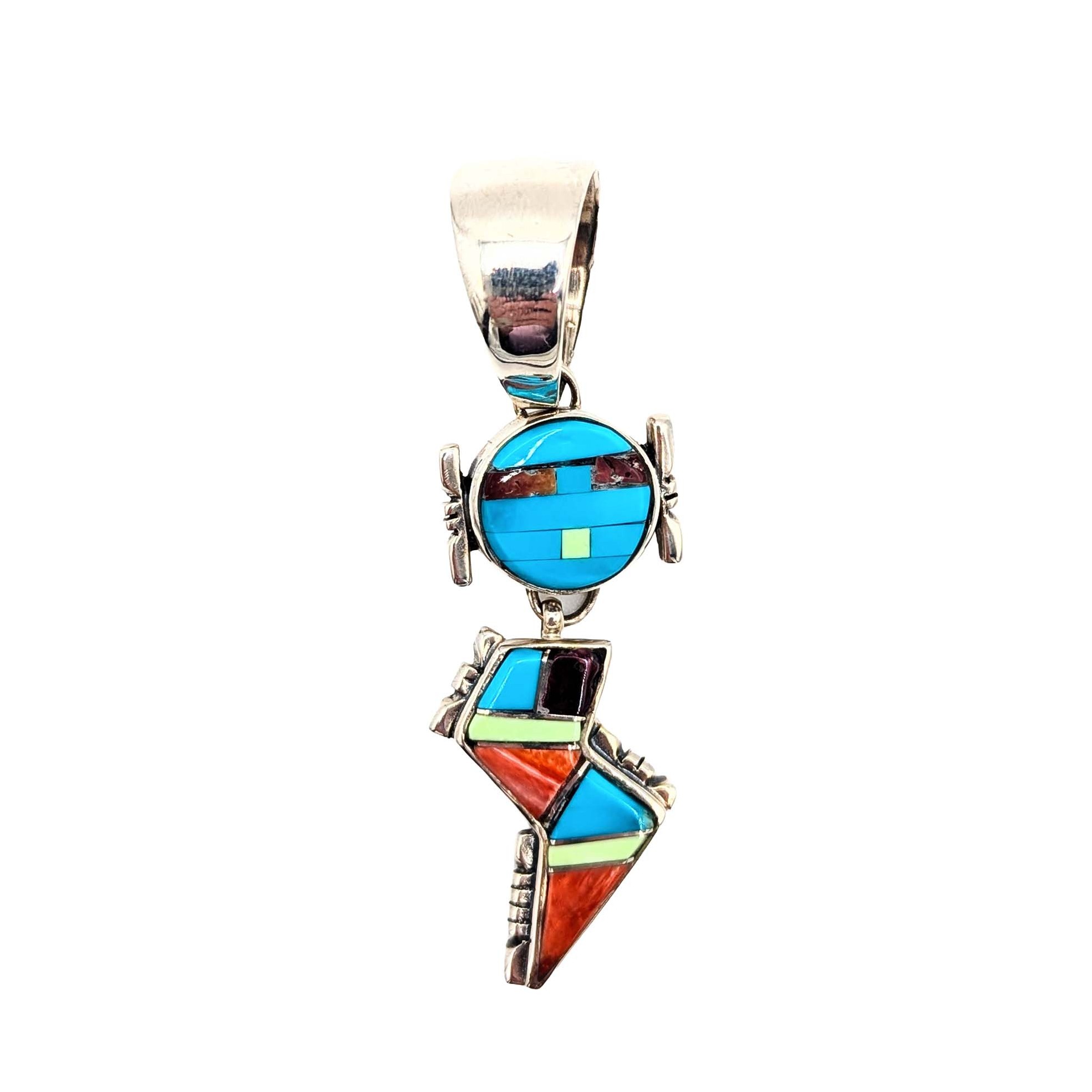 Evonne Rogers Navajo Sterling Silver, Coral, Turquoise & Shell Dangling Figure Pendant Signed First American Traders .925 14.4g