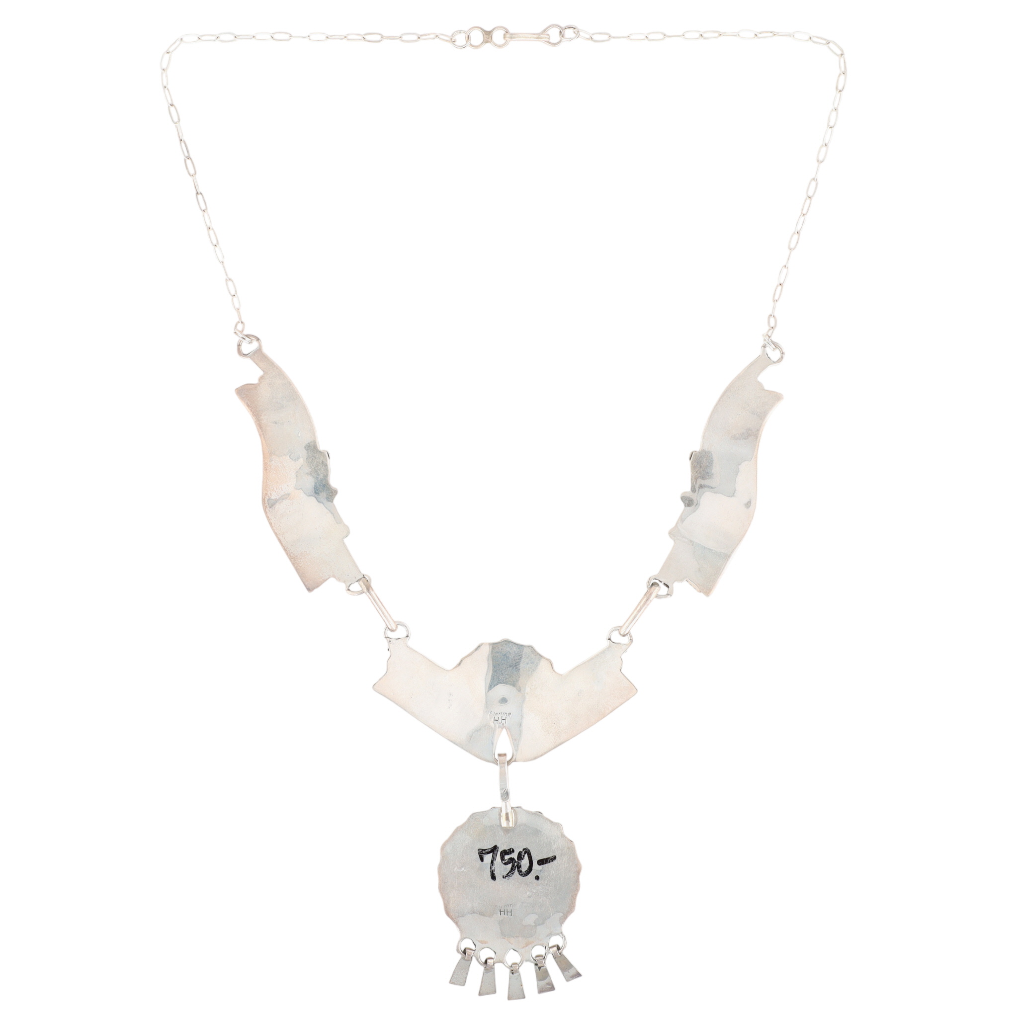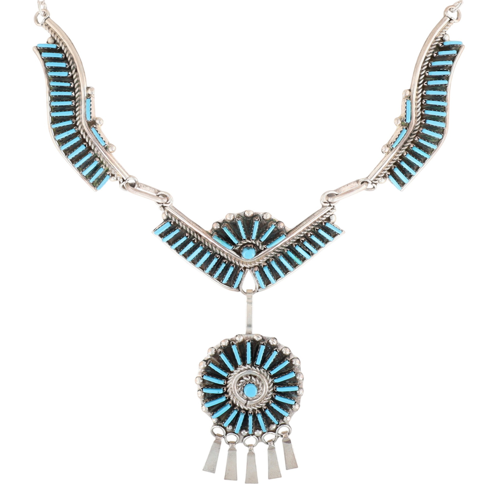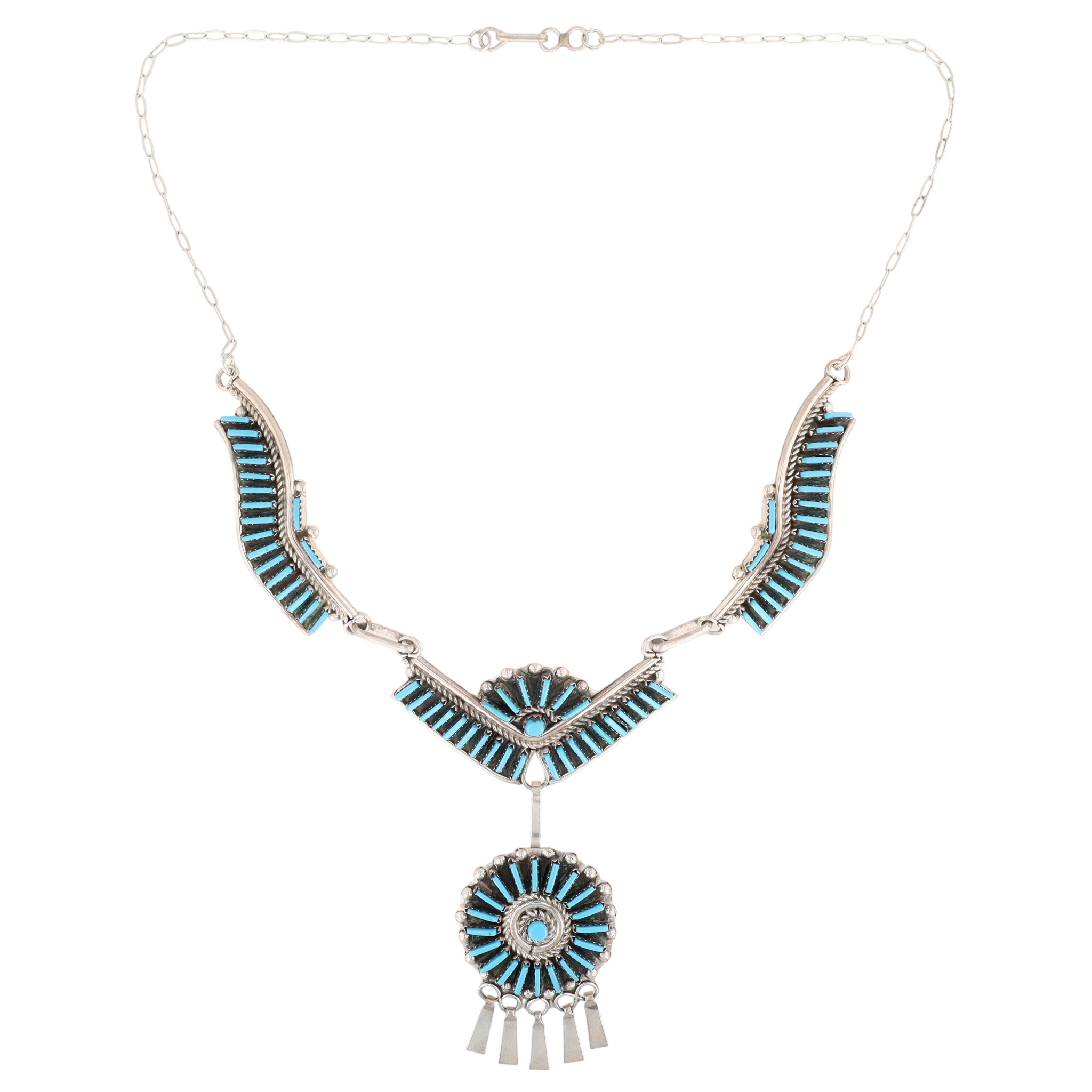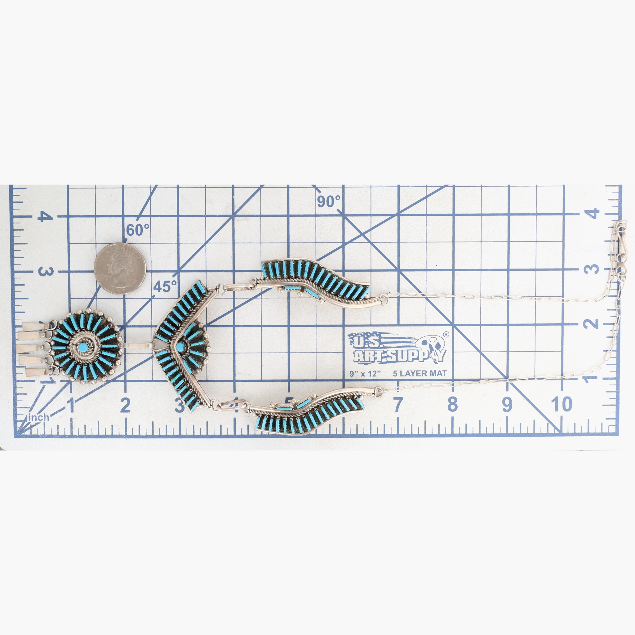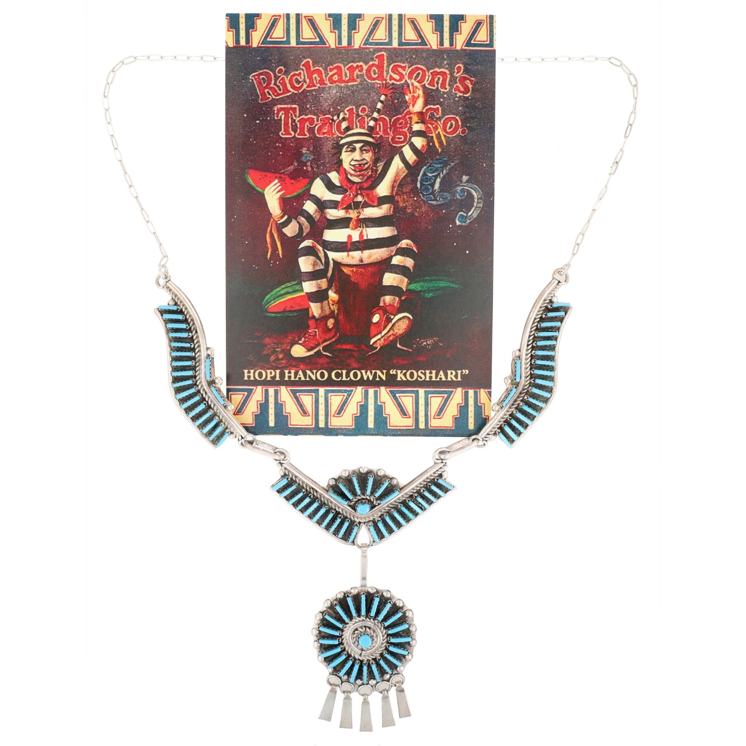 Presented in partnership with the historic Richardson’s Trading Post, a cornerstone of Native American jewelry since 1913. Selected from their archives of rare vintage and contemporary pieces. Helen Harrison Zuni Sterling Needlepoint Turquoise Necklace 43g