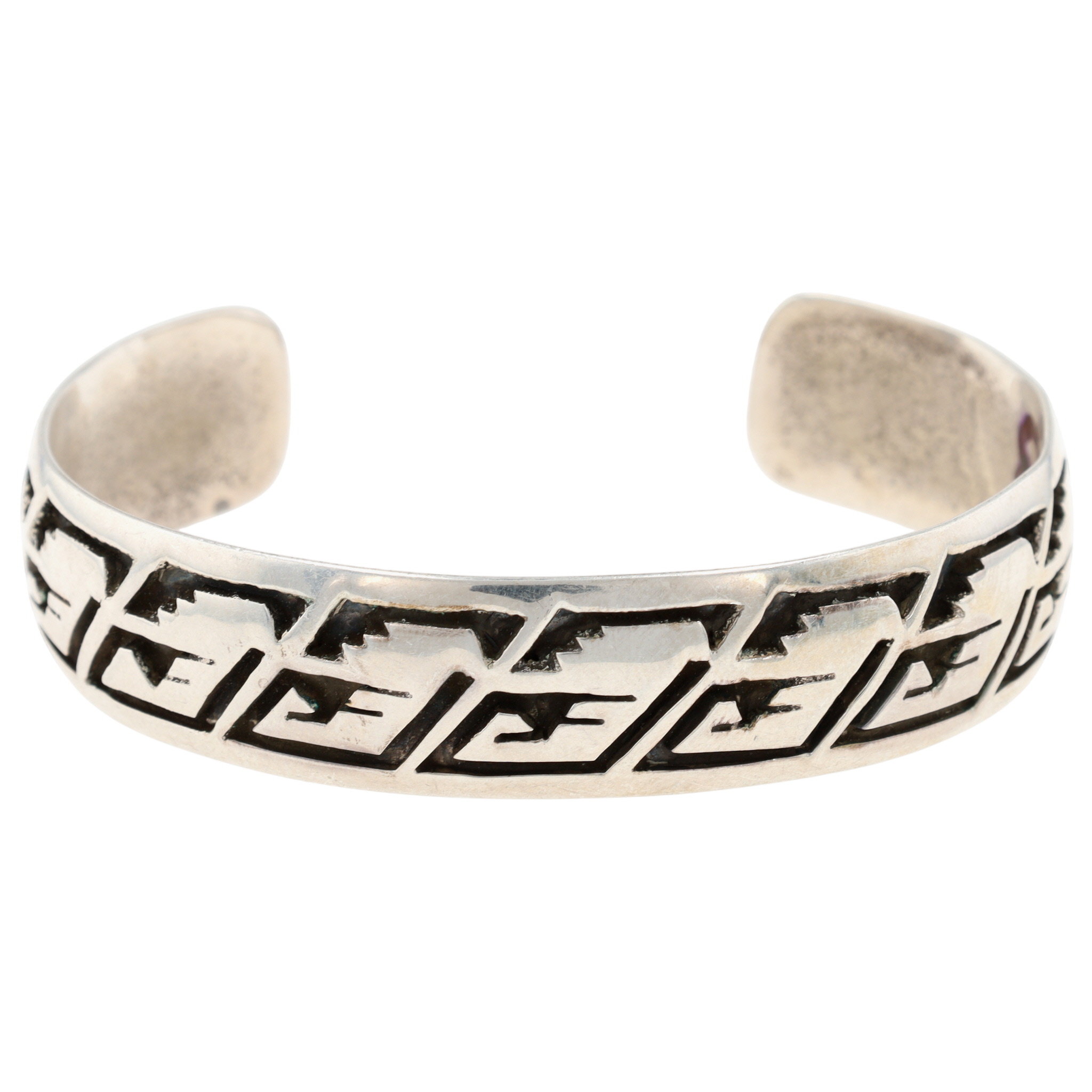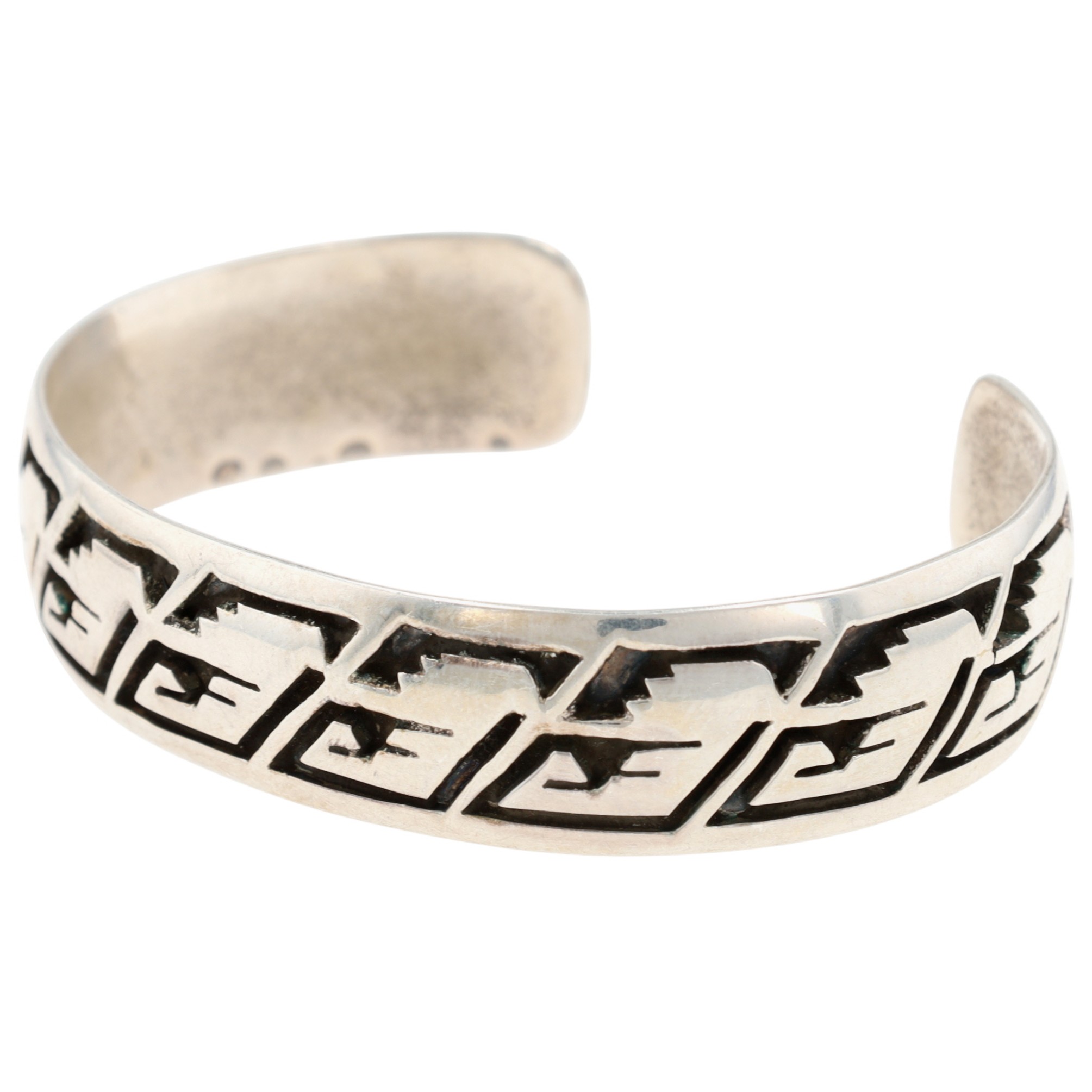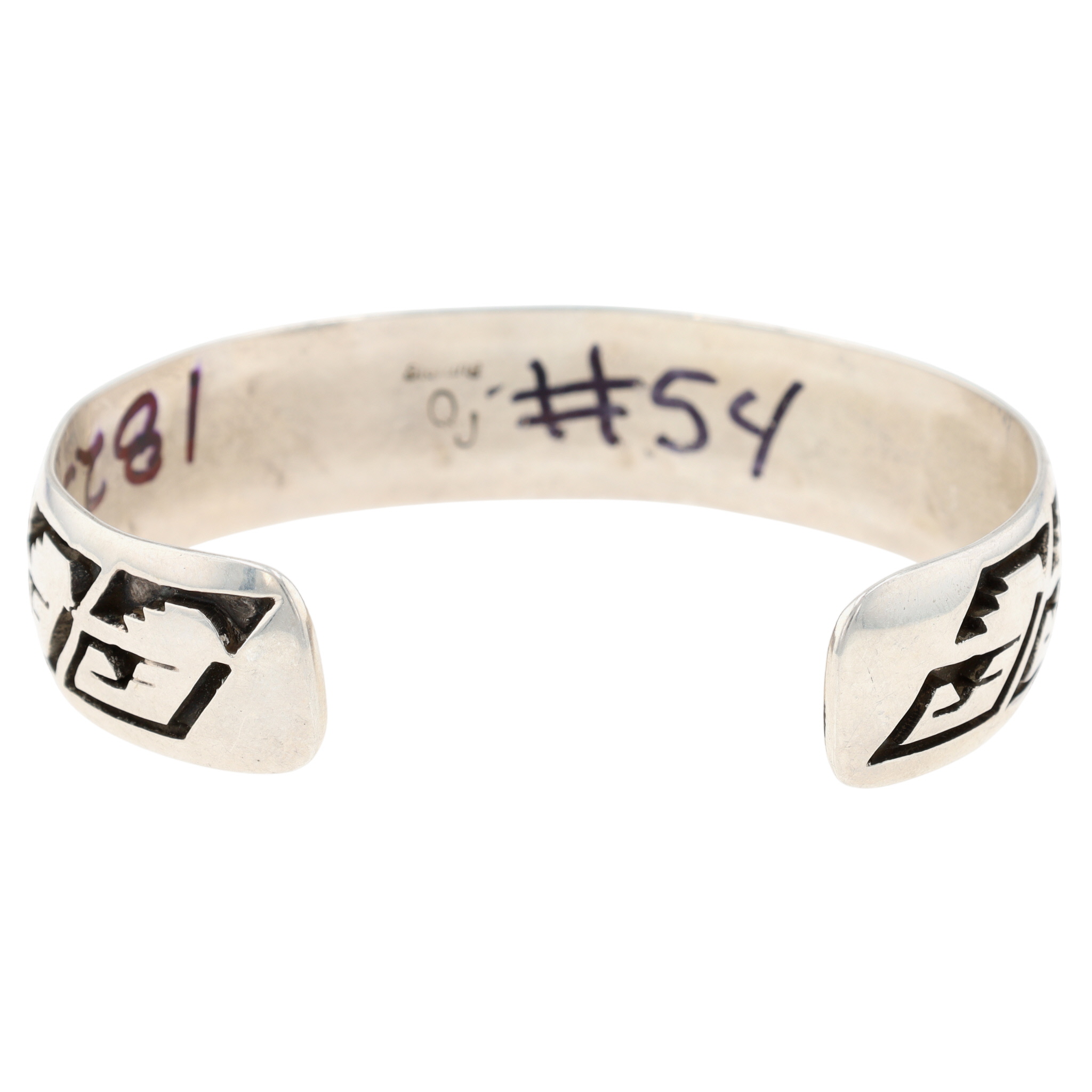 Presented in partnership with the historic Richardson’s Trading Post, a cornerstone of Native American jewelry since 1913. Selected from their archives of rare vintage and contemporary pieces. Signed ‘QJ’ Hopi Sterling Overlay Cuff Bracelet 28g