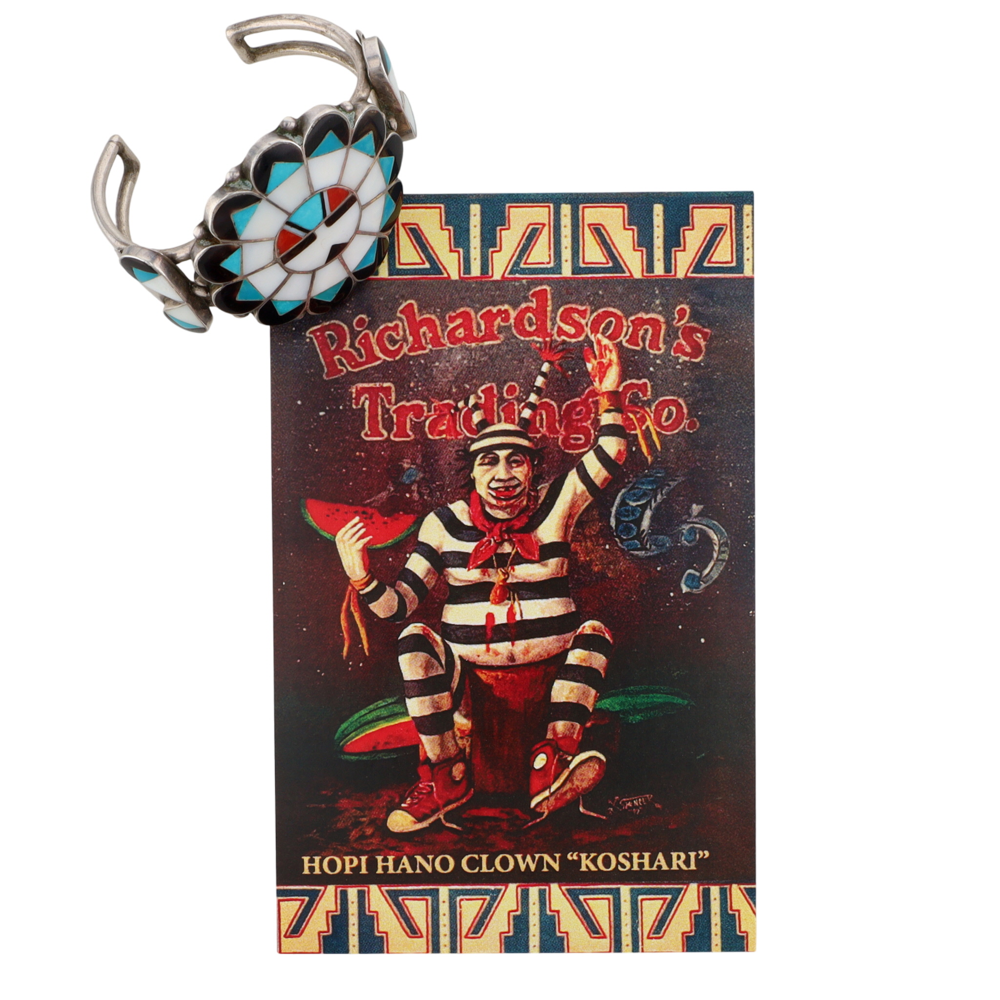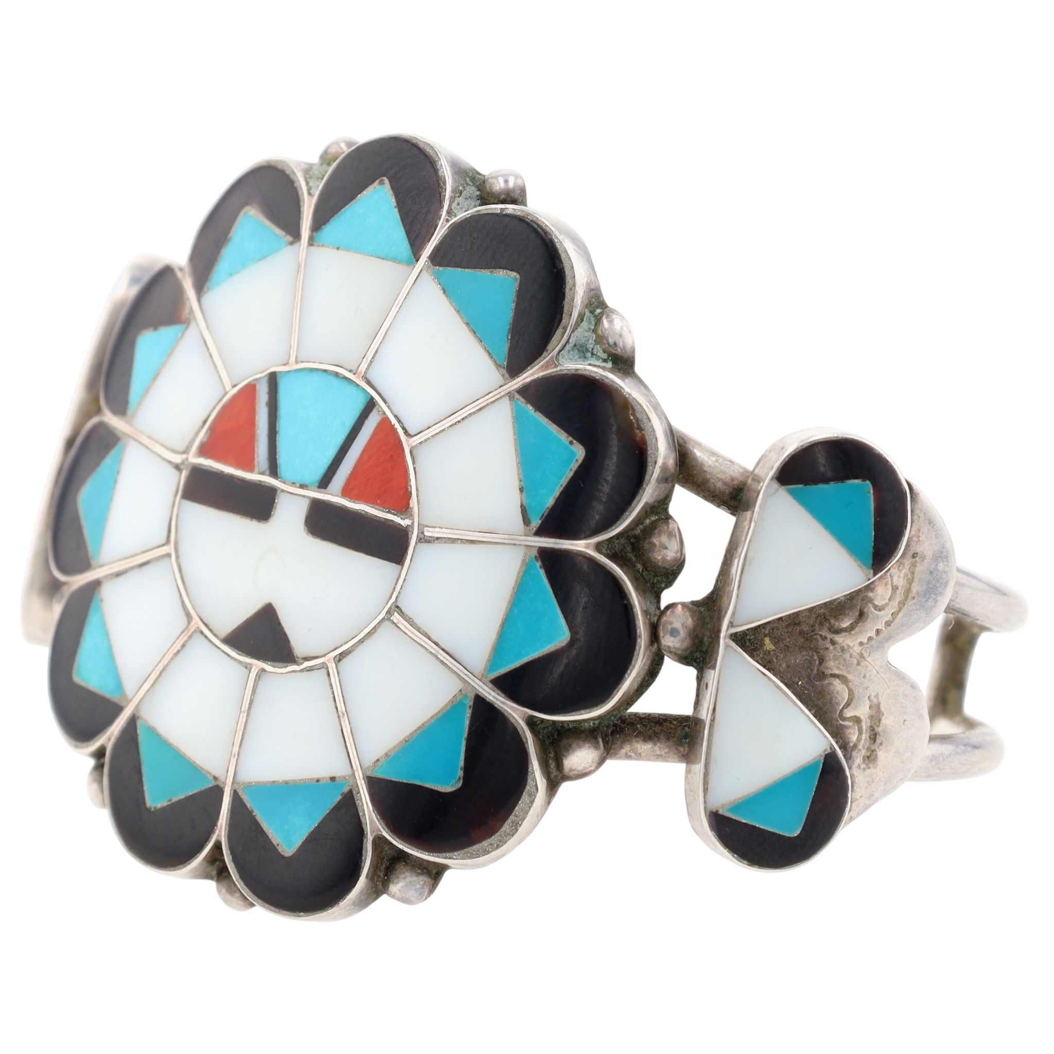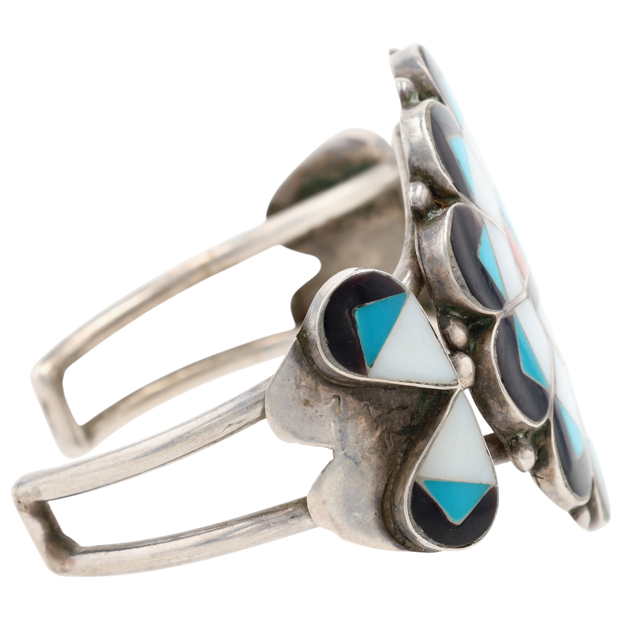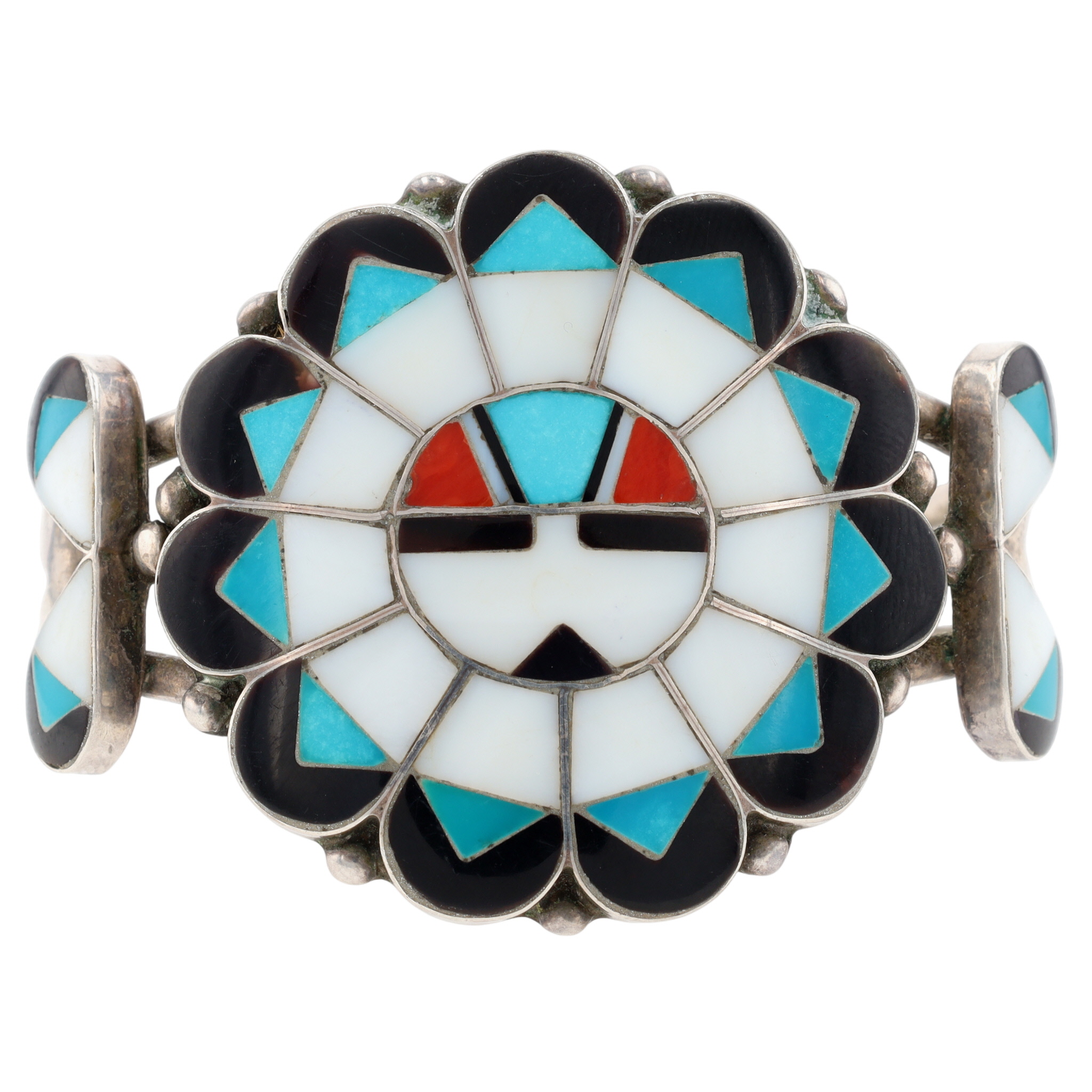 Presented in partnership with the historic Richardson’s Trading Post, a cornerstone of Native American jewelry since 1913. Selected from their archives of rare vintage and contemporary pieces. Vintage Zuni Sterling Multi-Stone Sunface Inlay Cuff Bracelet 33g