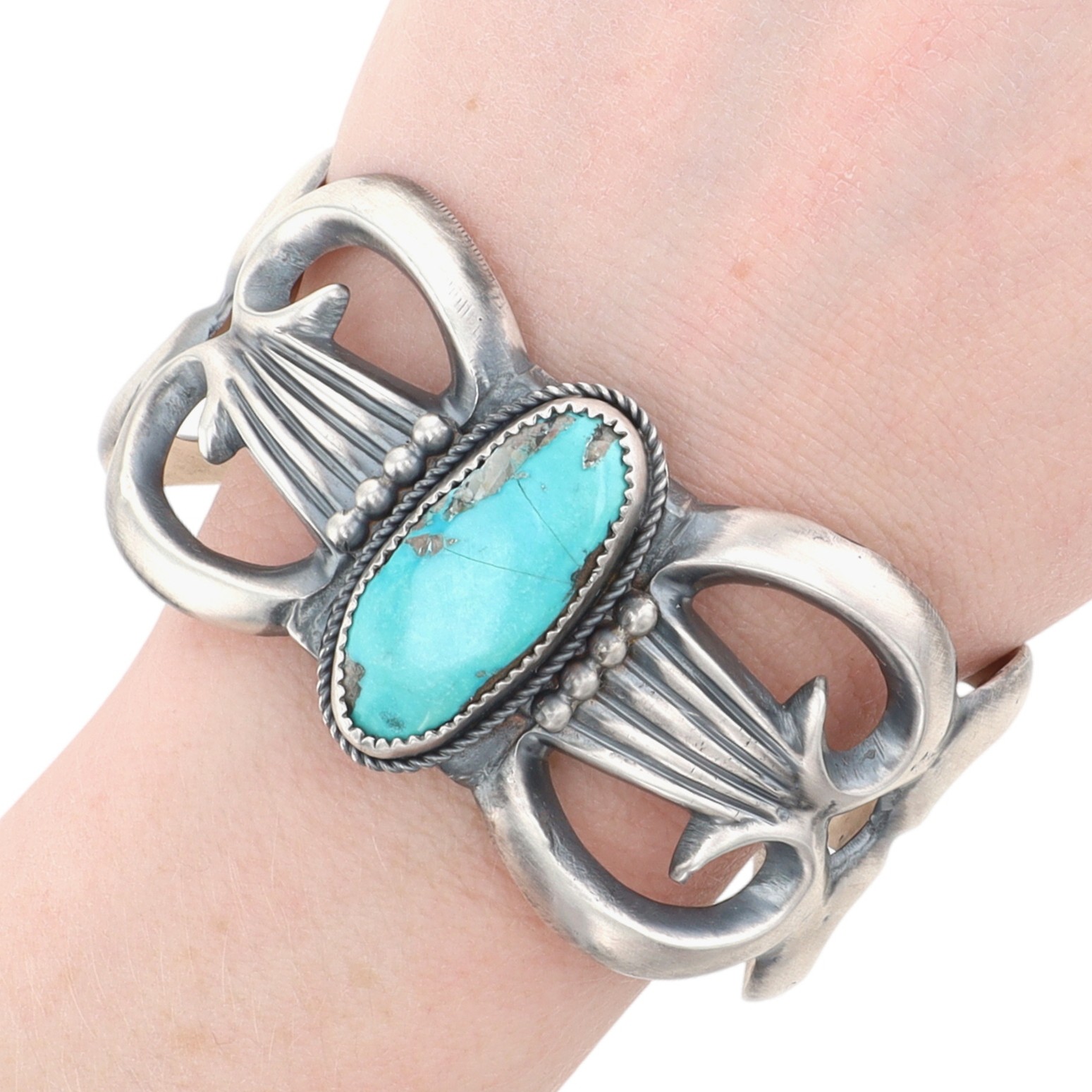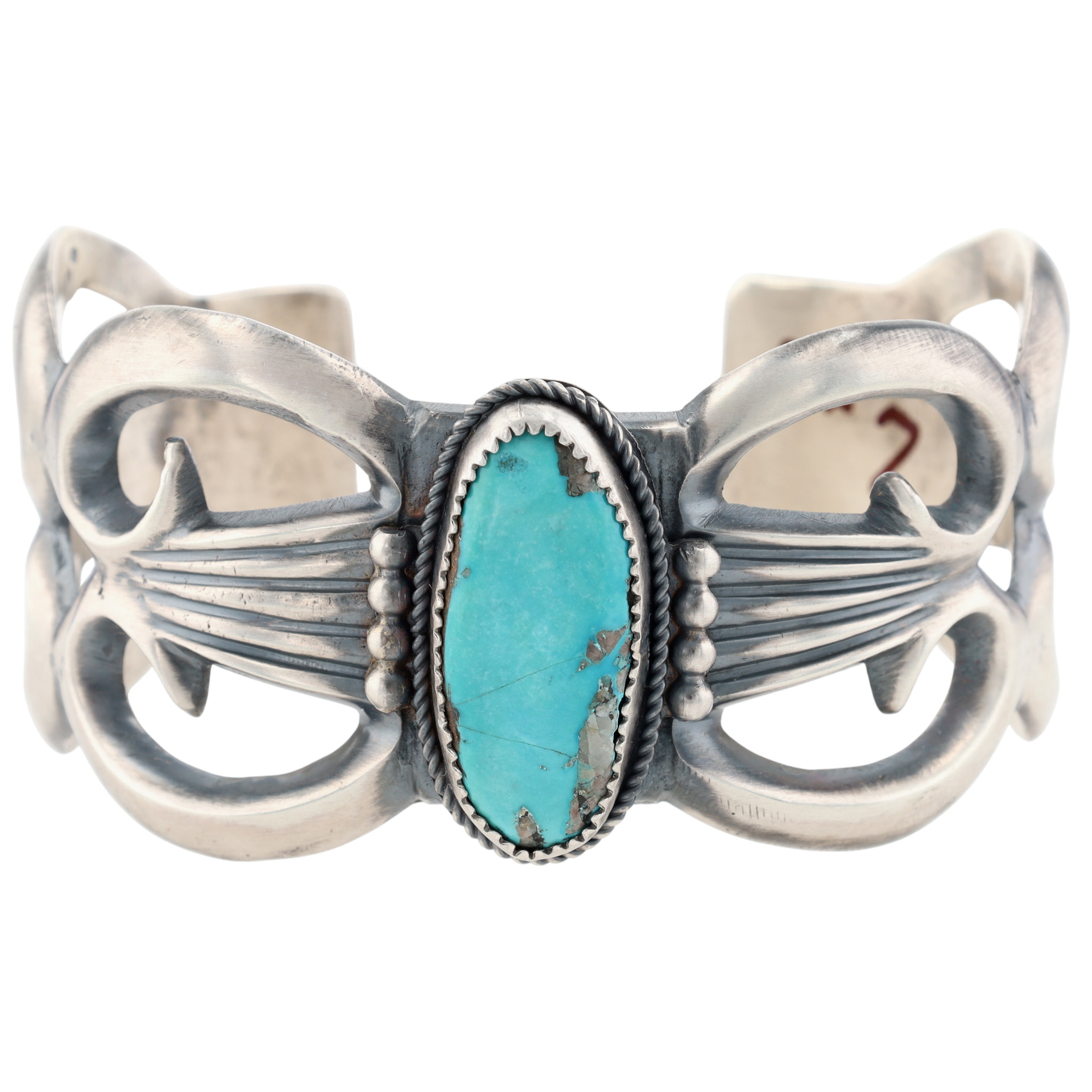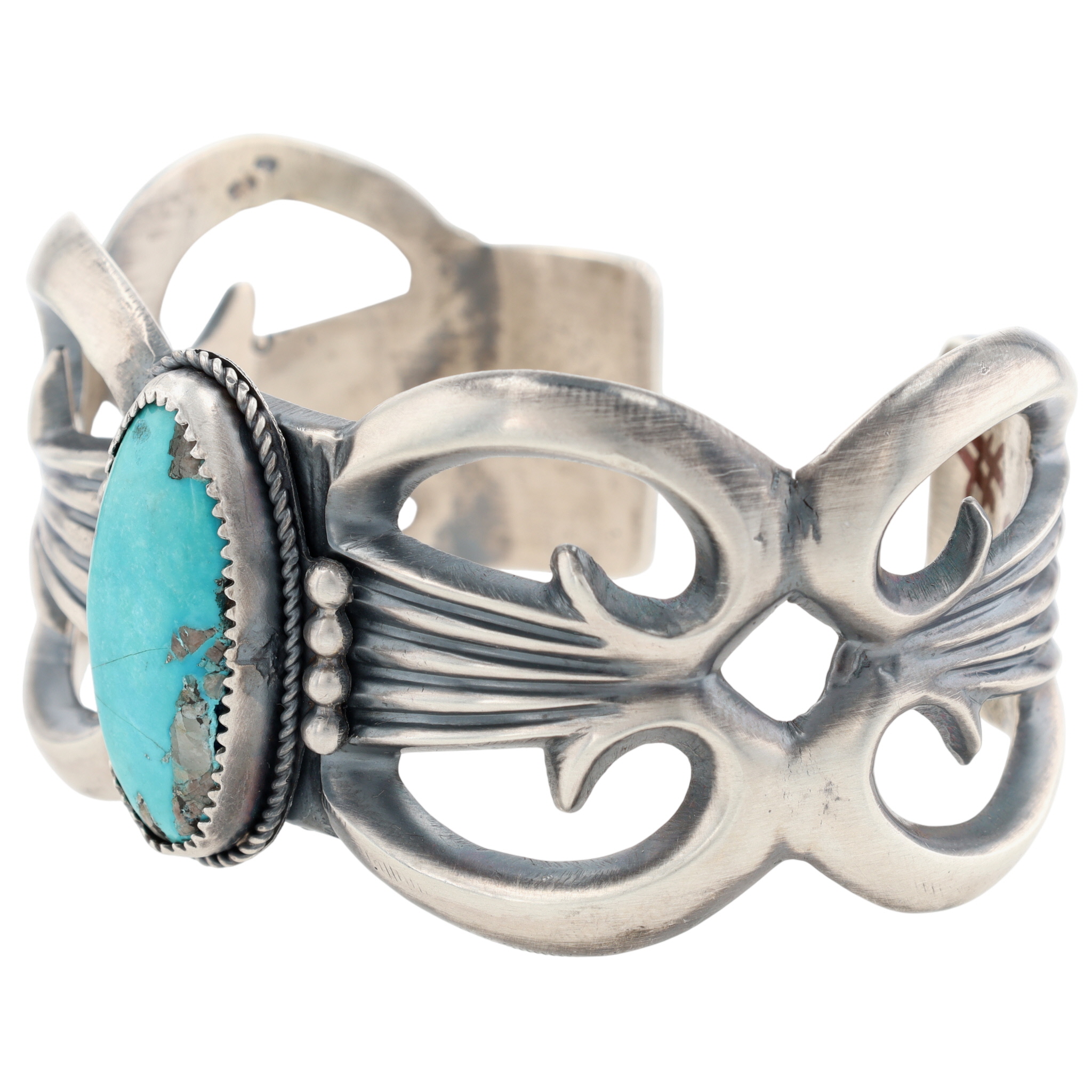 Presented in partnership with the historic Richardson’s Trading Post, a cornerstone of Native American jewelry since 1913. Selected from their archives of rare vintage and contemporary pieces. Linda Montoya Navajo Sterling Turquoise Cuff Bracelet 108g