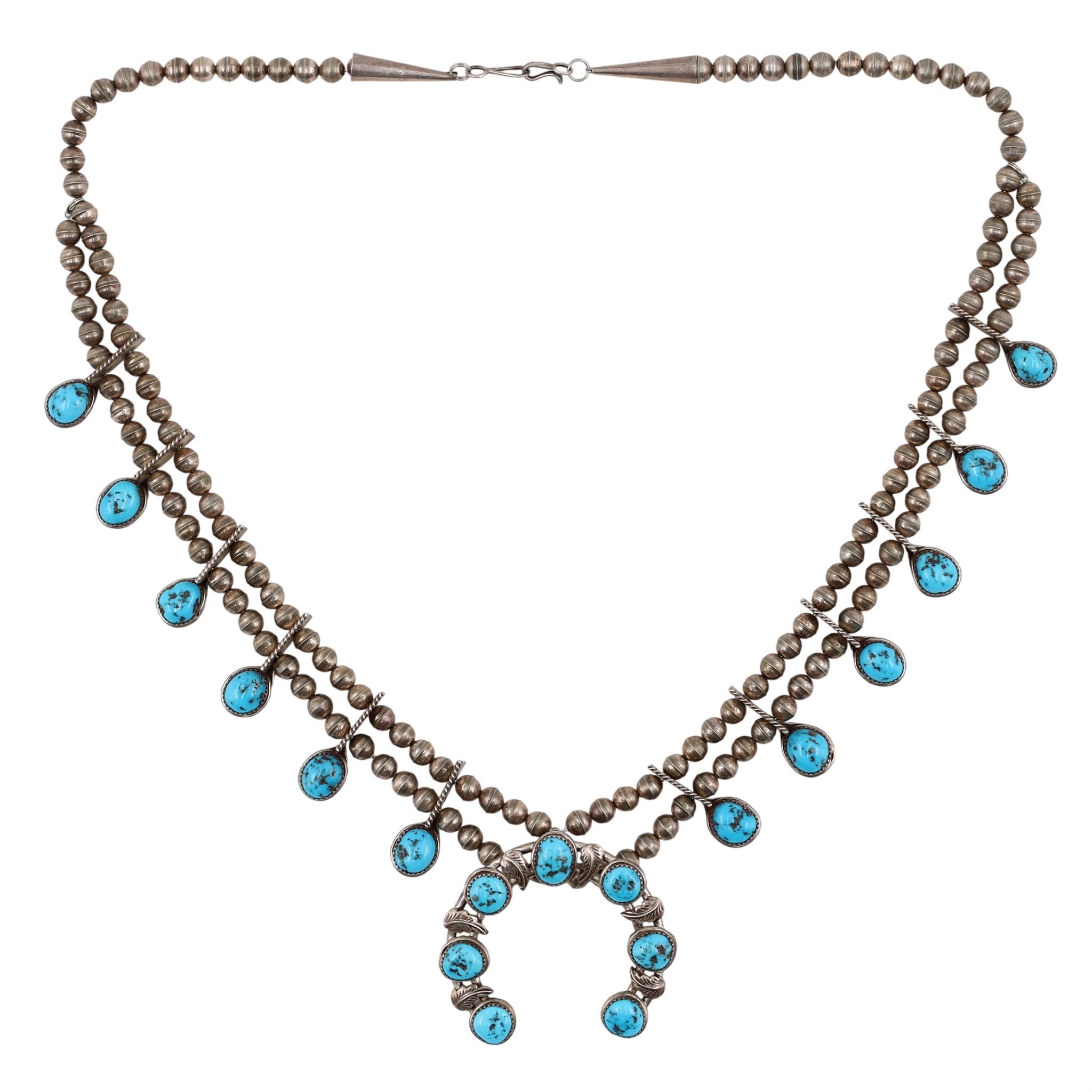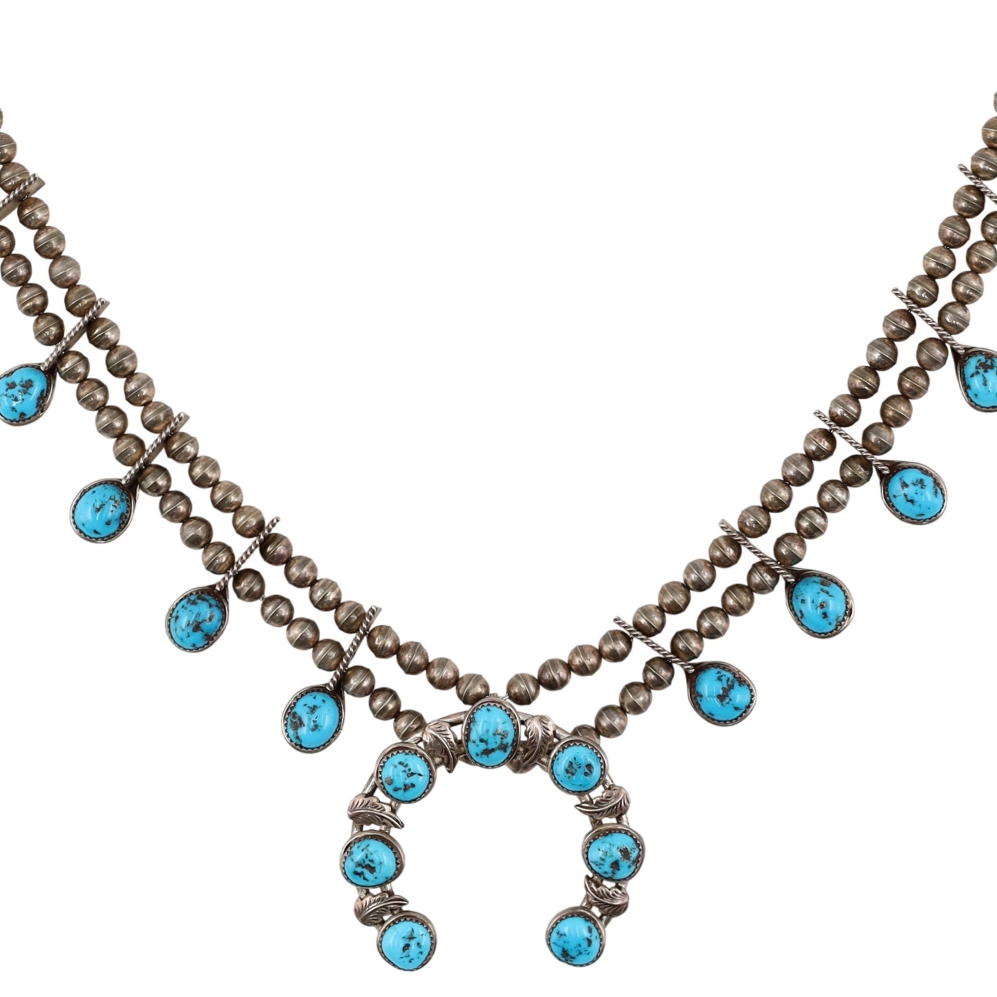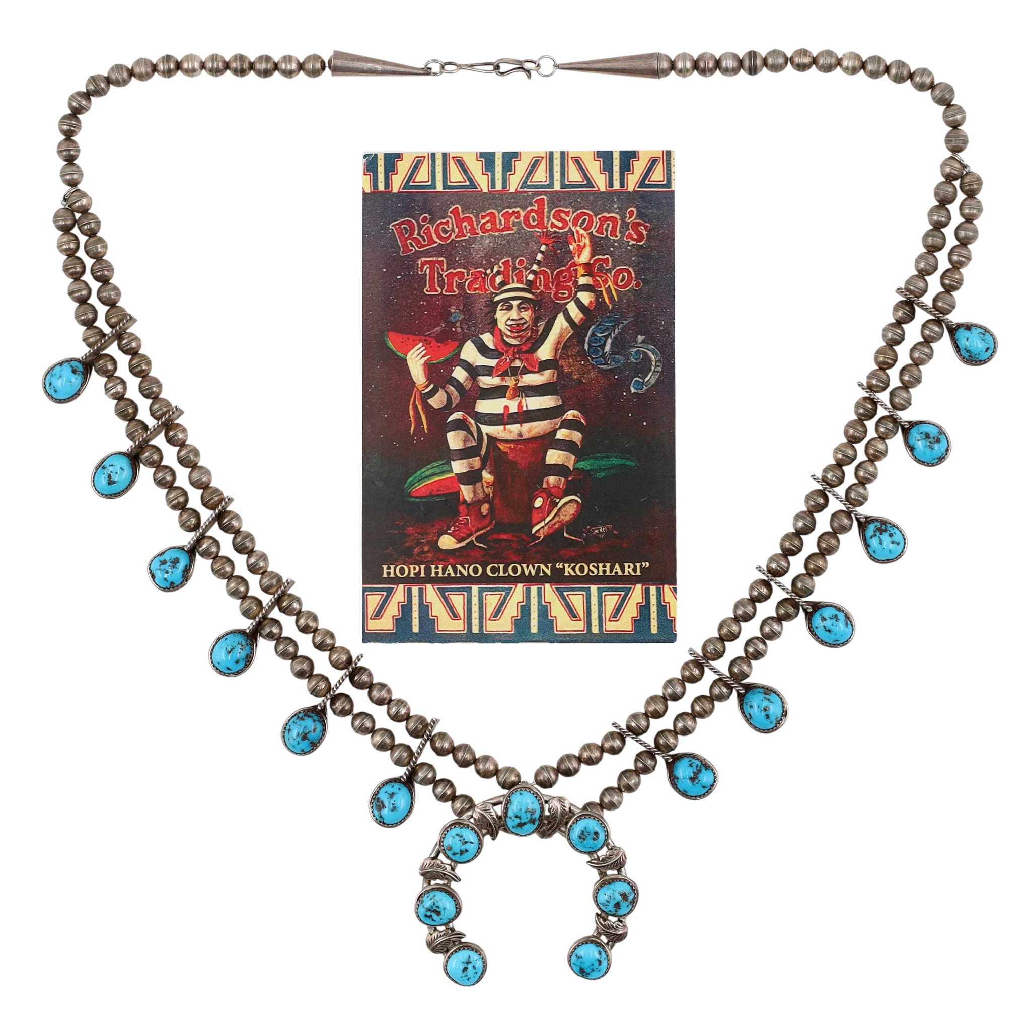 Presented in partnership with the historic Richardson’s Trading Post, a cornerstone of Native American jewelry since 1913. Selected from their archives of rare vintage and contemporary pieces. Vintage Navajo Sterling Turquoise Squash Blossom Necklace 103g