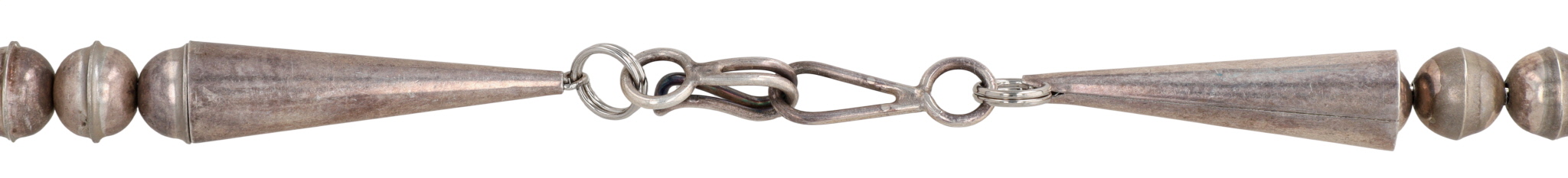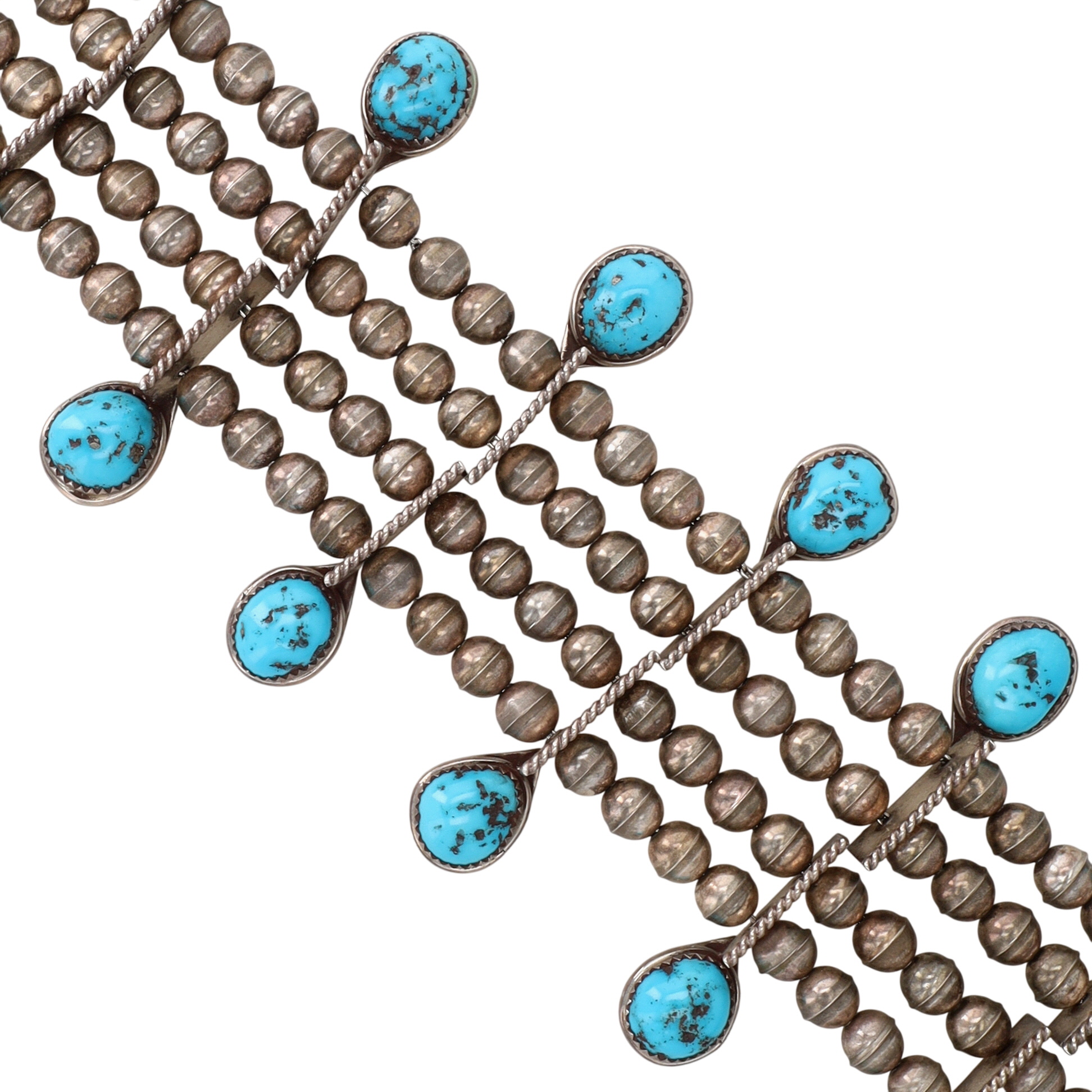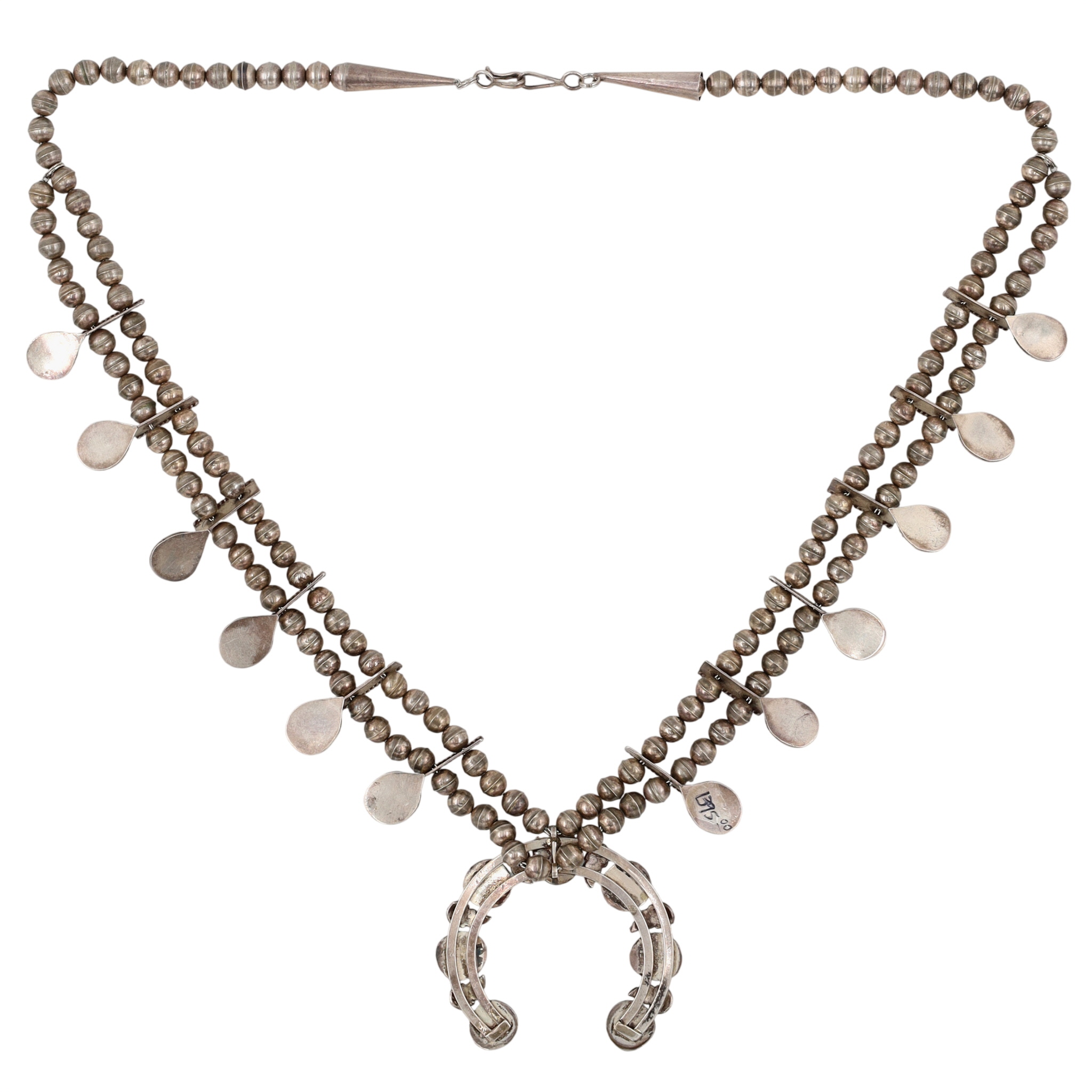 Presented in partnership with the historic Richardson’s Trading Post, a cornerstone of Native American jewelry since 1913. Selected from their archives of rare vintage and contemporary pieces. Vintage Navajo Sterling Turquoise Squash Blossom Necklace 103g