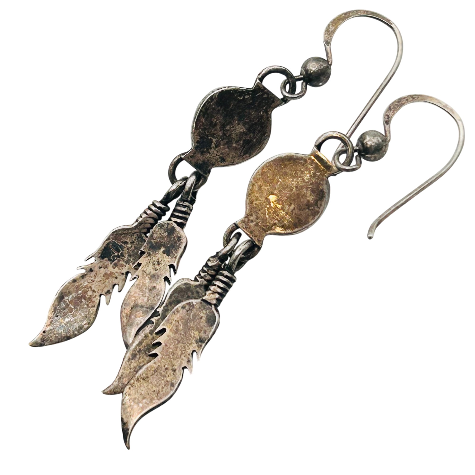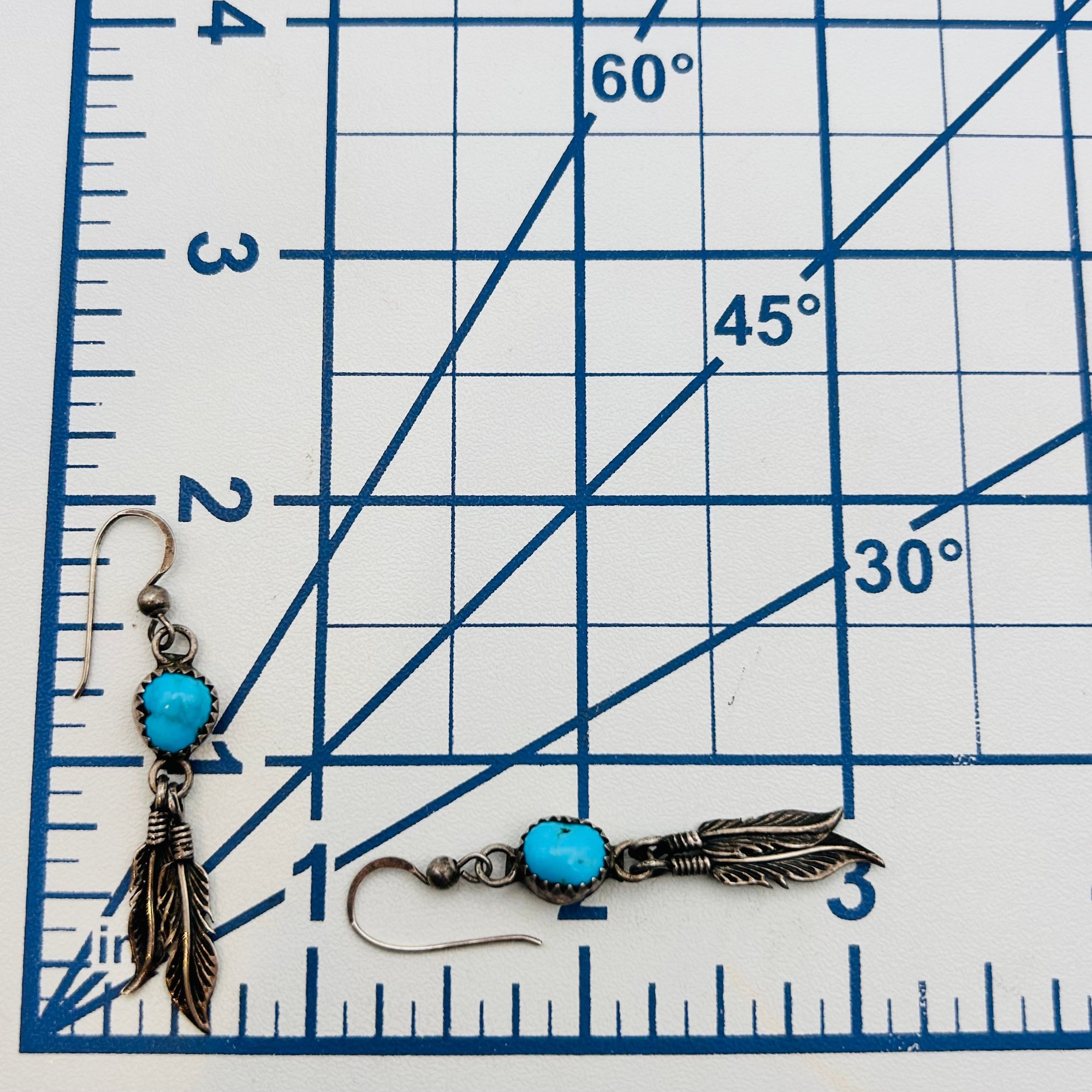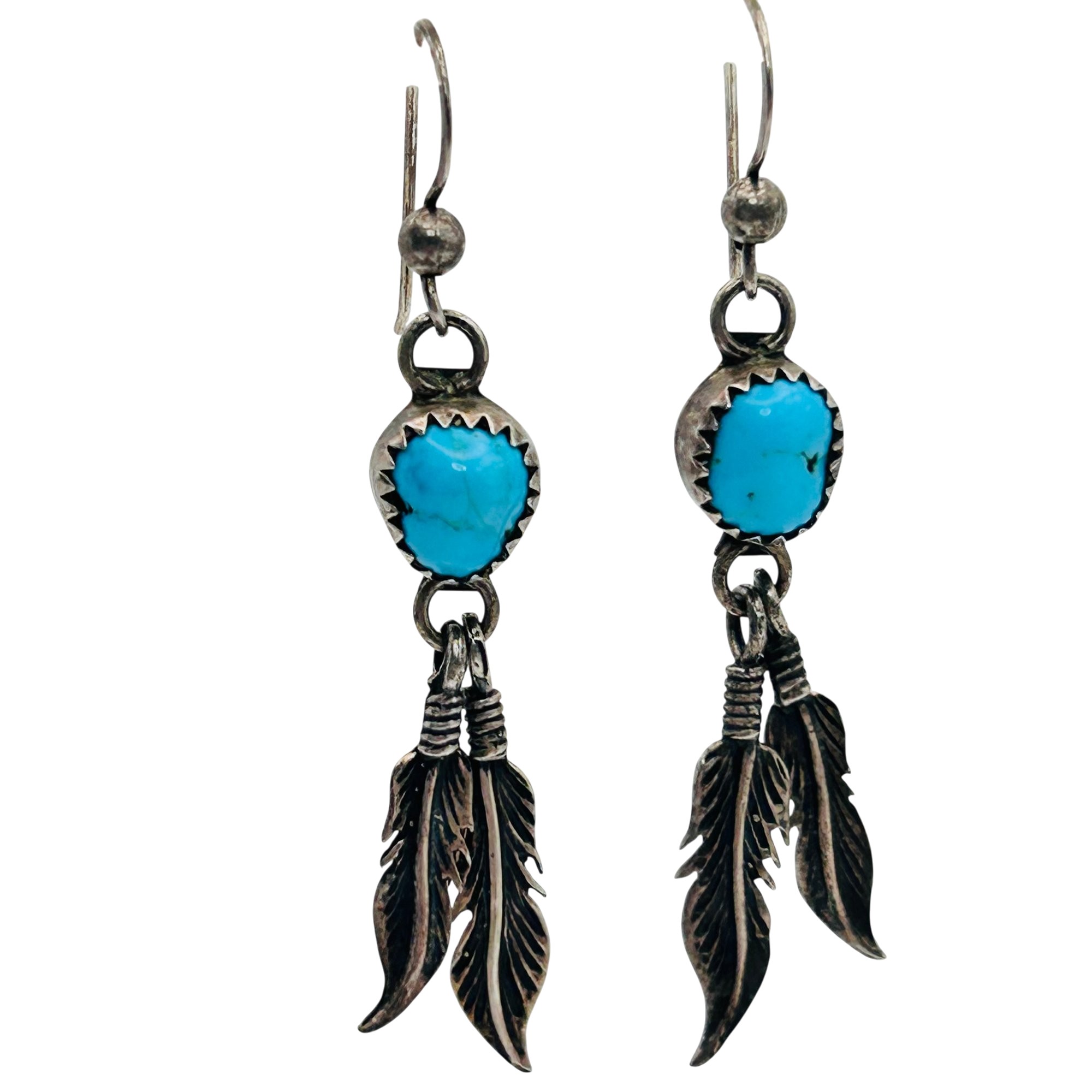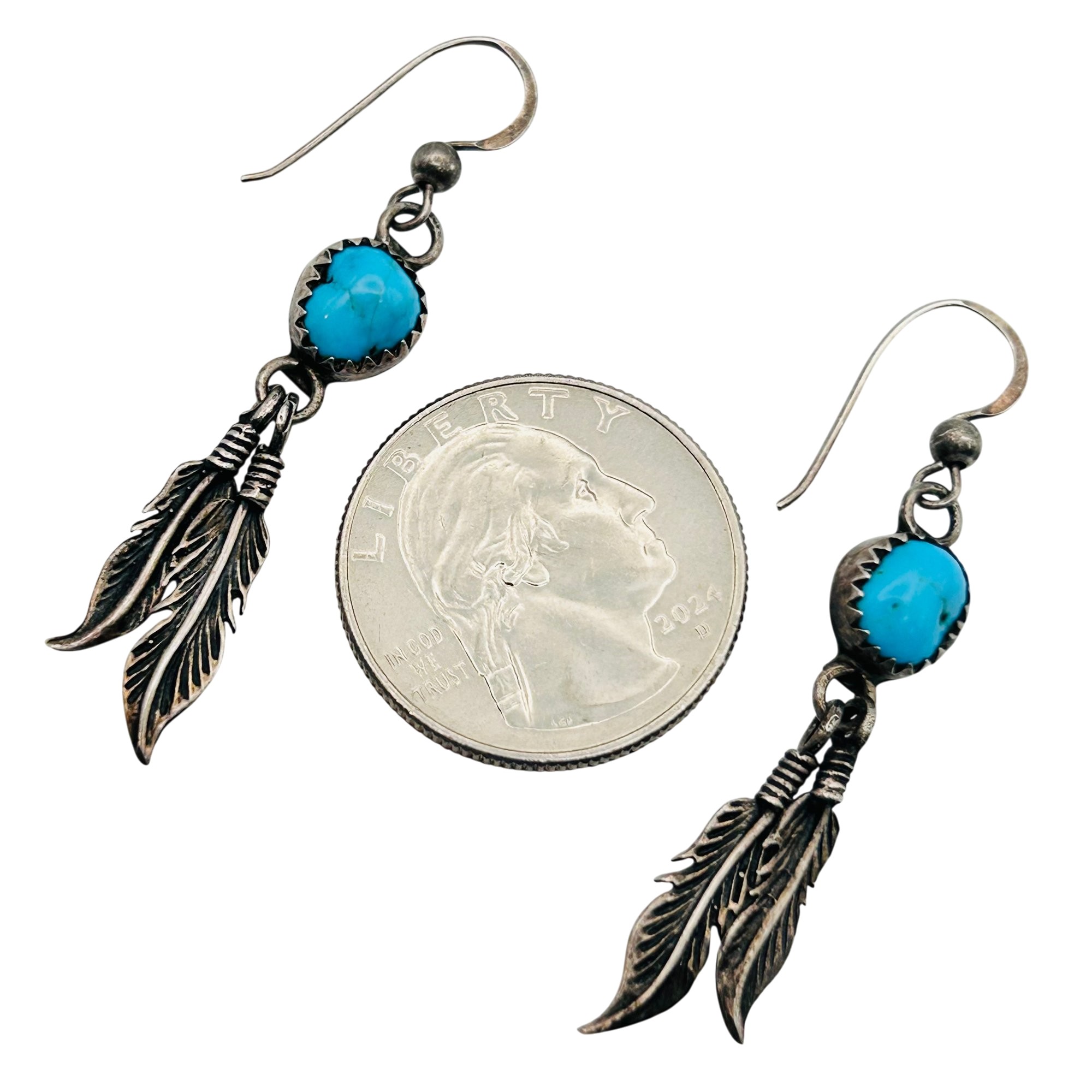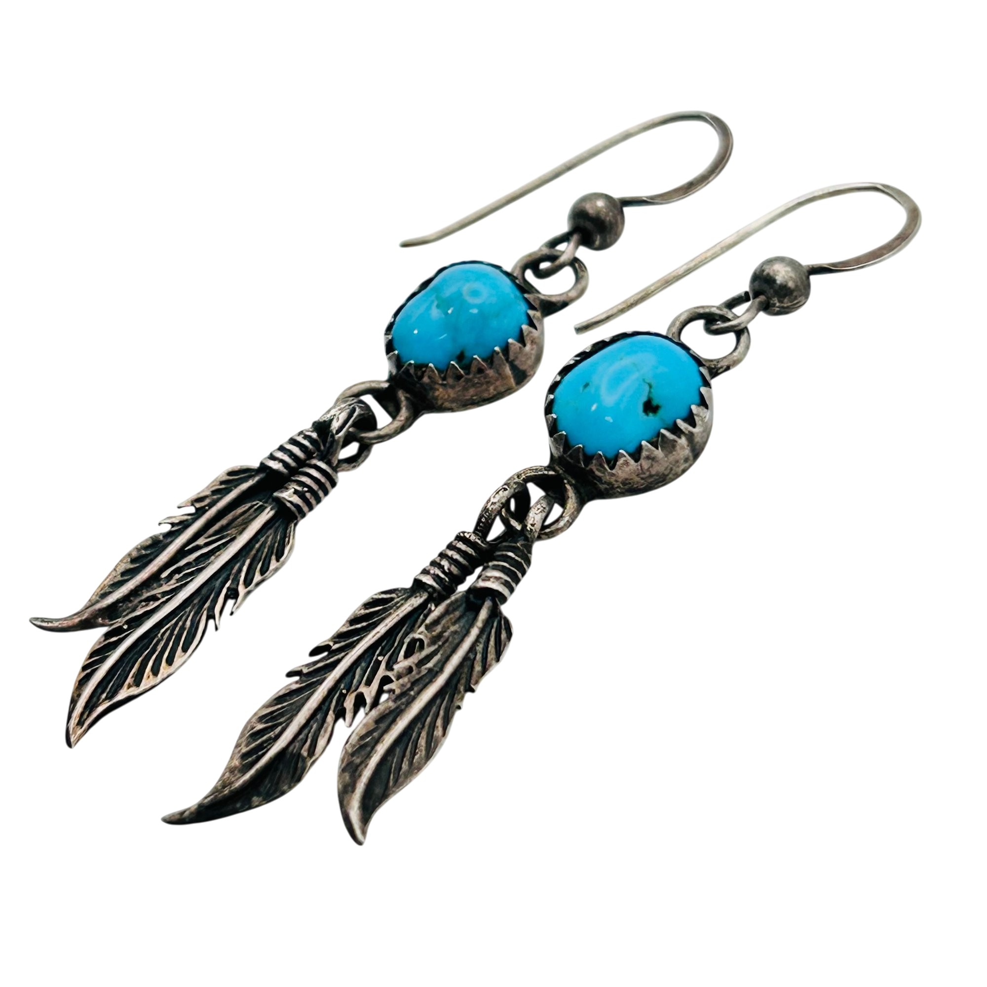 Native turquoise sterling dangle feather earrings. 3.68 g.
