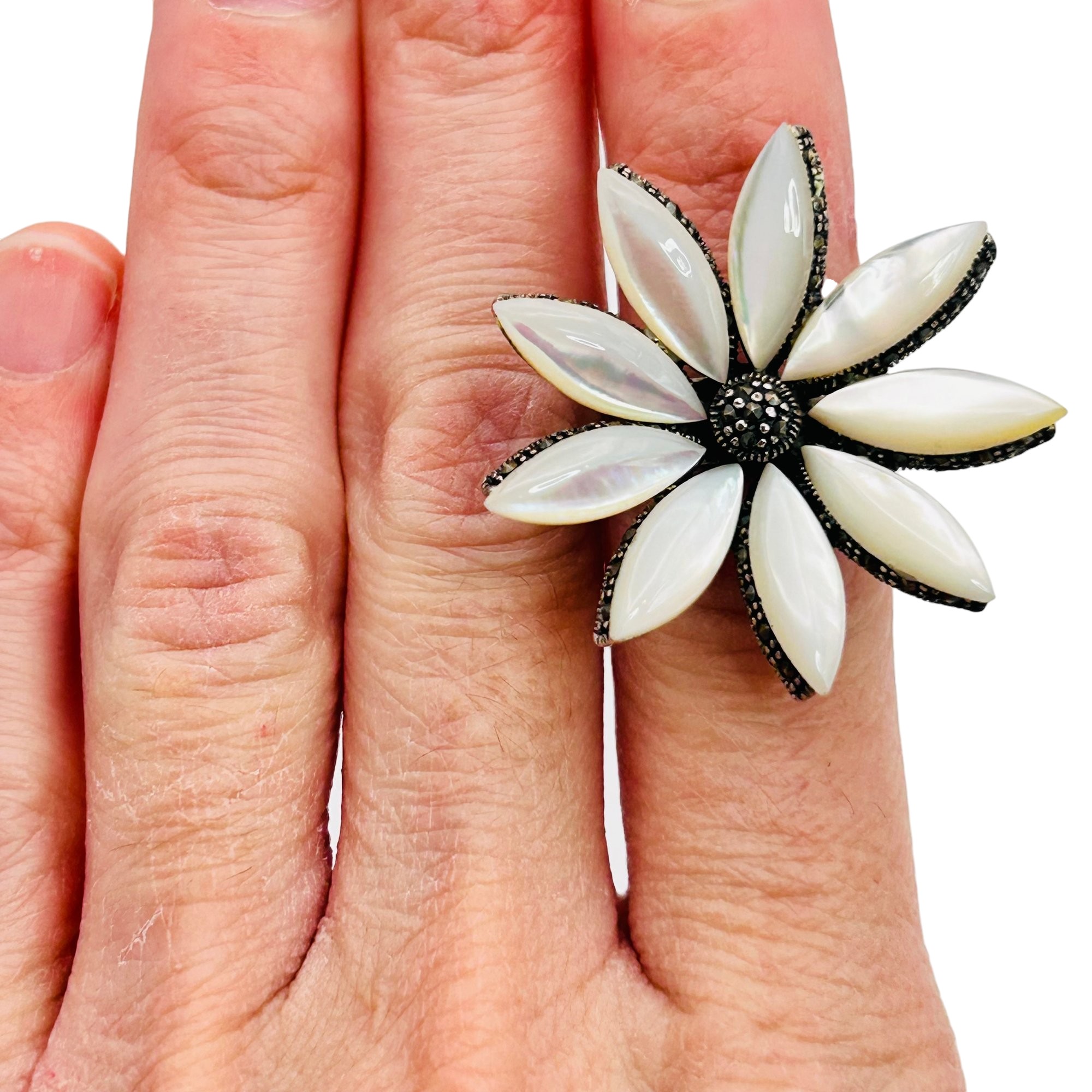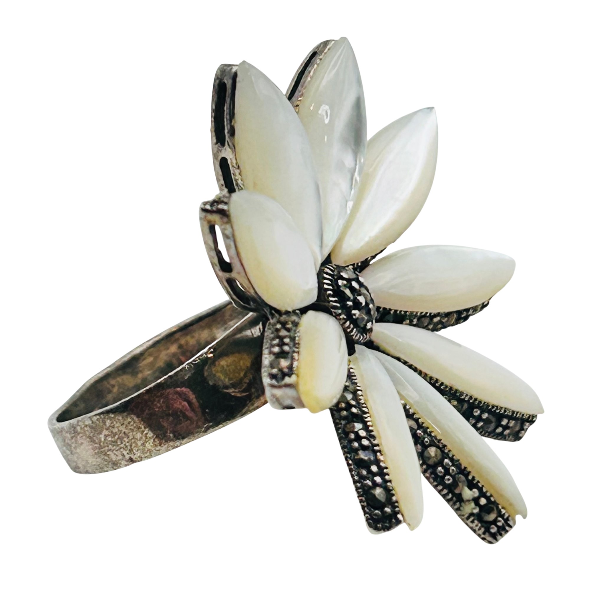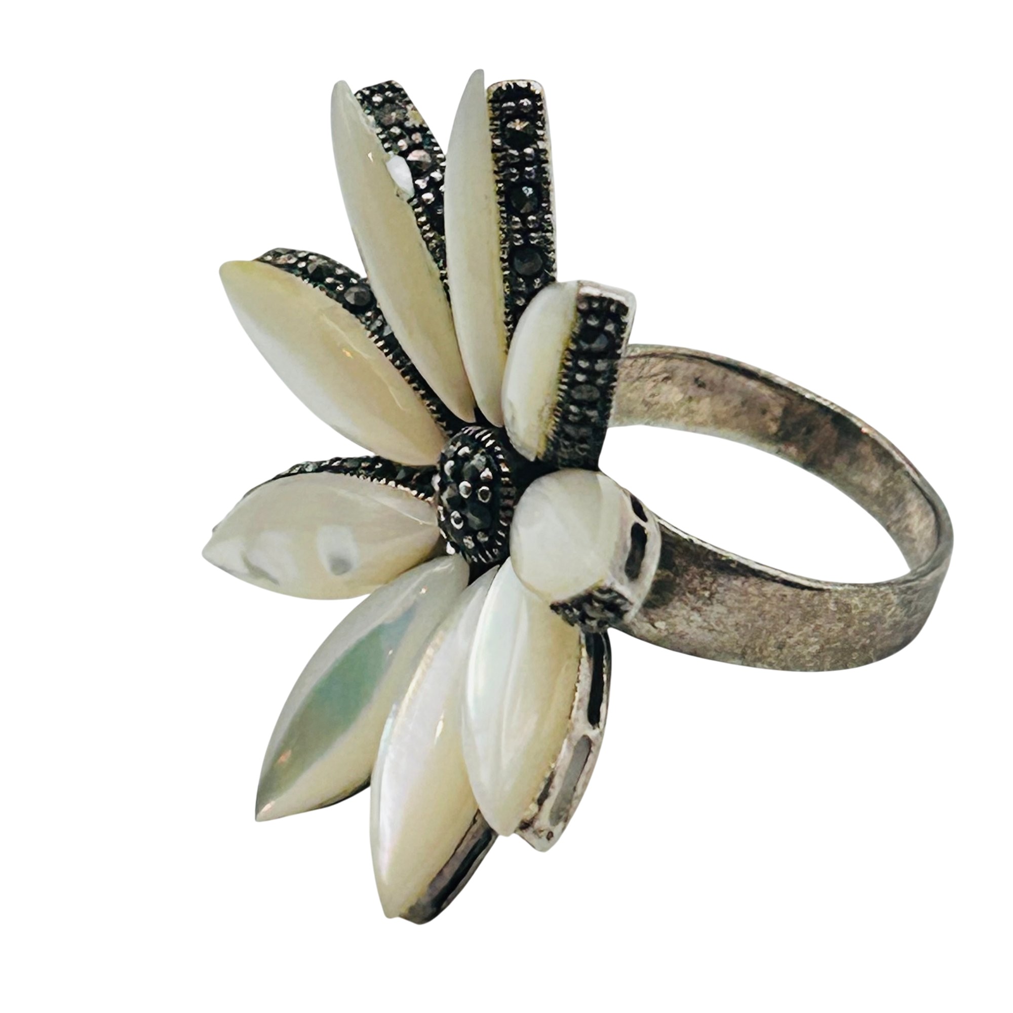 MOTHER OF PEARL MARCASITE Sterling statement ring. Size 5.5. 8.92g