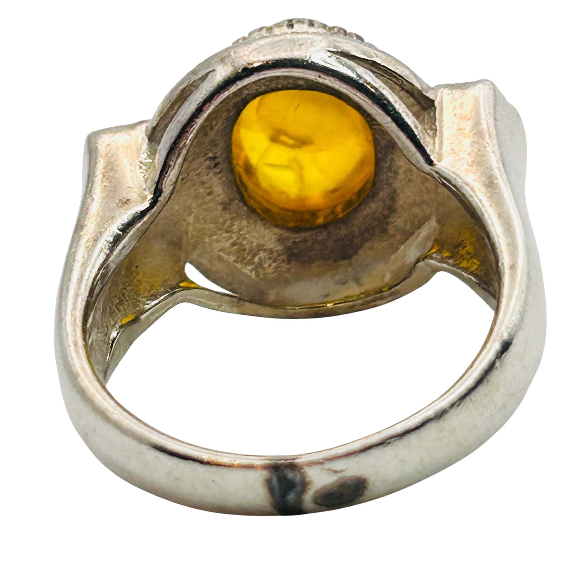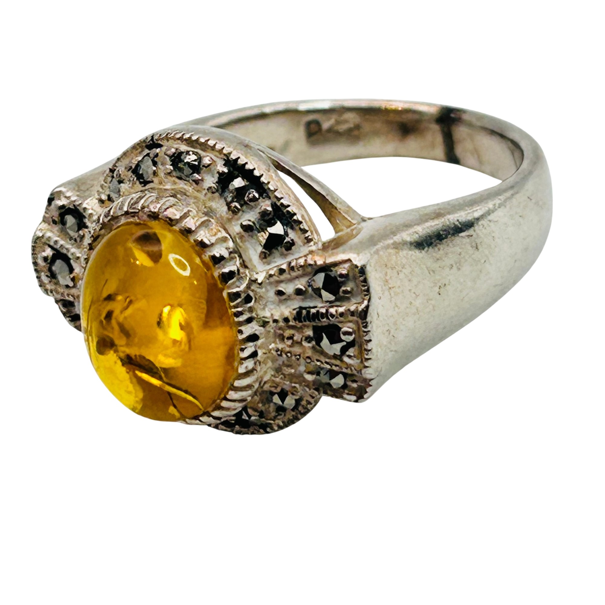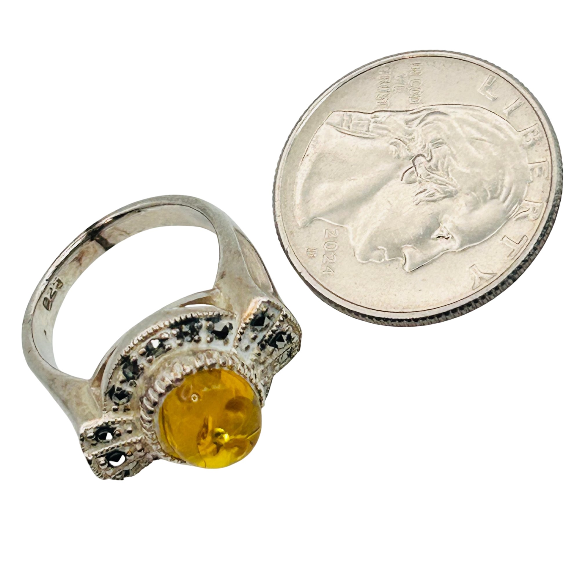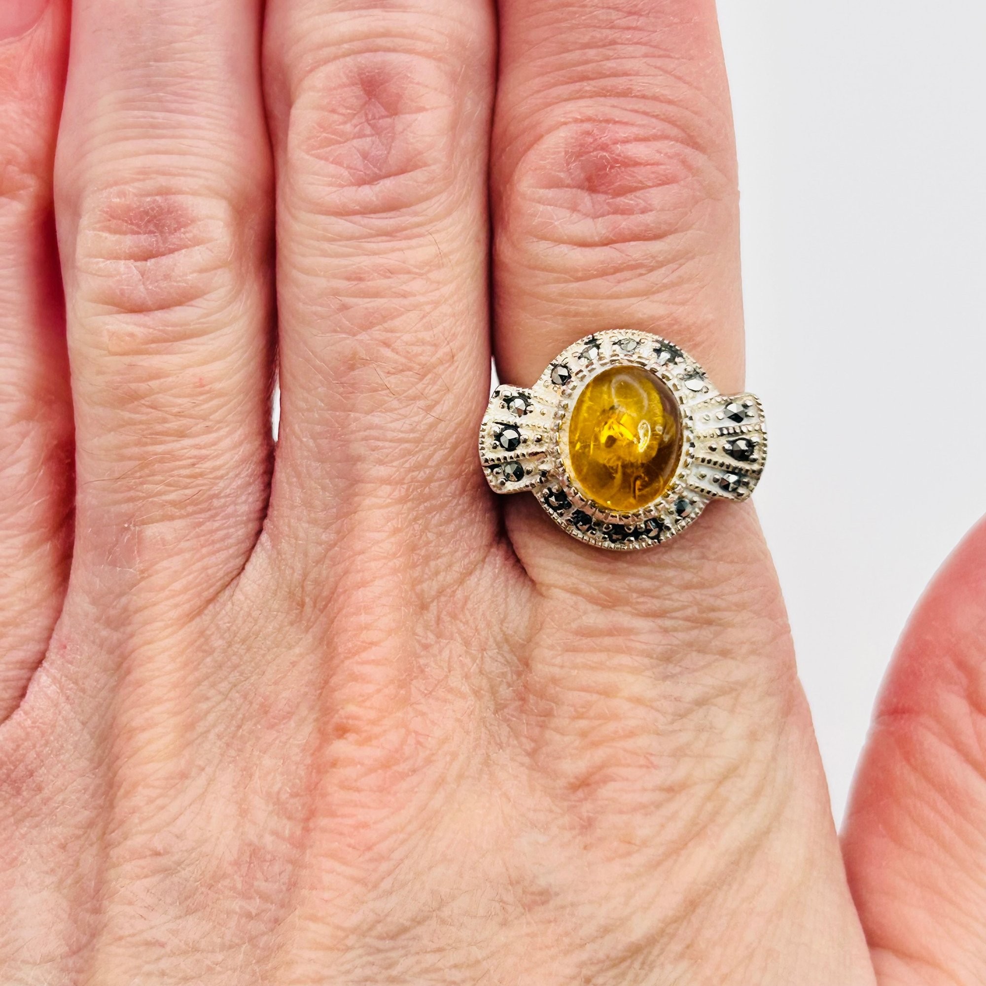 Sterling Amber And Marcasite Statement Ring Size 6.5