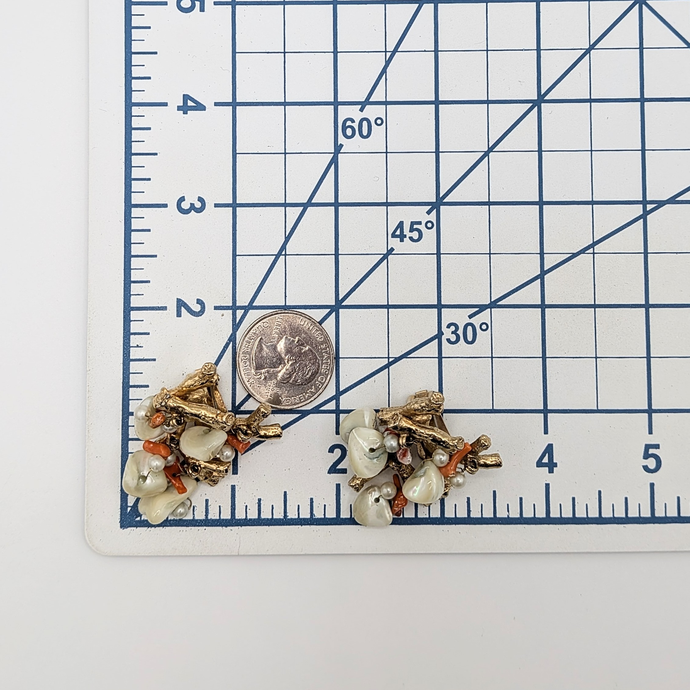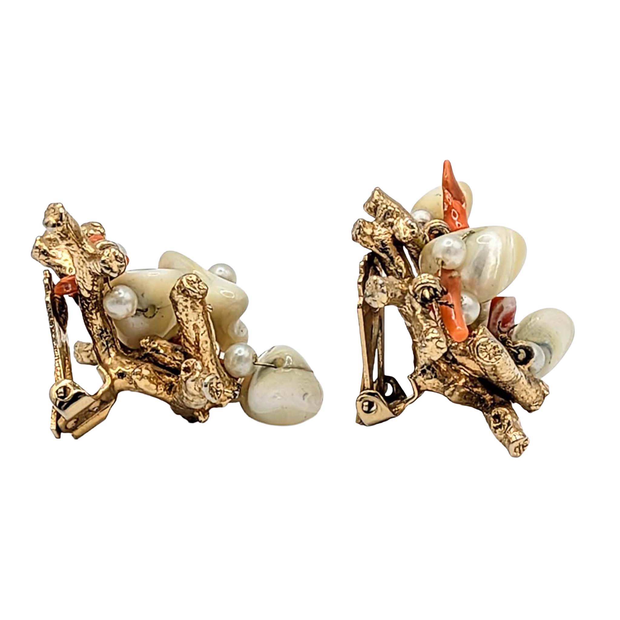 Vintage Gold Tone Metal, Coral, Pearl, Mother of Pearl Cluster Coral Branch Clip Back Earrings. Unsigned. 31.2g