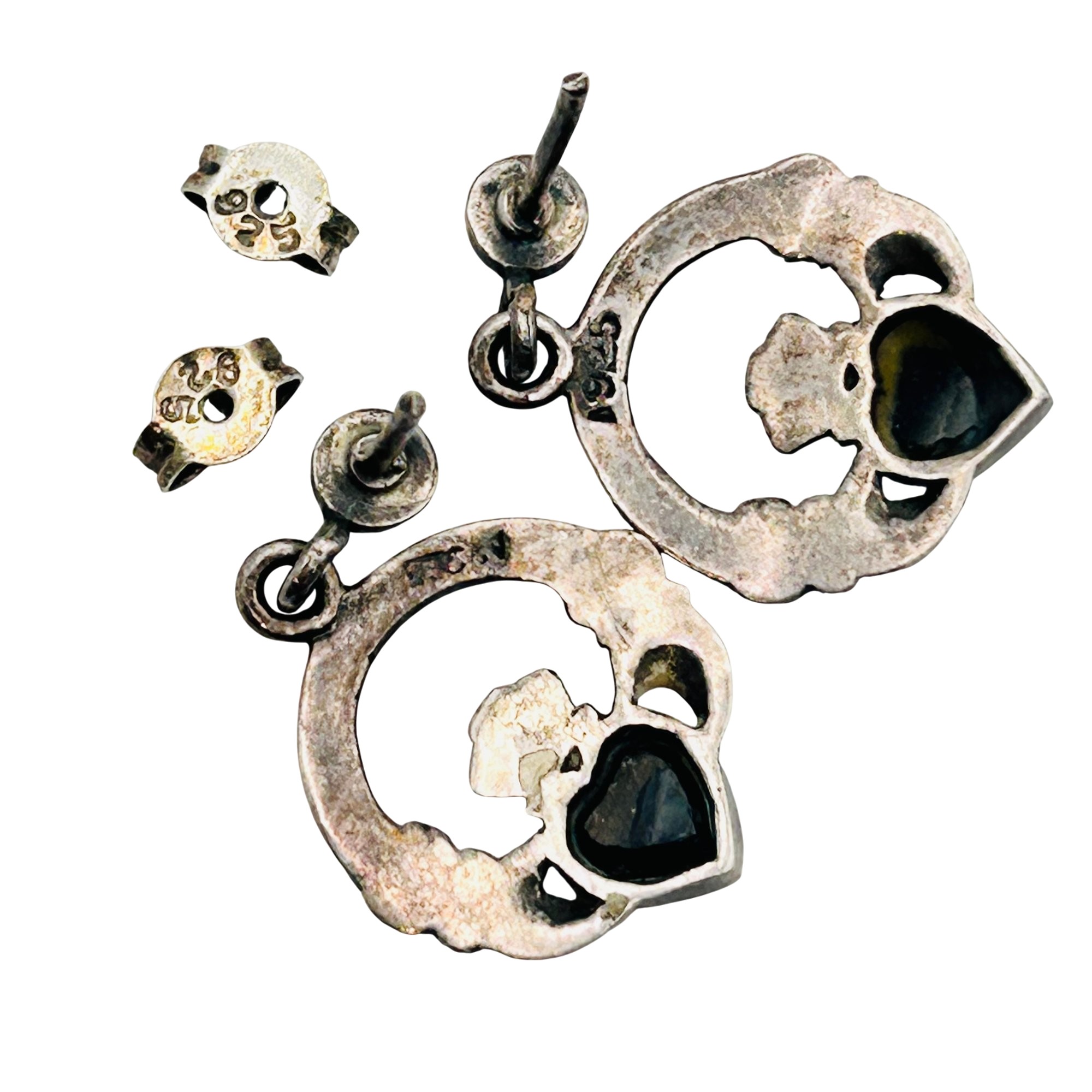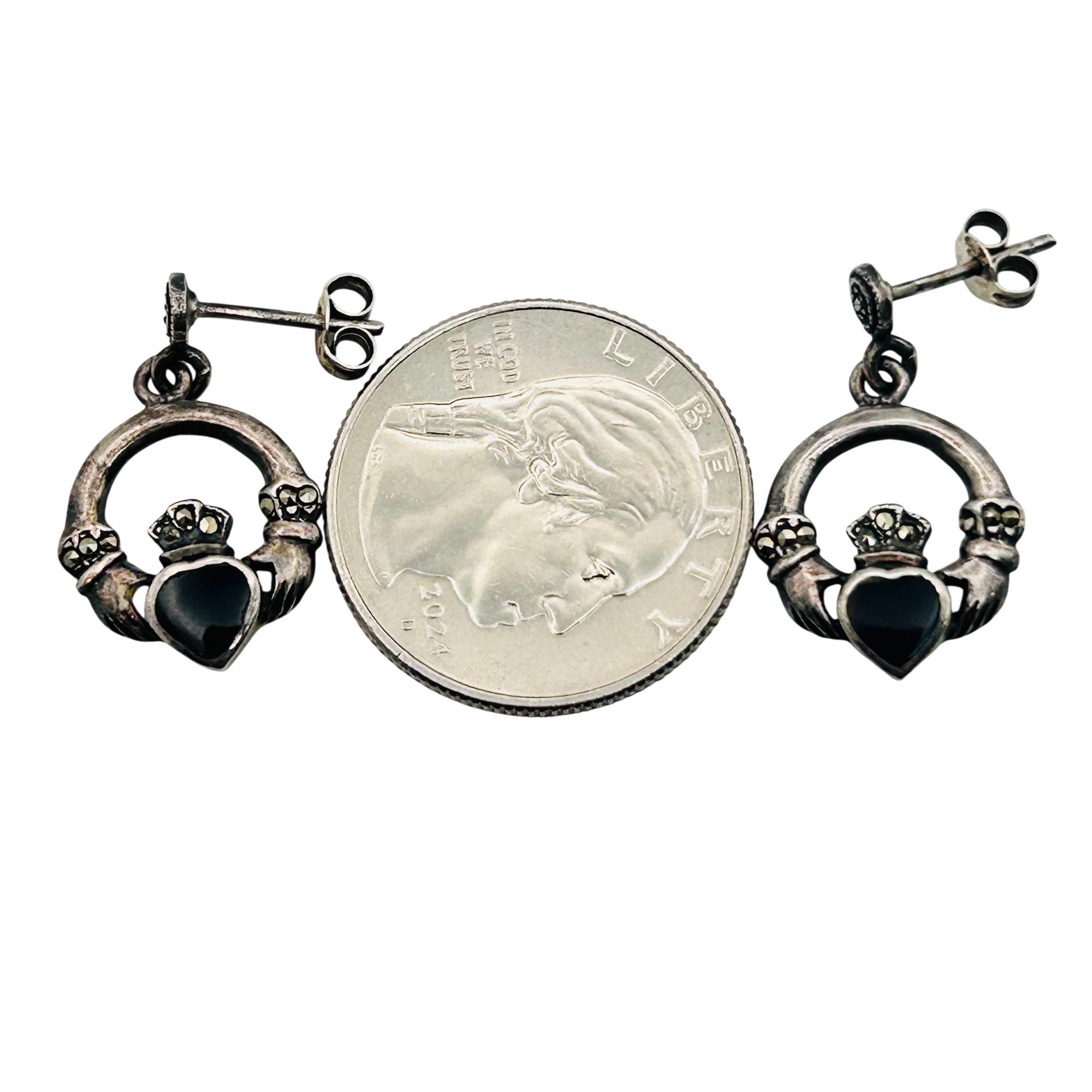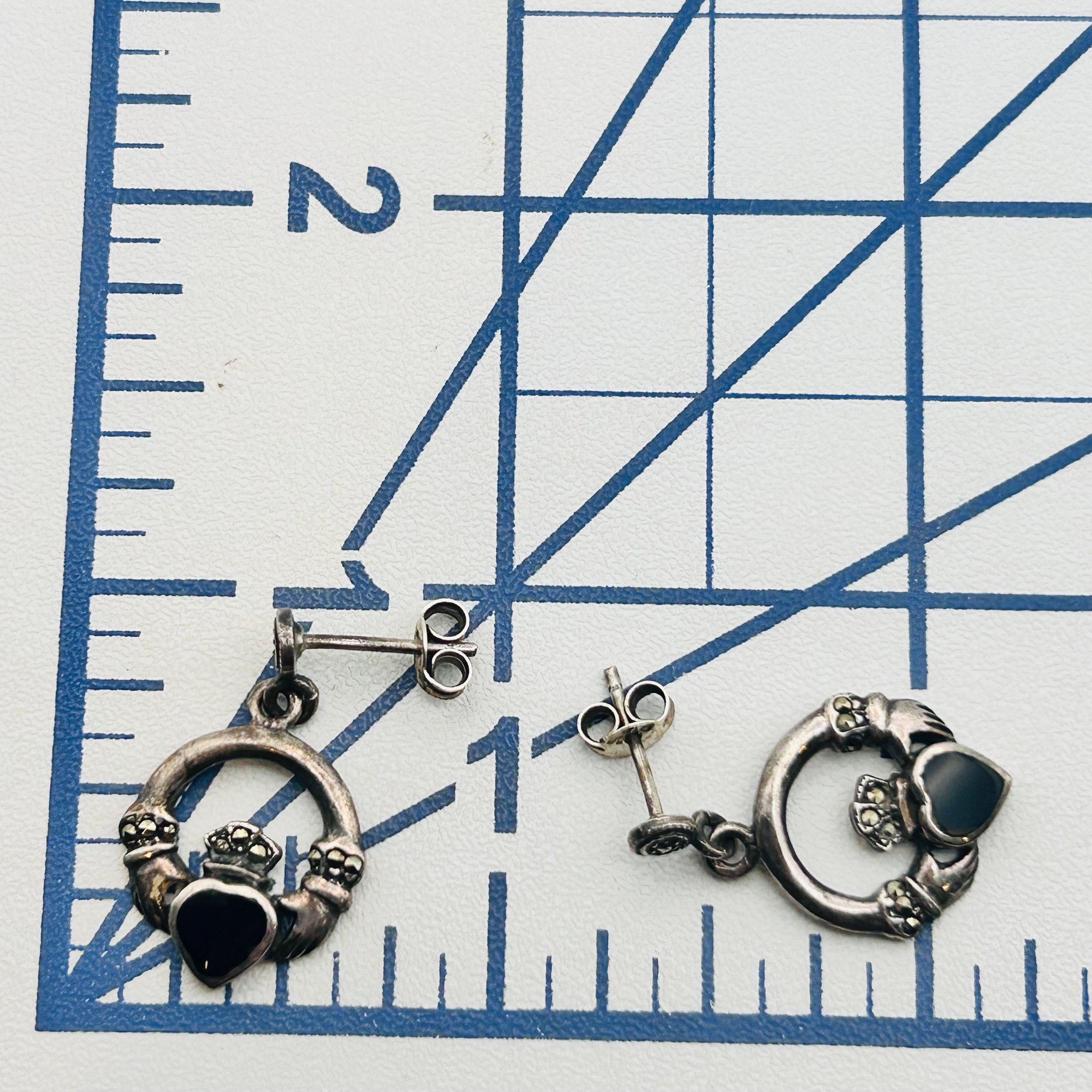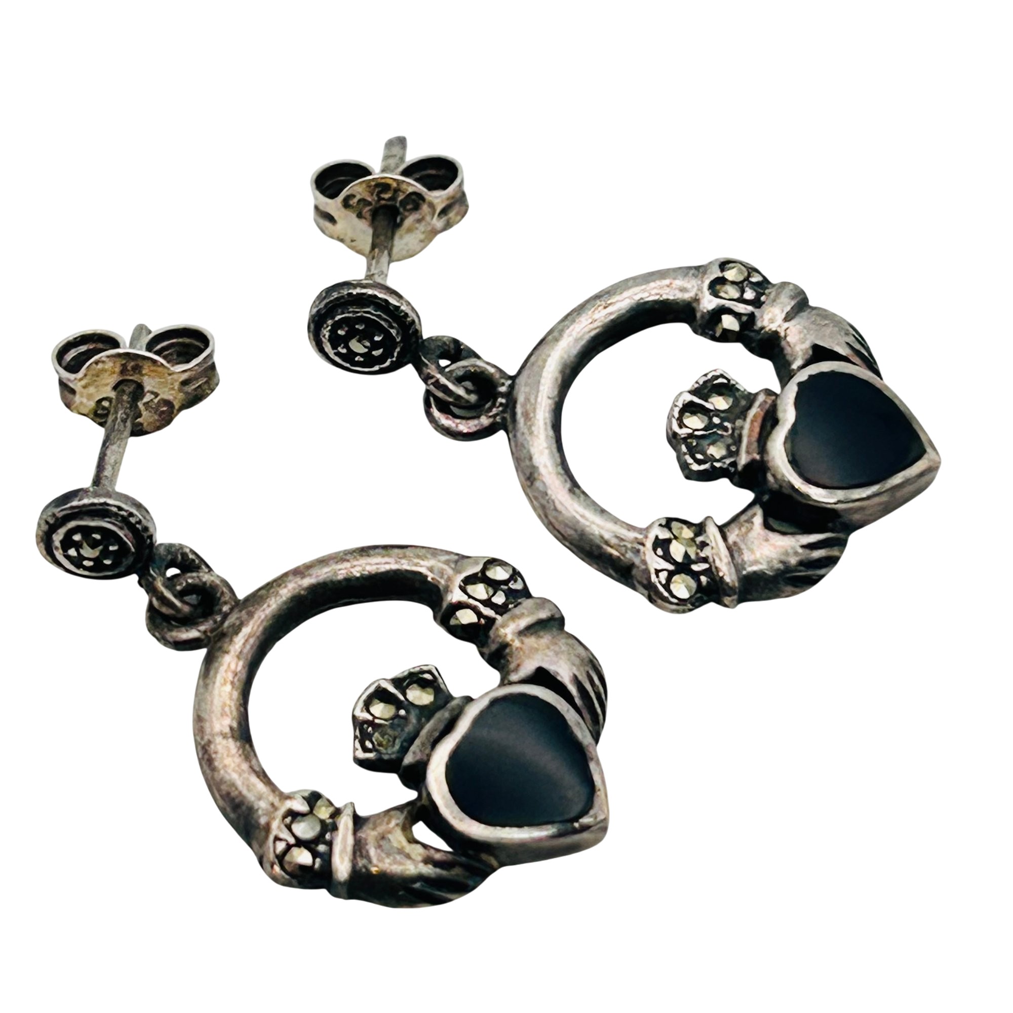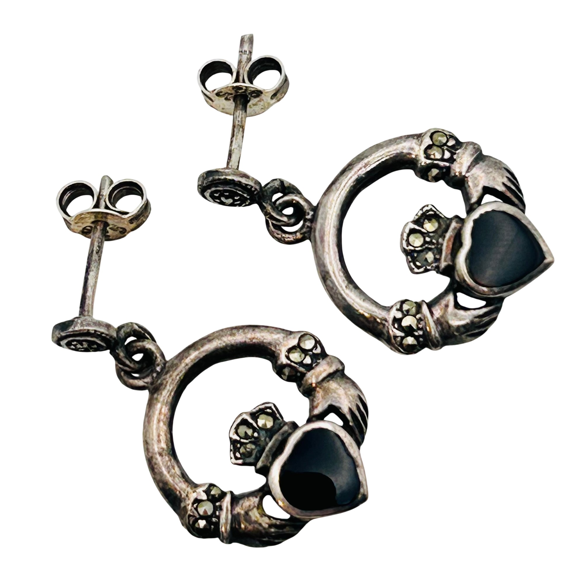 Sterling marcasite black stone claddagh stud earrings. 3.50g