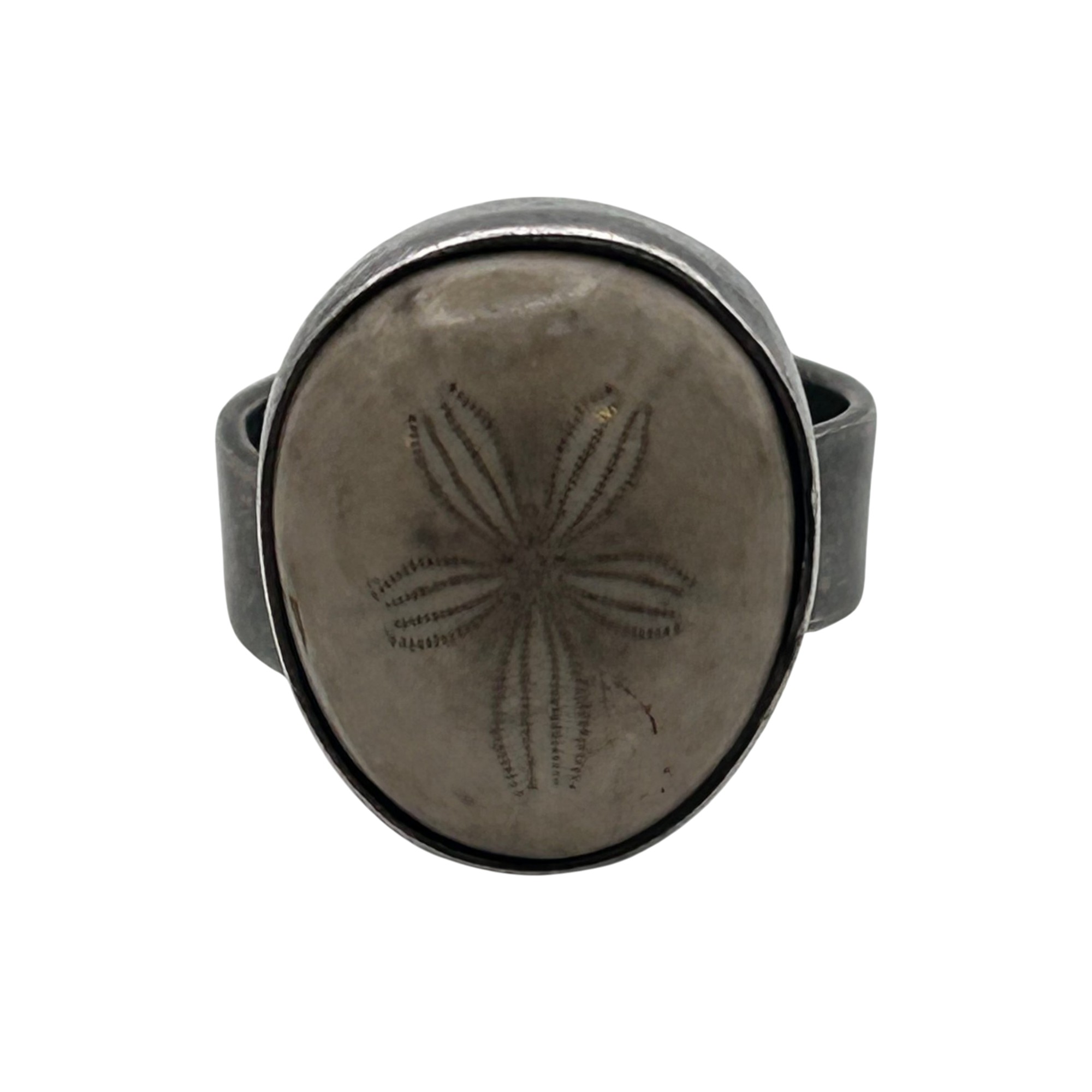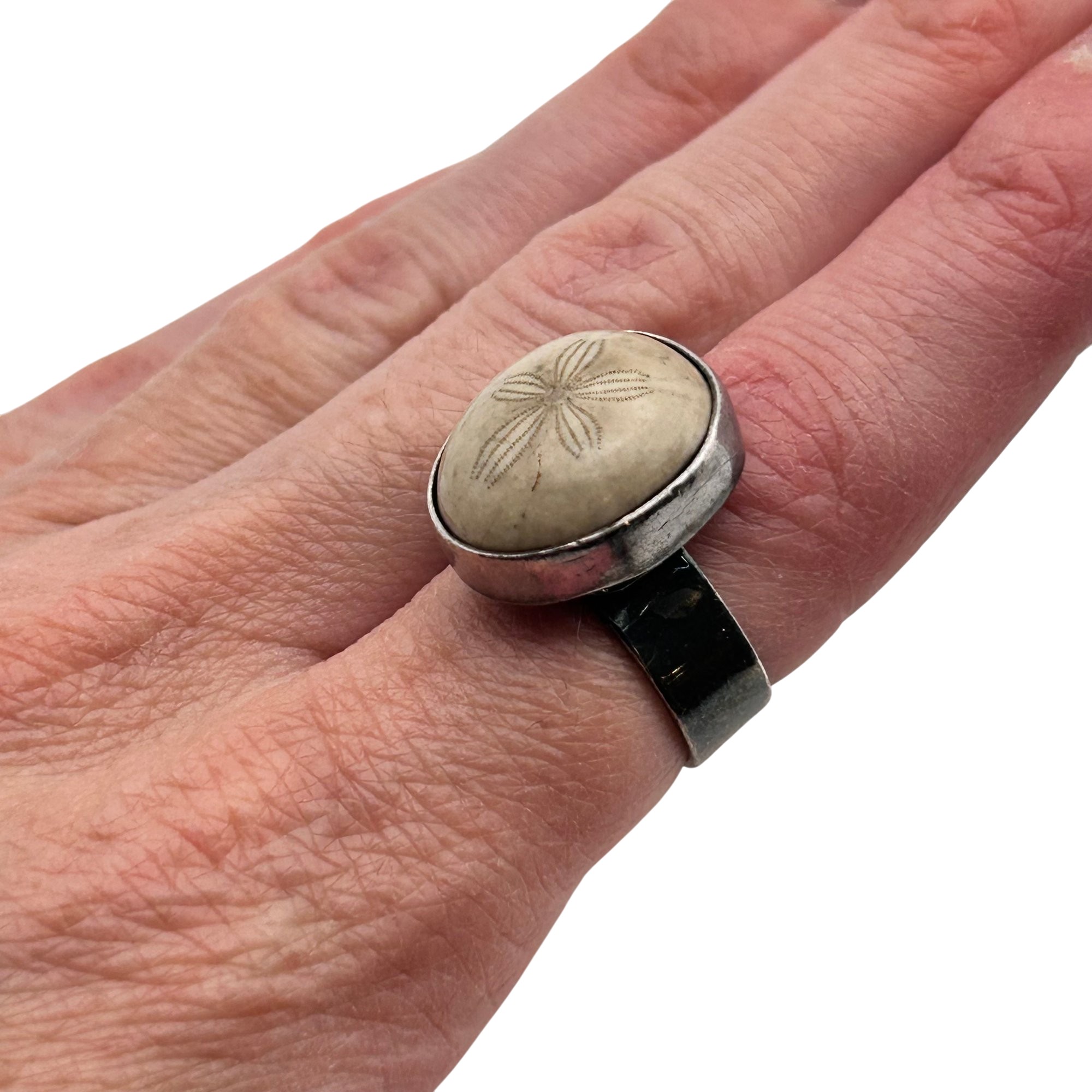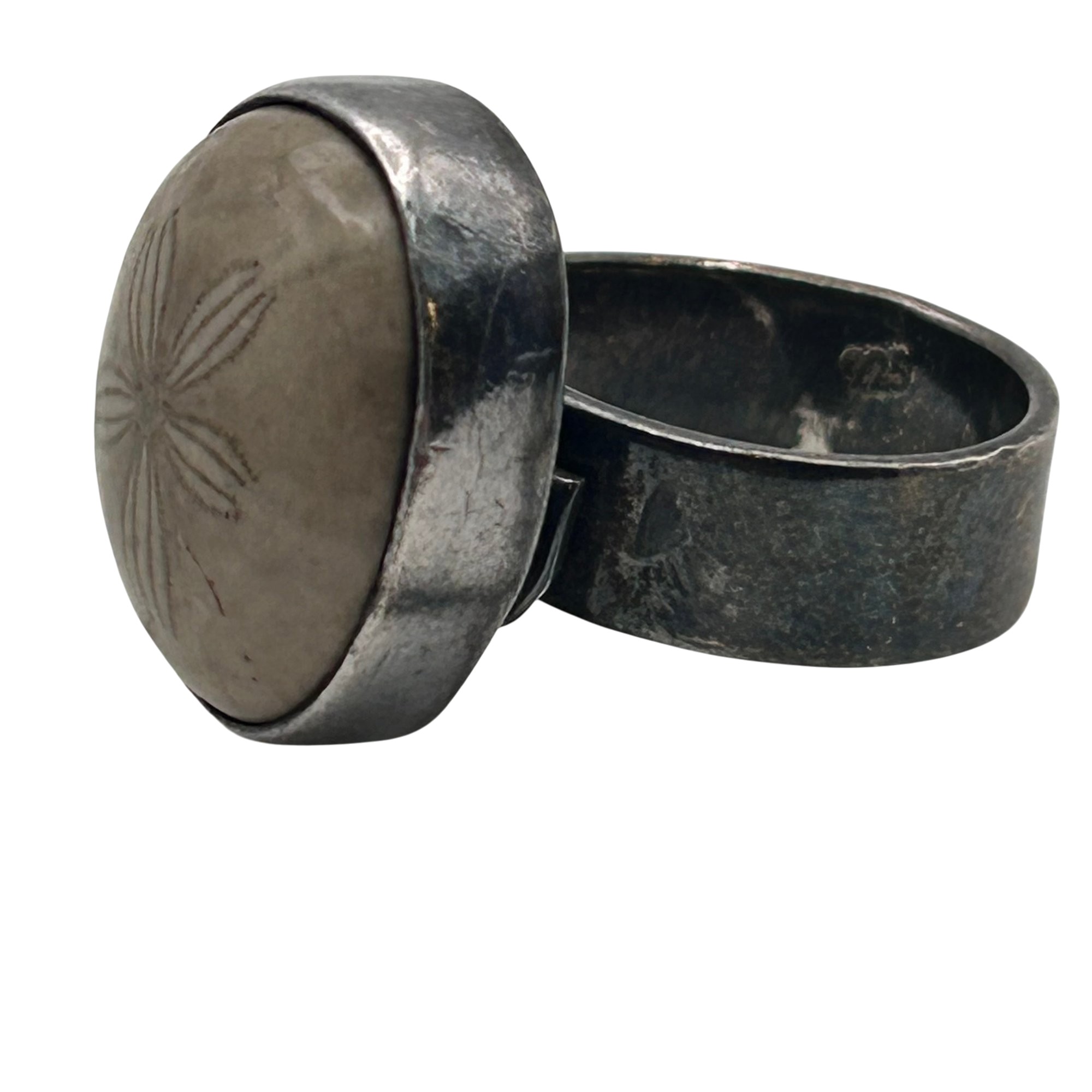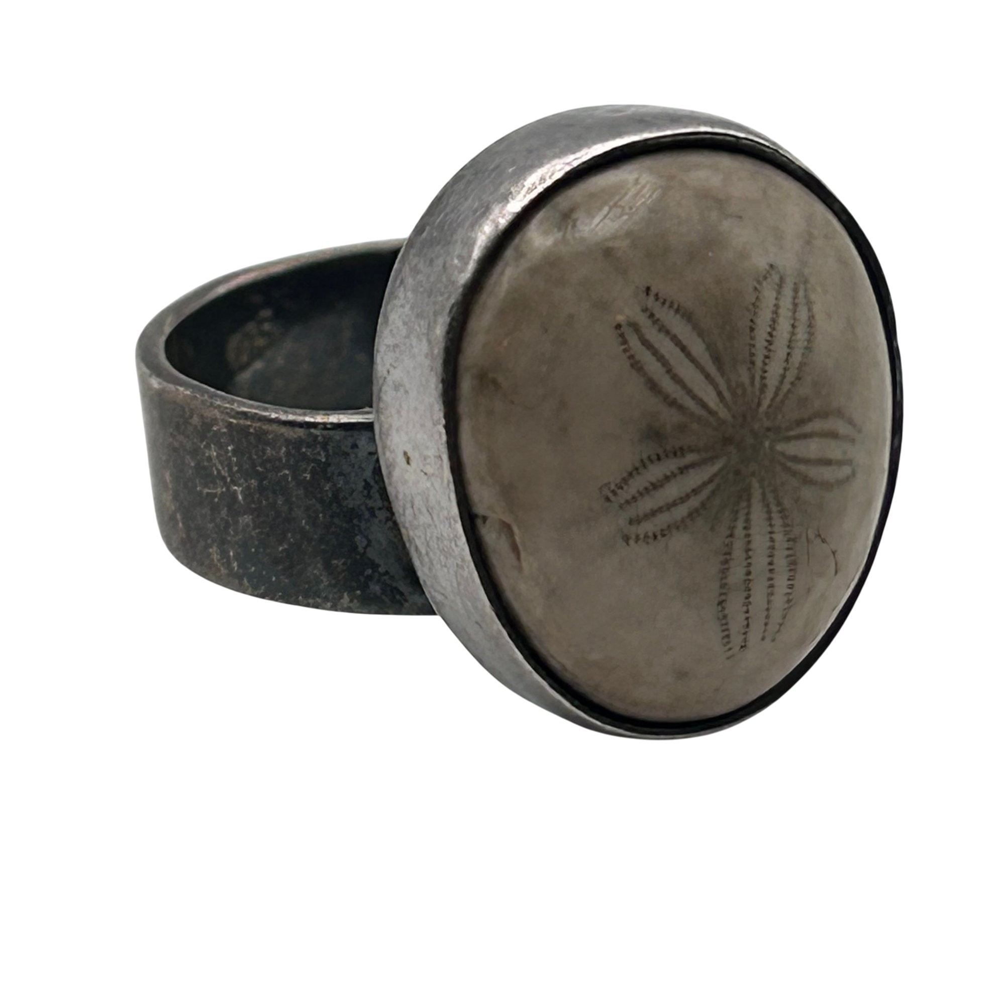 Sterling fossilized sand dollar adjustable ring. 10.00g