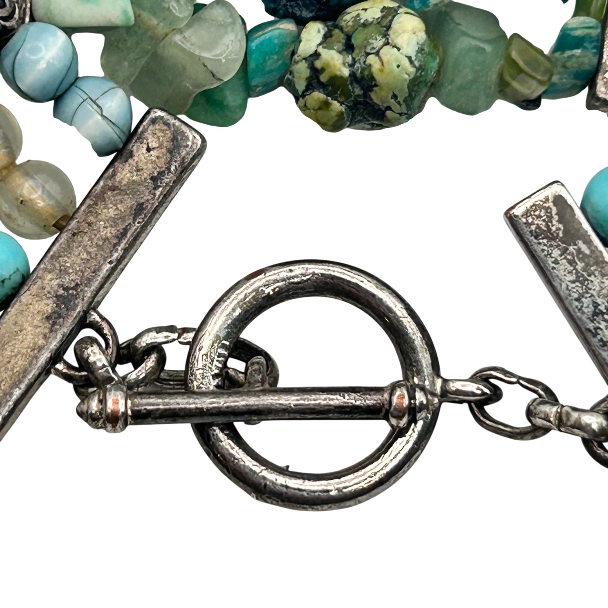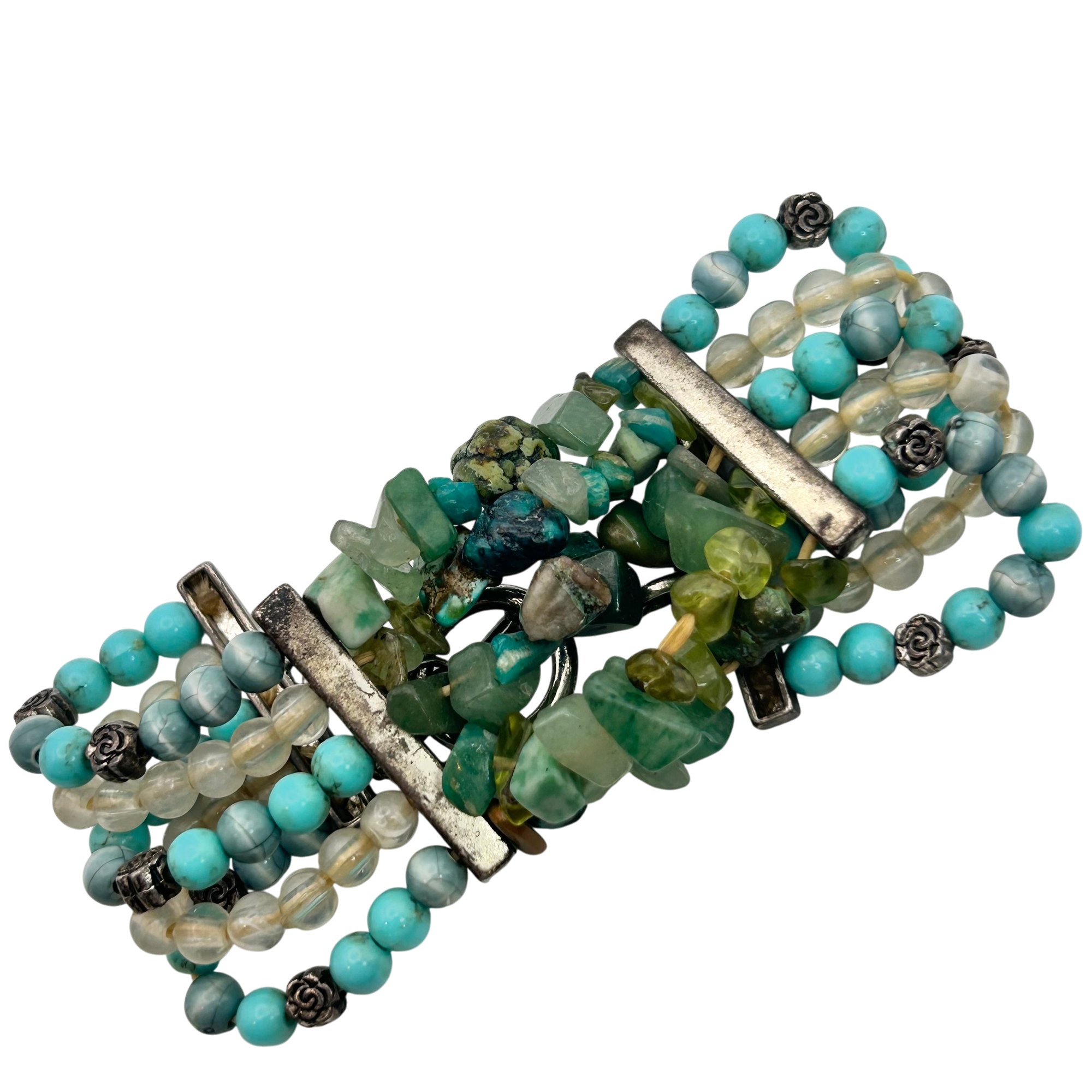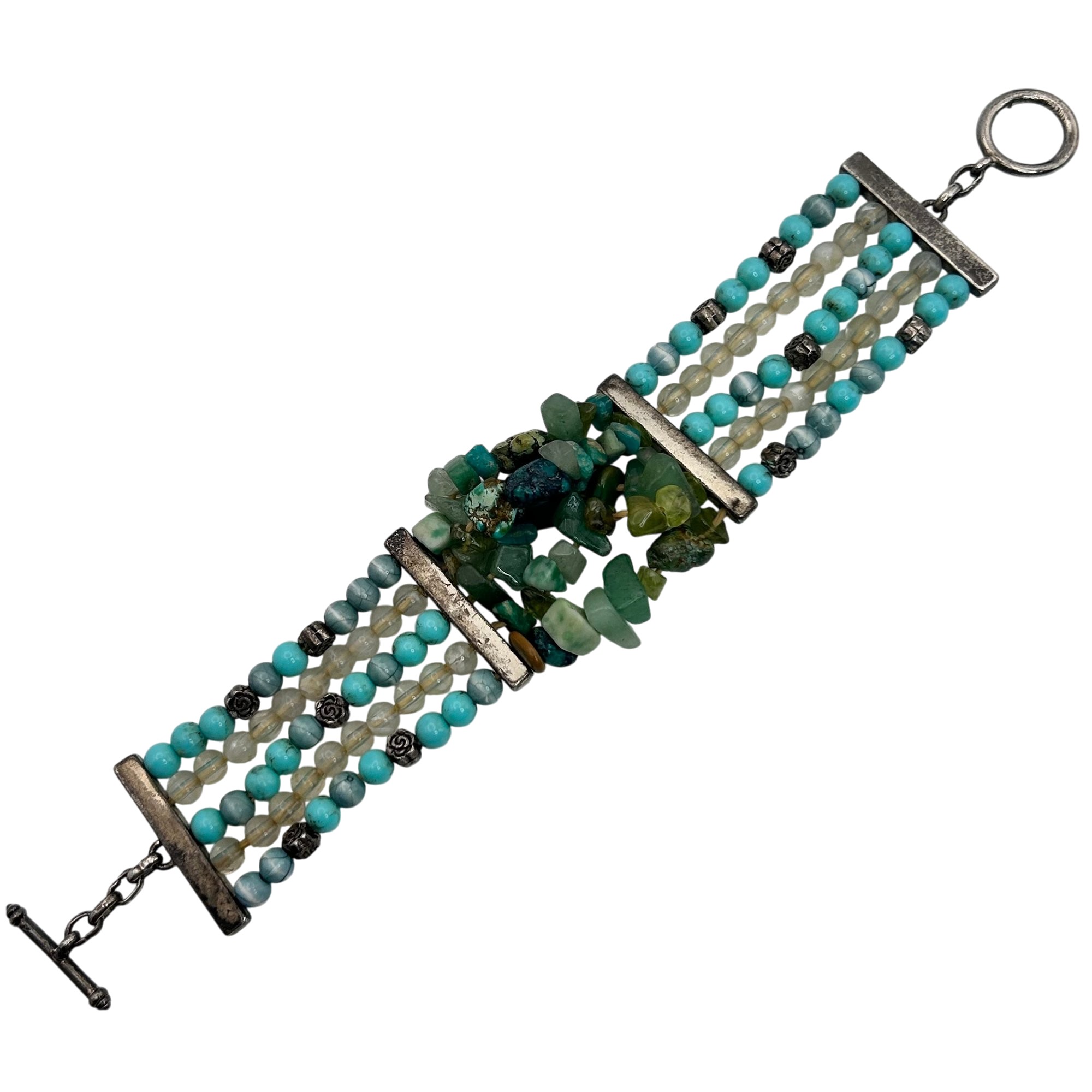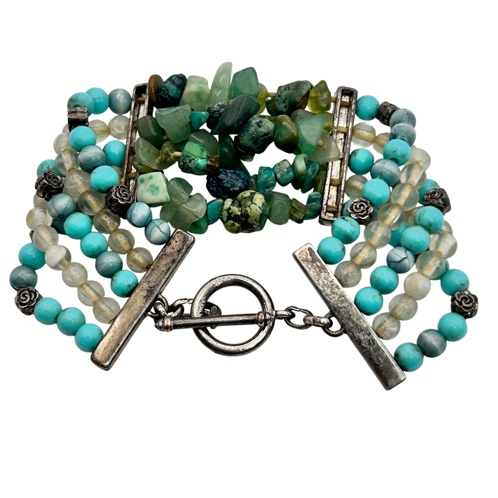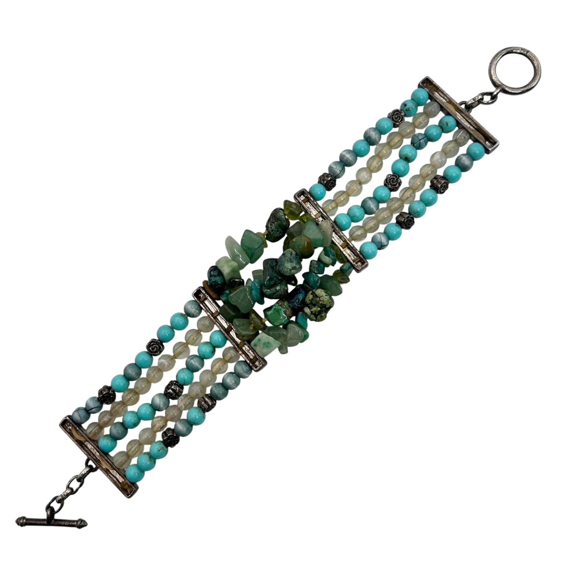 Sterling jade and turquoise toggle clasp stretchy bracelet. 28.60g
