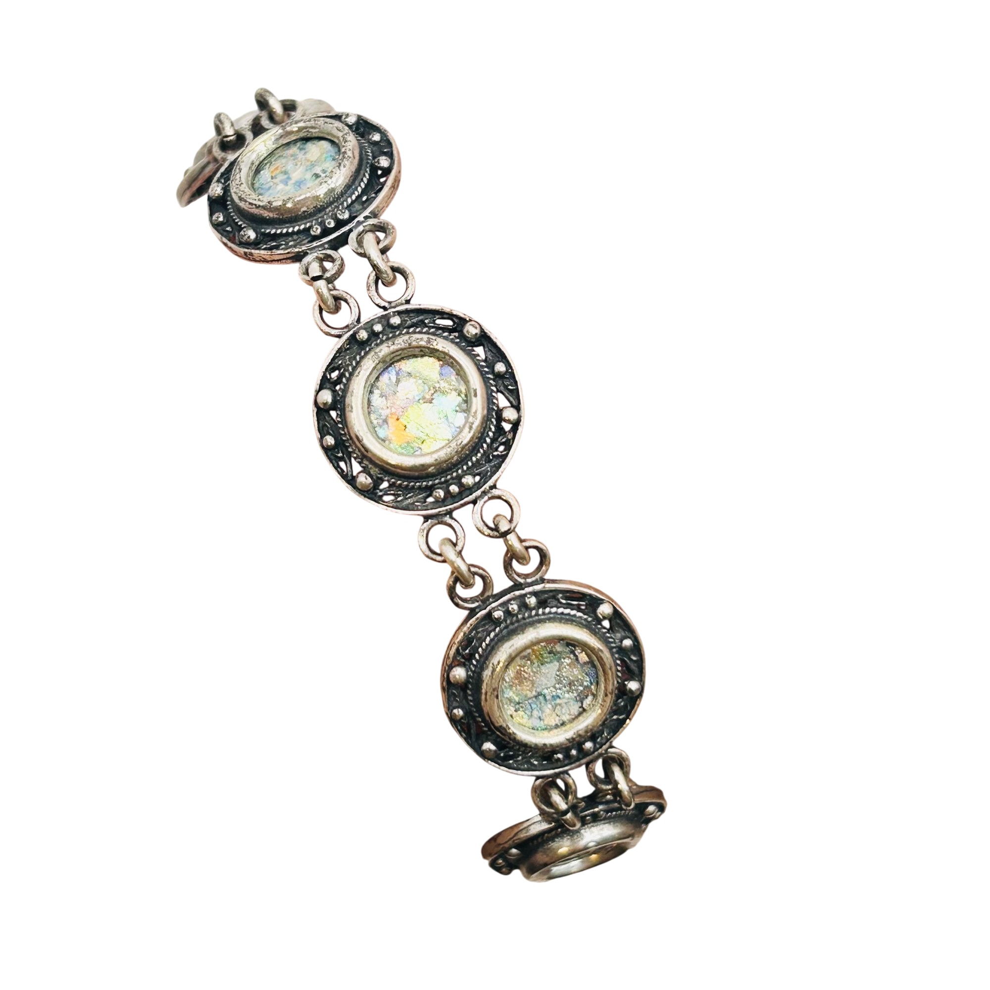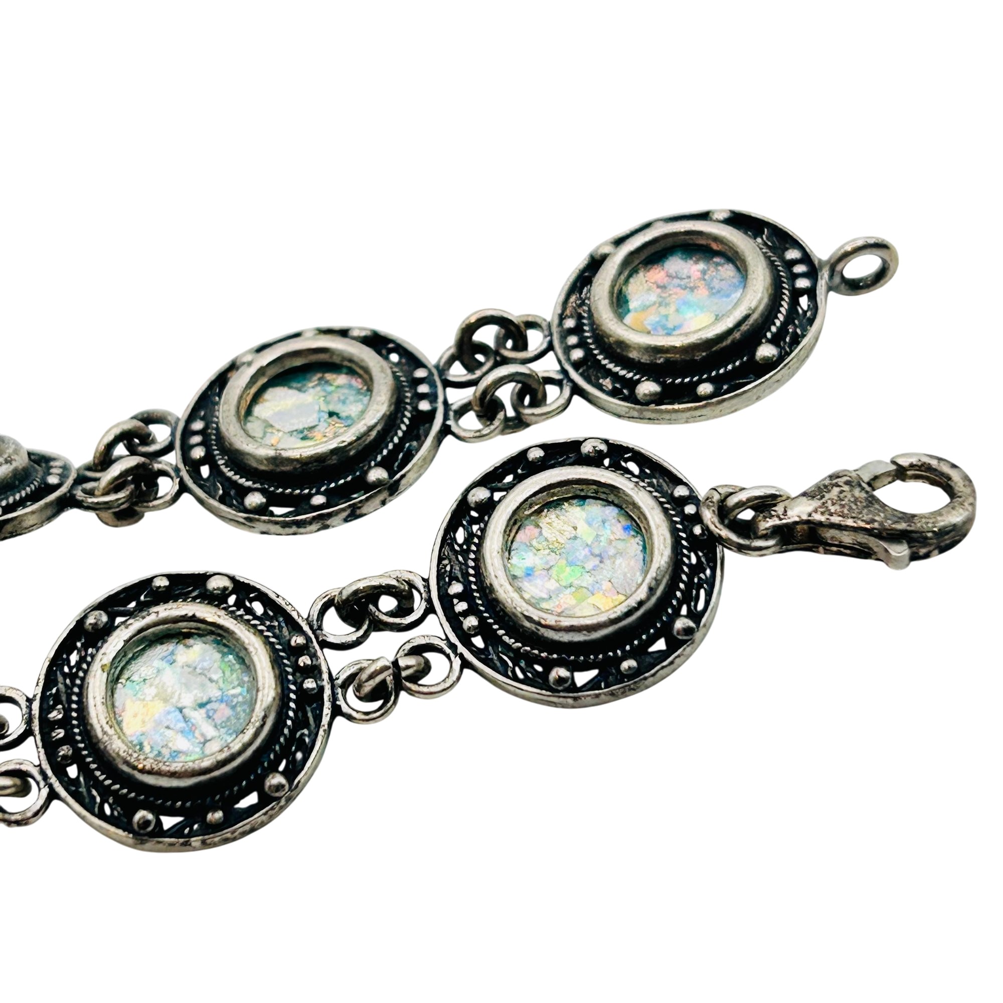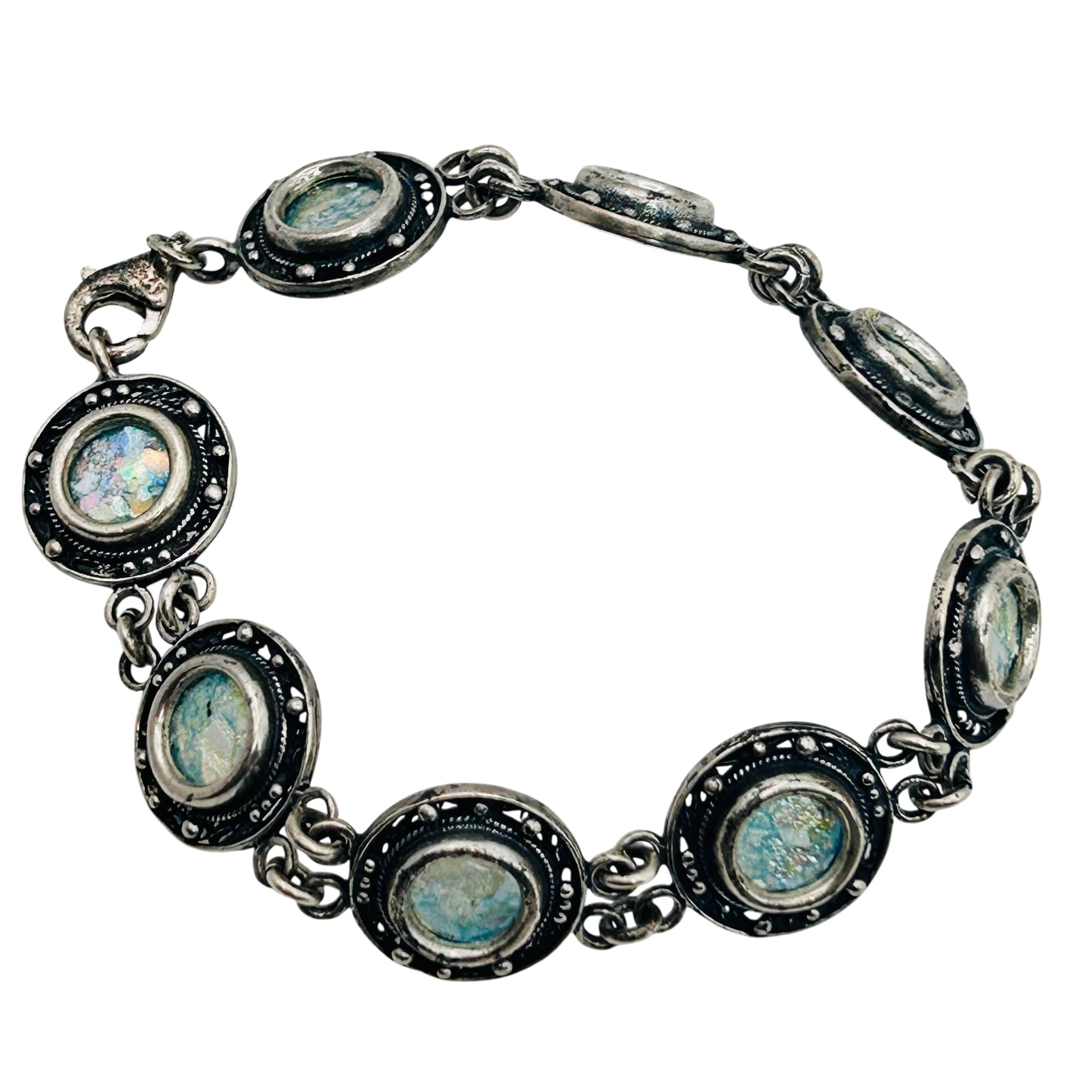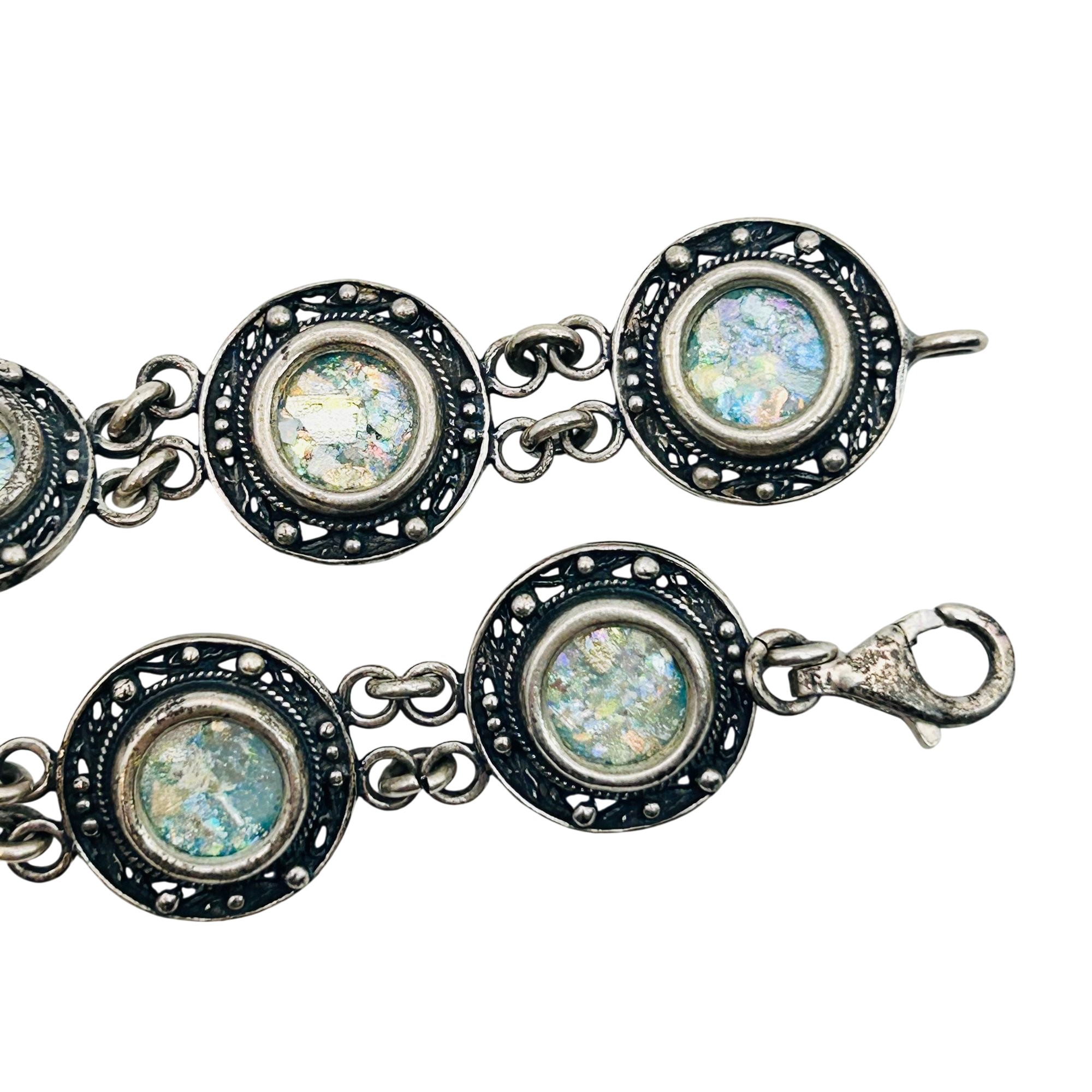 Sterling Ancient Roman glass filigree bracelet. 18.20g