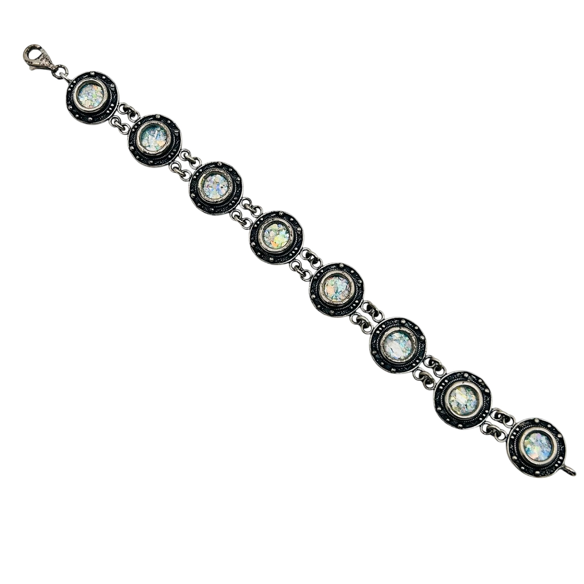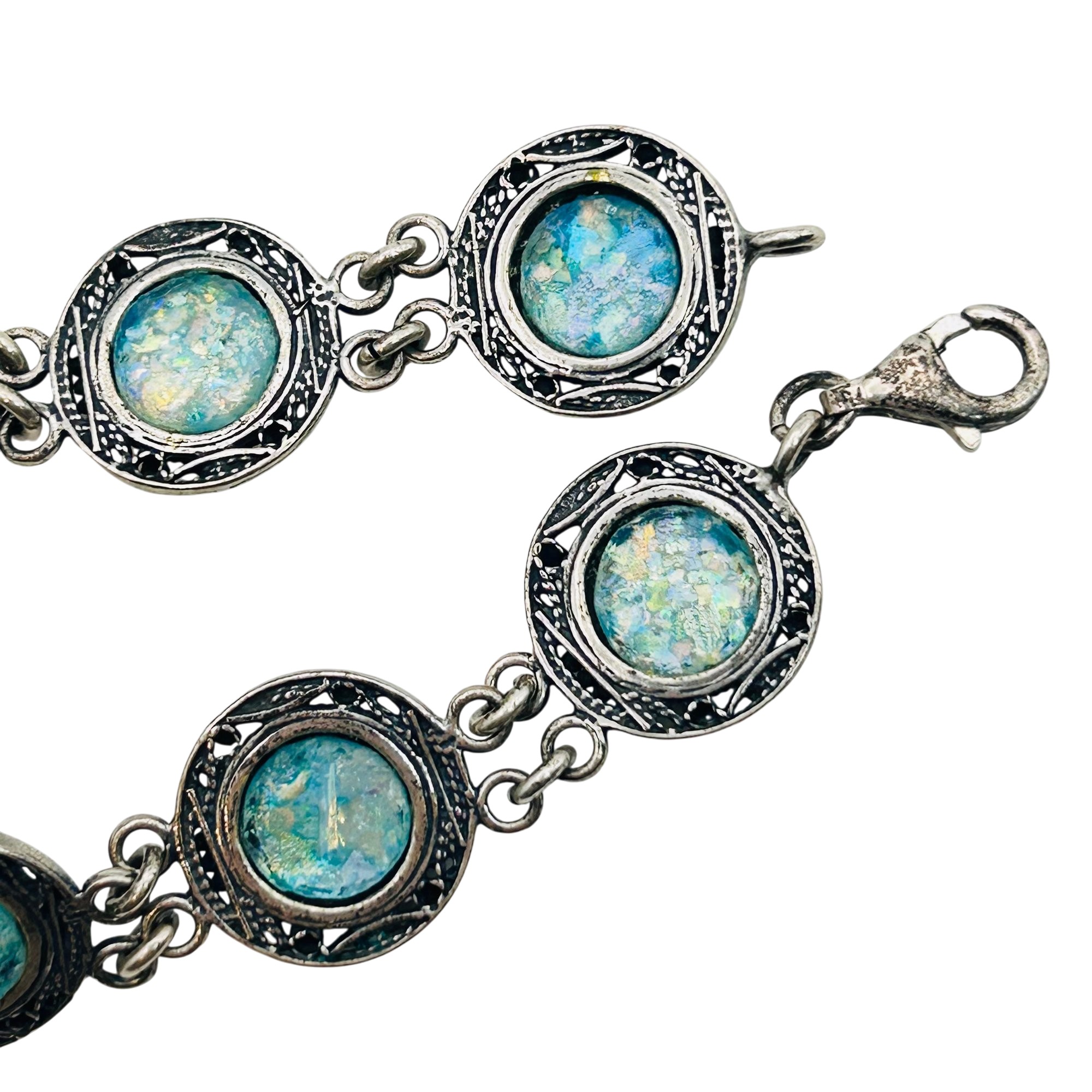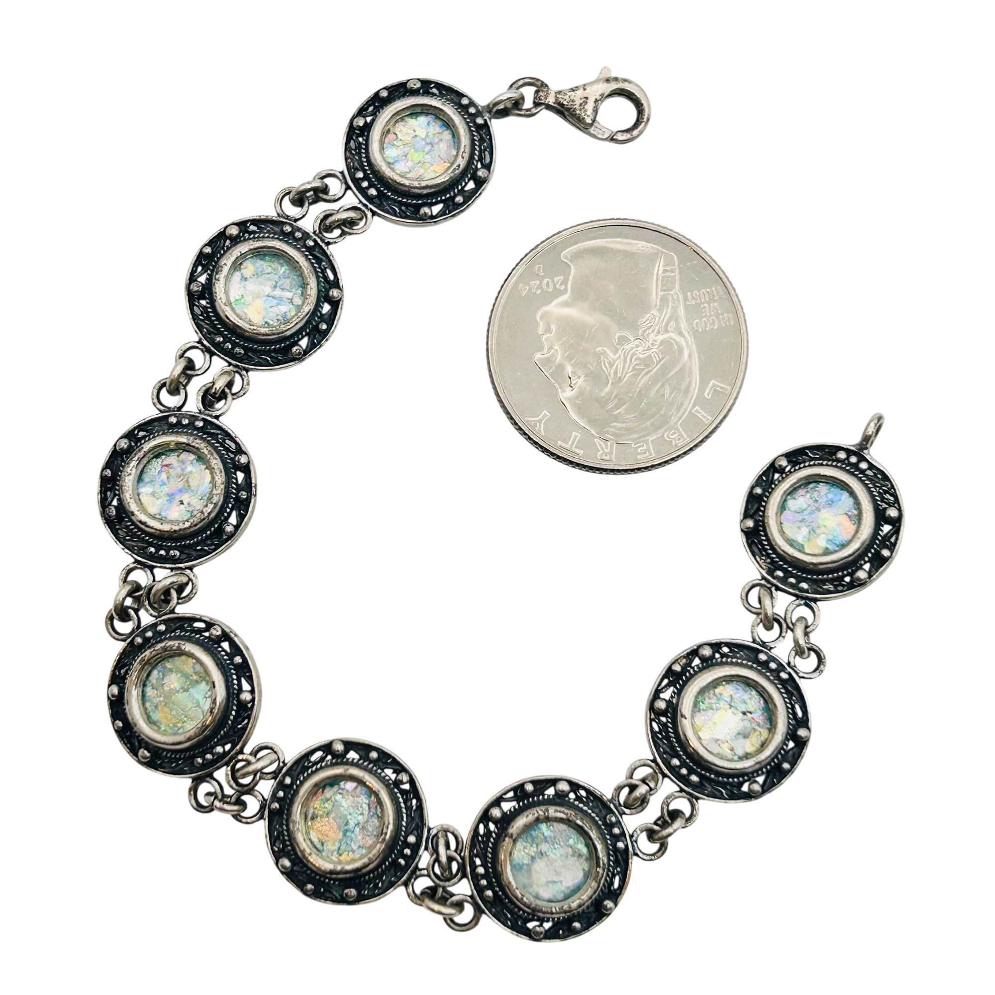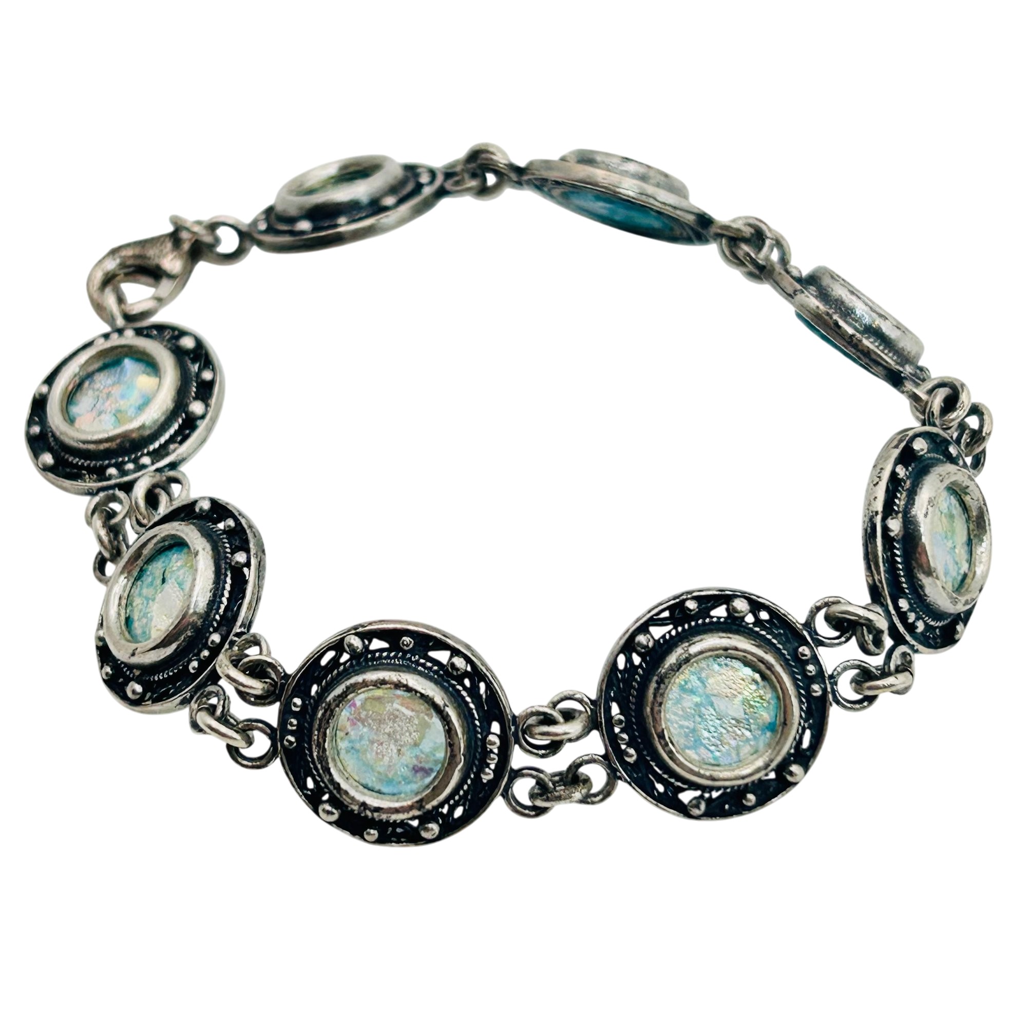 Sterling Ancient Roman glass filigree bracelet. 18.20g