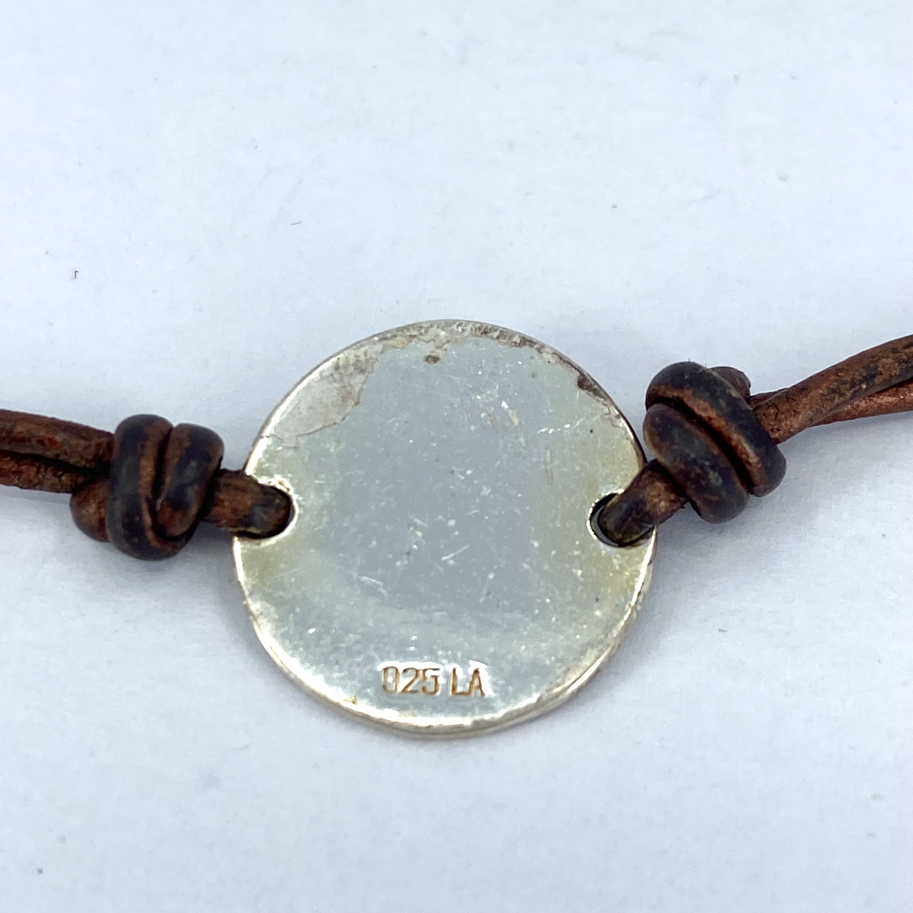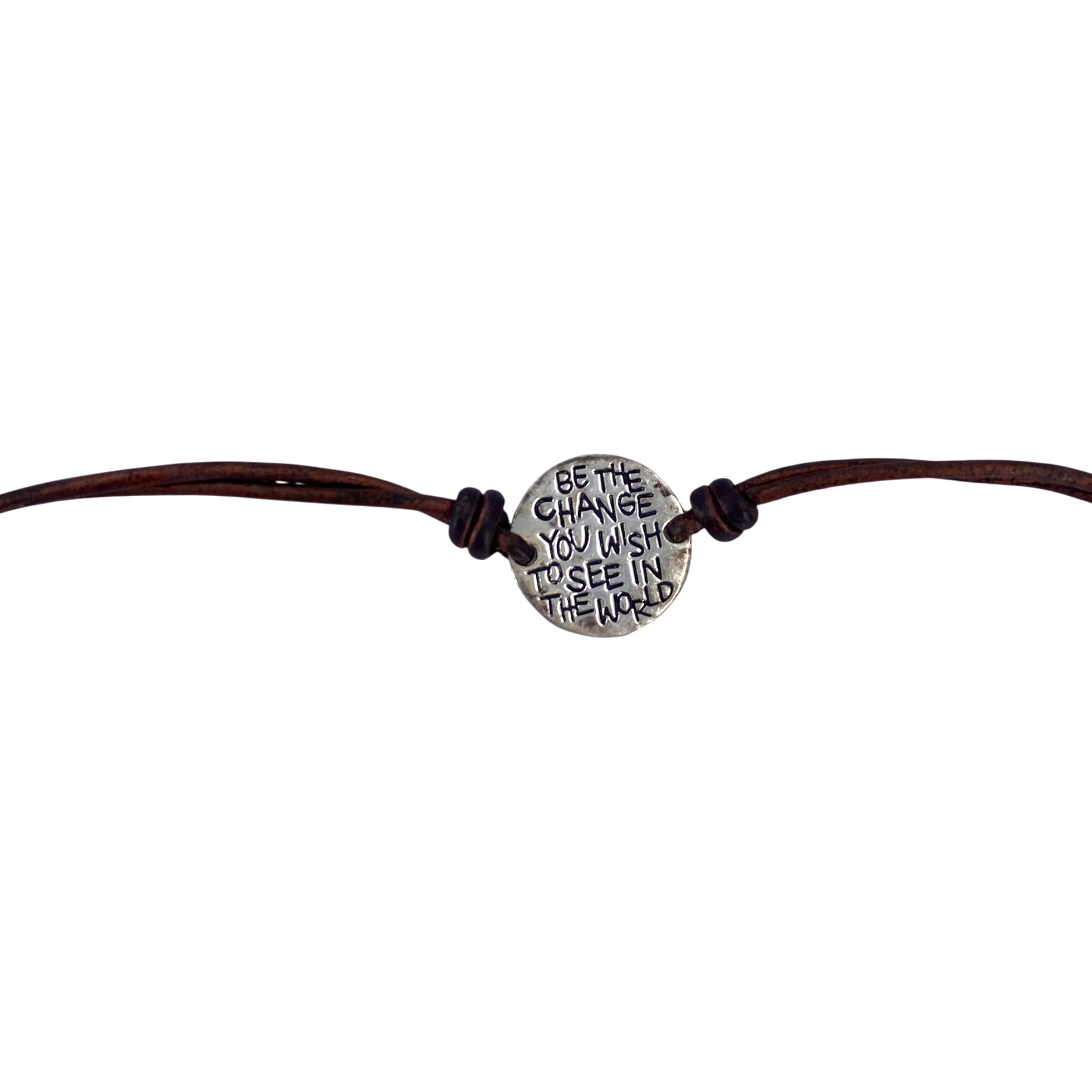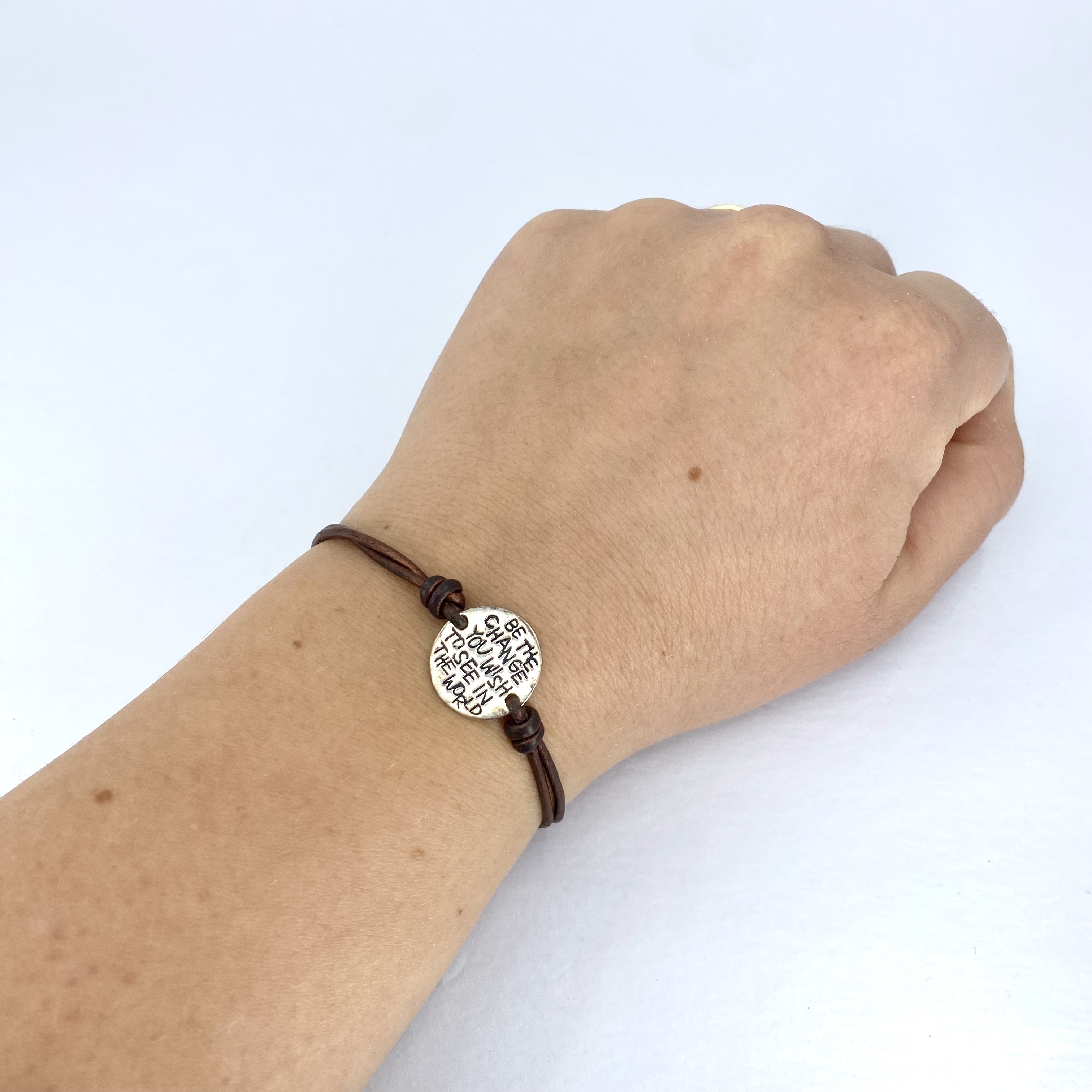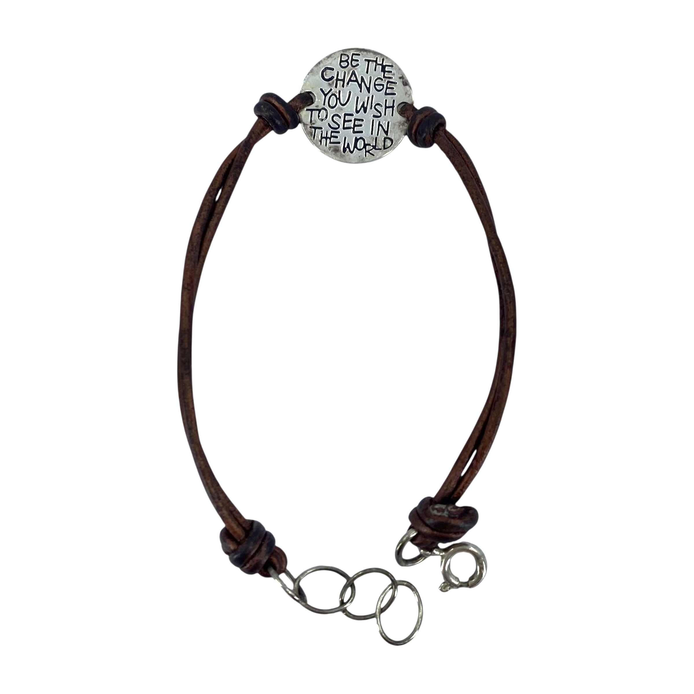 Sterling and Leather Cord Signed Be The Change Bracelet 3.49g