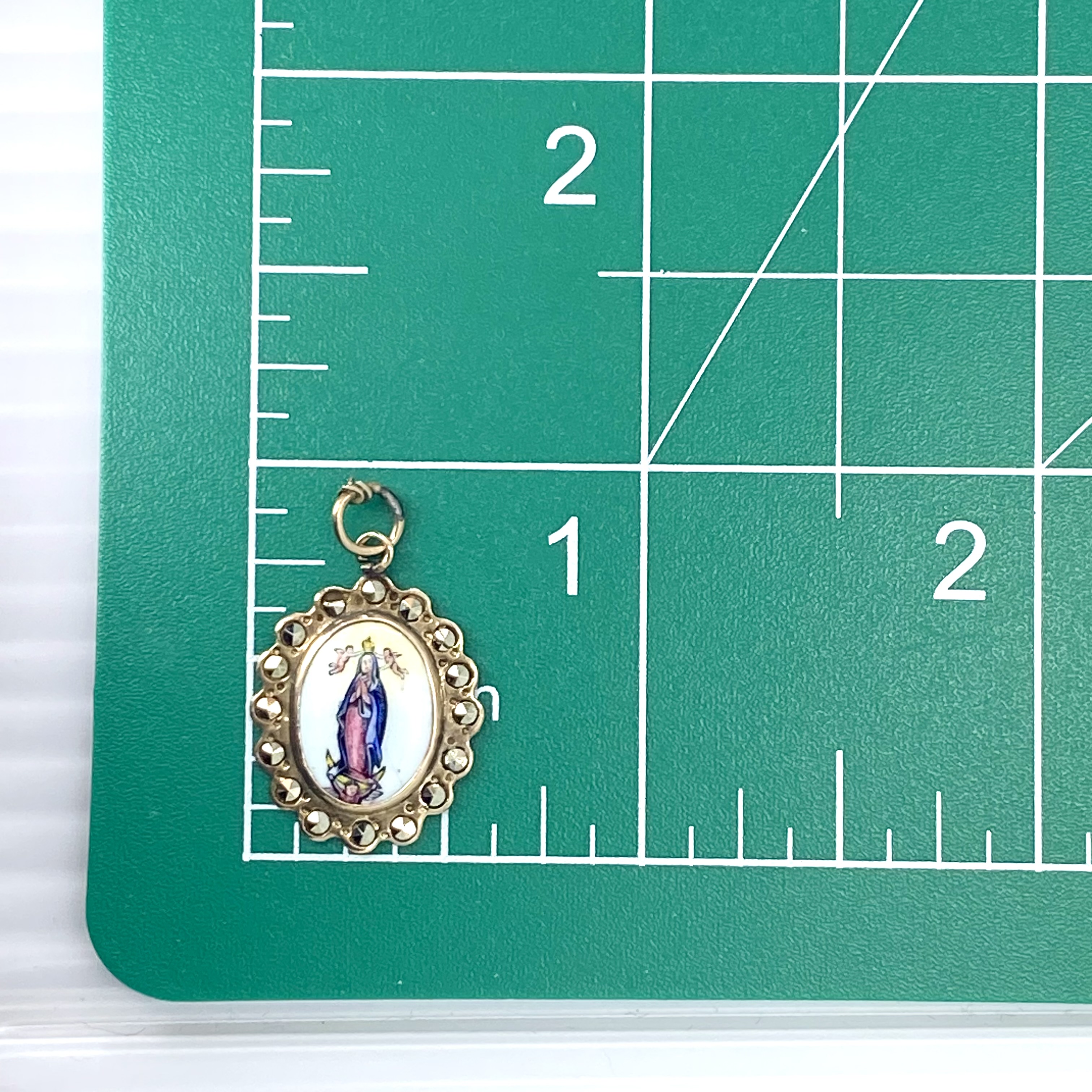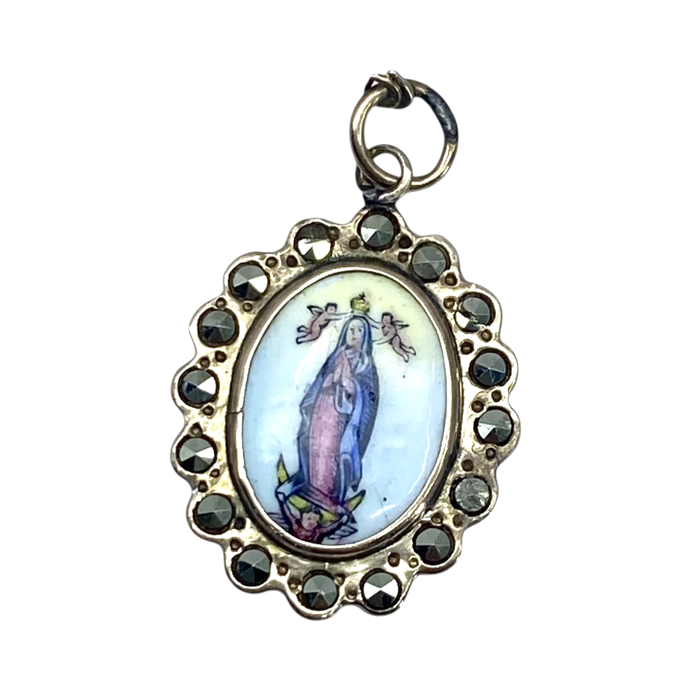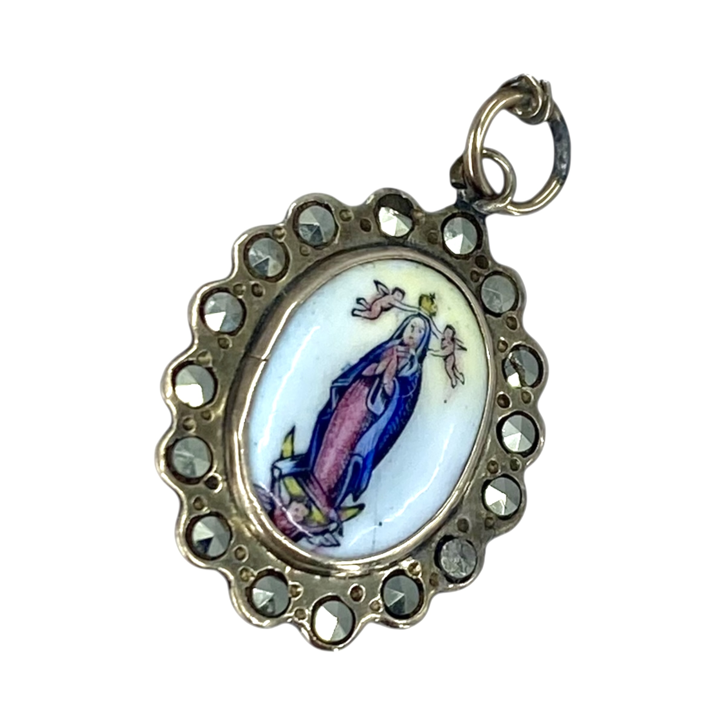 Sterling Marcasite Painted Our Lady of Lourdes Medal Charm 1.2g