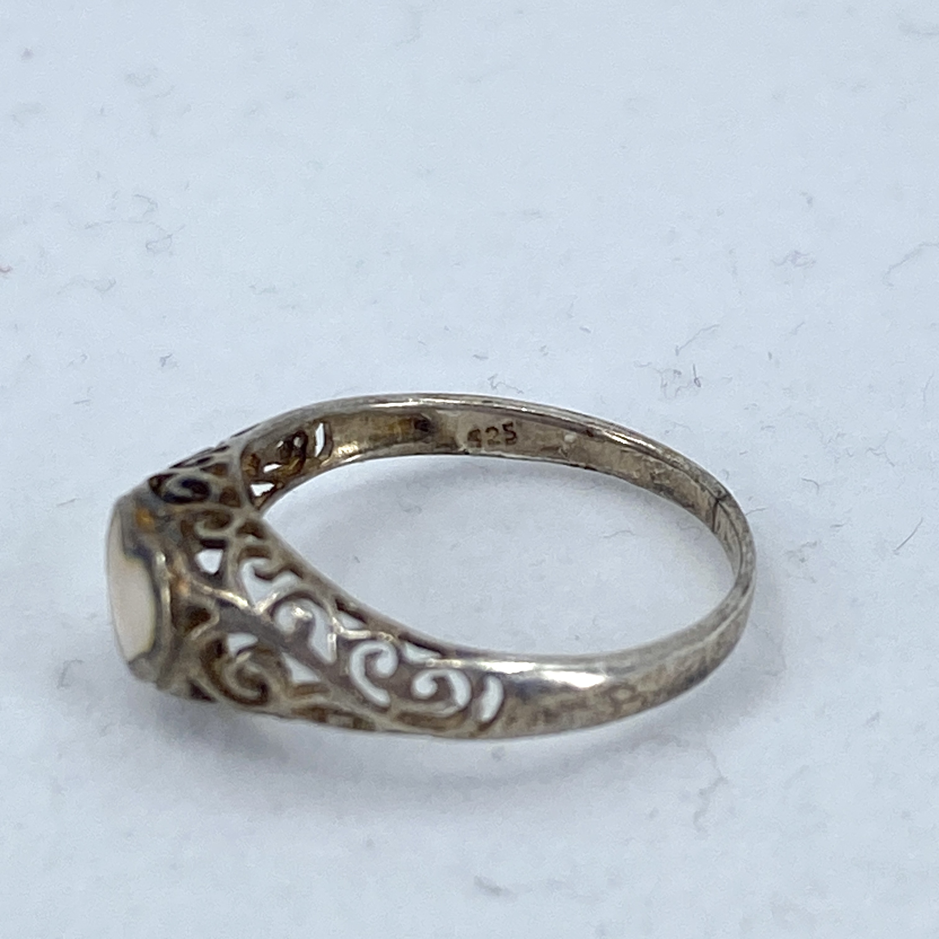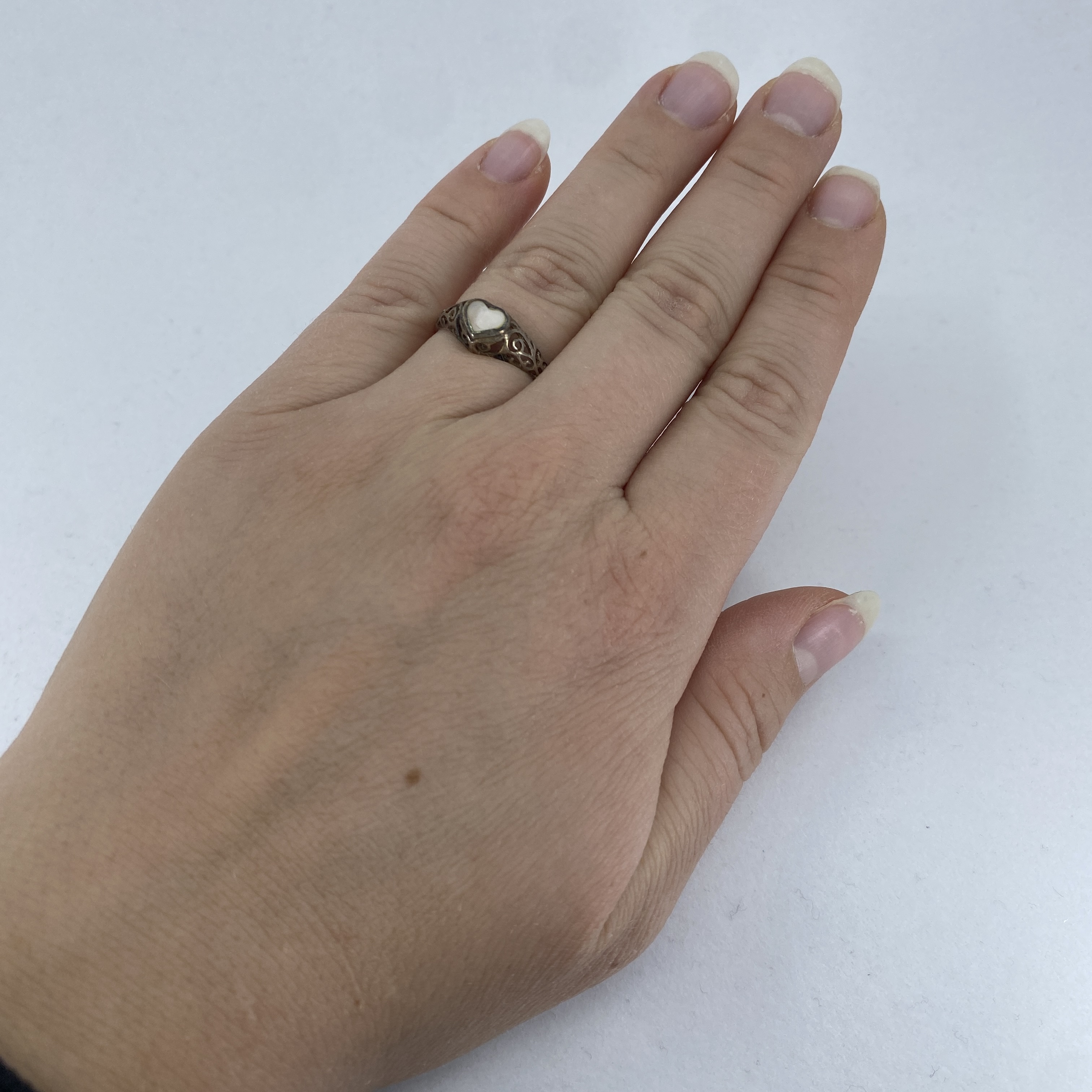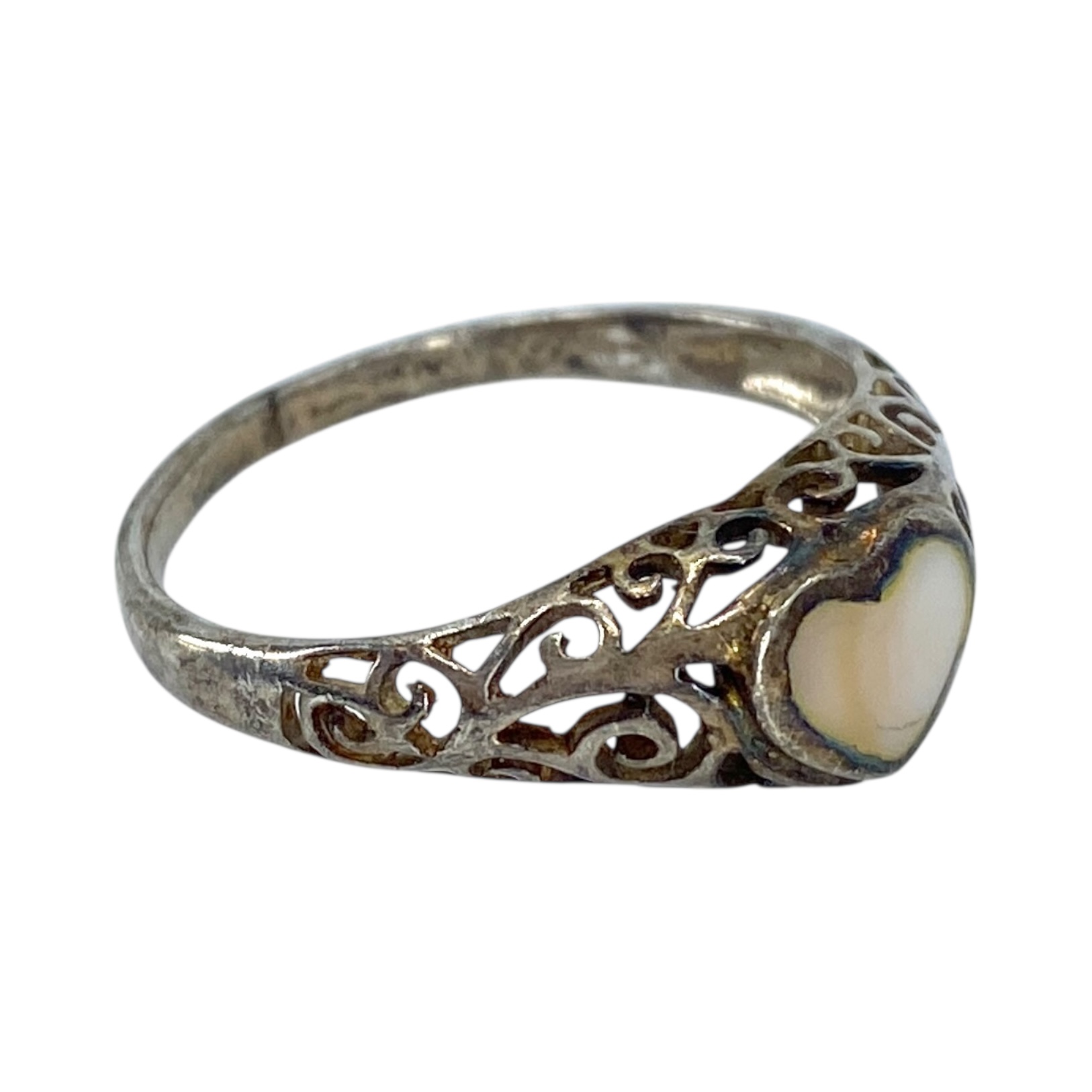 Sterling Mother of Pearl Filigree Heart Ring 2g sz 6.75 Engraved 925