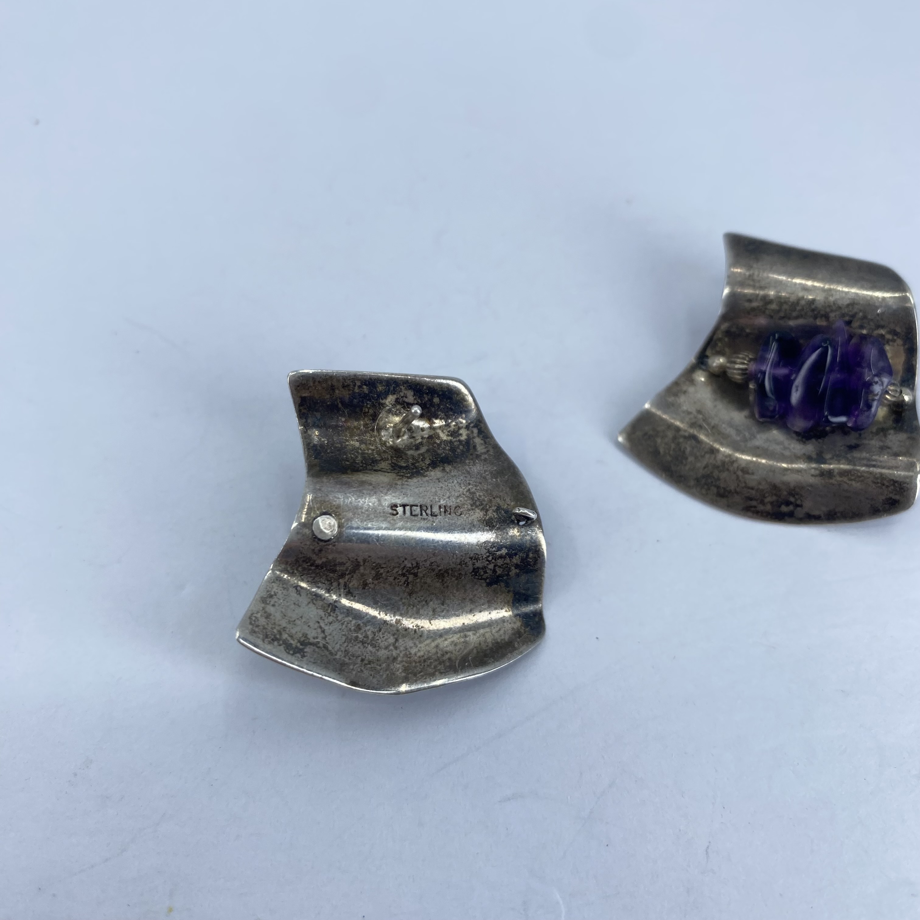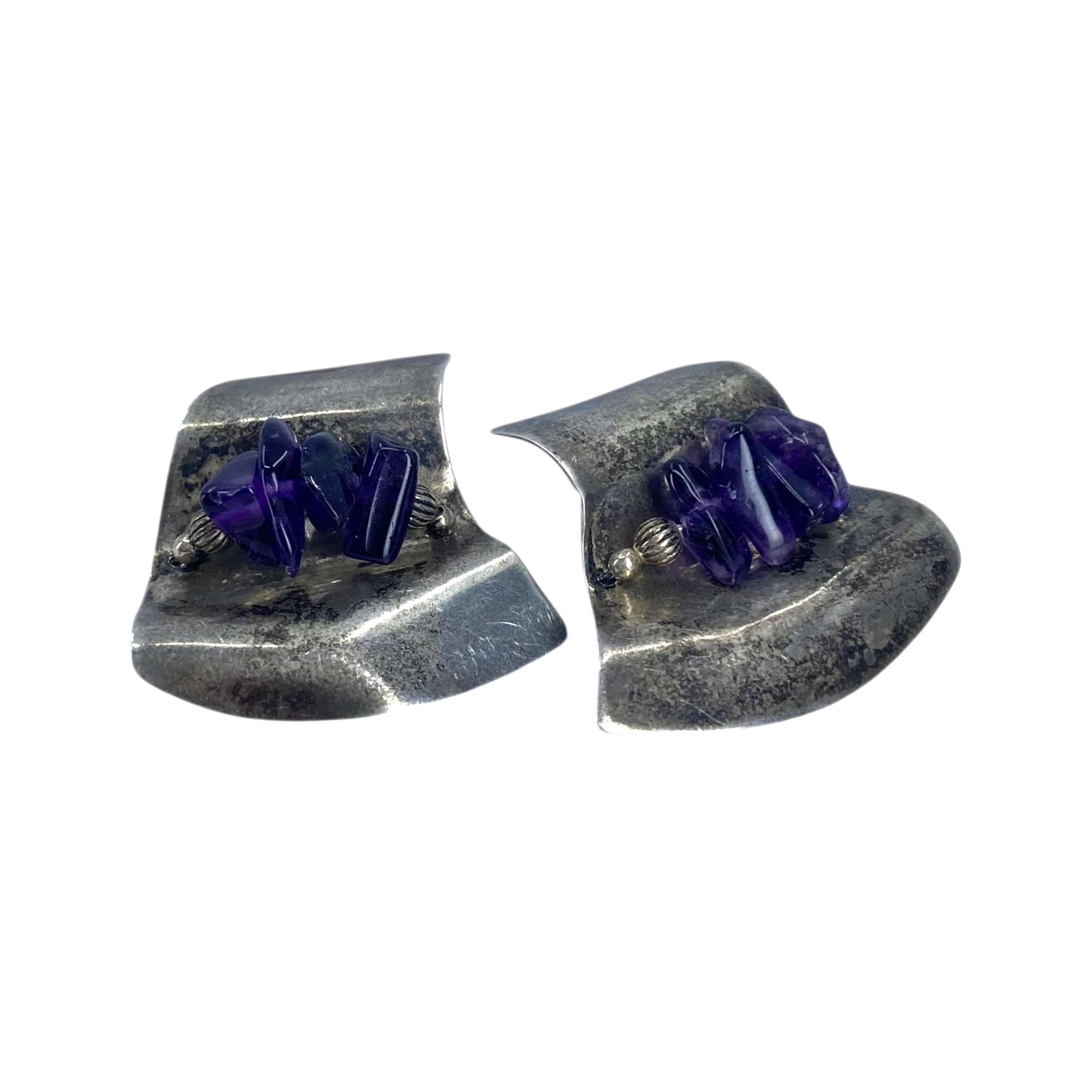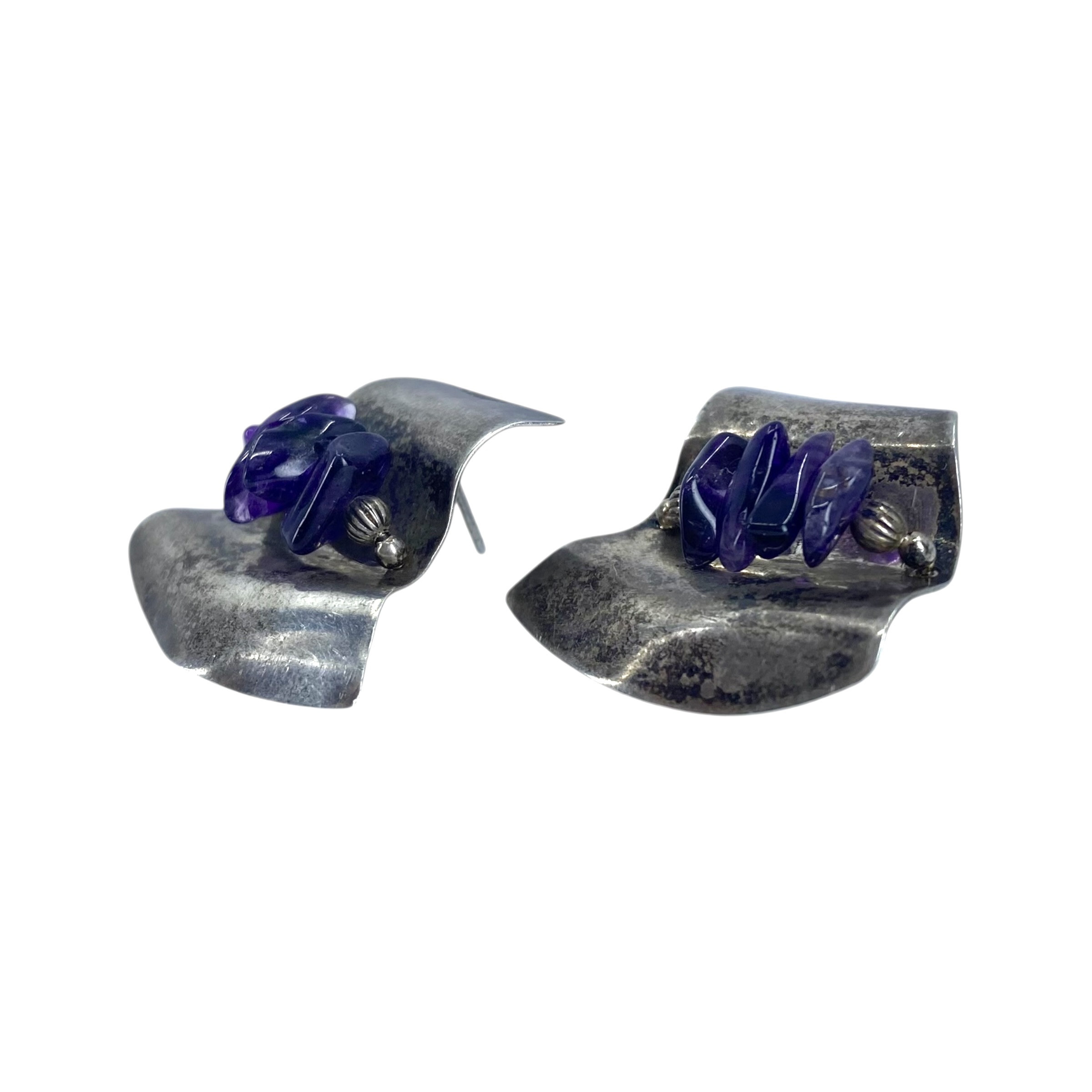 Sterling Raw Amethyst Wavey Plate Earrings 9g Engraved Sterling