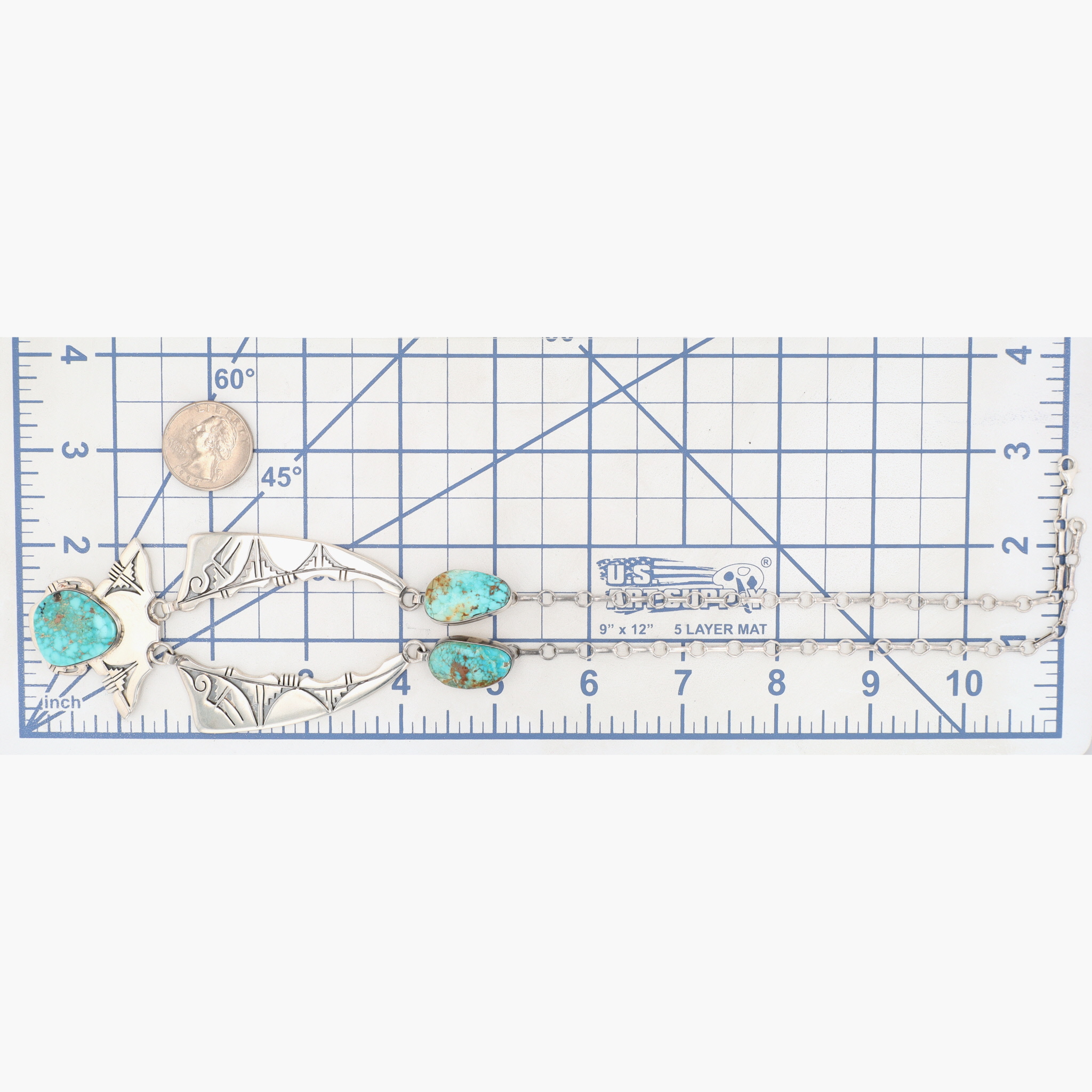 Outstanding, Rare Bennie Ration Navajo Contemporary Sterling and Turquoise Geometric Overlay Station Necklace – 65g – approx. 22.5″ from end to end, adjustable length – amazing turquoise and beautiful design work!