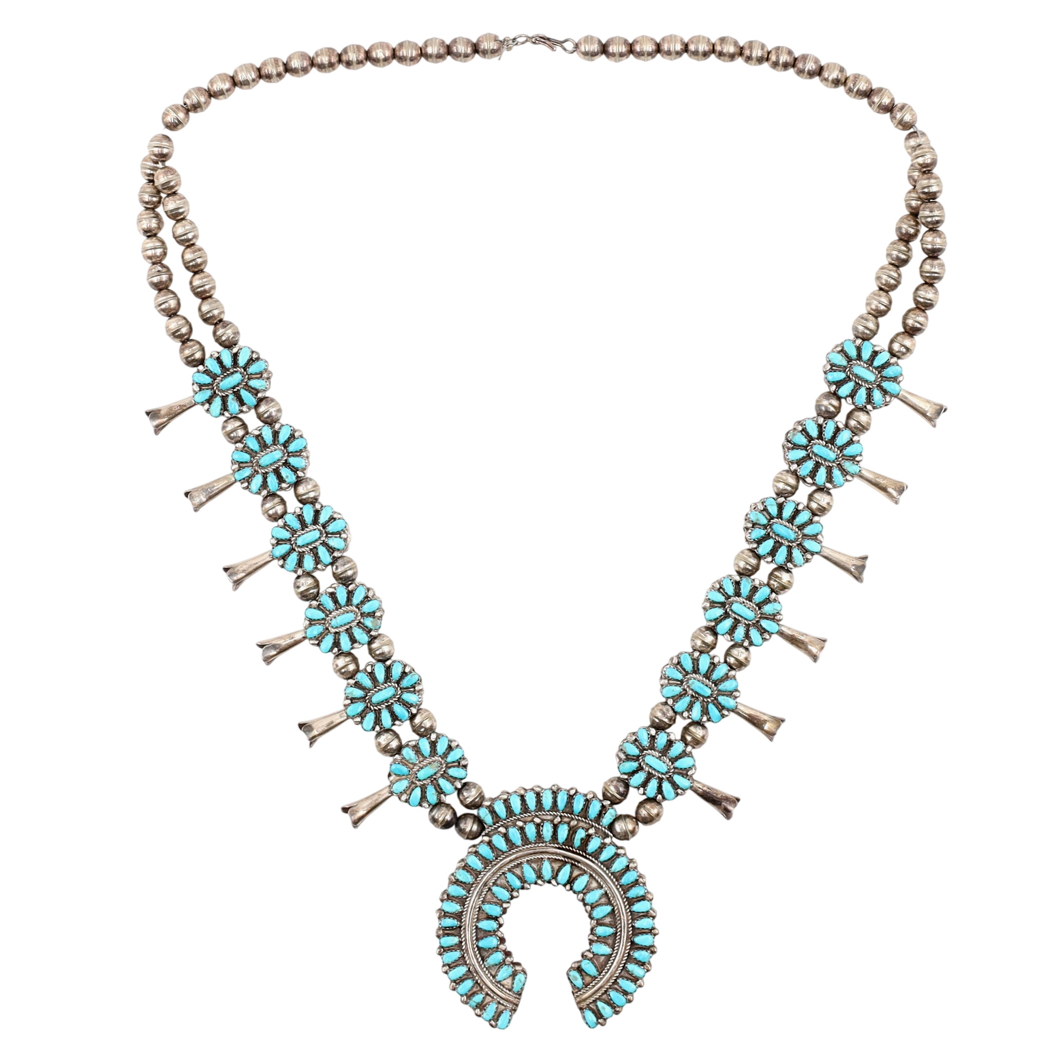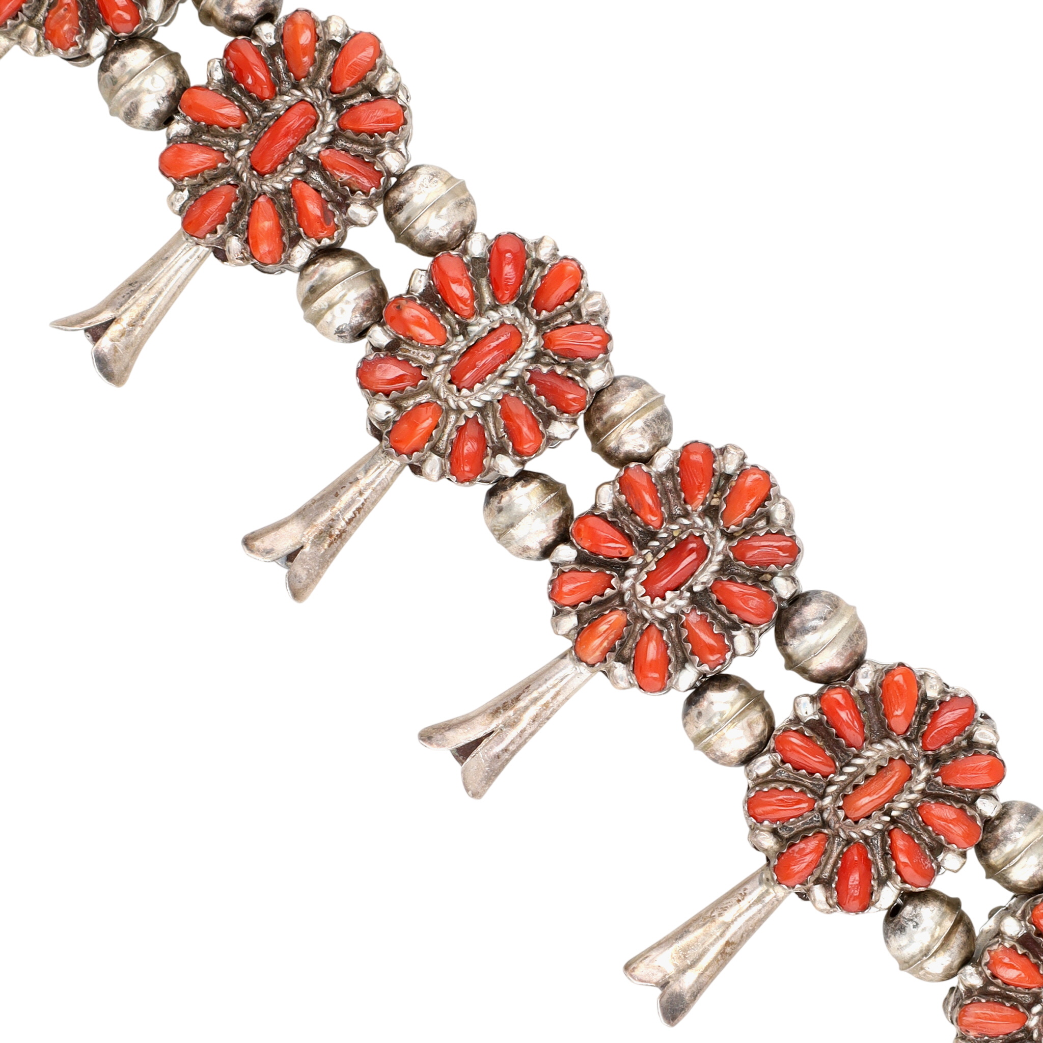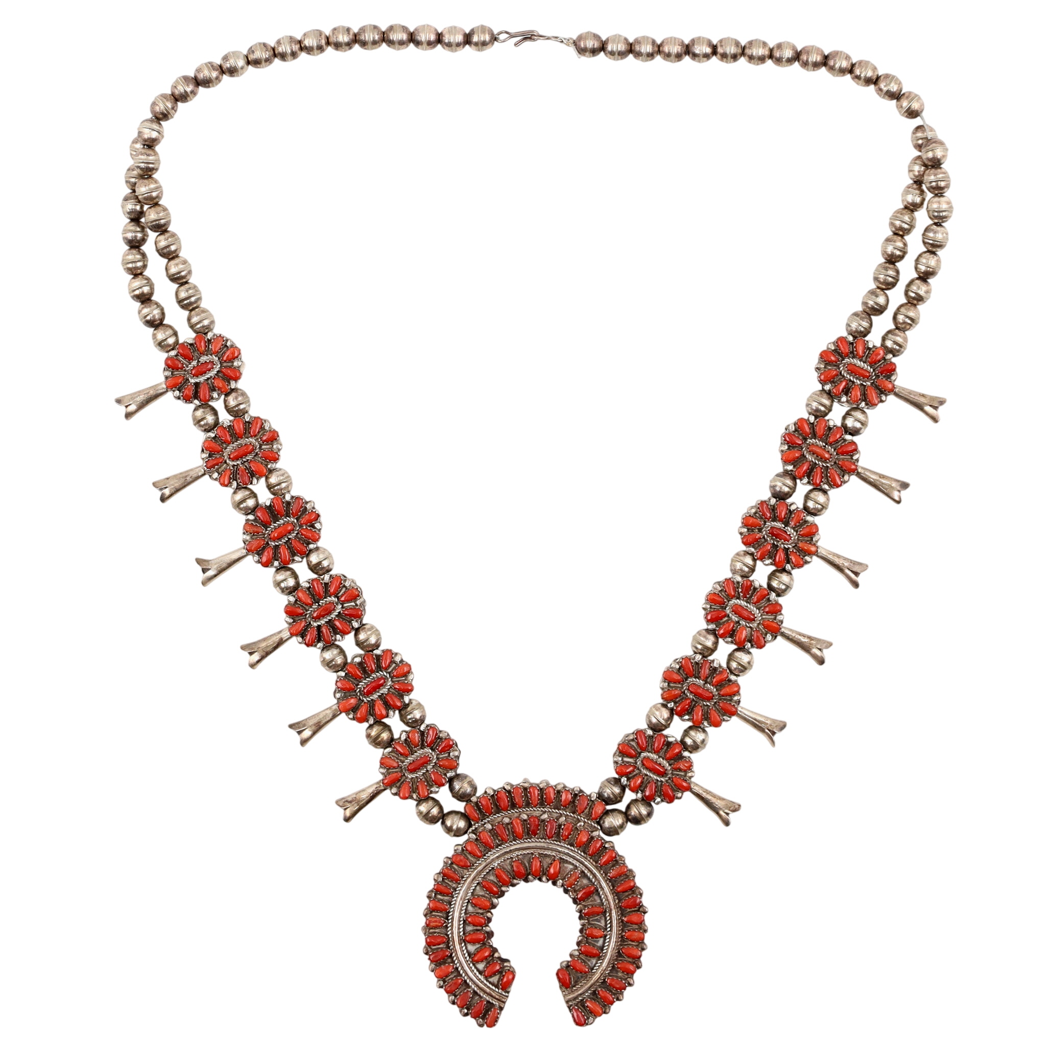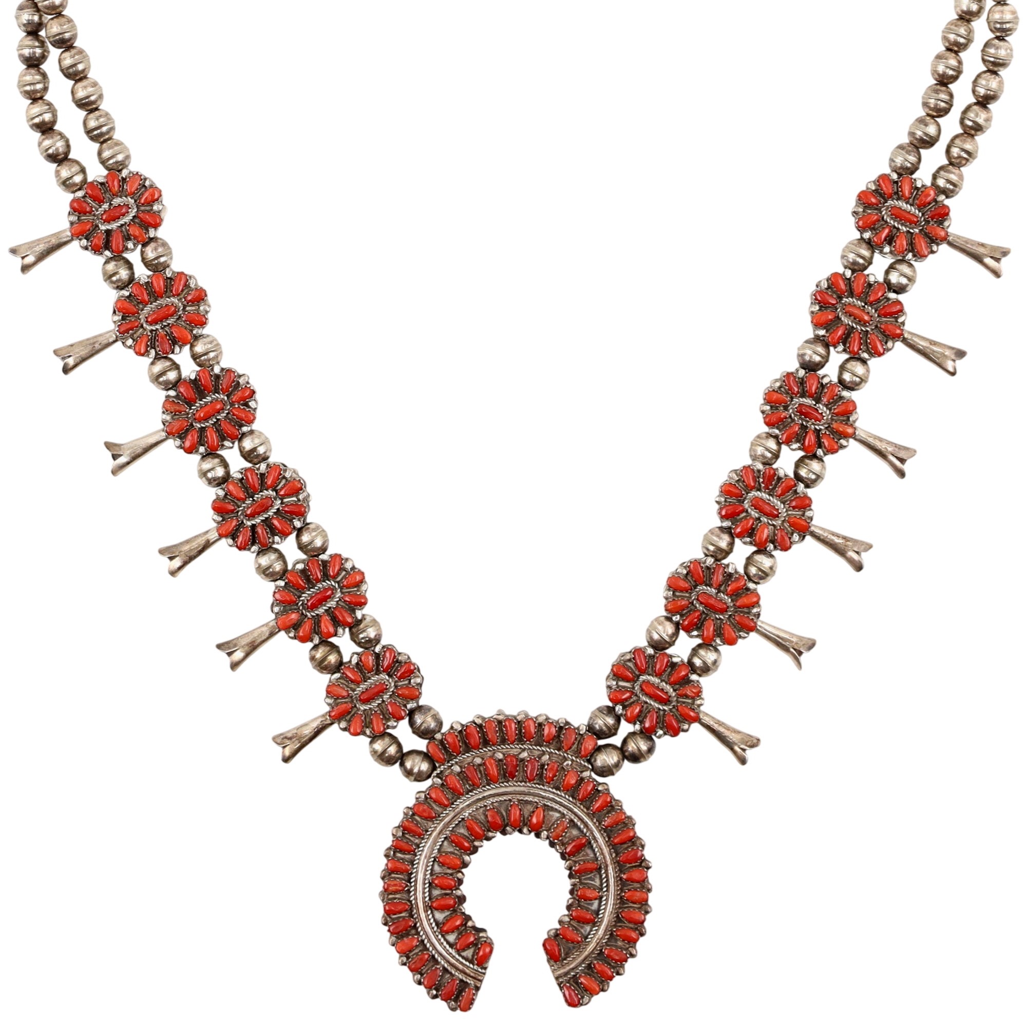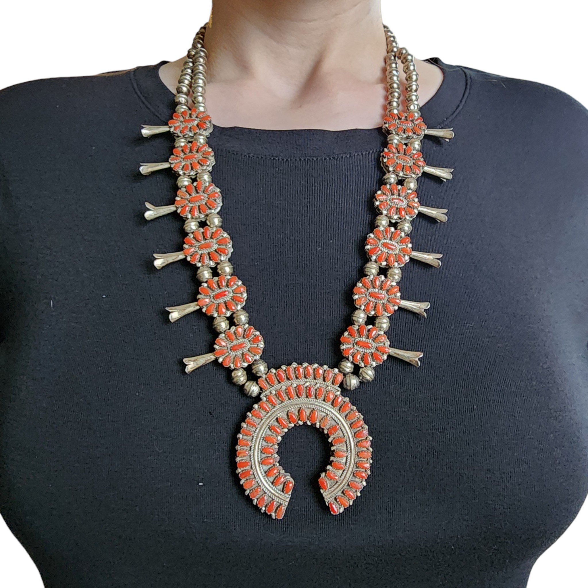 Signed RAF Vintage Navajo Sterling Reversible Turquoise and Coral Squash Blossom Necklace – 143g – approx. 26″ from end to end