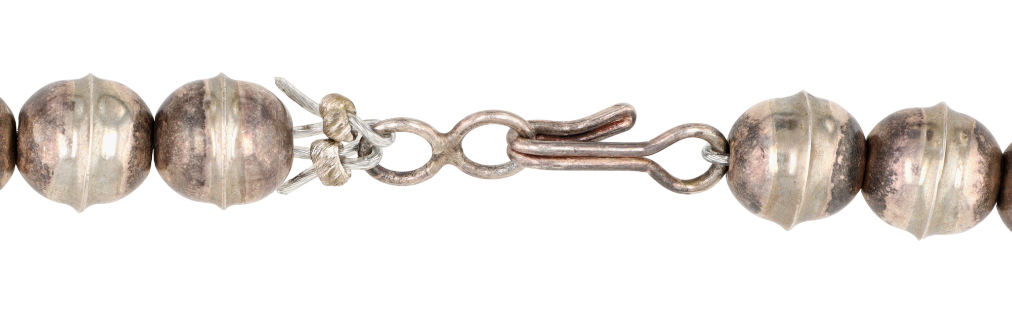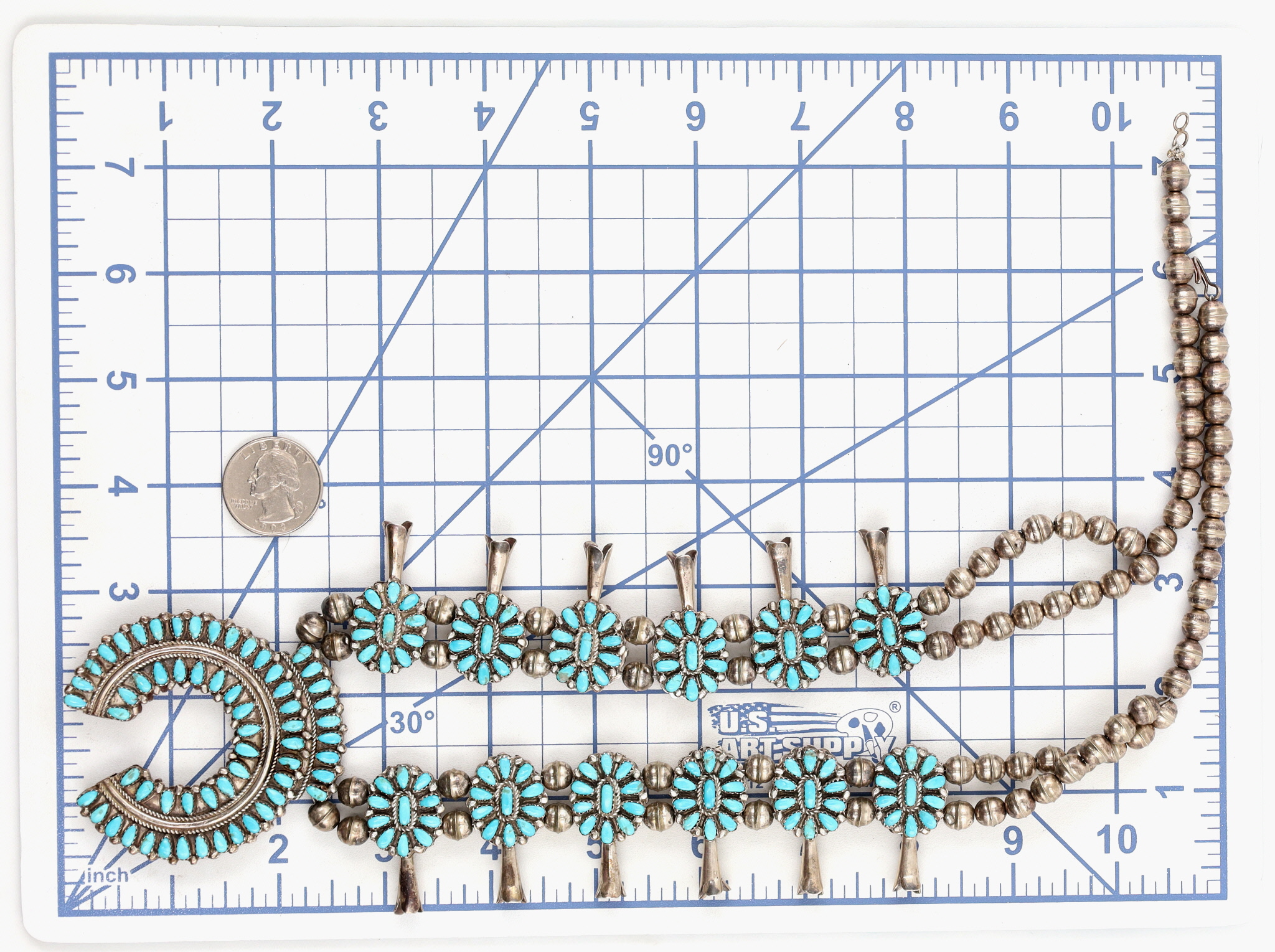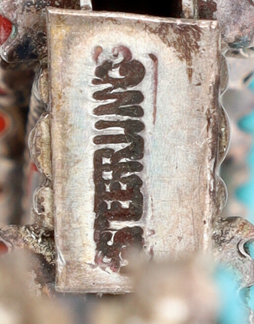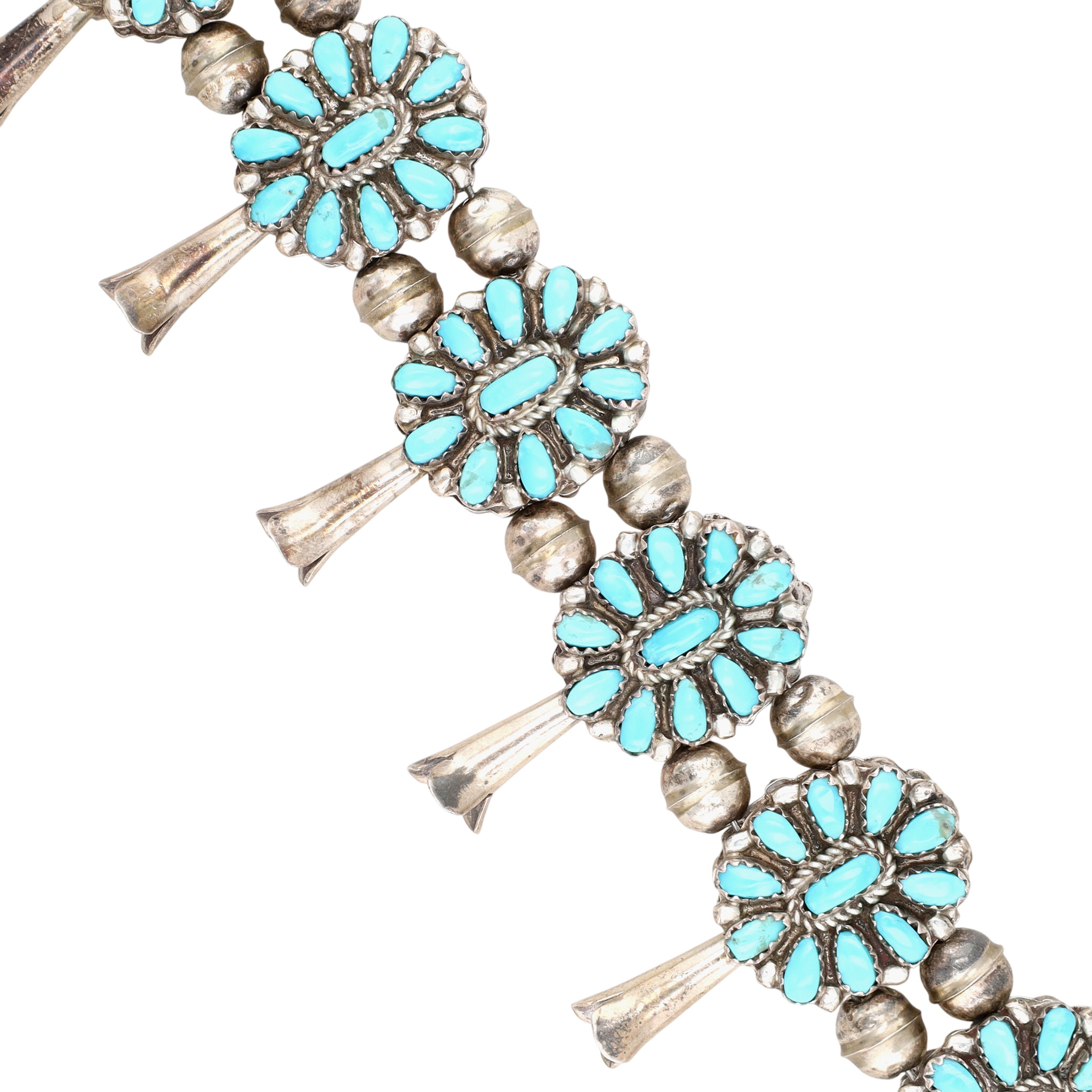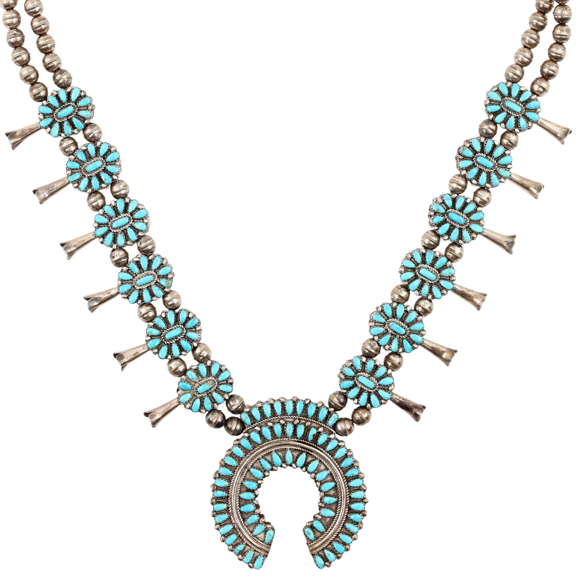 Signed RAF Vintage Navajo Sterling Reversible Turquoise and Coral Squash Blossom Necklace – 143g – approx. 26″ from end to end