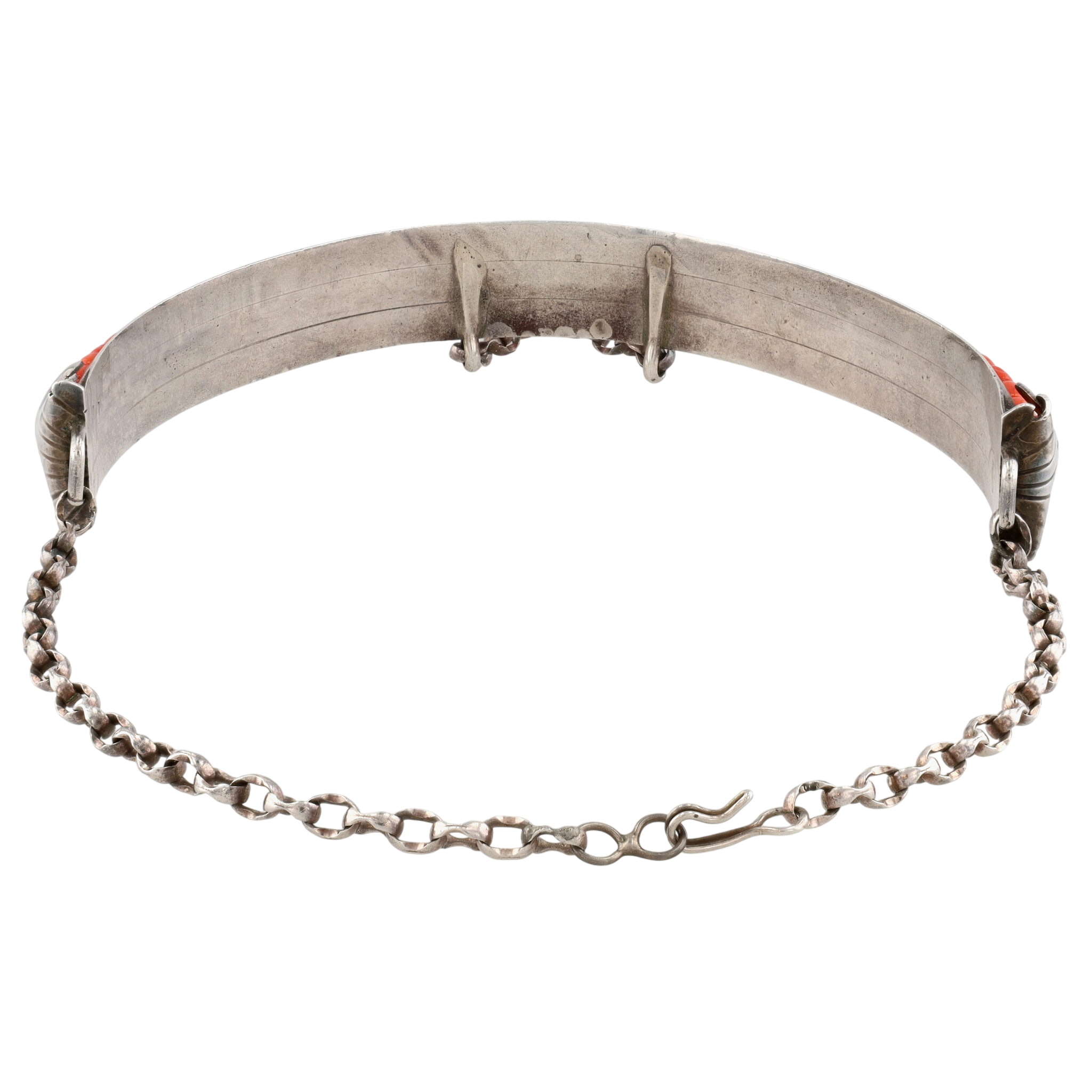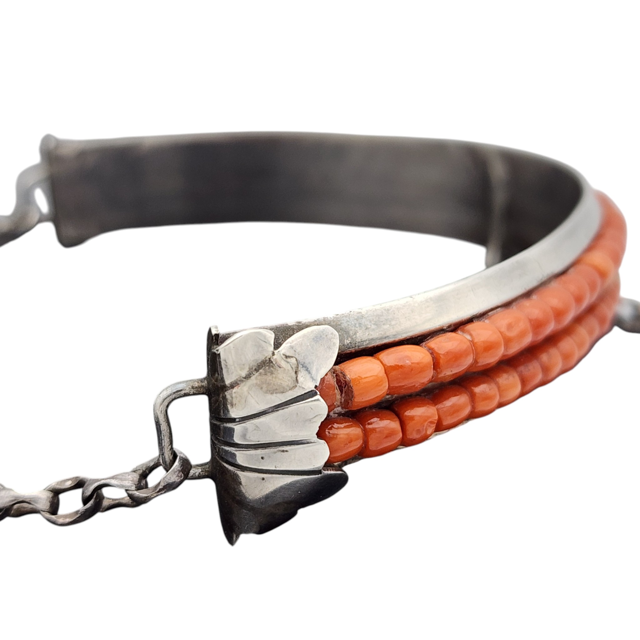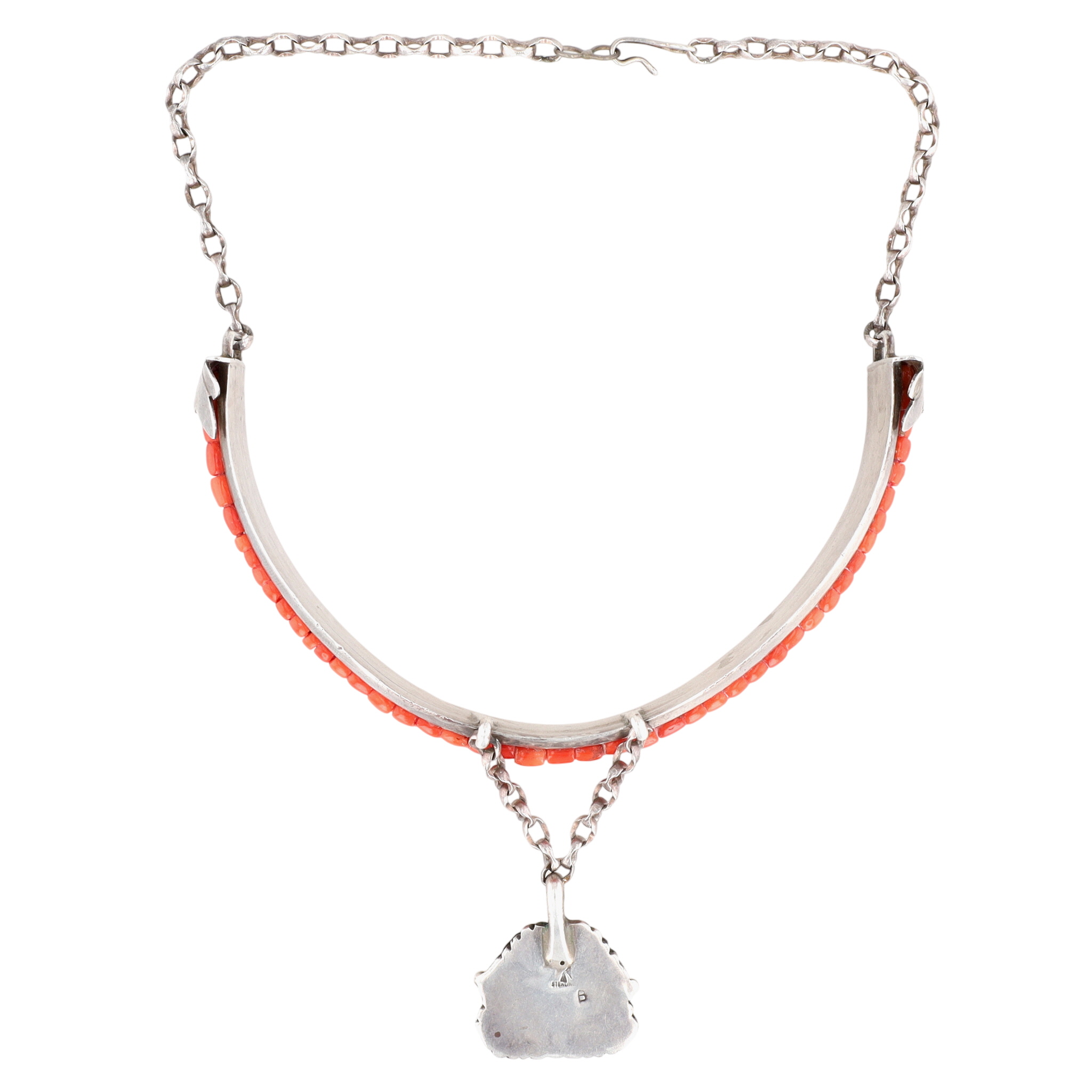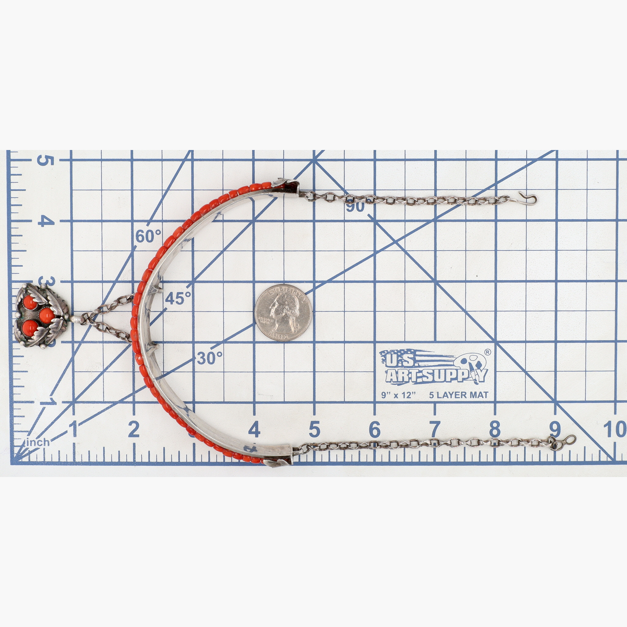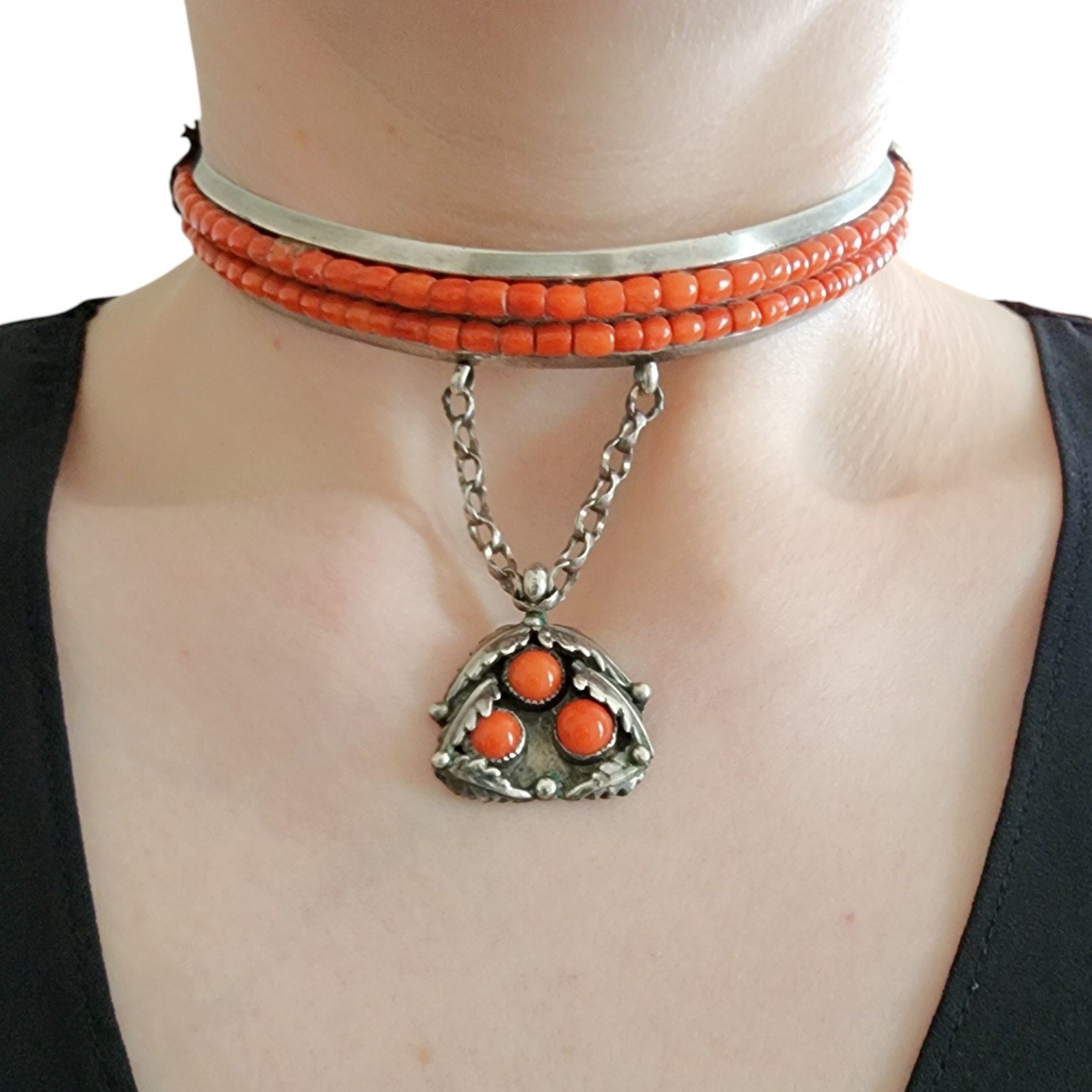 Beautiful, Rare Vintage Signed Navajo Sterling Coral Heishi Collar Necklace – 73g – approx. 4.1″ at widest across (inner measurement) – adjustable length chain
