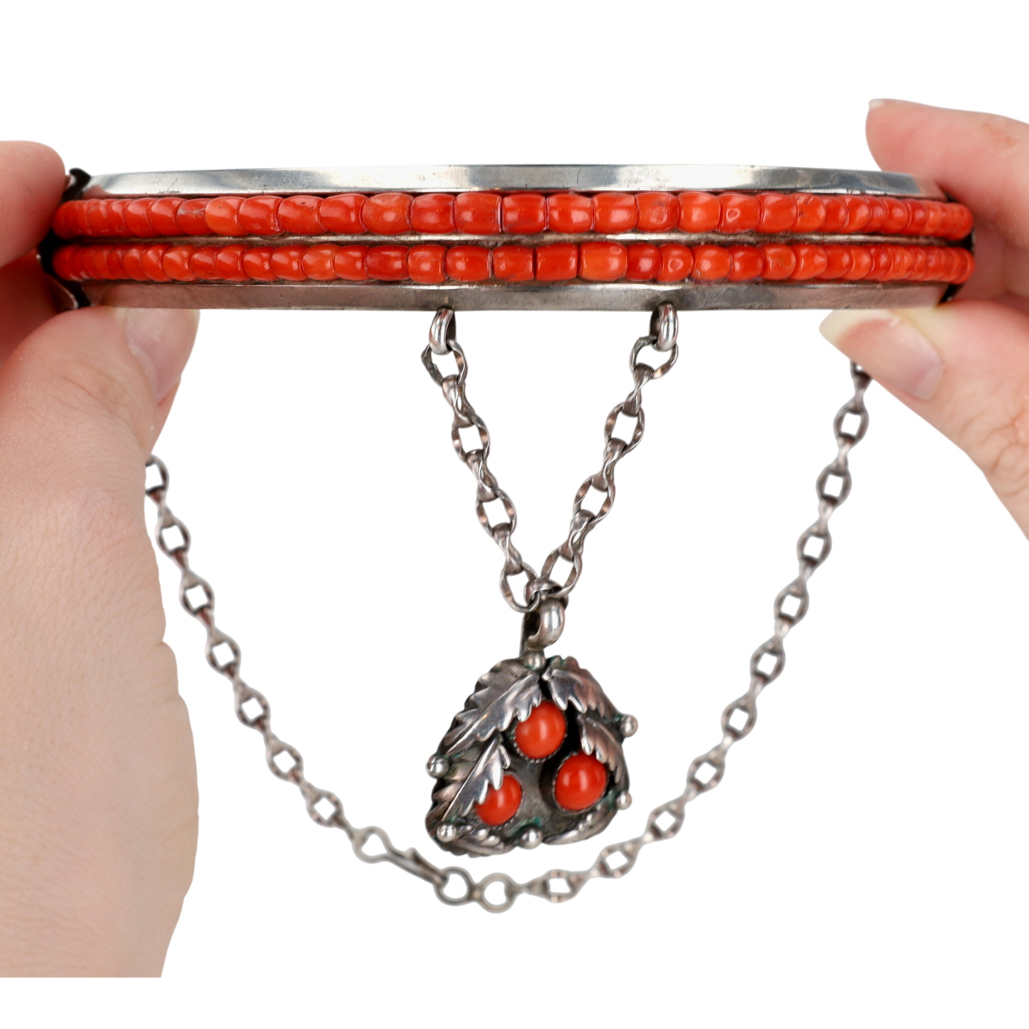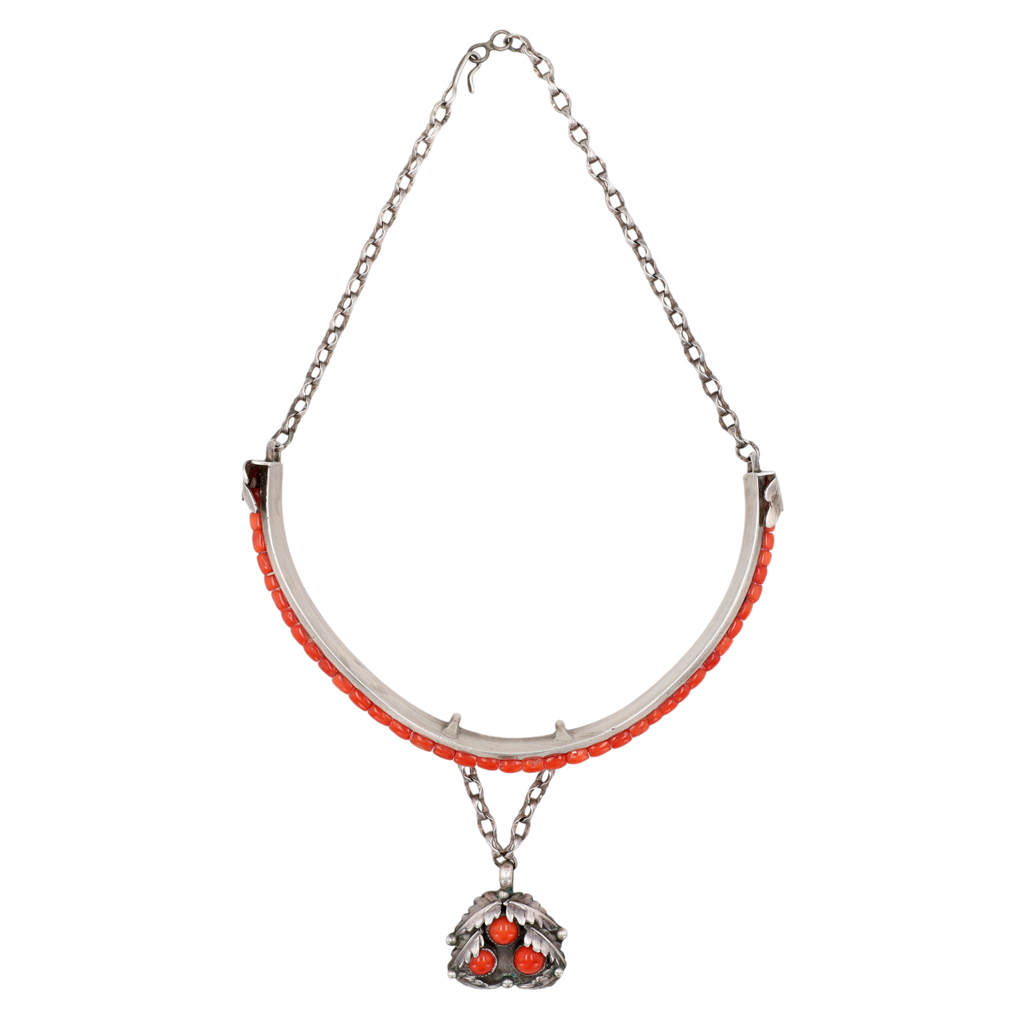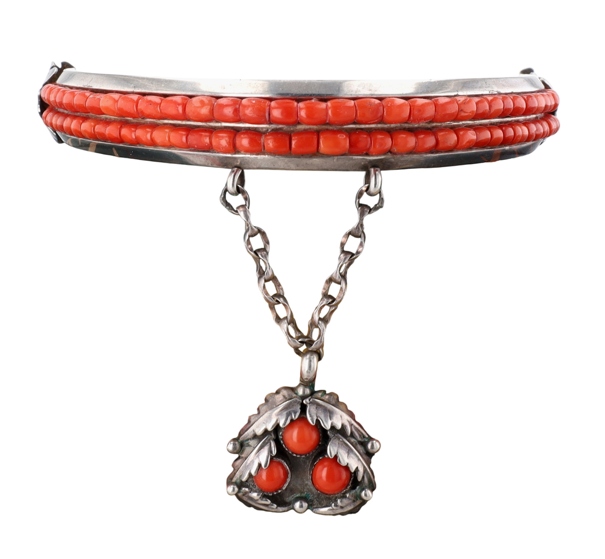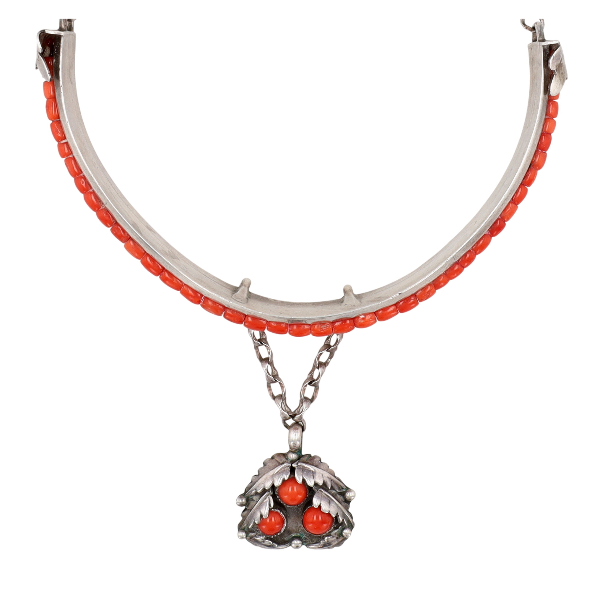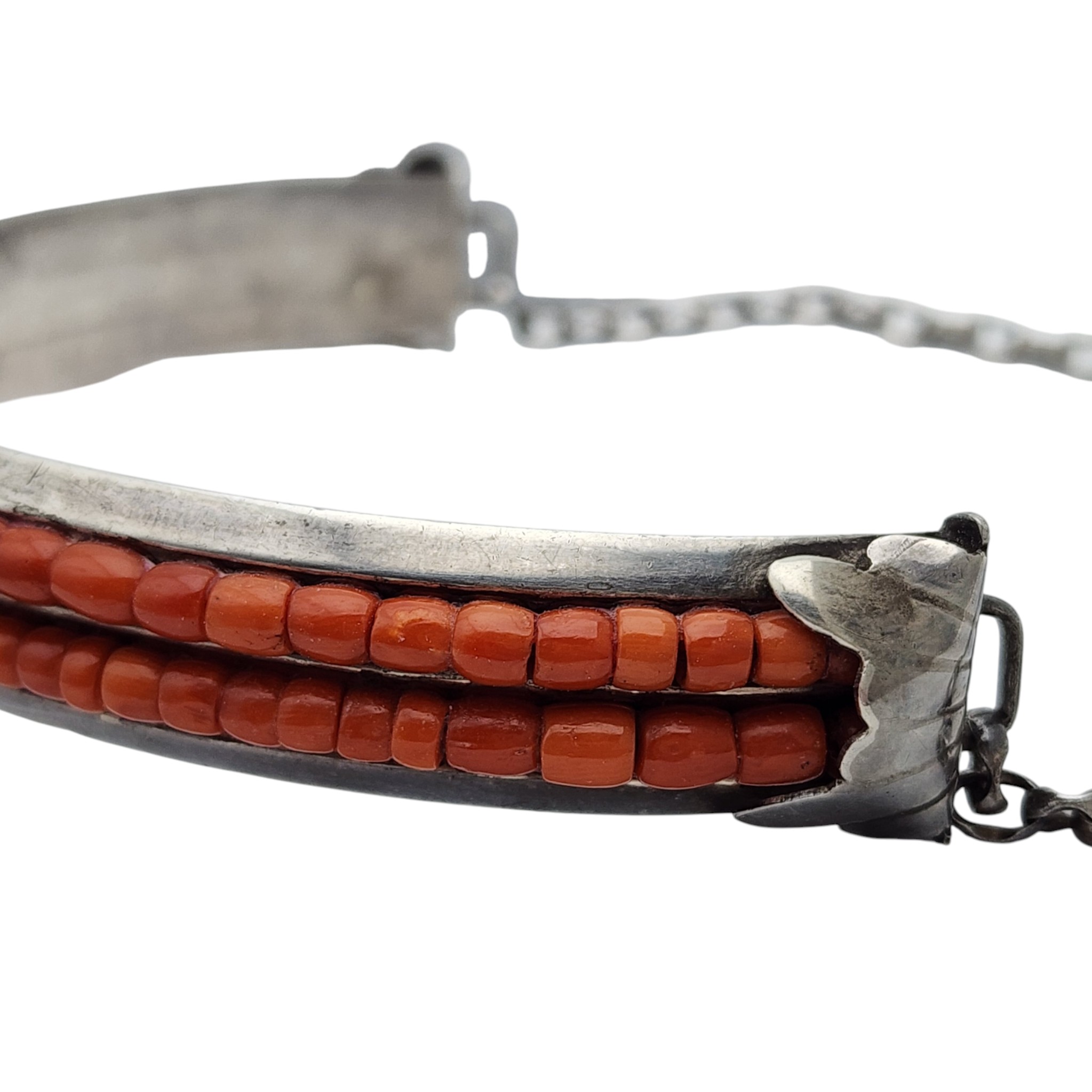 Beautiful, Rare Vintage Signed Navajo Sterling Coral Heishi Collar Necklace – 73g – approx. 4.1″ at widest across (inner measurement) – adjustable length chain