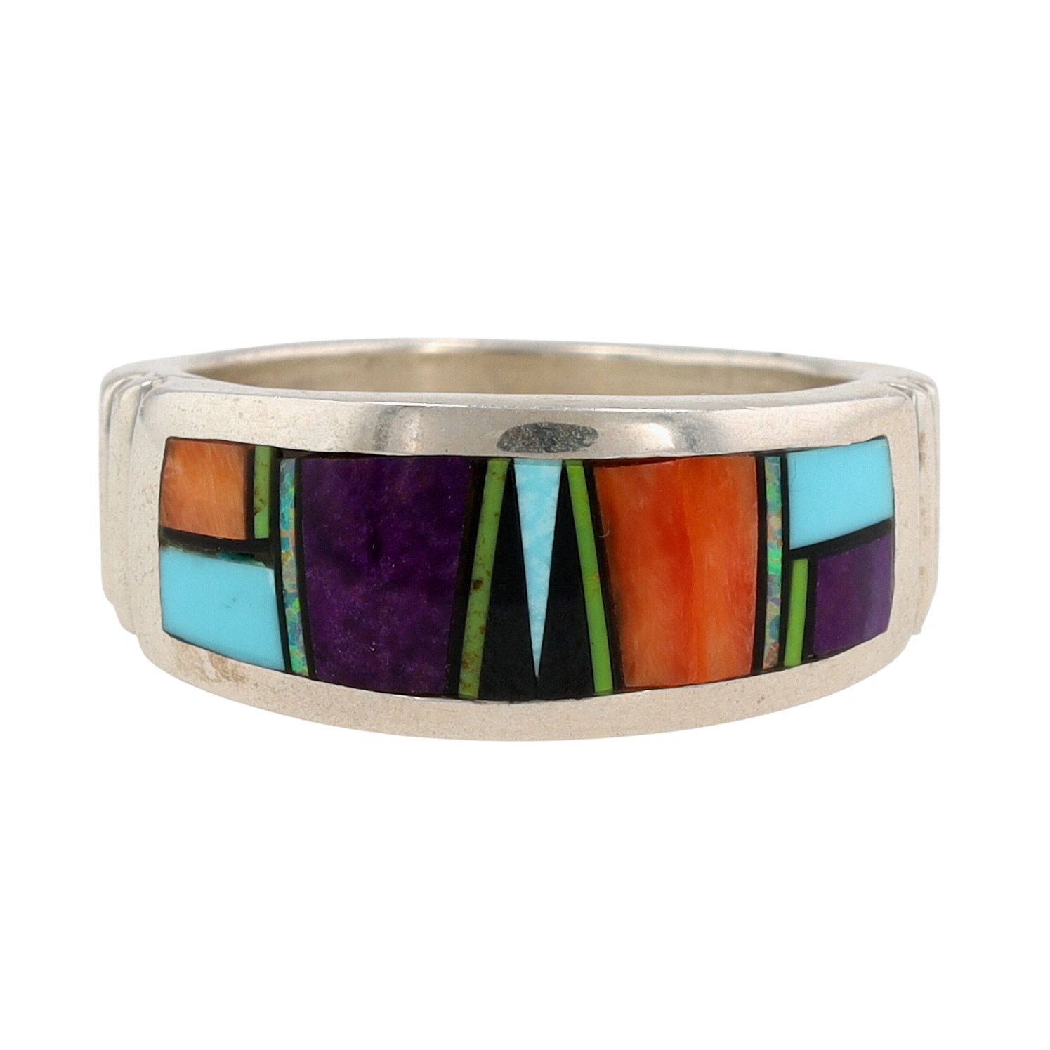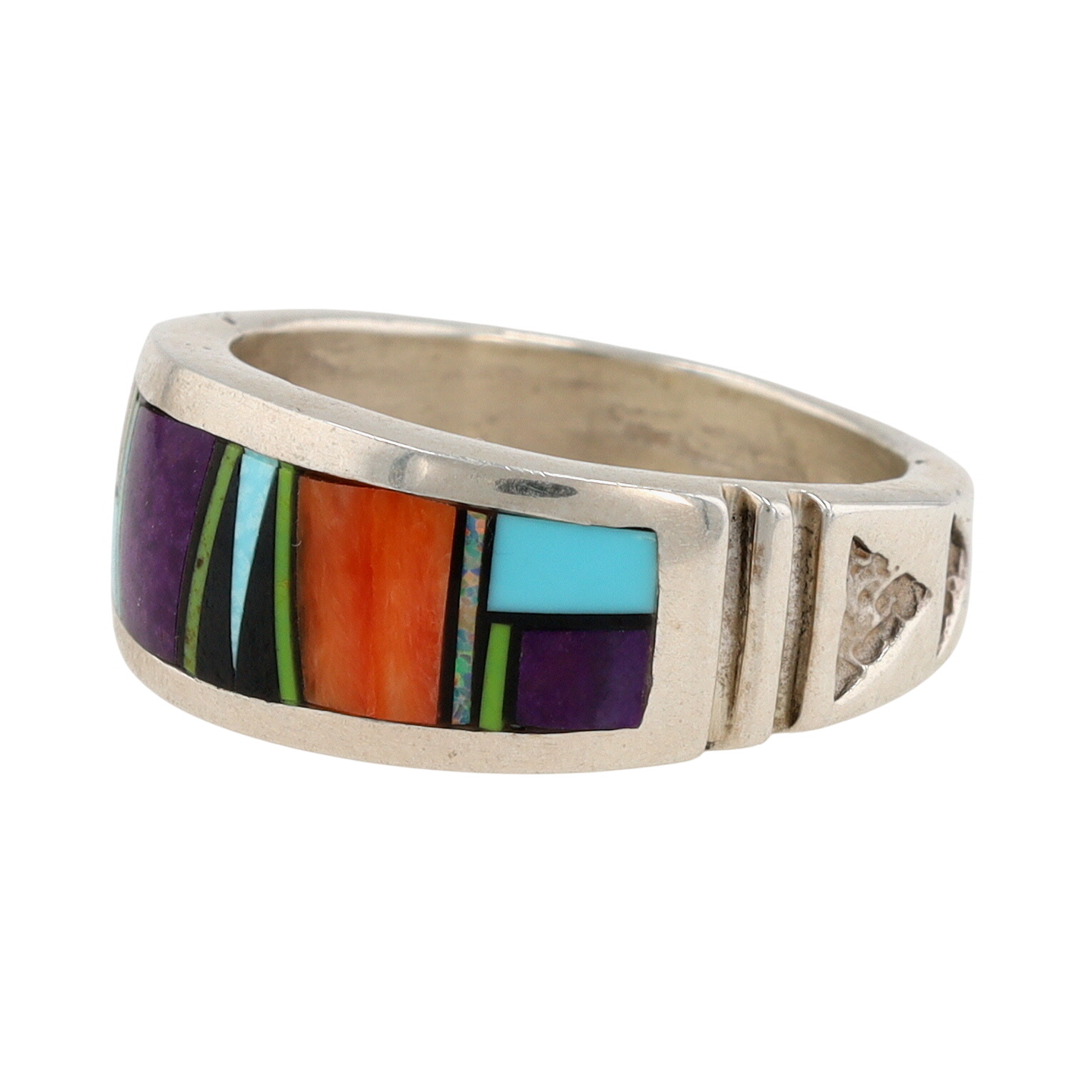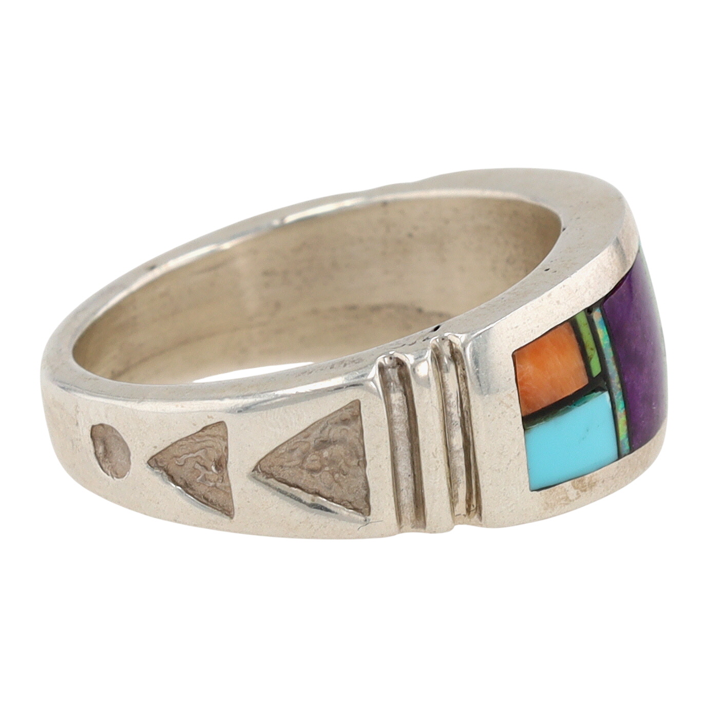 Rick Tolino Navajo Sterling Multistone (Turquoise, Spiny Oyster, Opal, Sugilite, Jet, Gaspeite) Inlay Ring Sz 9.5 – 9.3g