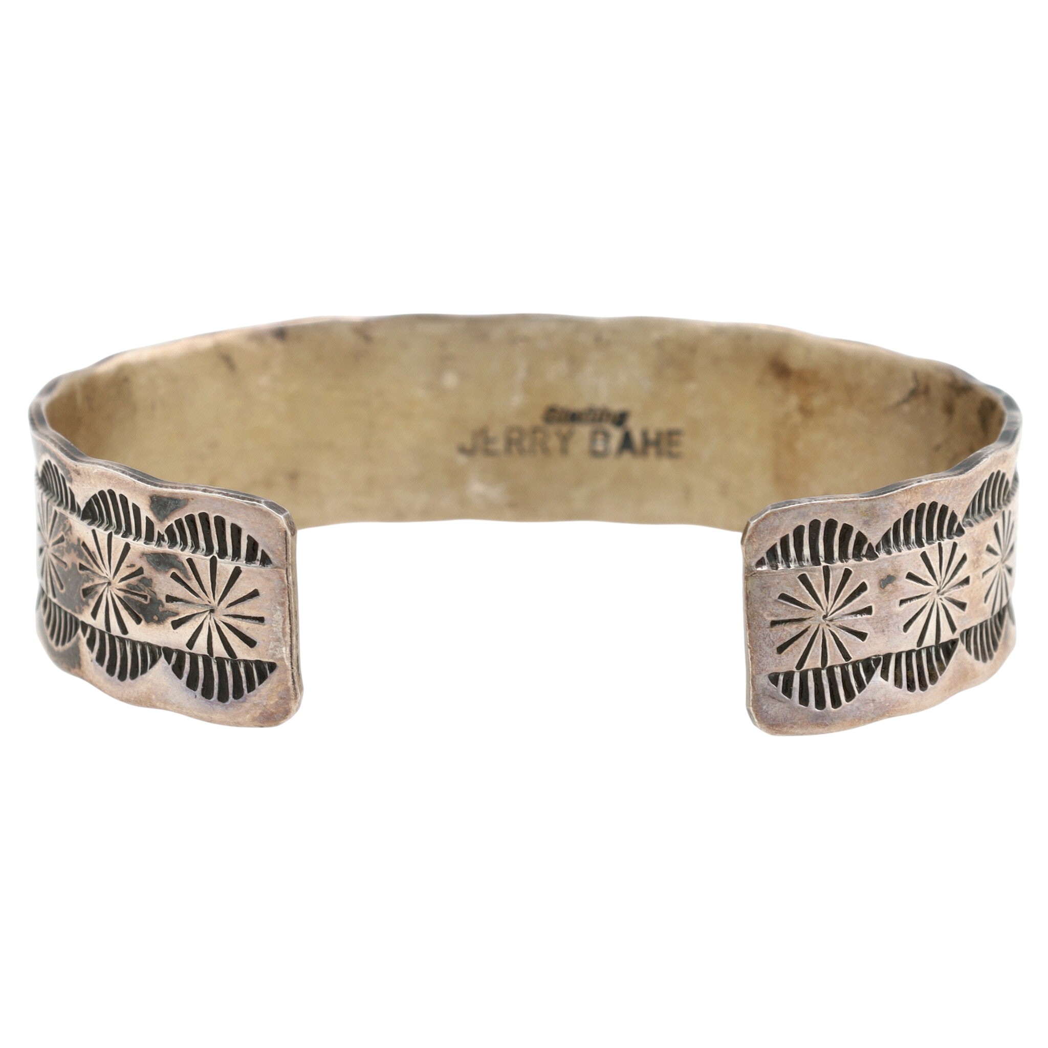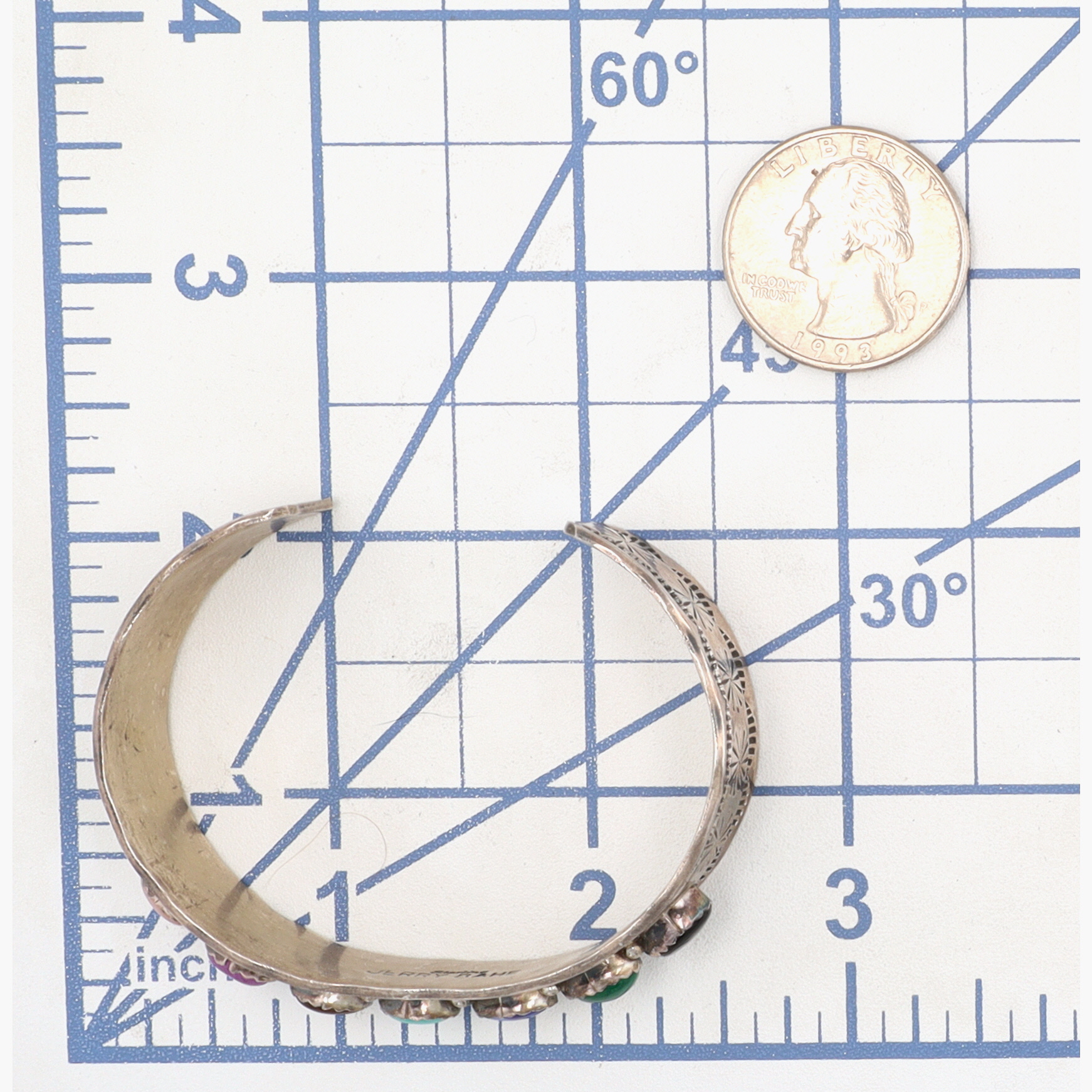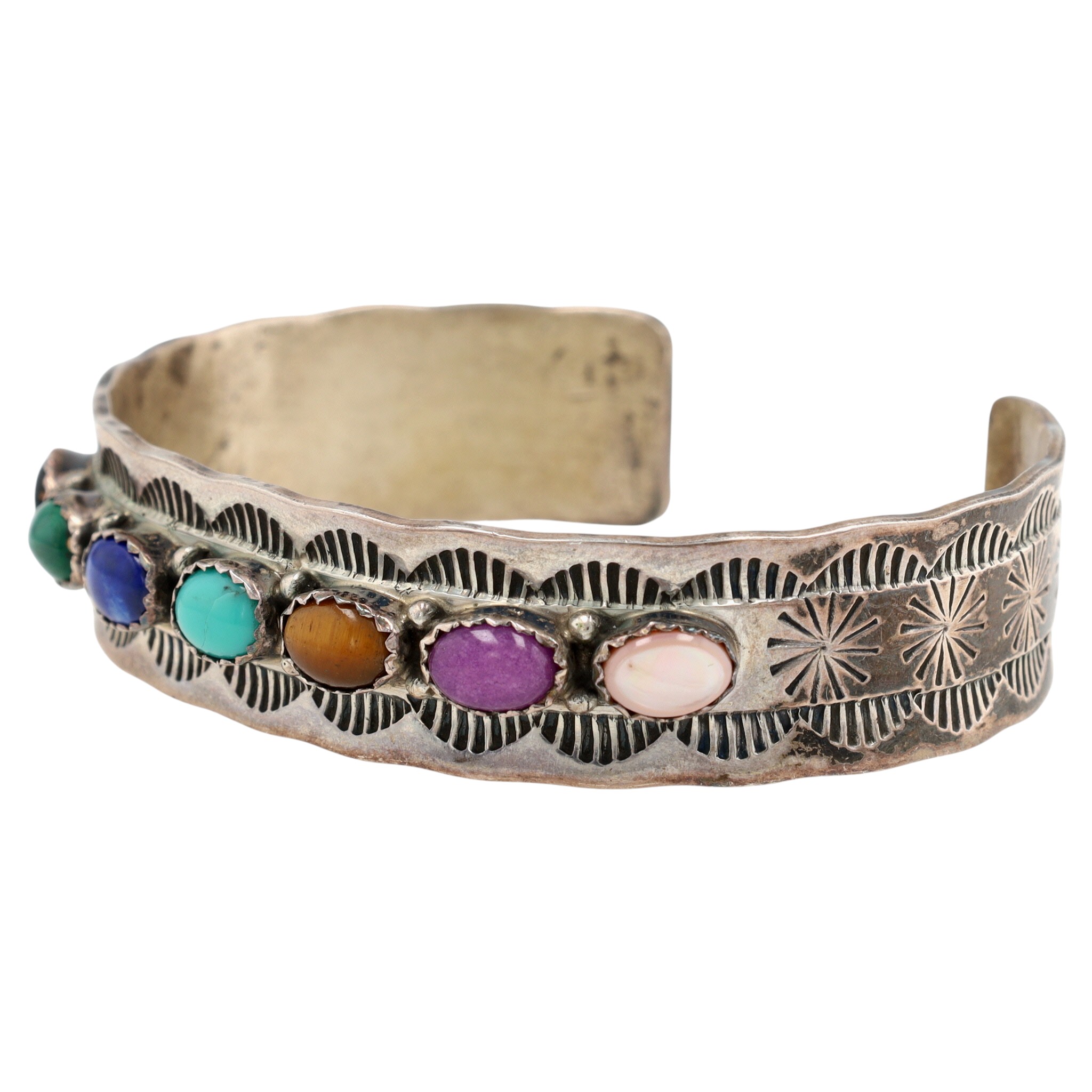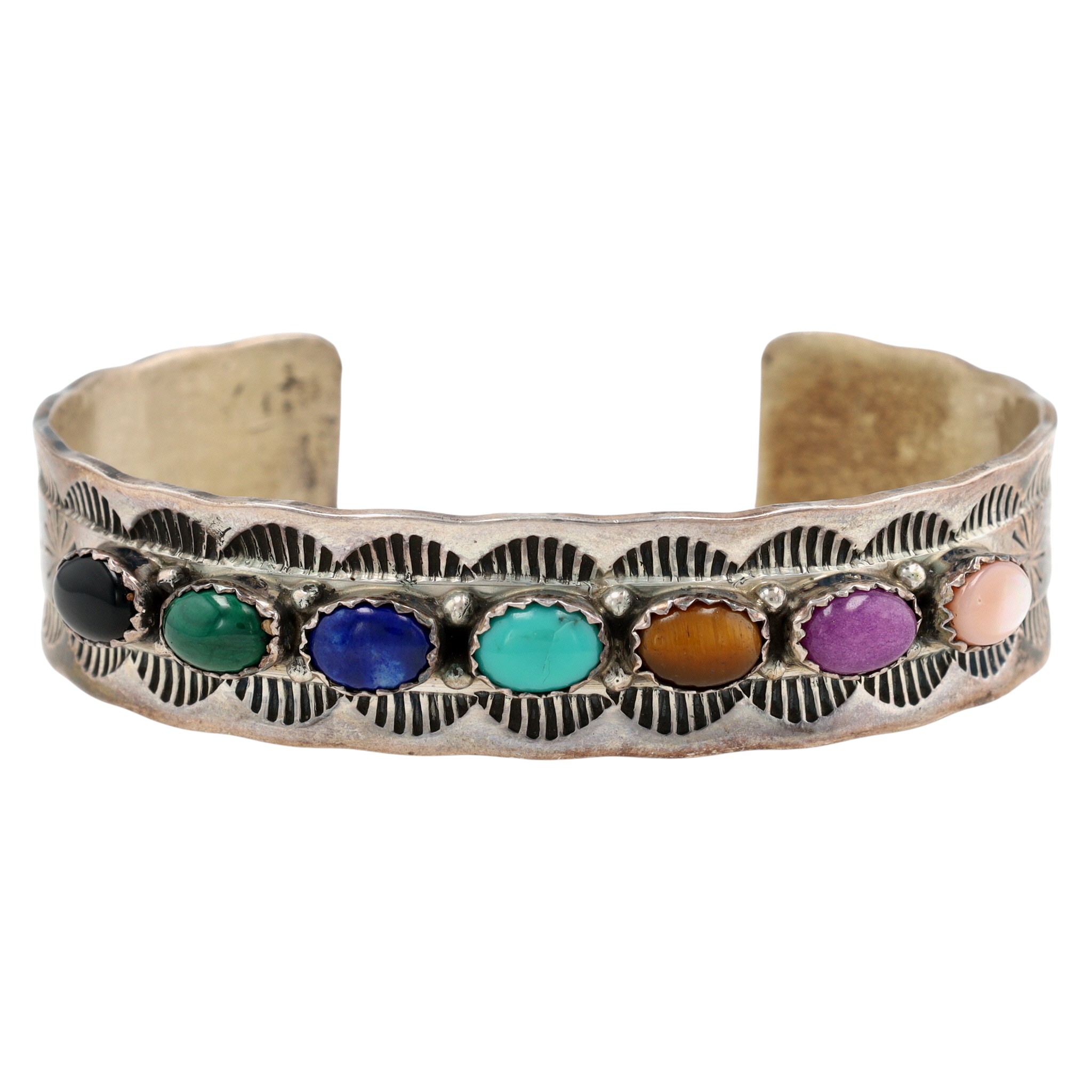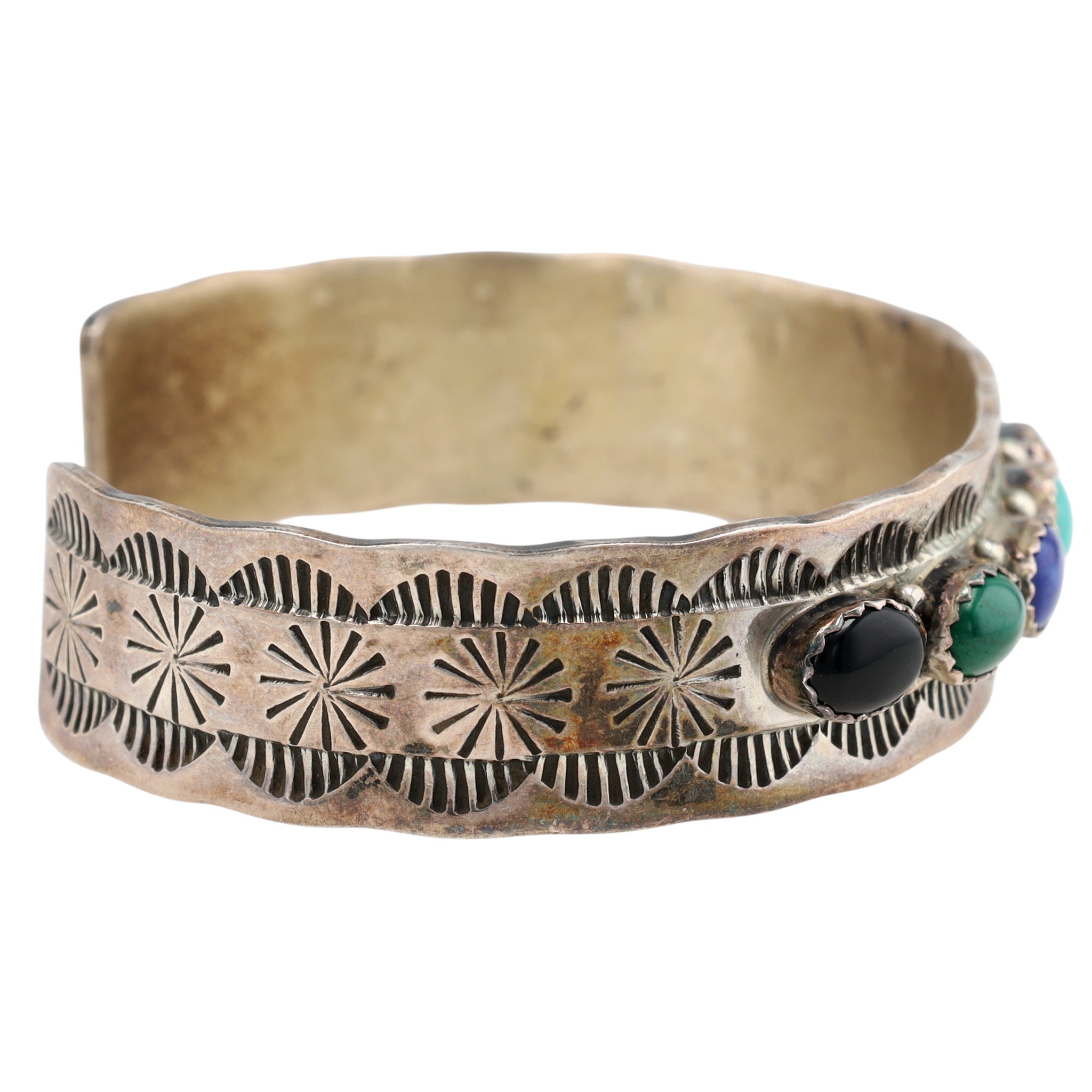 Jerry Bahe Navajo Sterling Multistone (Turquoise, Amethyst, Lapis Lazuli, Tigers Eye, Mother of Pearl, Malachite, Onyx) Stamped Cuff Bracelet – 26g