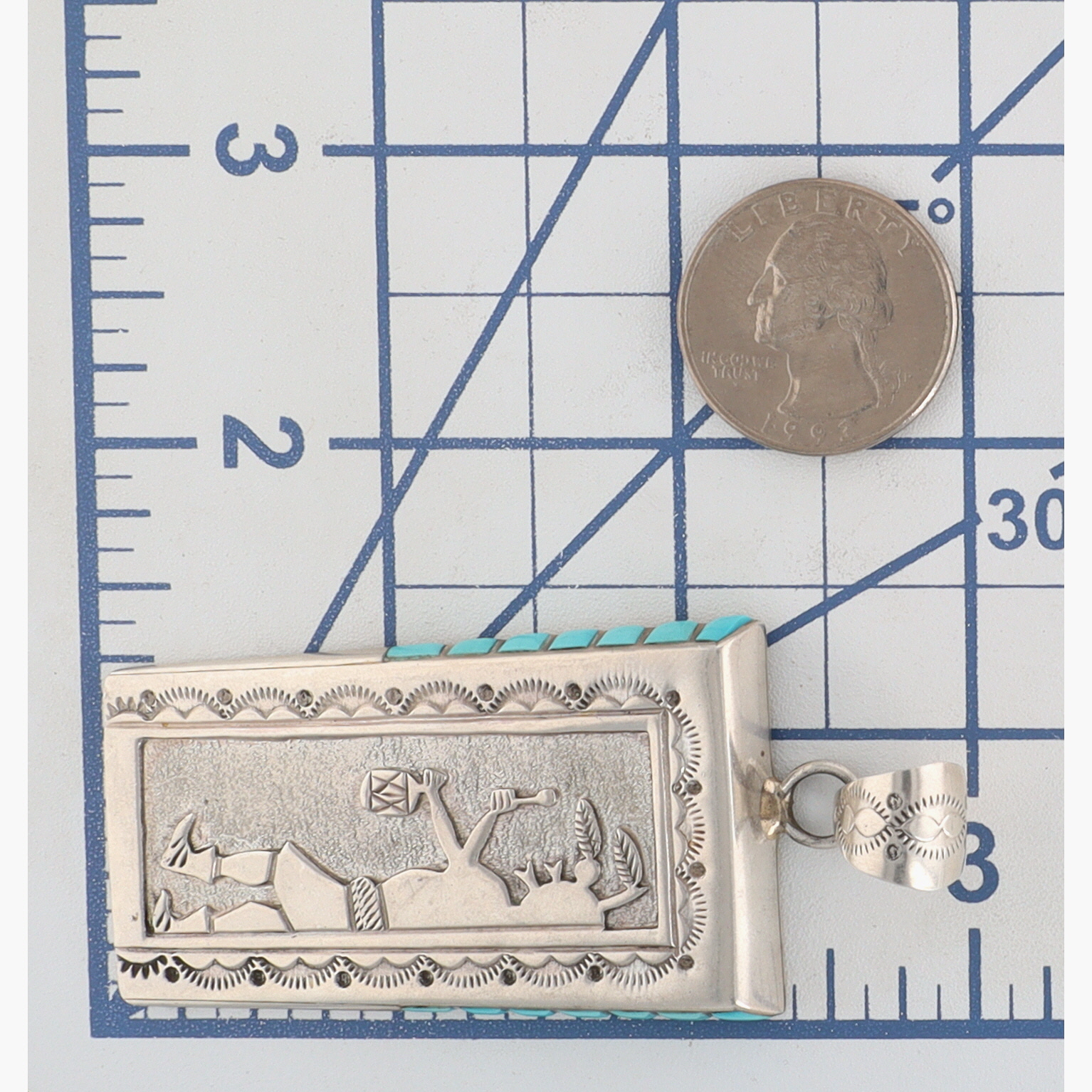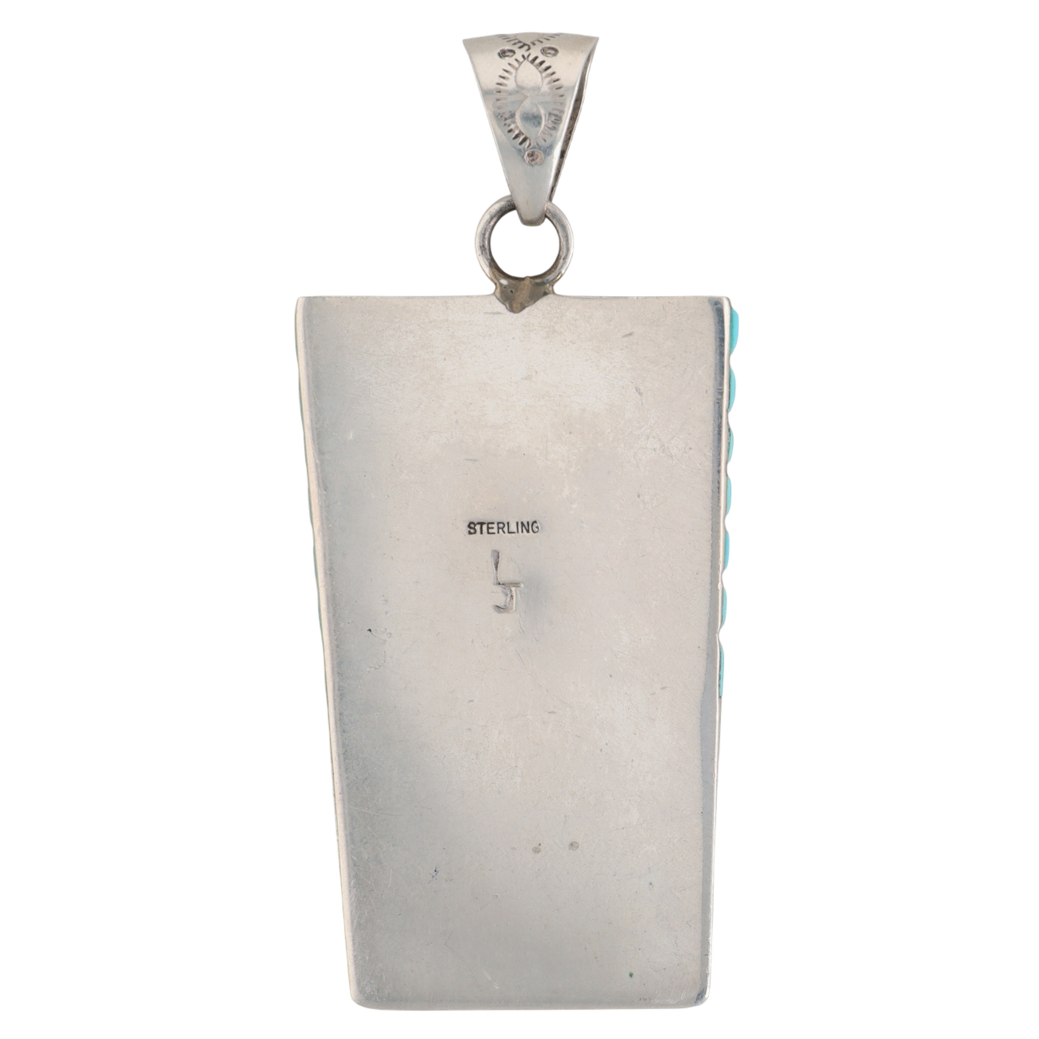 Leonard Jim Navajo Sterling and Turquoise Mudhead Stamped Pendant – 27.6g – approx 3.15″ tall x 1.4″ wide!