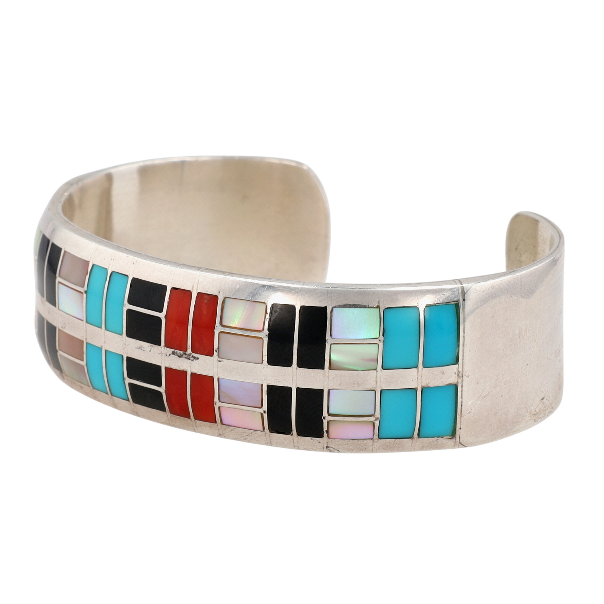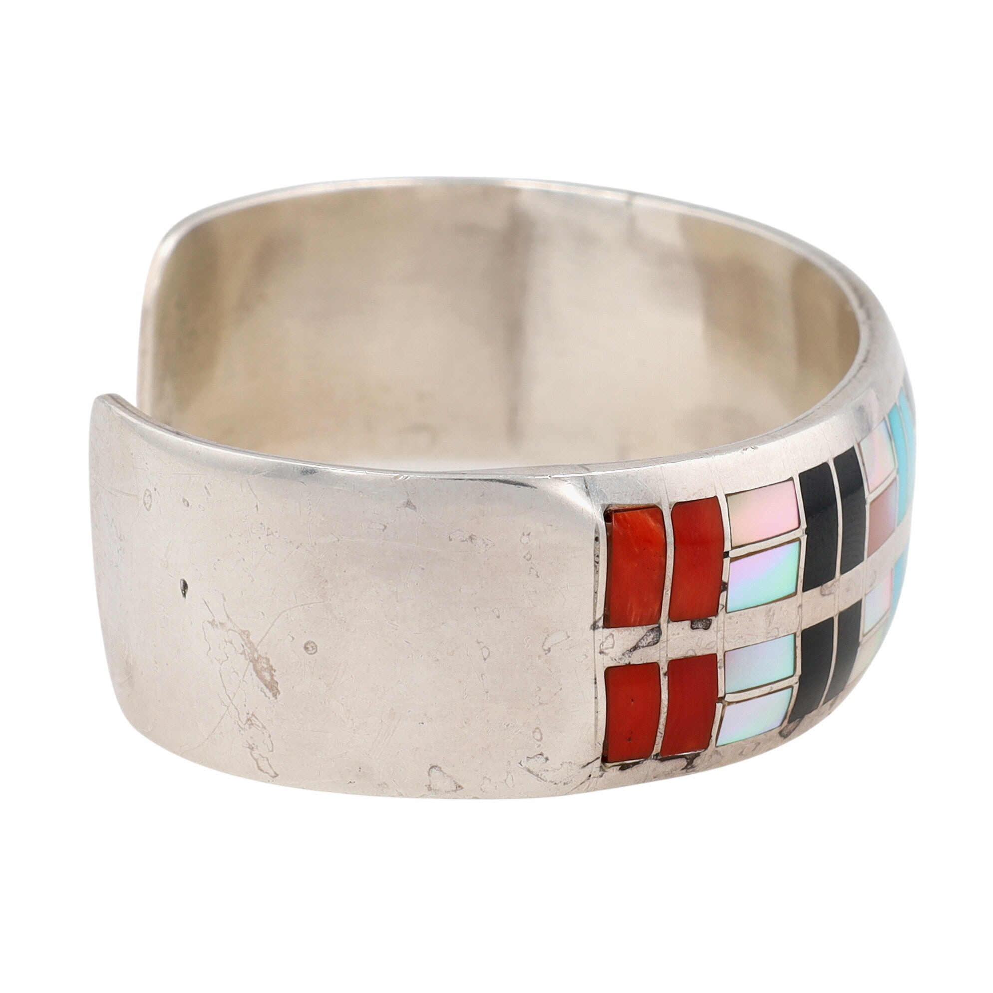 Vintage Ted Tsadiase Zuni Sterling Multistone (Turquoise, Coral, Jet, Mother of Pearl) Channel Inlay Cuff Bracelet – 40.2g