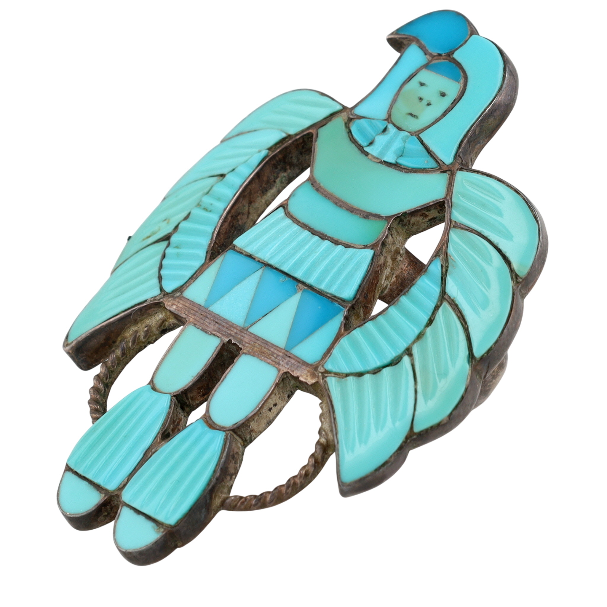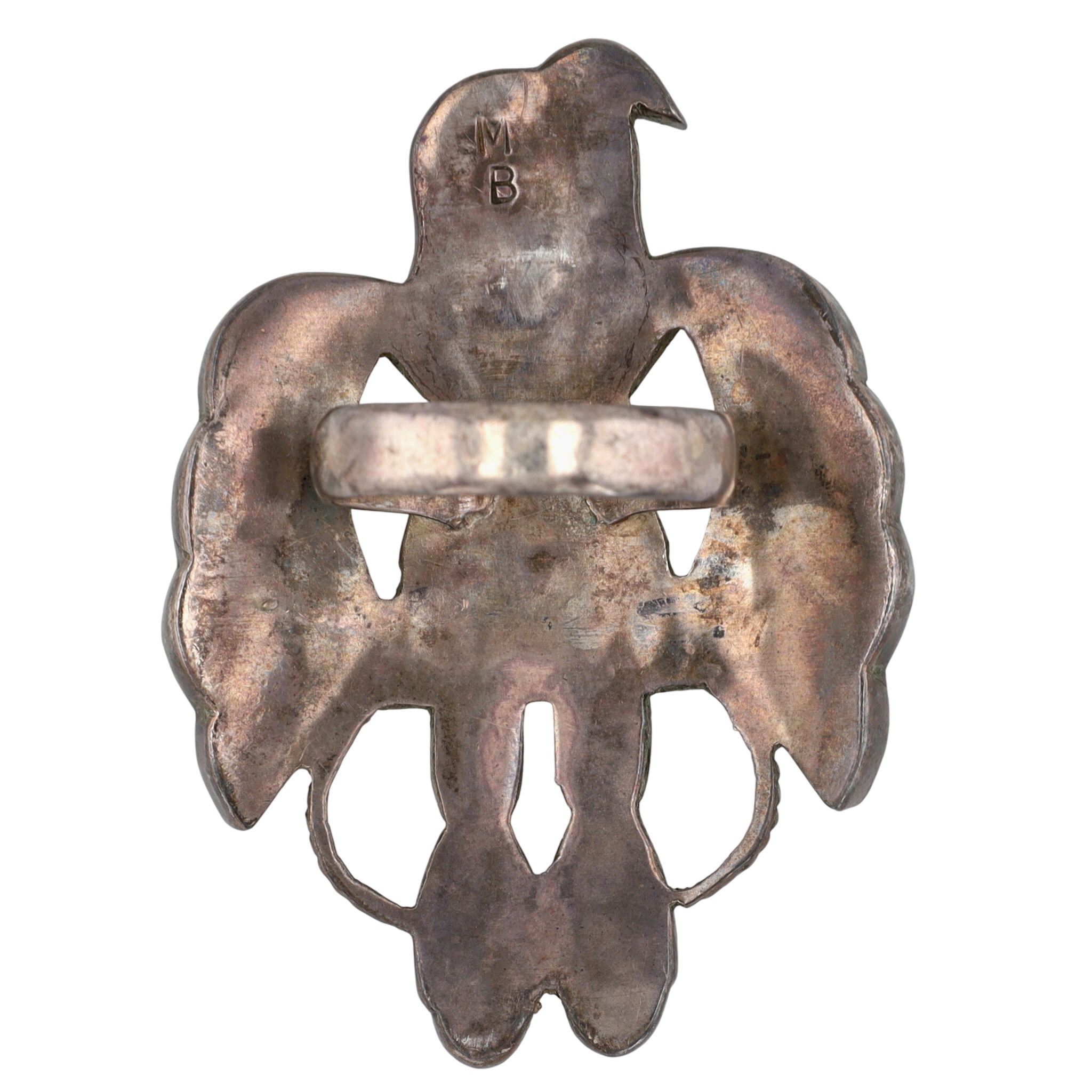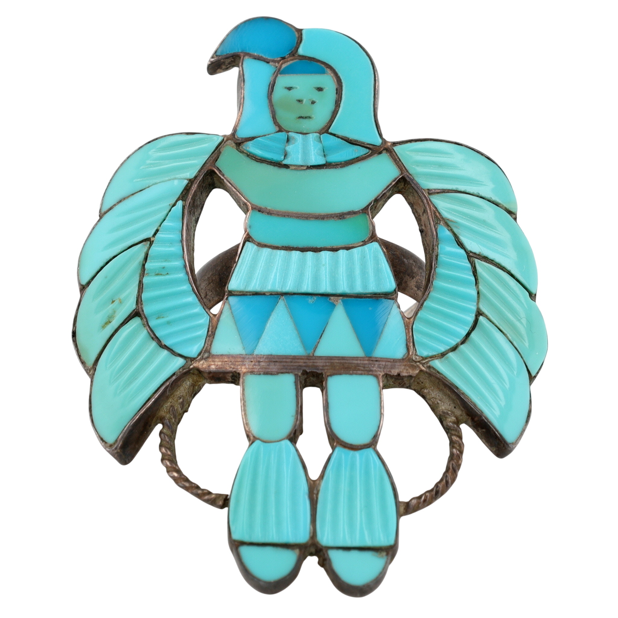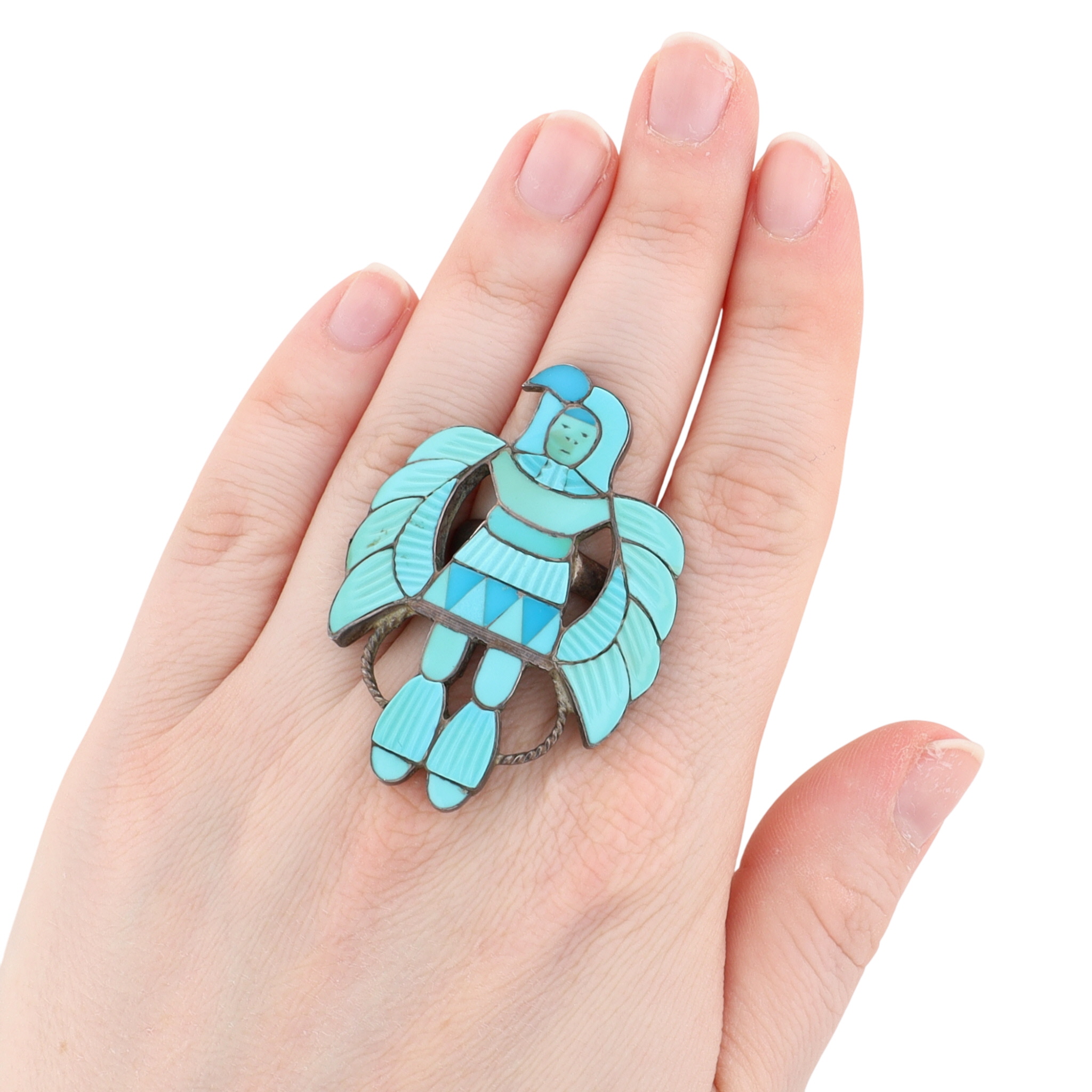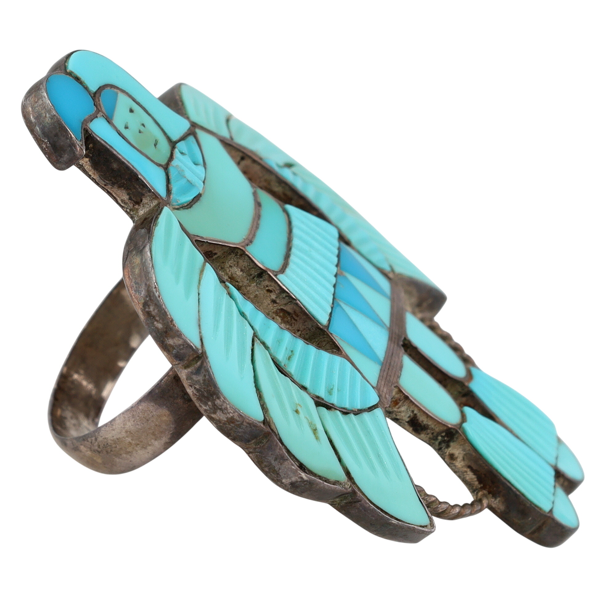 Rare Vintage Madeline Beyuka Zuni Sterling & Carved Turquoise Inlay Eagle Dancer Ring Sz 8 – 13.2g / Madeline Beyuka (born 1935) is a Zuni jeweler who was active from the early 1950s to the late 1980s. She is best known for her intricate inlay work and jewelry designs that often feature dancer figures, such as this stellar eagle dancer ring!