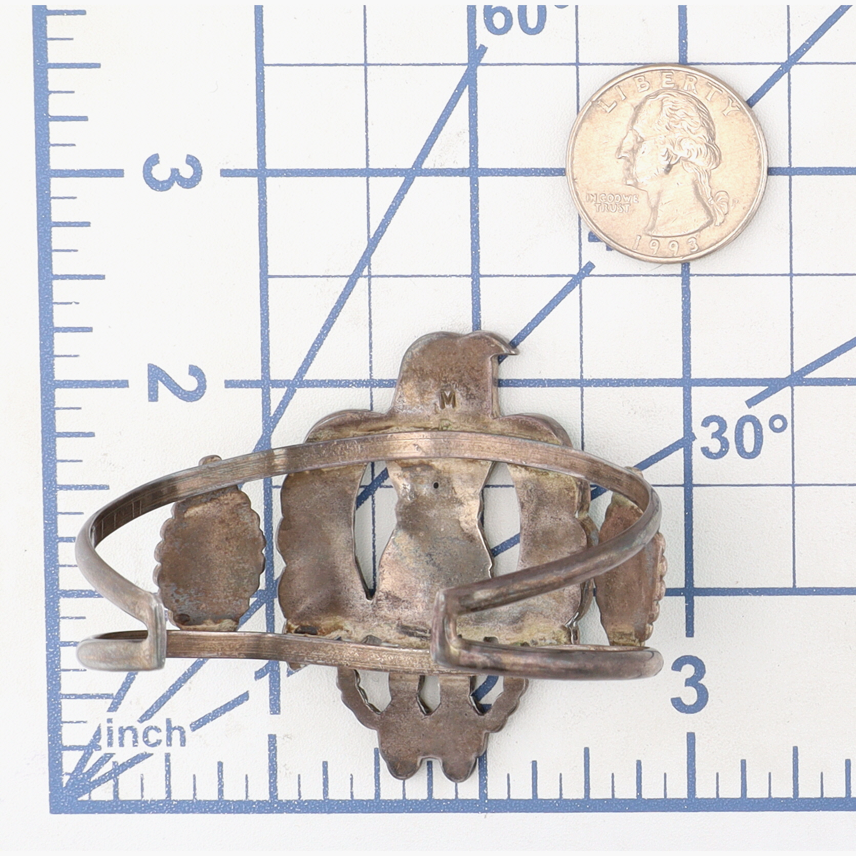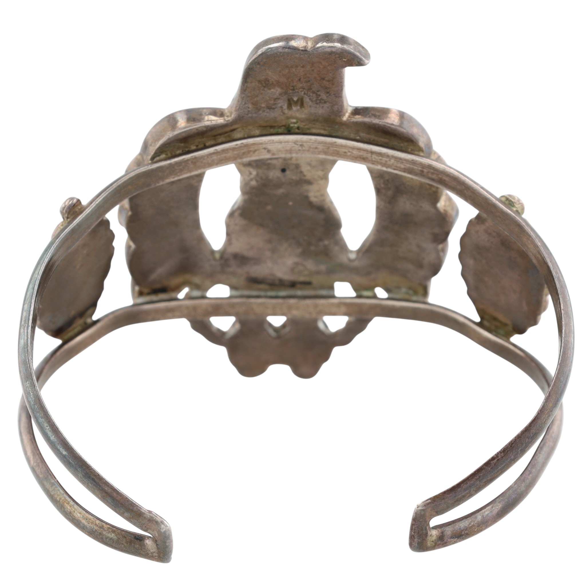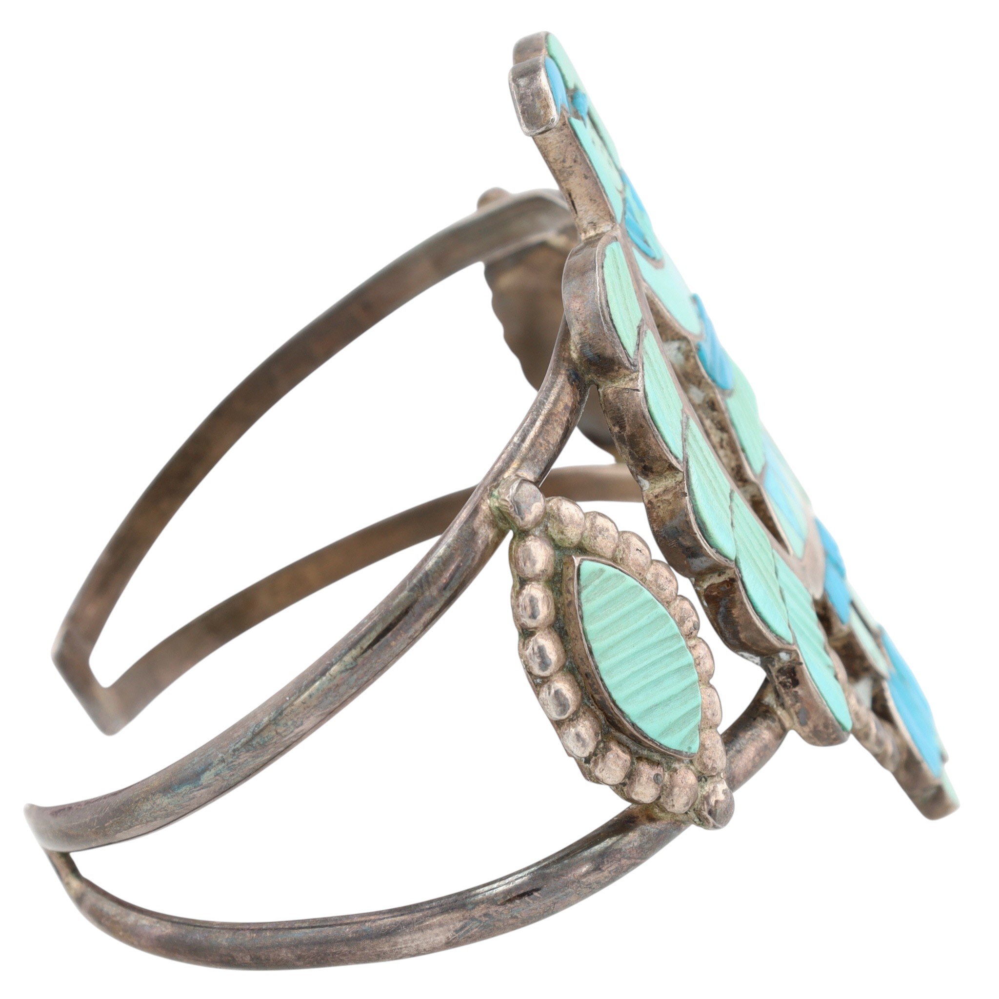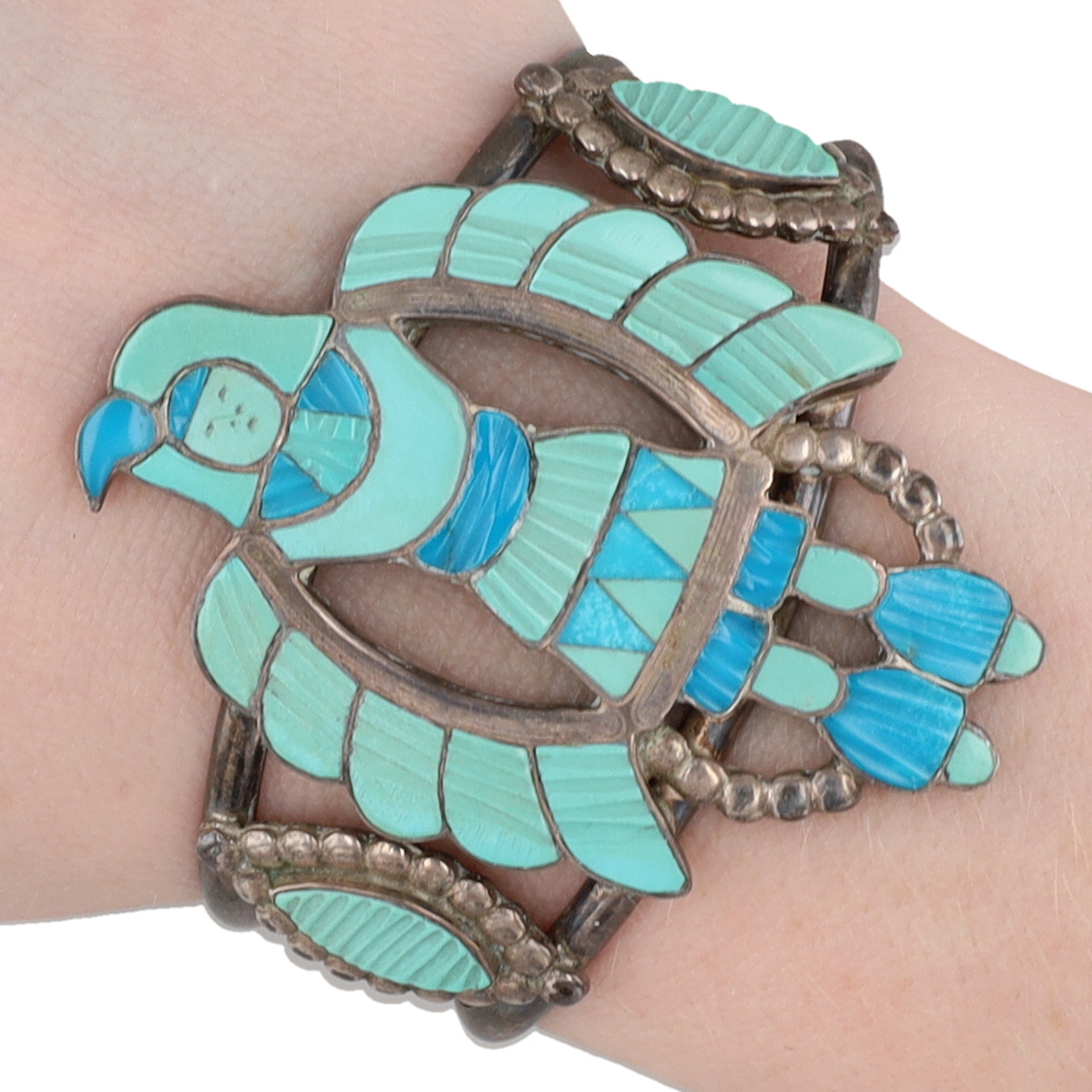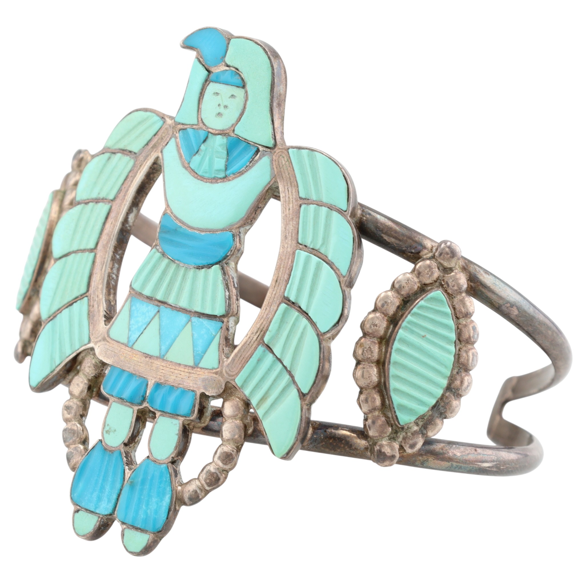 Rare Vintage Madeline Beyuka Zuni Sterling & Carved Turquoise Inlay Eagle Dancer Cuff Bracelet – 31.9g / Madeline Beyuka (born 1935) is a Zuni jeweler who was active from the early 1950s to the late 1980s. She is best known for her intricate inlay work and jewelry designs that often feature dancer figures, such as this amazing eagle dancer cuff bracelet!