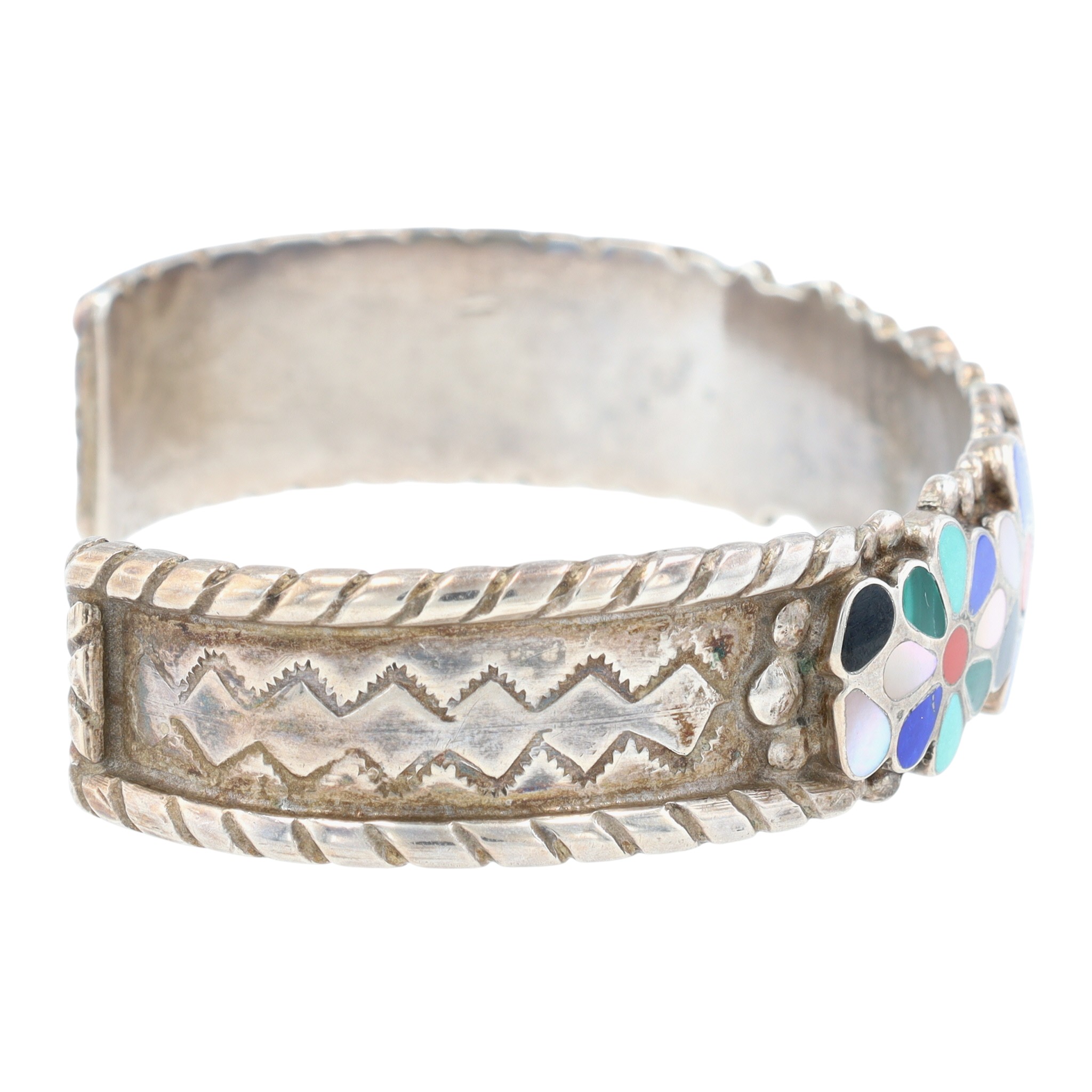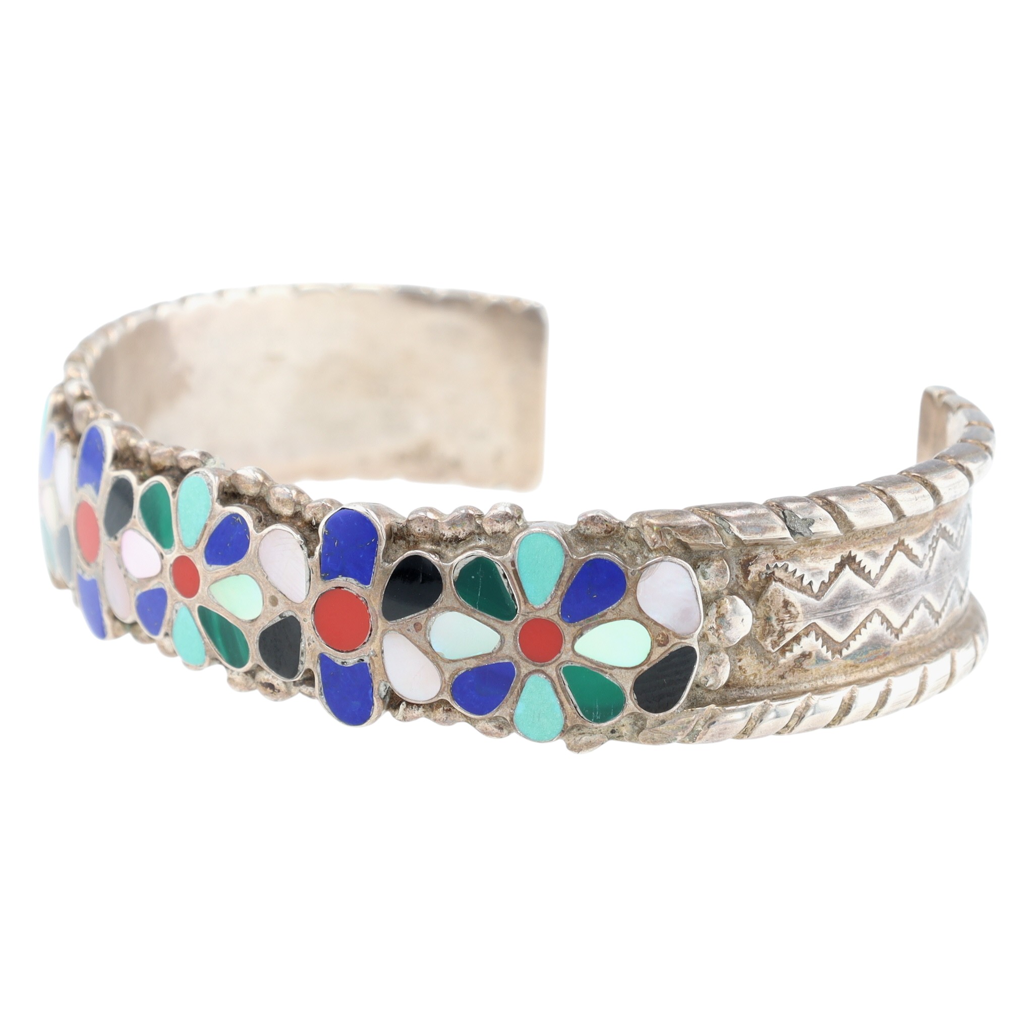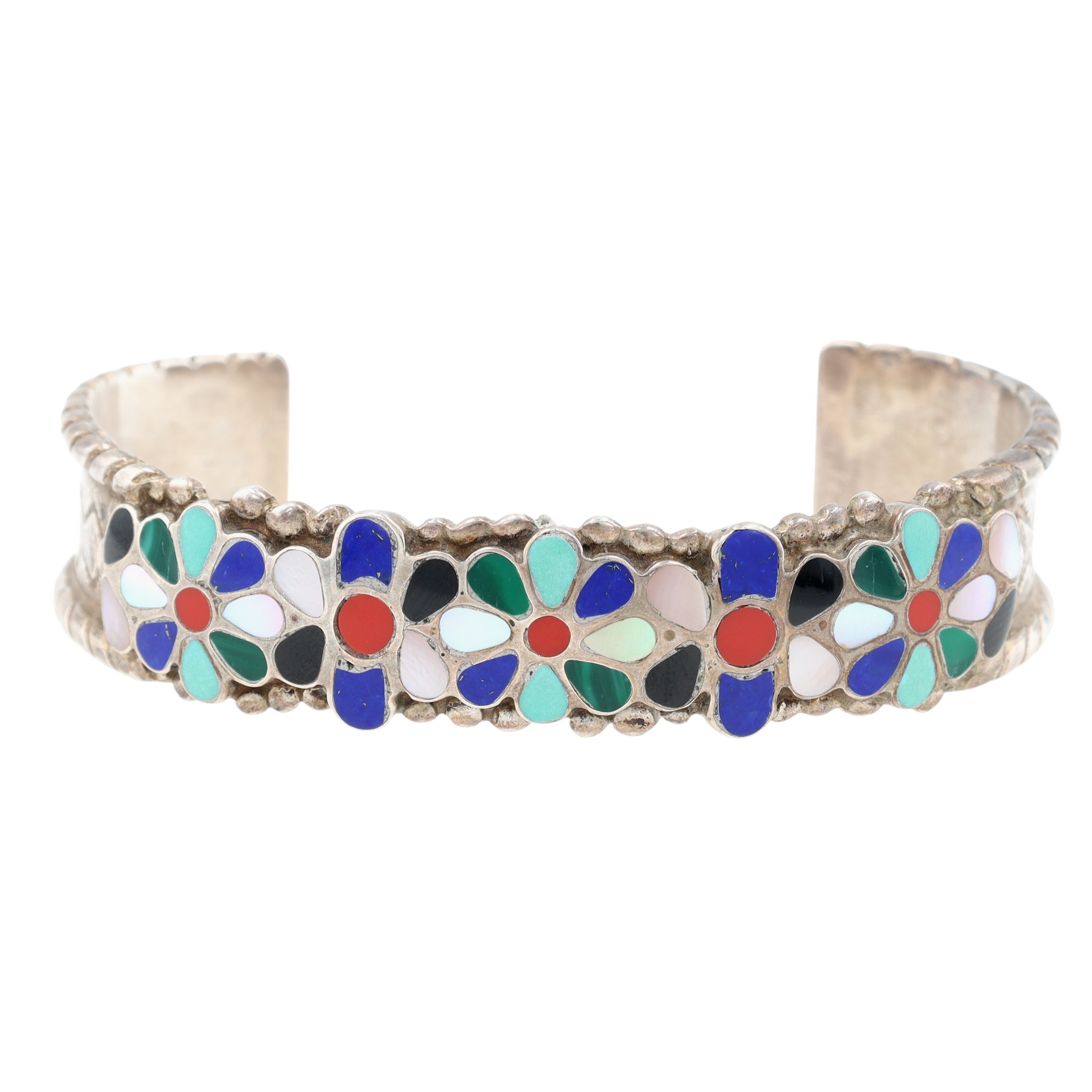 Louise & Stephen Siutza Zuni Sterling Multistone (Turquoise, Coral, Jet, Mother of Pearl, Lapis Lazuli, Malachite) Flower Raised Inlay Stamped Cuff Bracelet – 23.8g