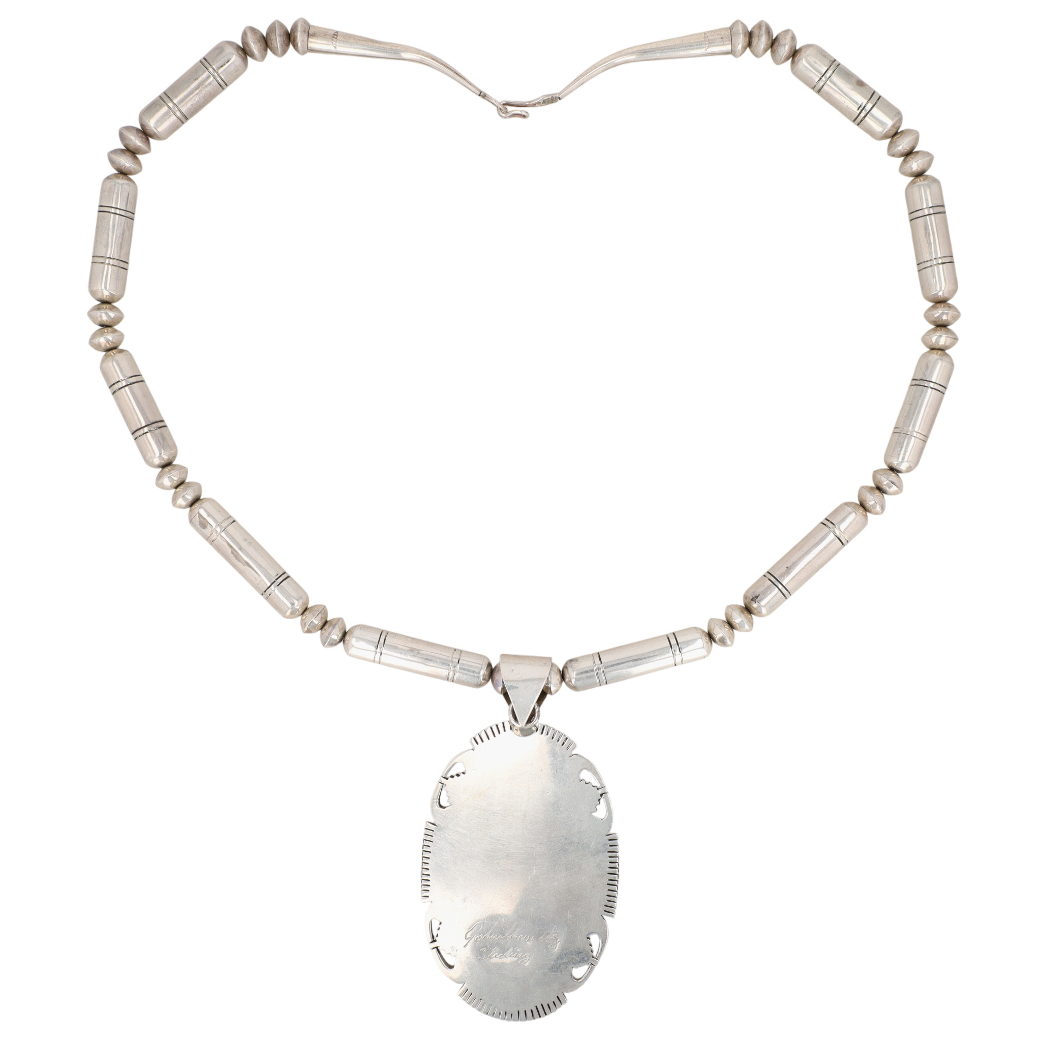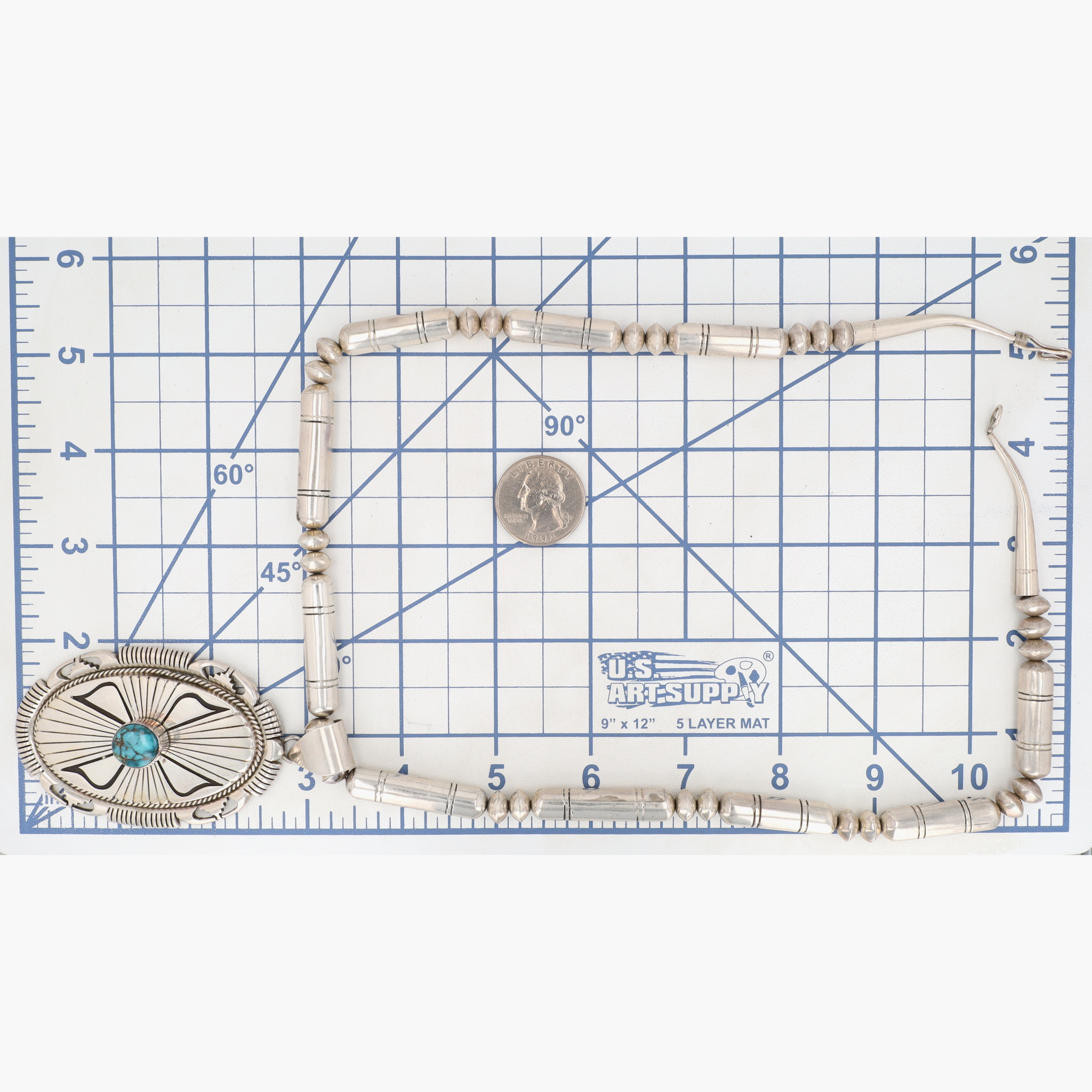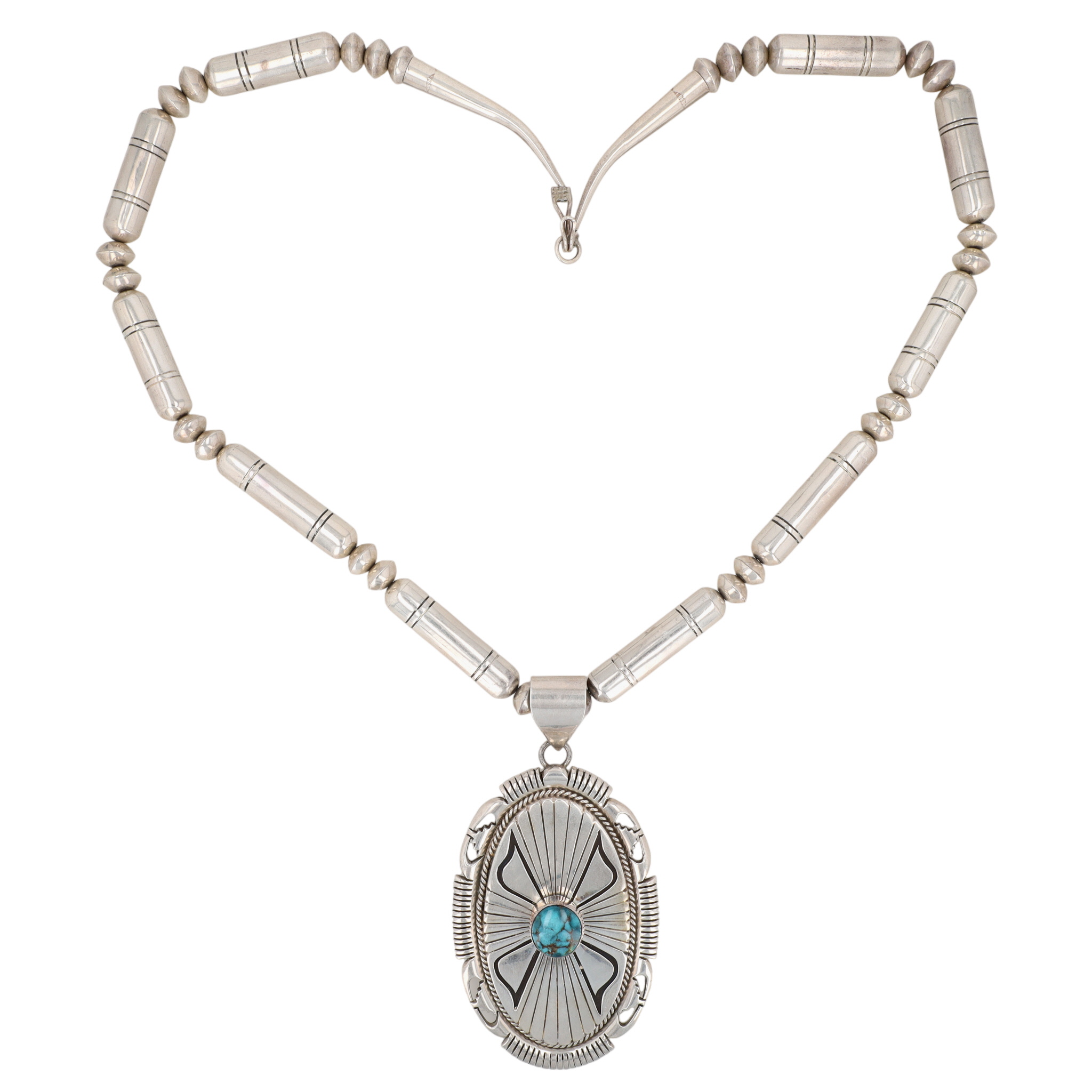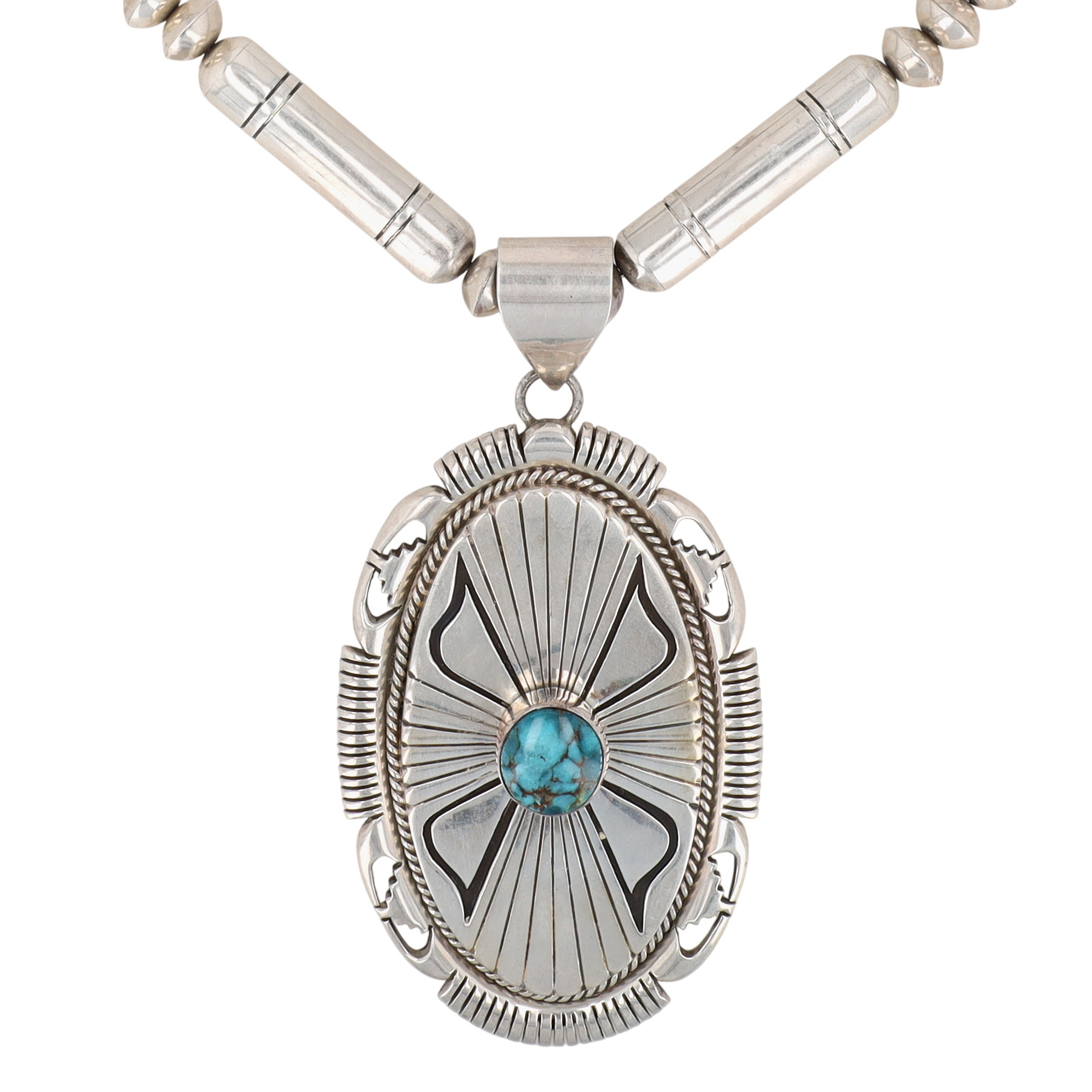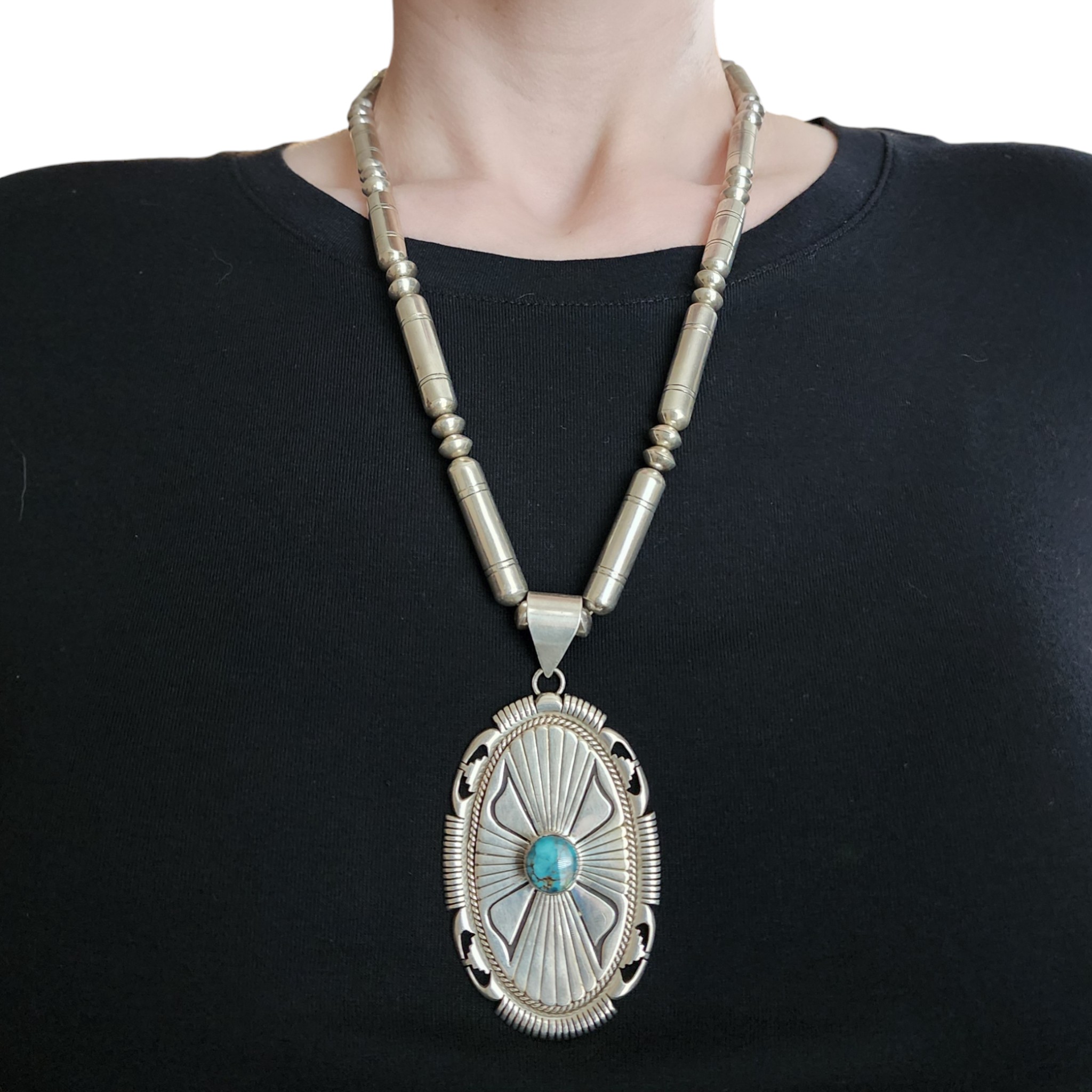 Award Winning Jonathan Nez Navajo Huge Contemporary Turquoise and Tooled Sterling Barrel Bead Necklace – 102g – bead necklace approx. 23.5″ long – pendant is approx. 3.8″ tall x 1.9″ wide