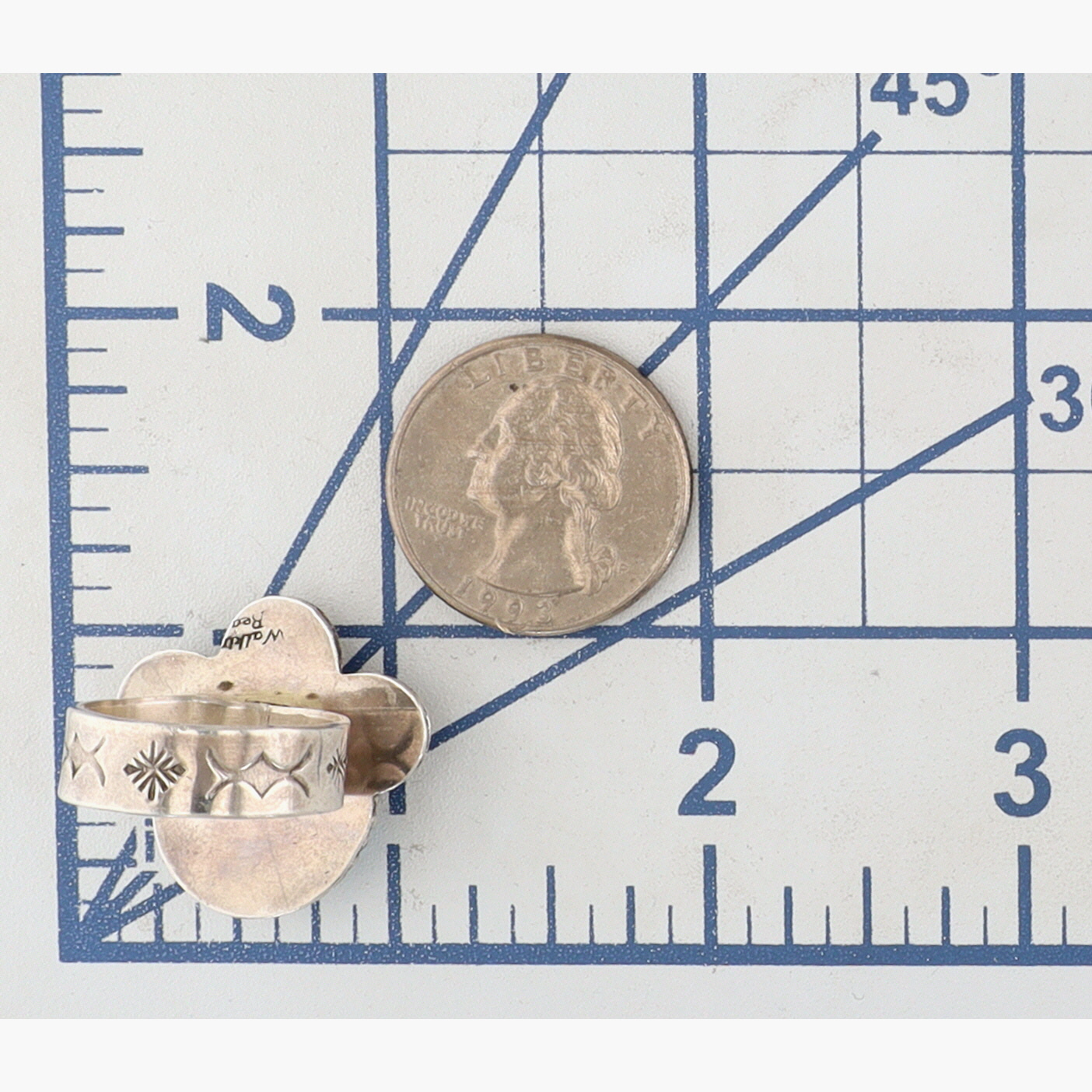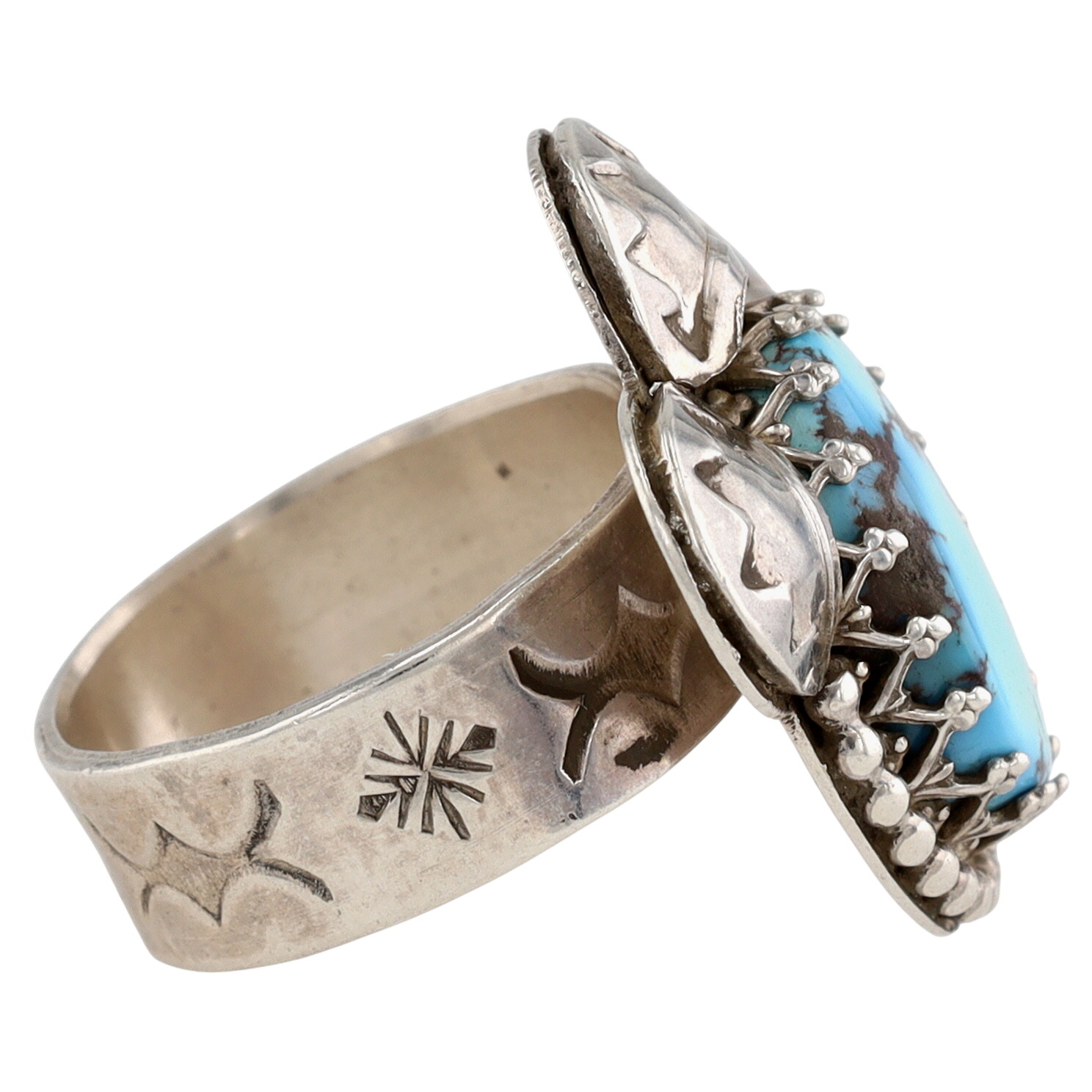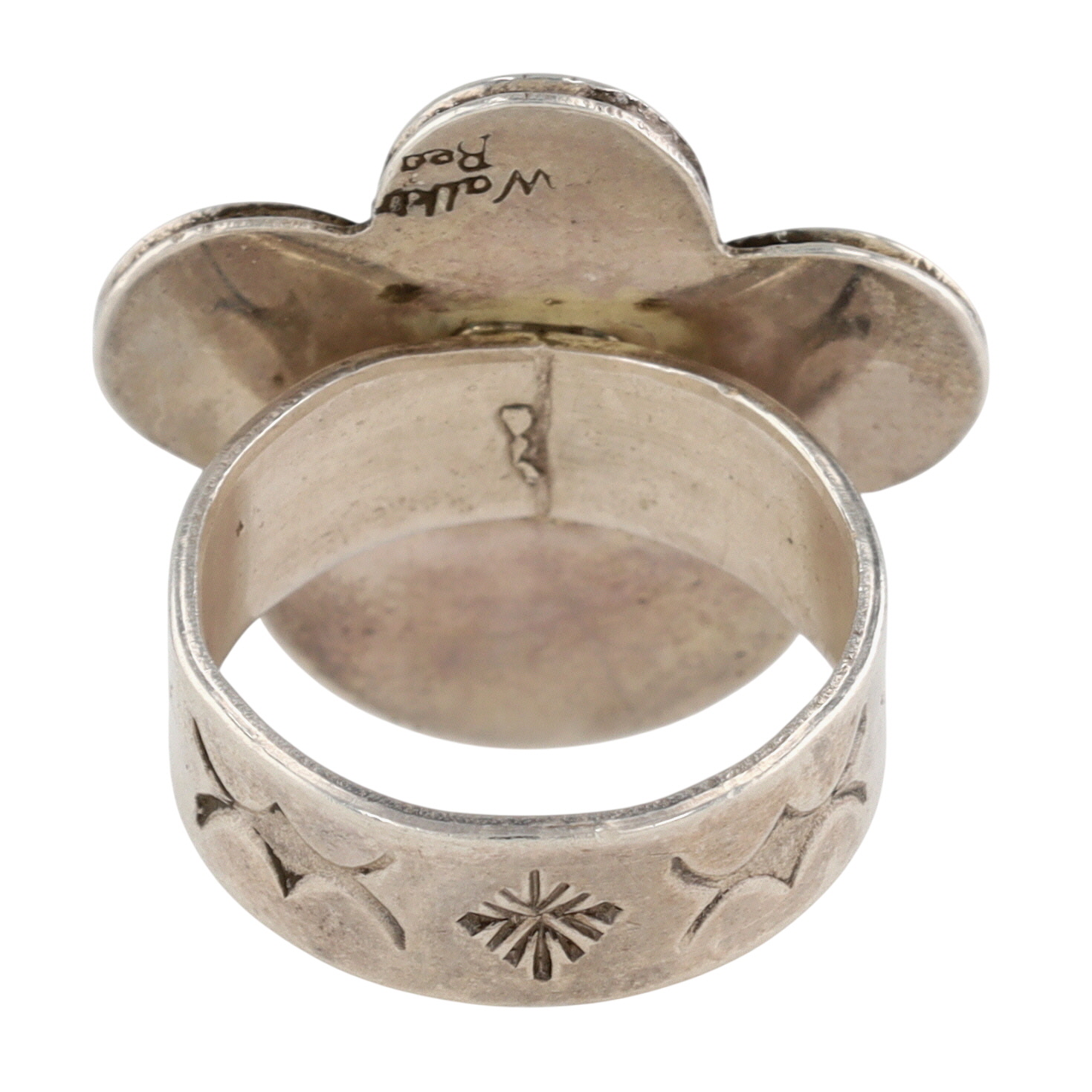 Contemporary Signed ‘Walking Bear”?/”Walker Bear”? Navajo Sterling and Golden Hills Turquoise Stamped Ring Sz 7.5 – 10g – unable to fully decipher signature – appears it may have been partially mistruck