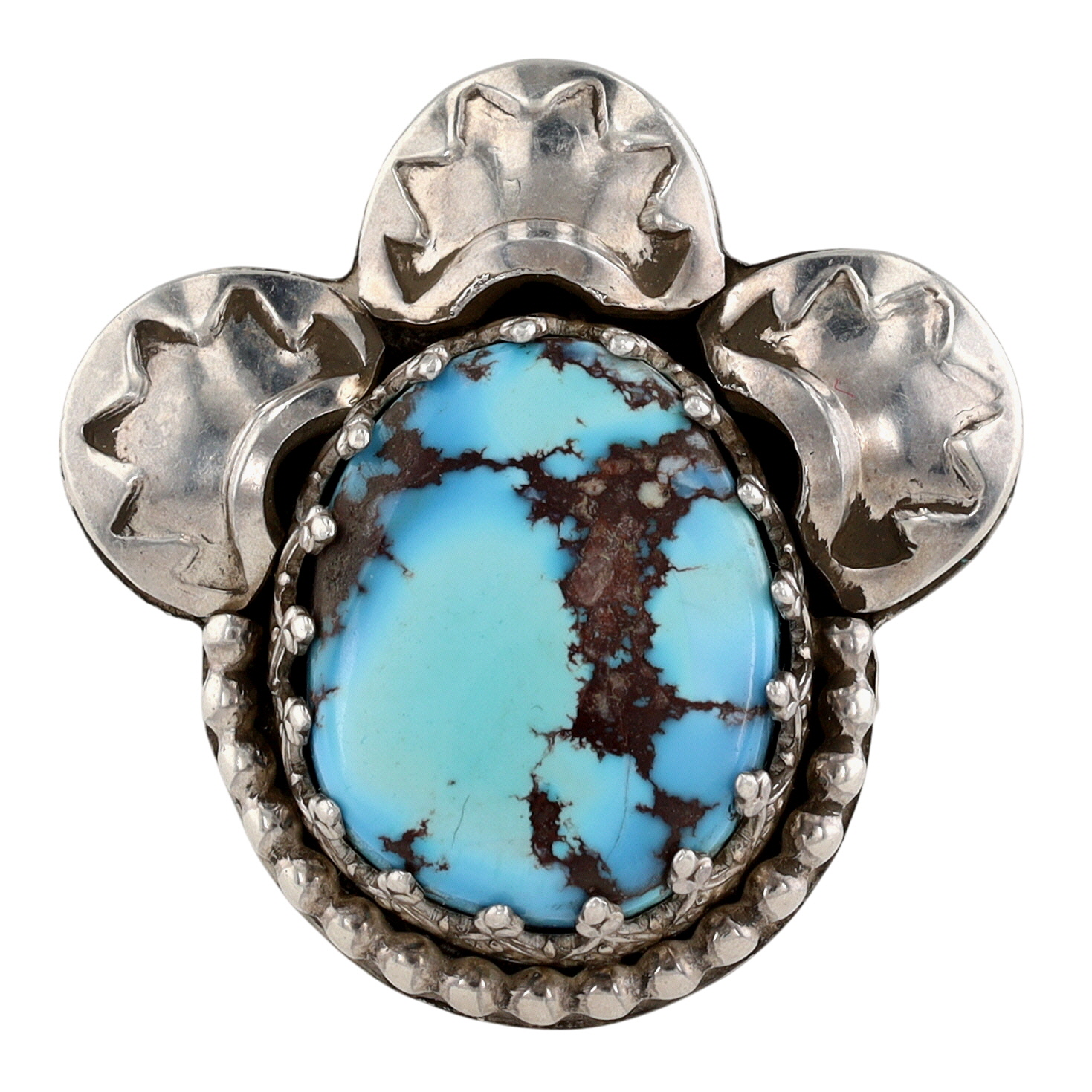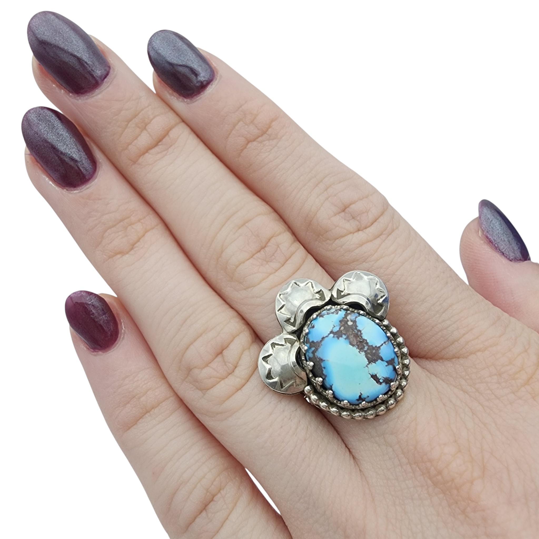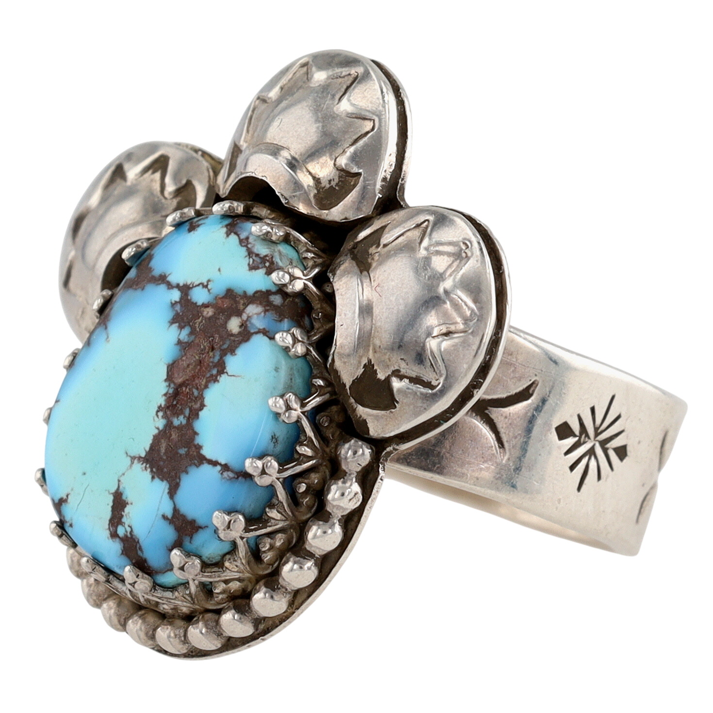 Contemporary Signed ‘Walking Bear”?/”Walker Bear”? Navajo Sterling and Golden Hills Turquoise Stamped Ring Sz 7.5 – 10g – unable to fully decipher signature – appears it may have been partially mistruck